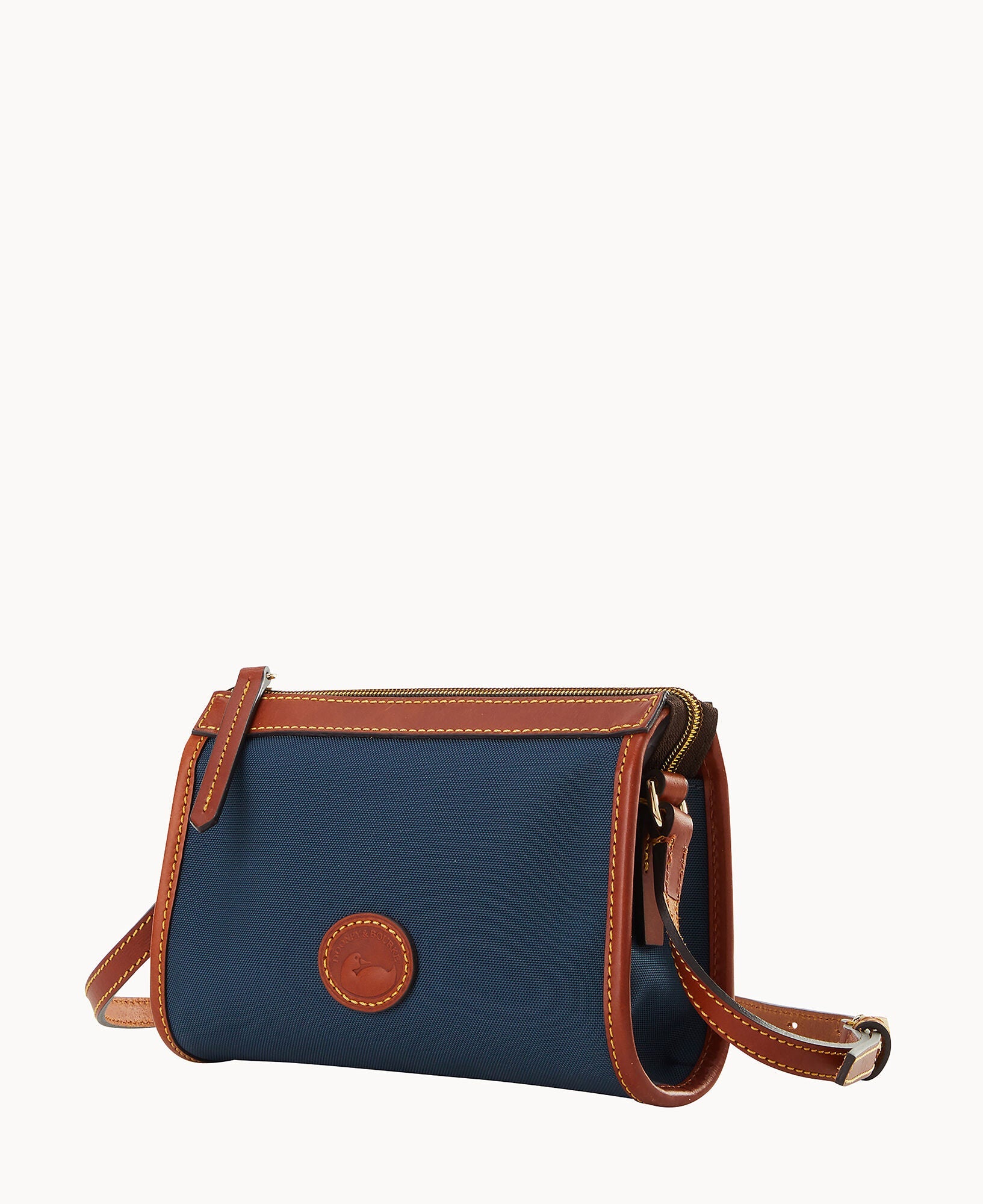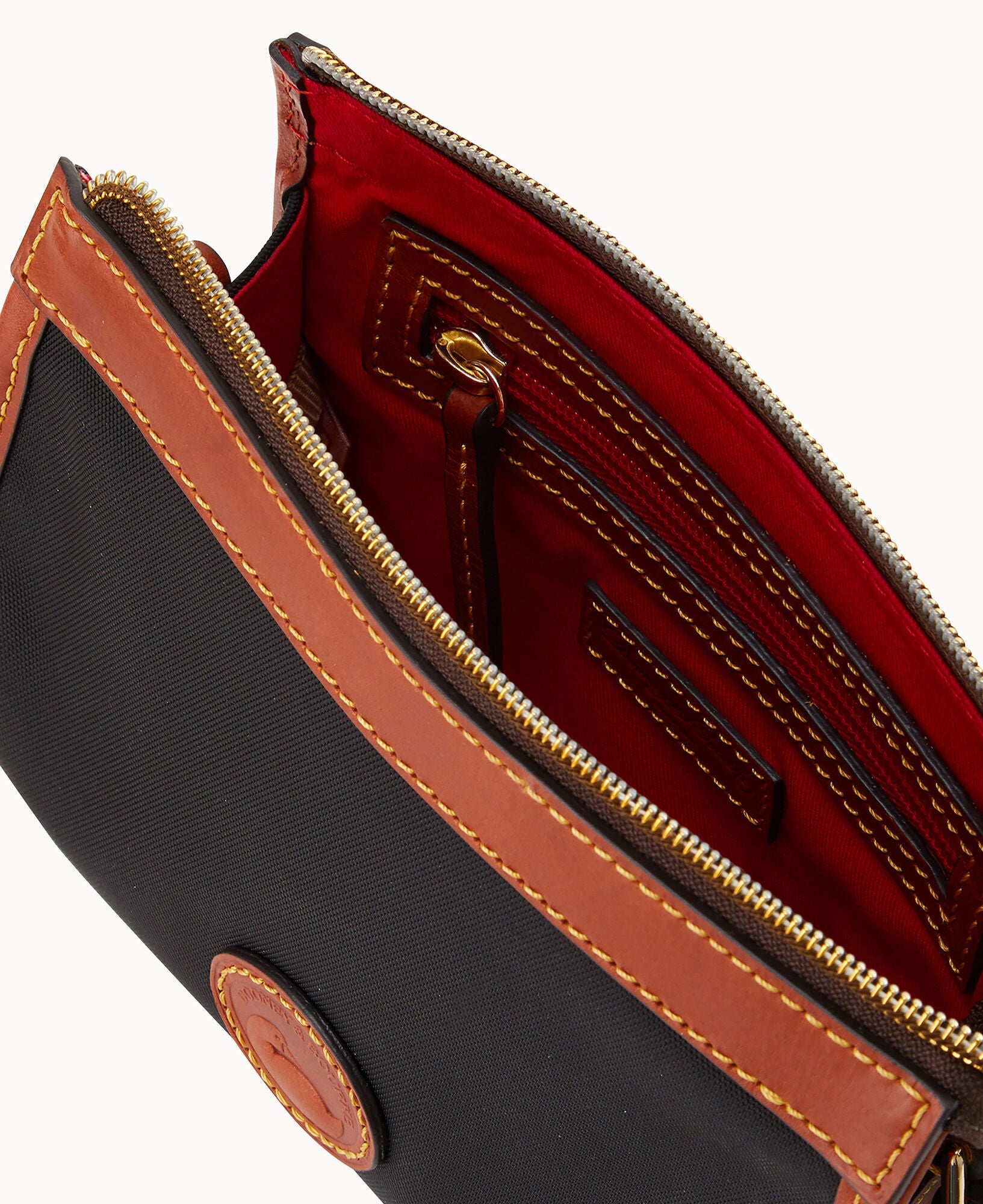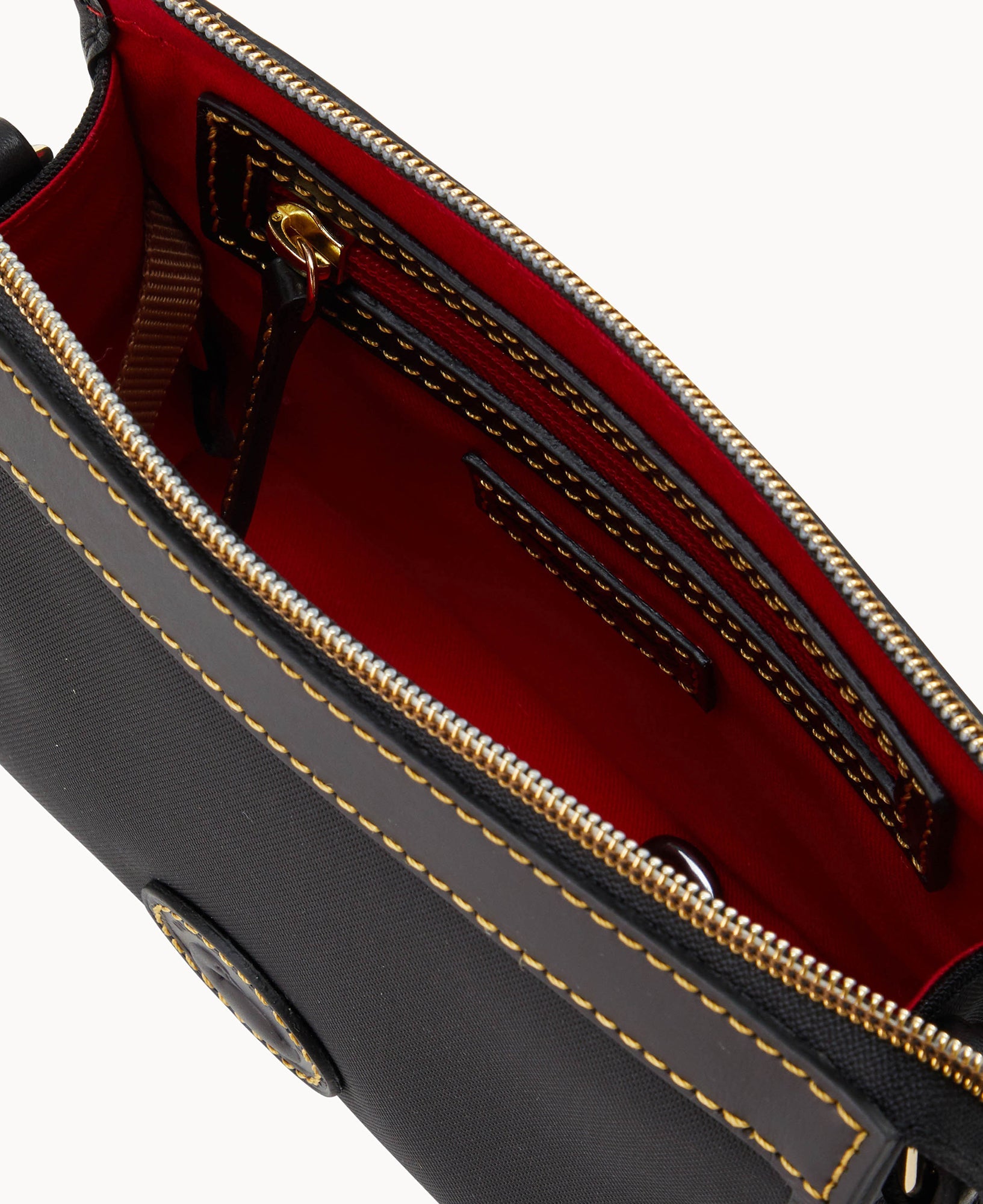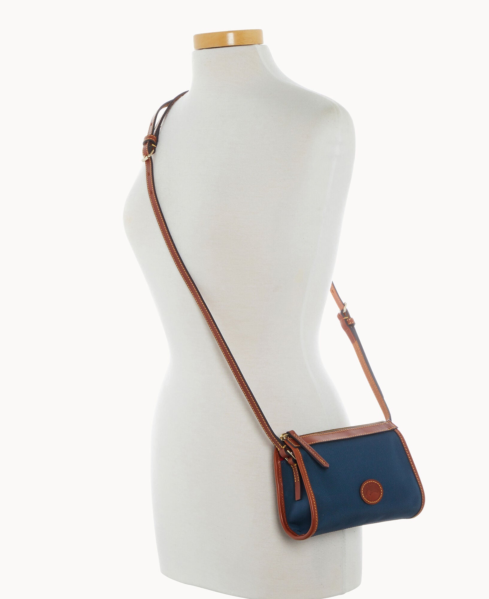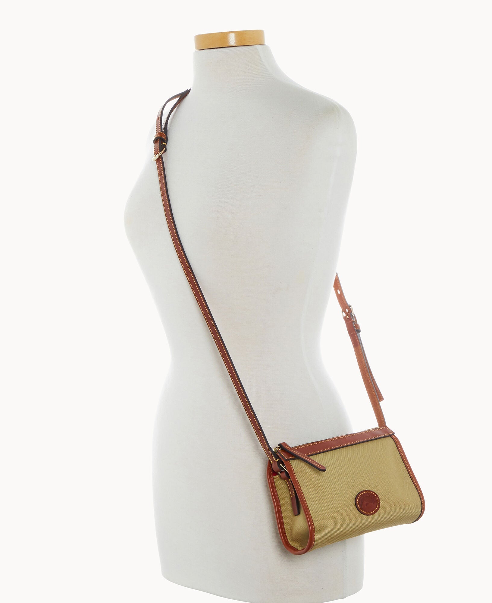 One inside pocket. One inside zip pocket. Inside key hook. Strap drop length 23". Lined. Zipper closure.