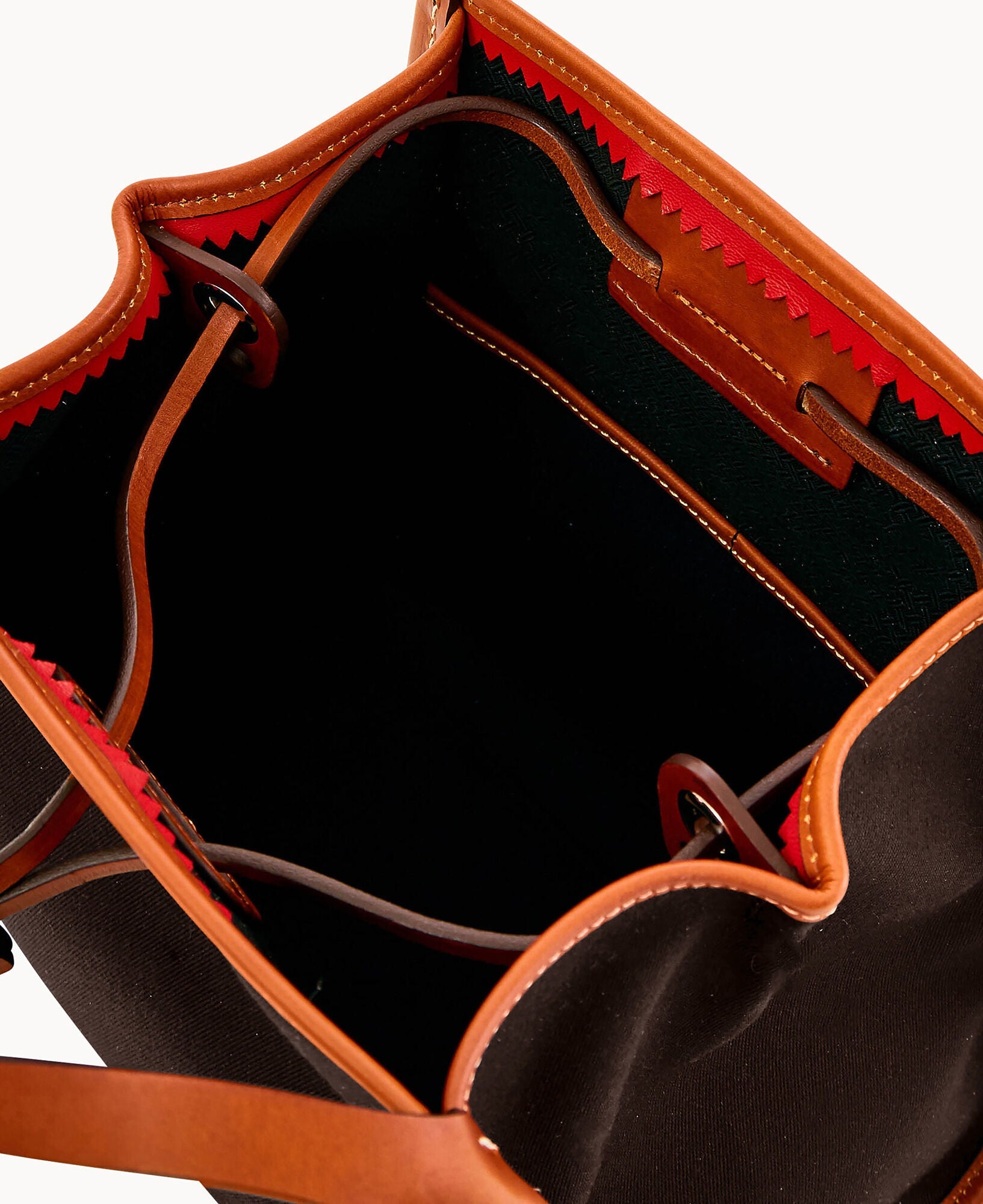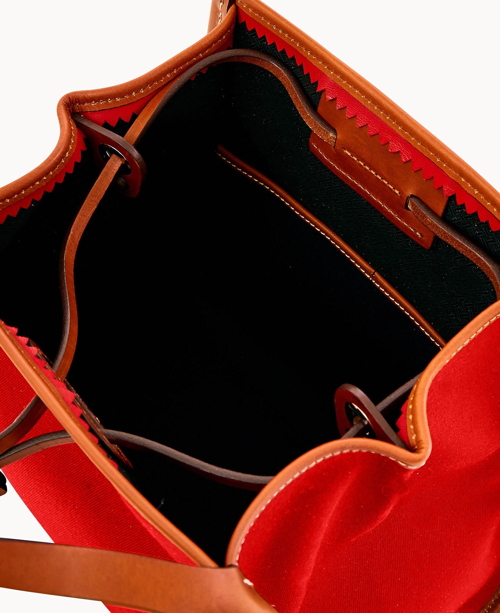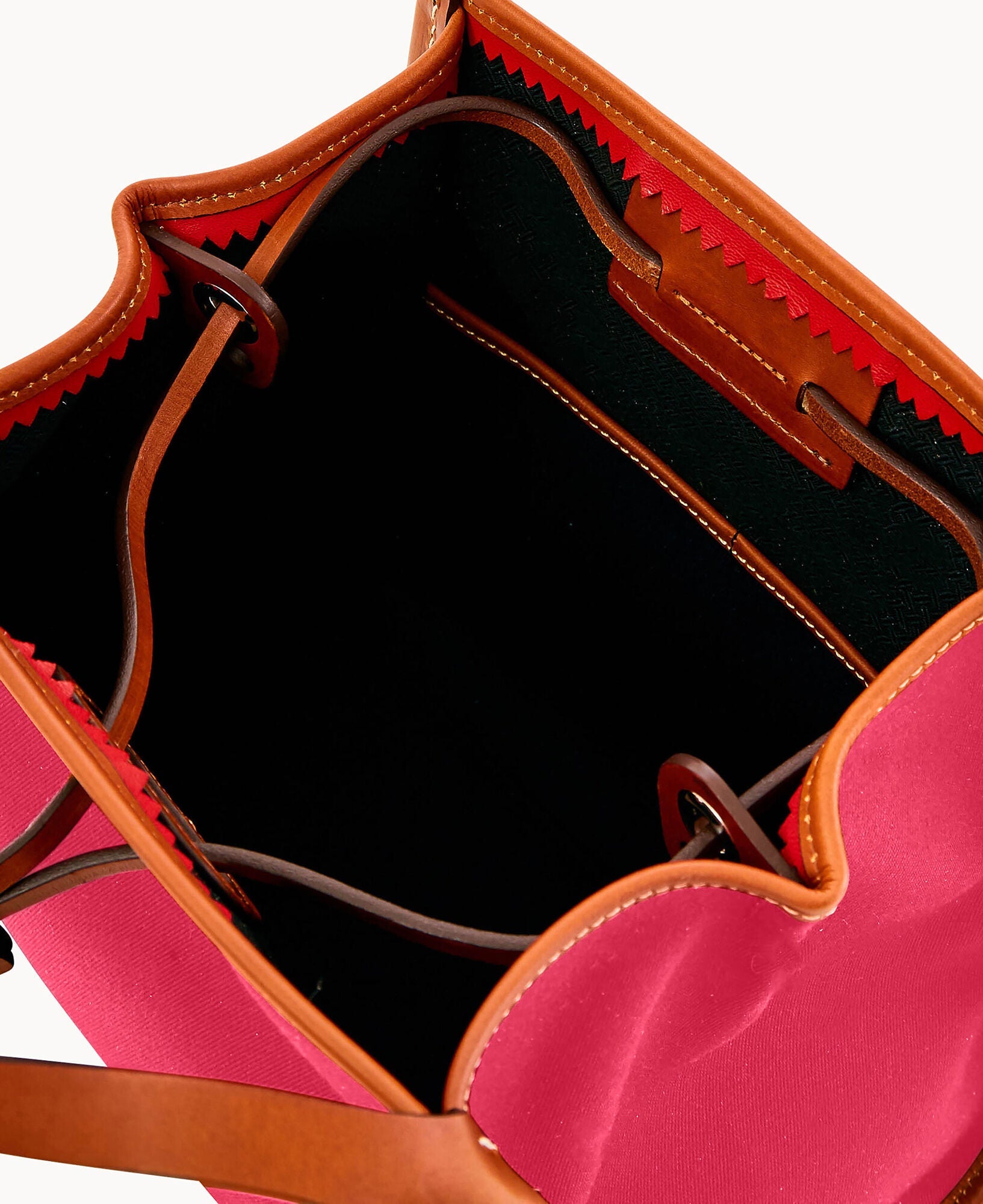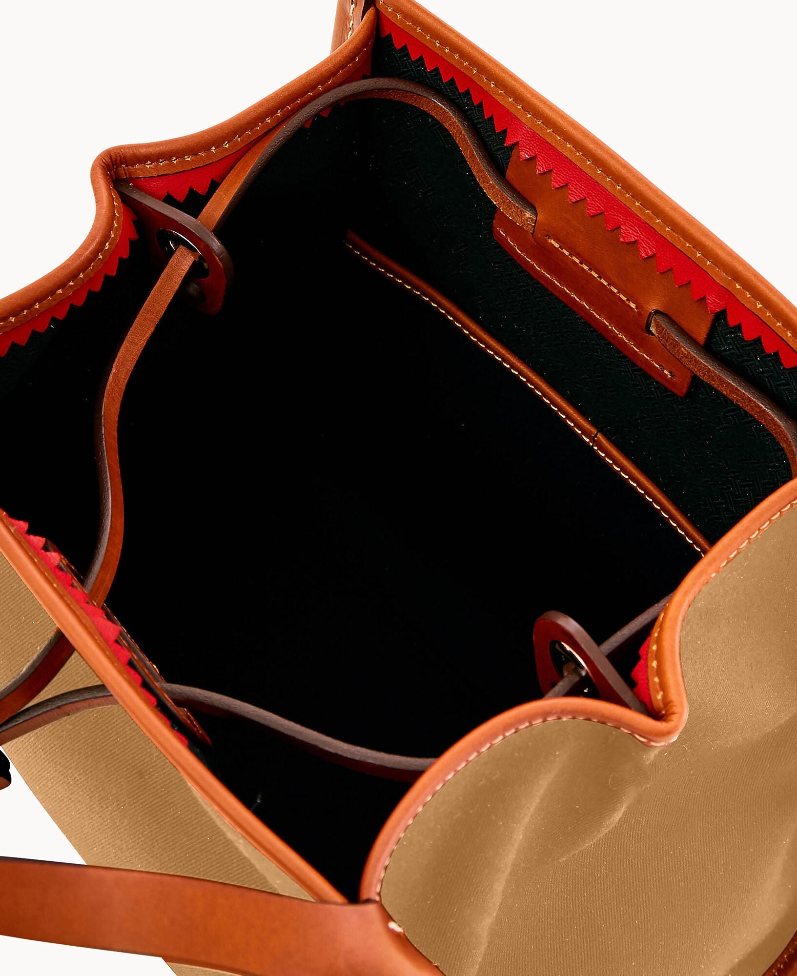 Two inside pockets. Inside key hook. Strap drop length 5". Drawstring closure.