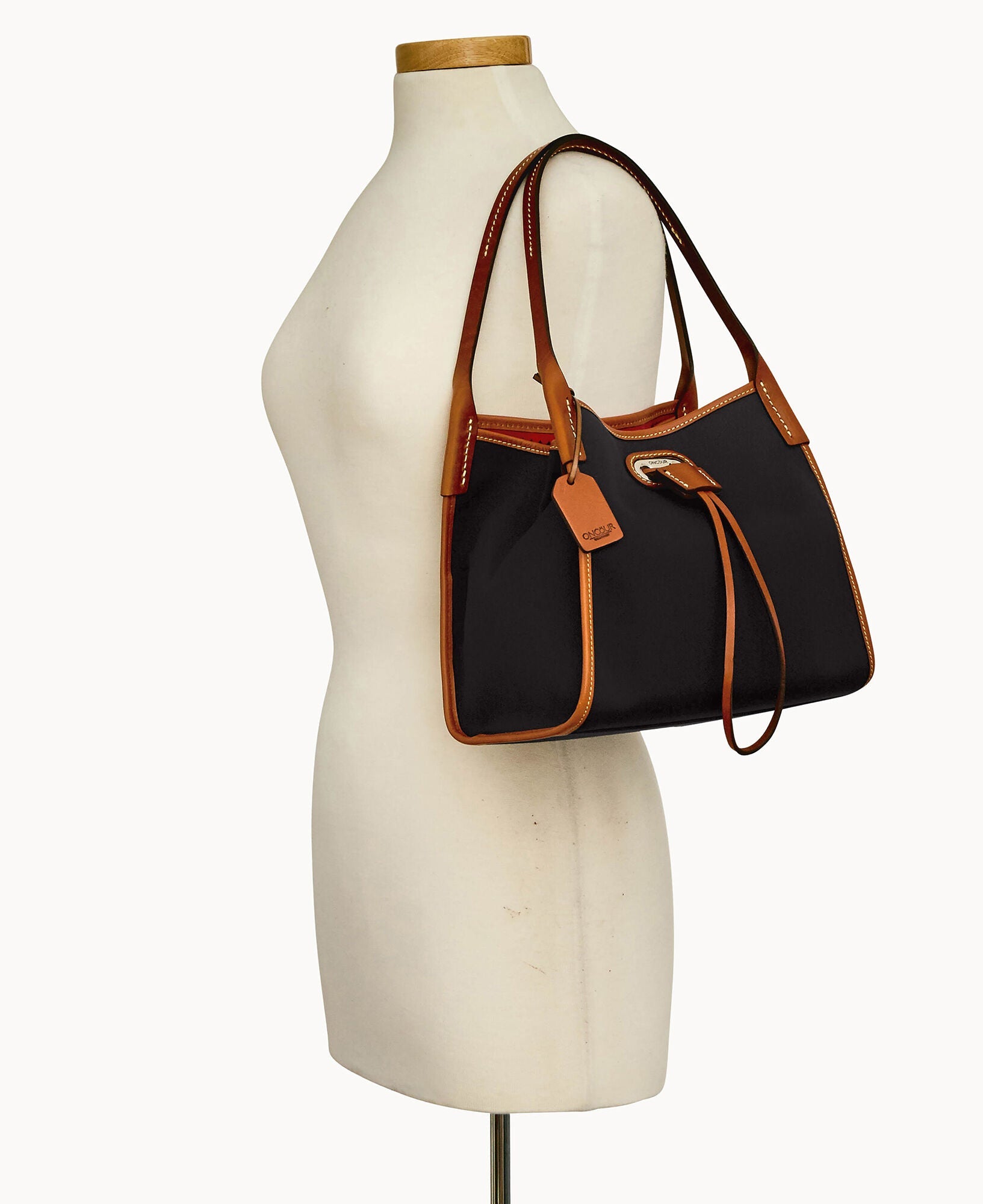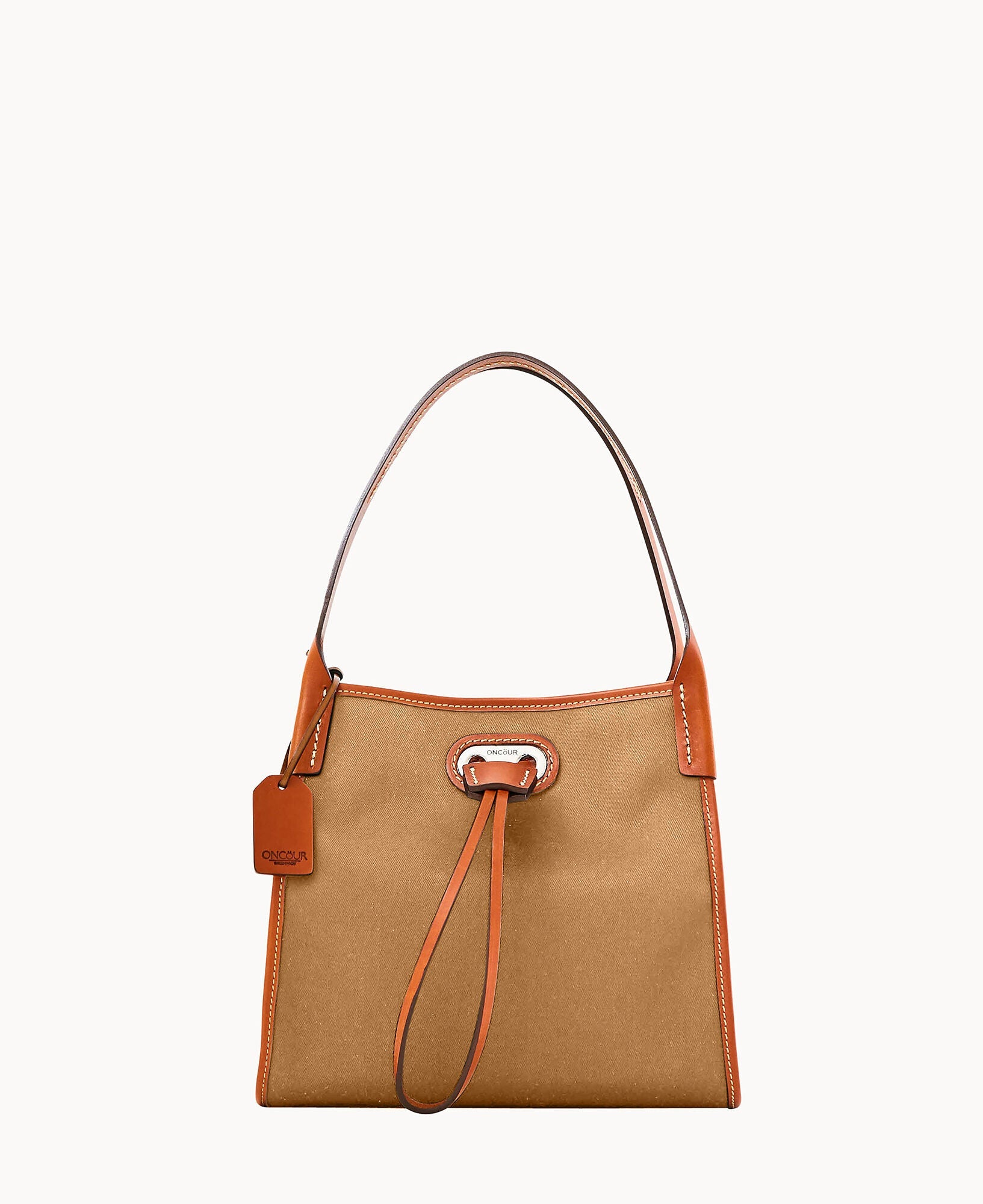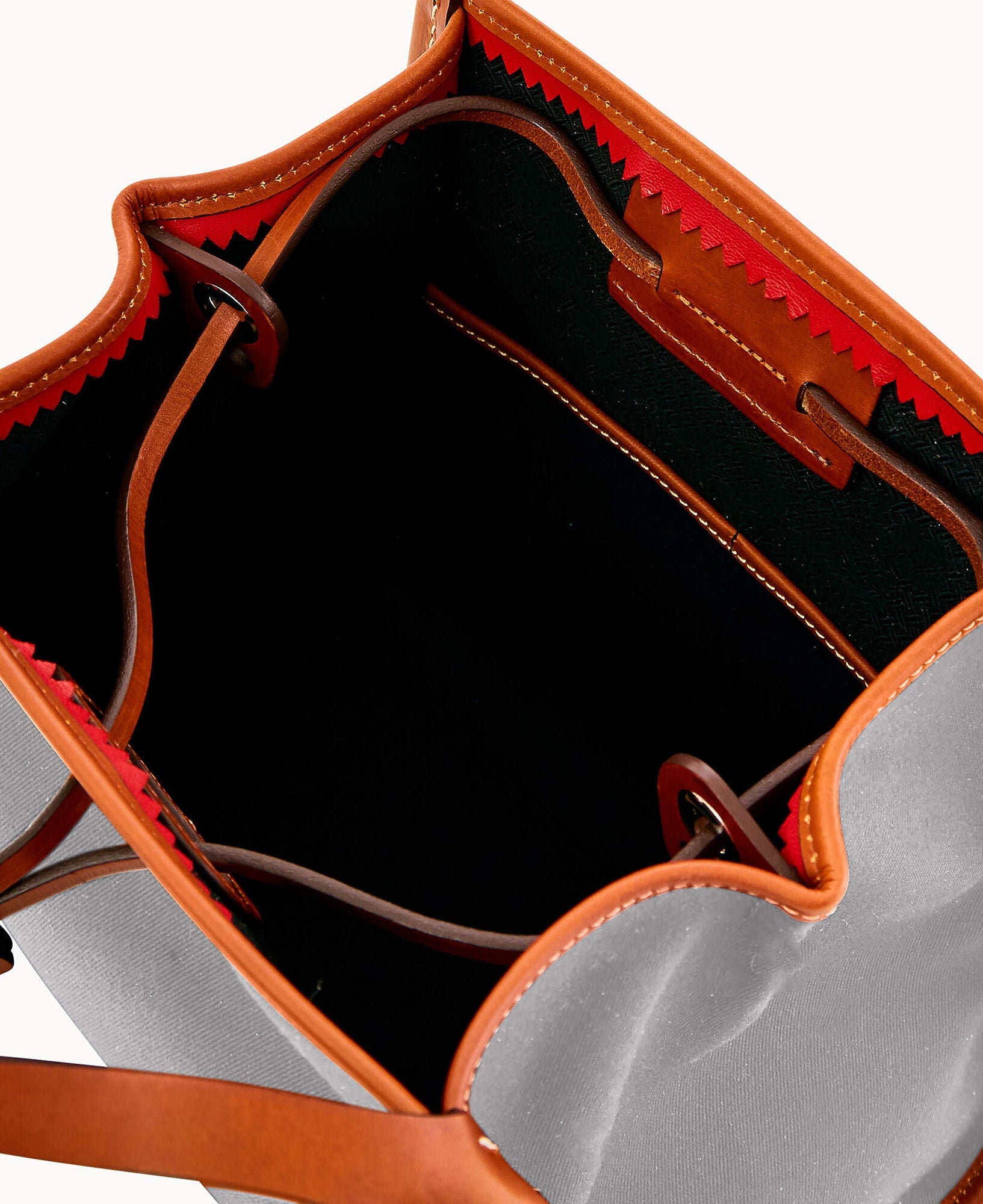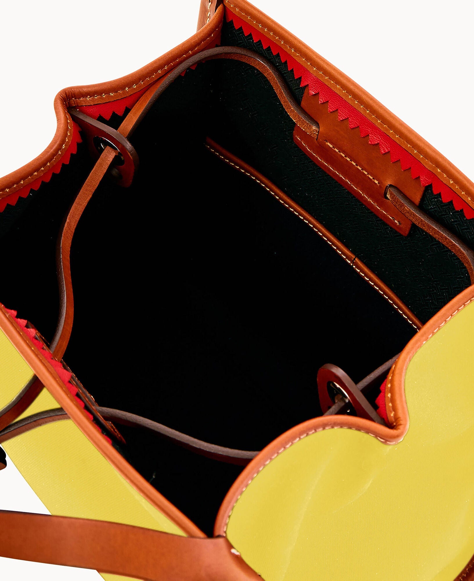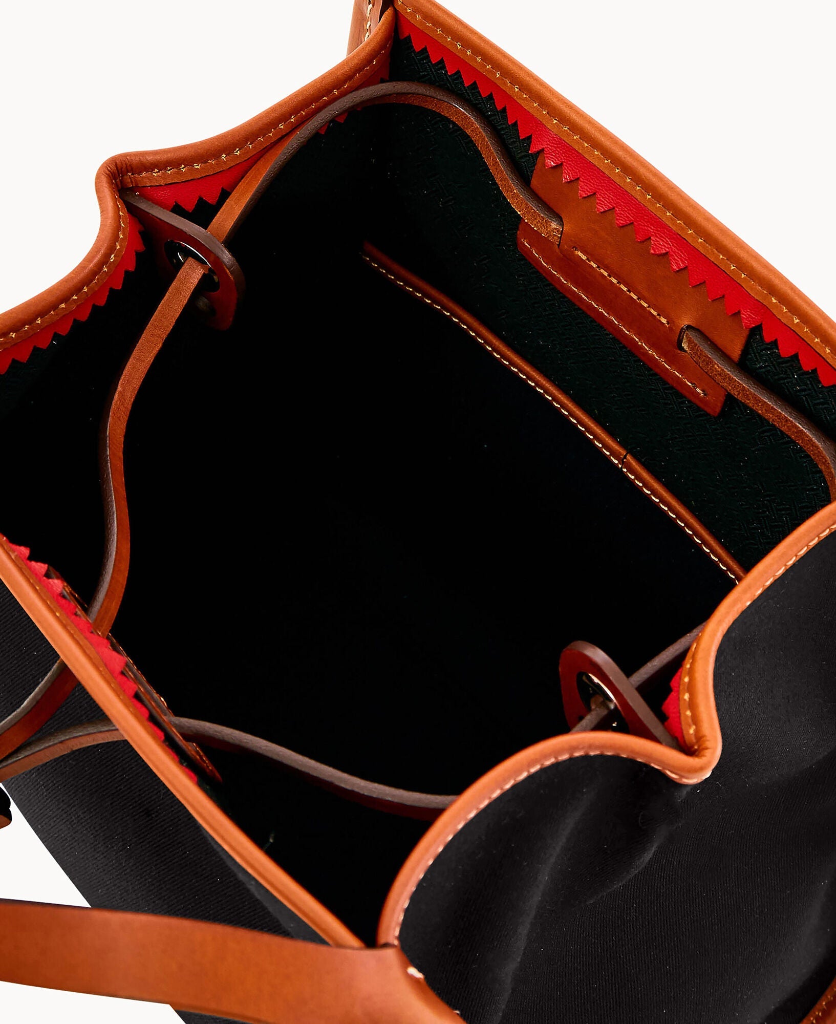 Two inside pockets. Inside key hook. Strap drop length 5". Drawstring closure.