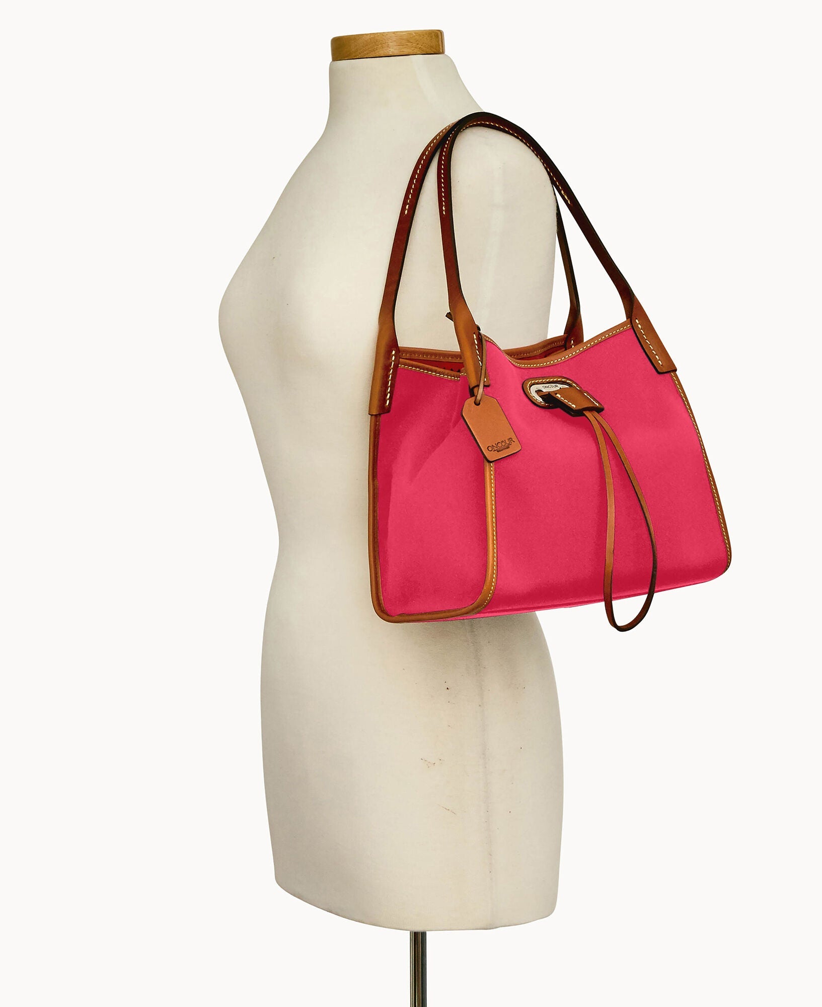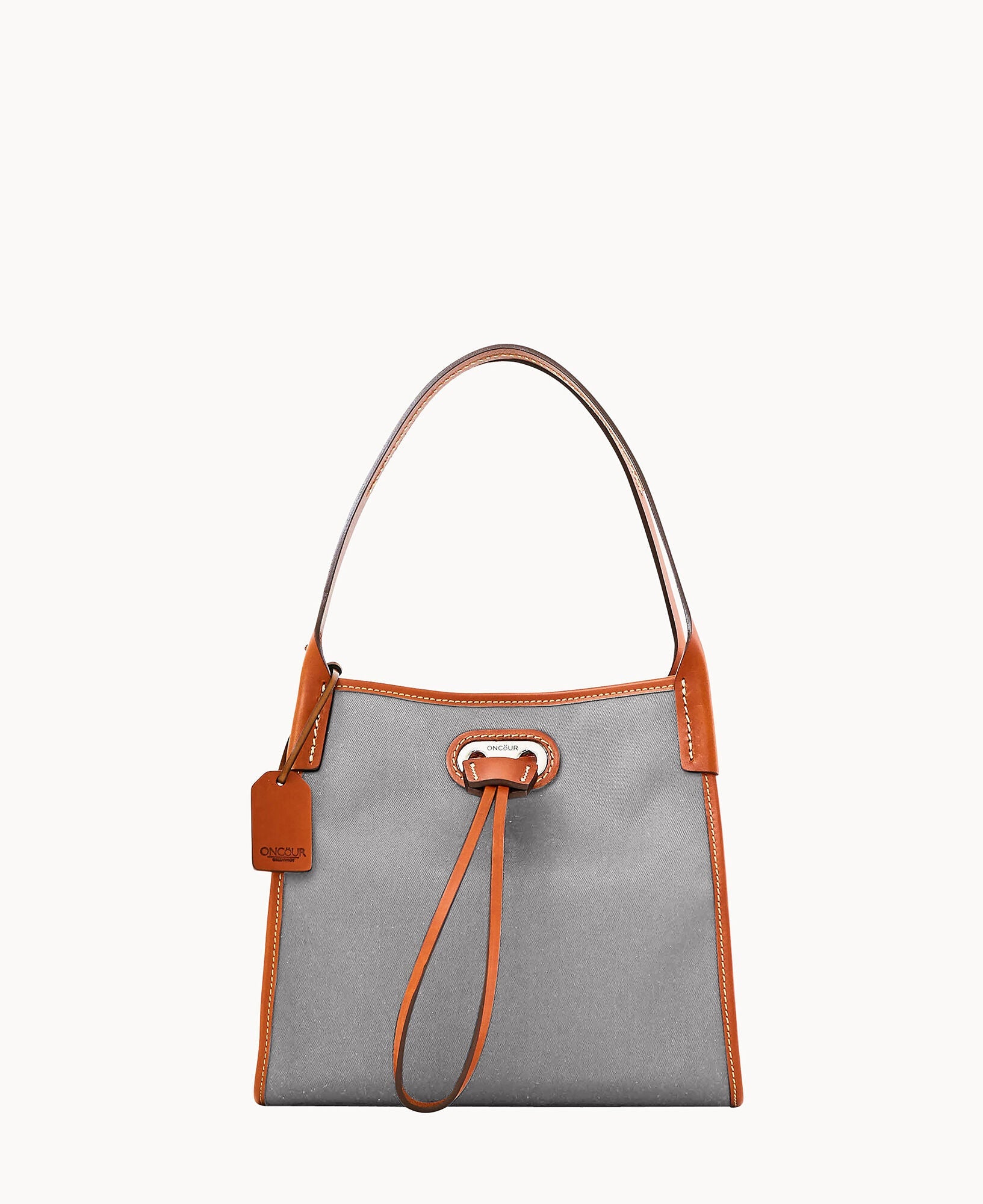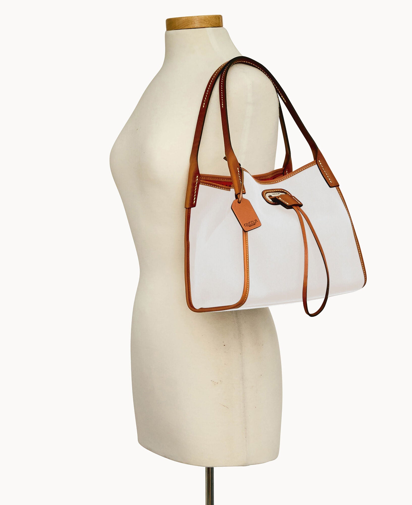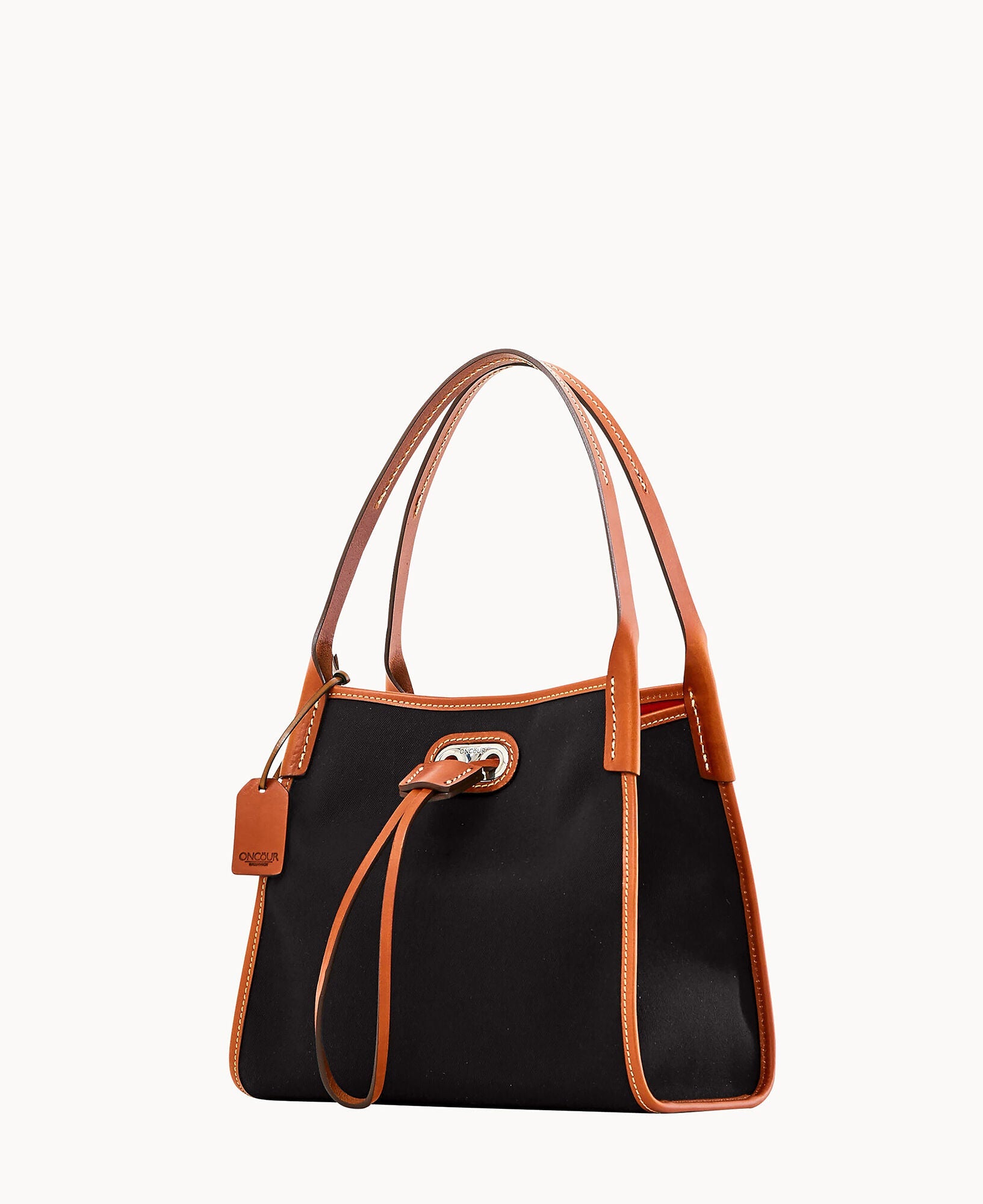 Two inside pockets. Inside key hook. Strap drop length 5". Drawstring closure.