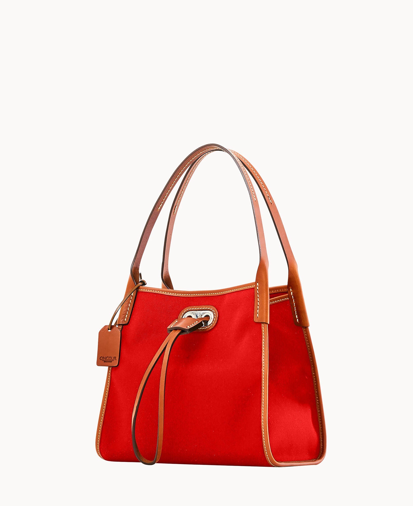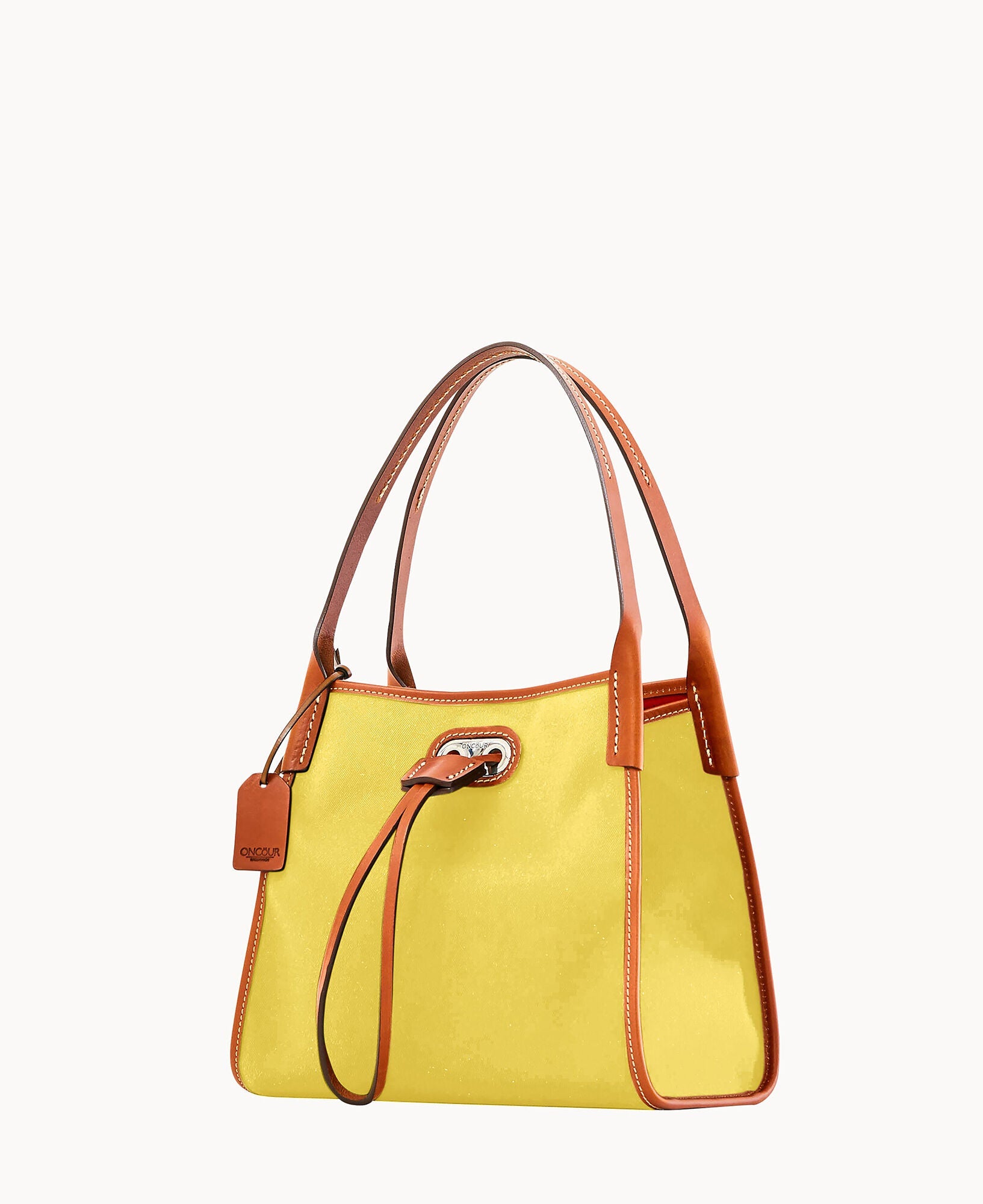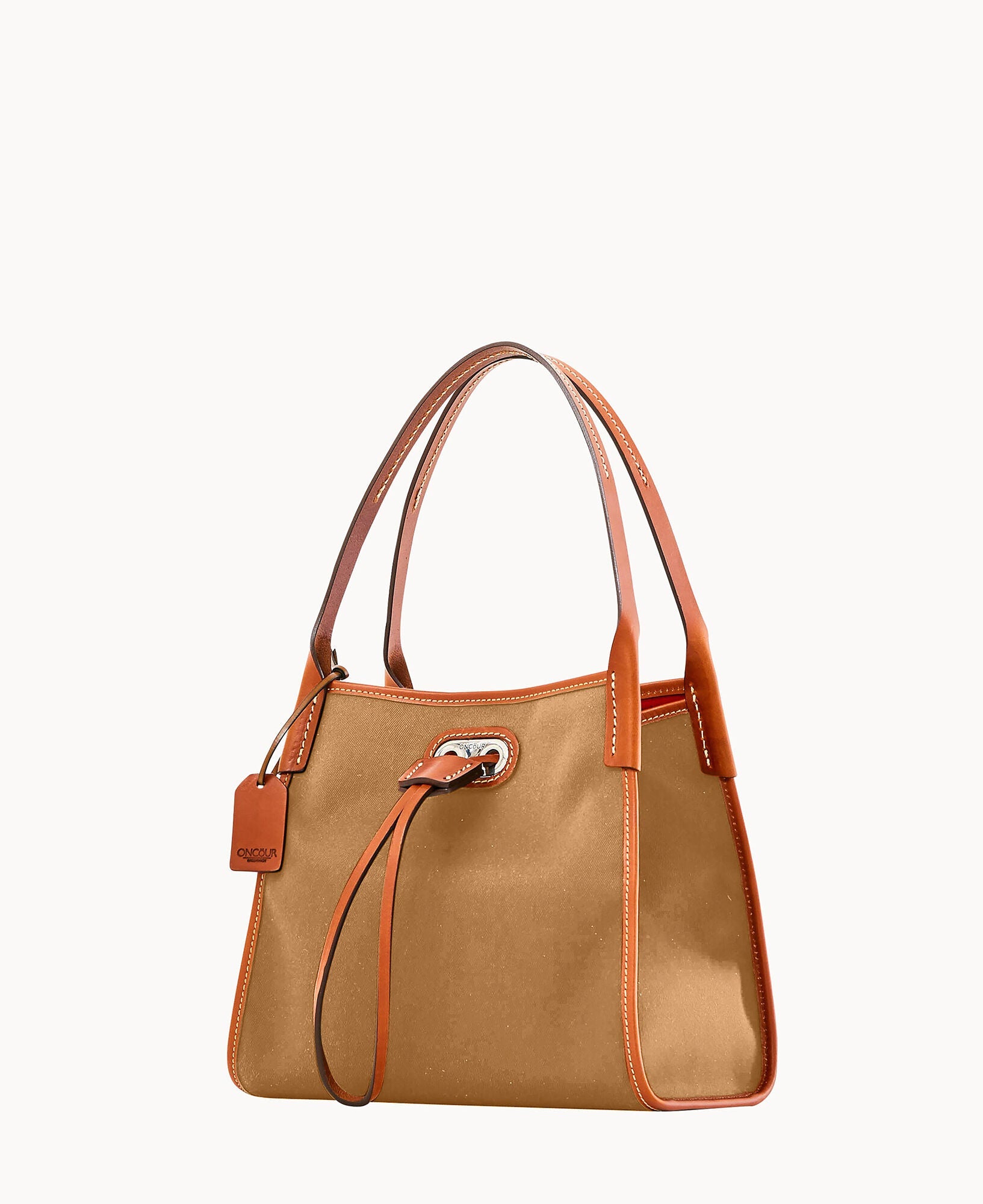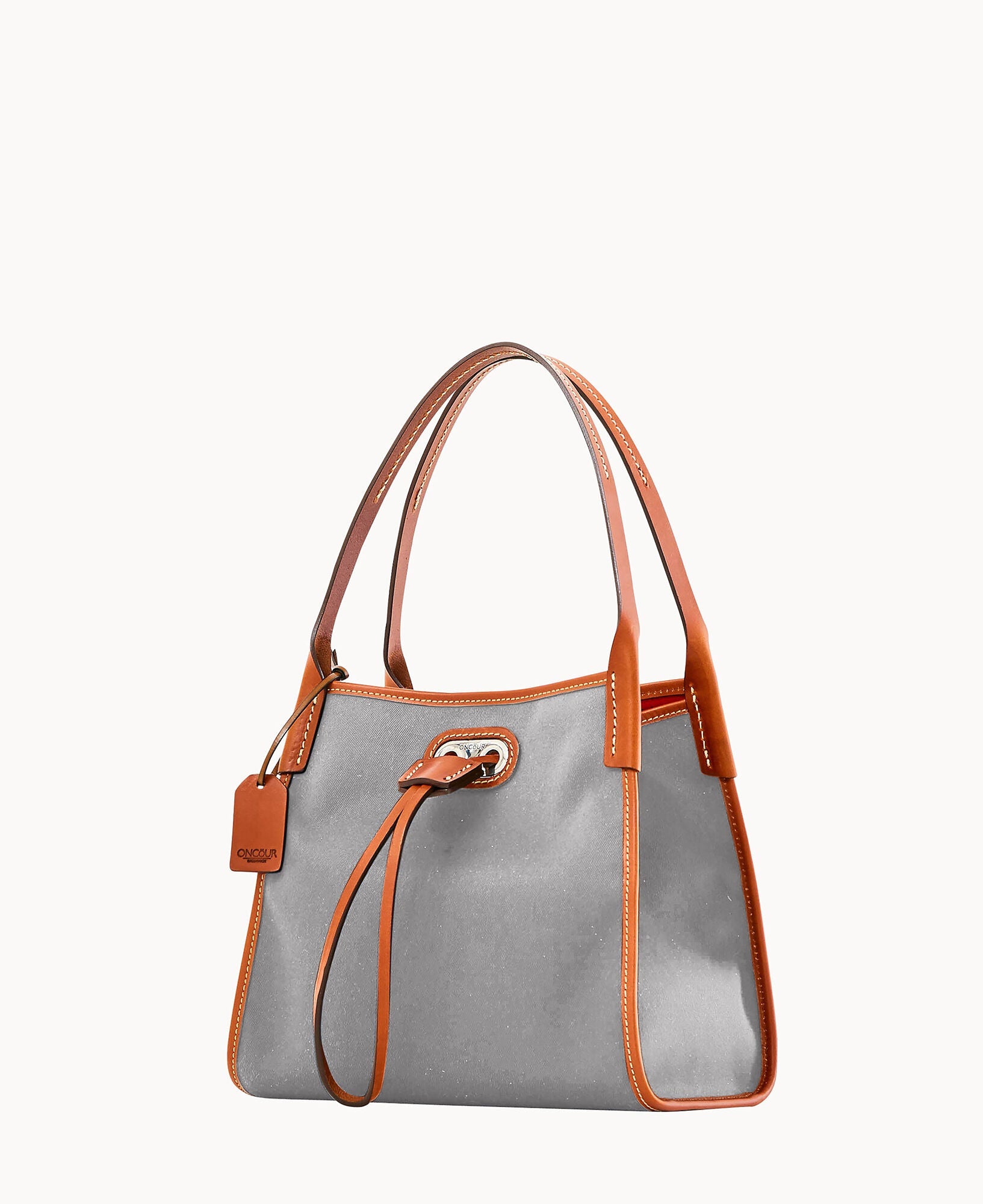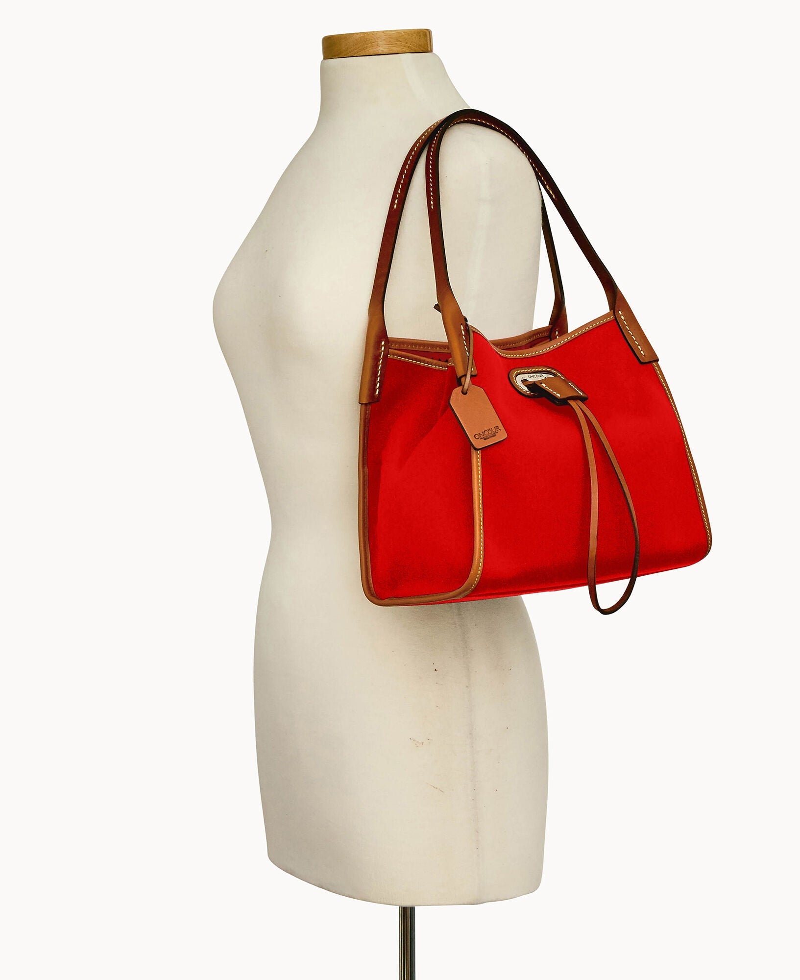Two inside pockets. Inside key hook. Strap drop length 5". Drawstring closure.
