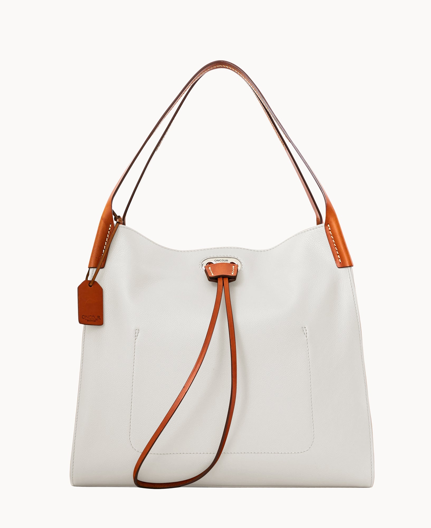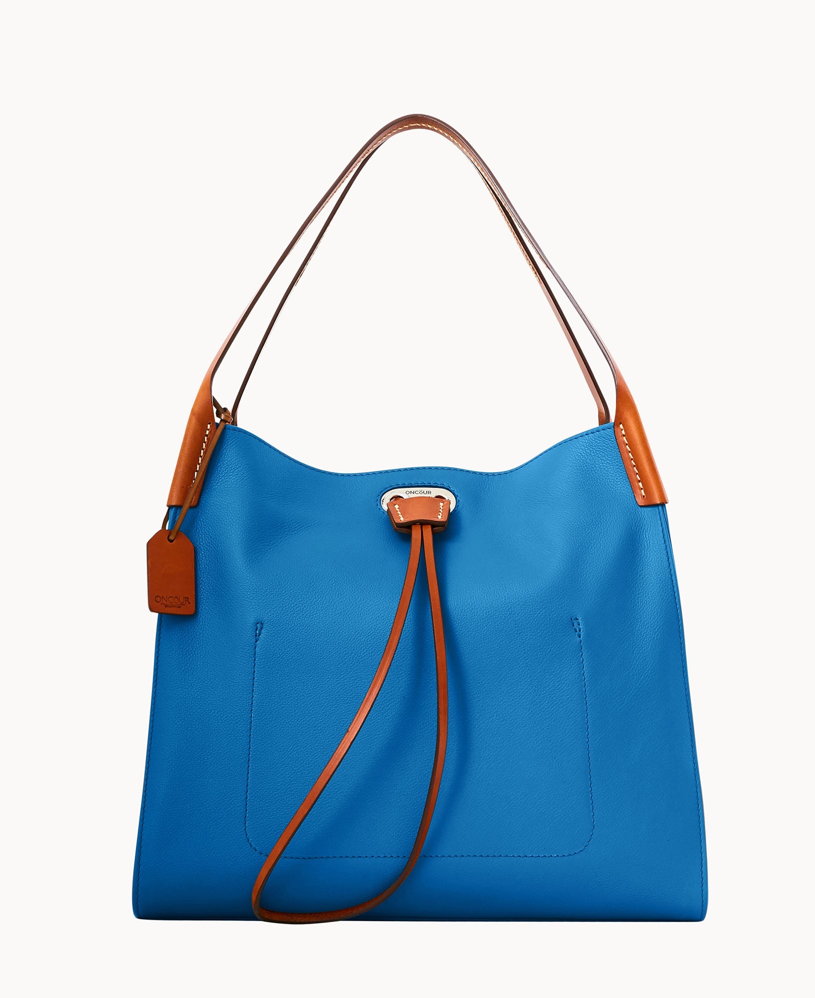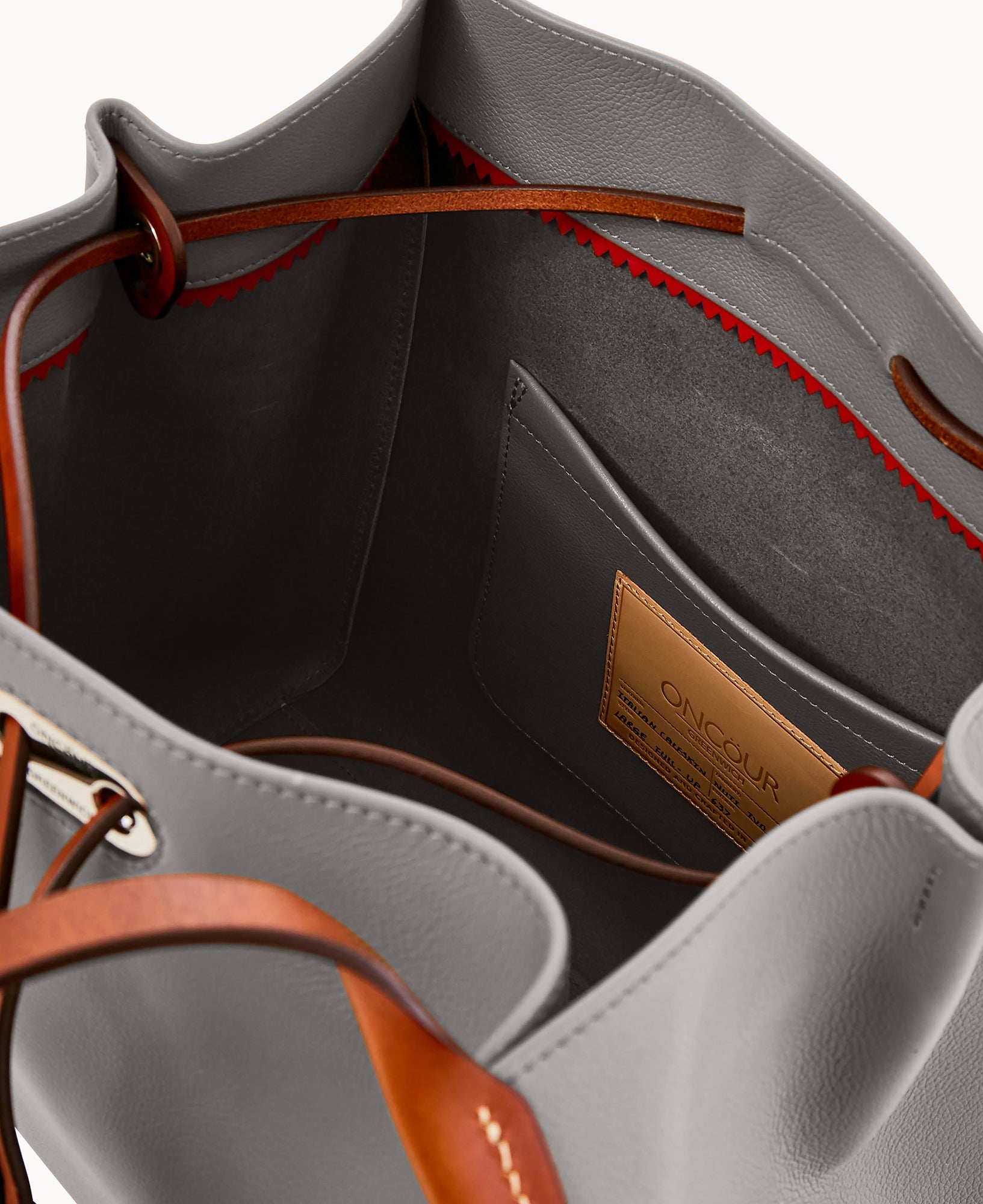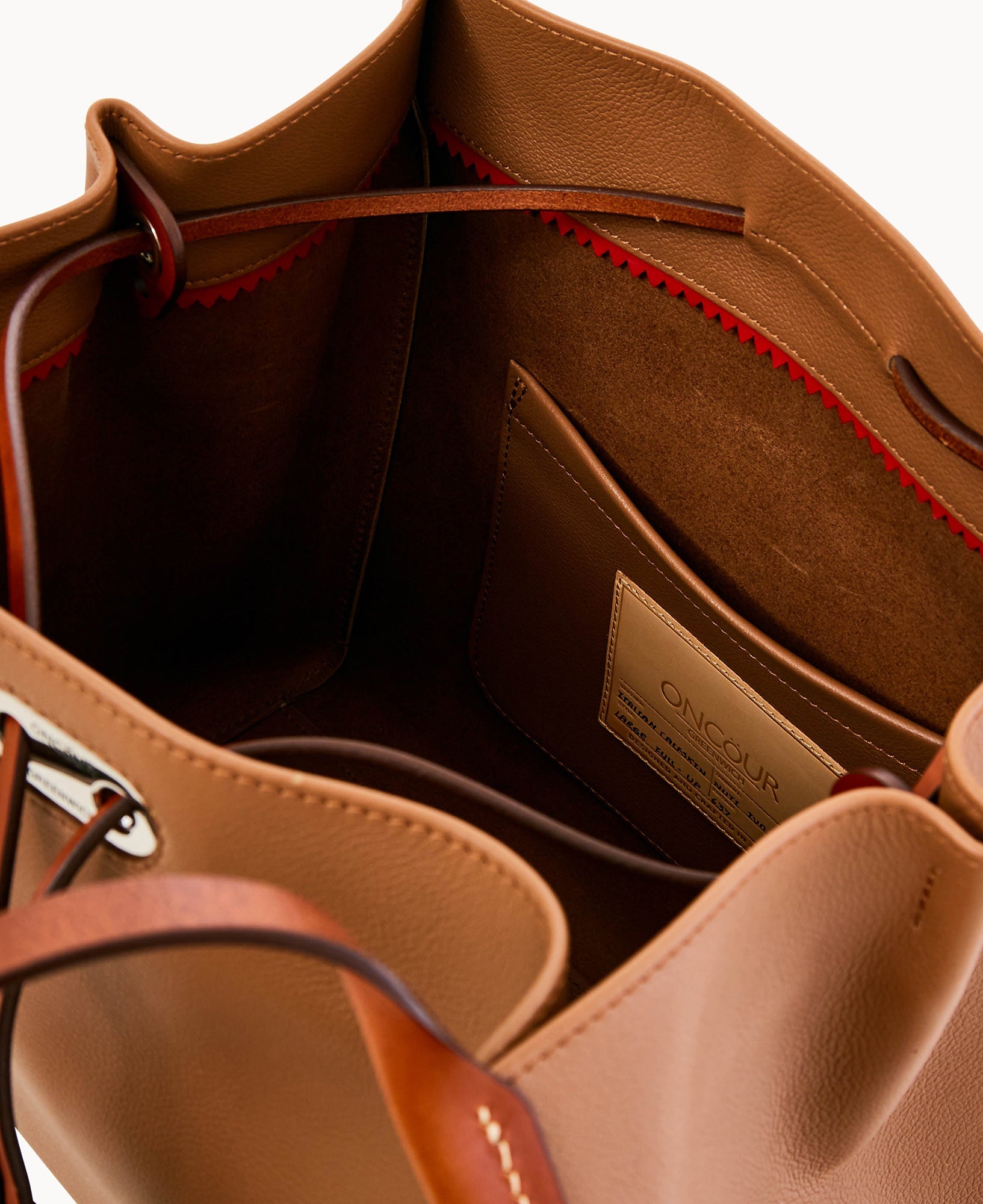 Two inside pockets. Inside key hook. Strap drop length 11". Drawstring closure.