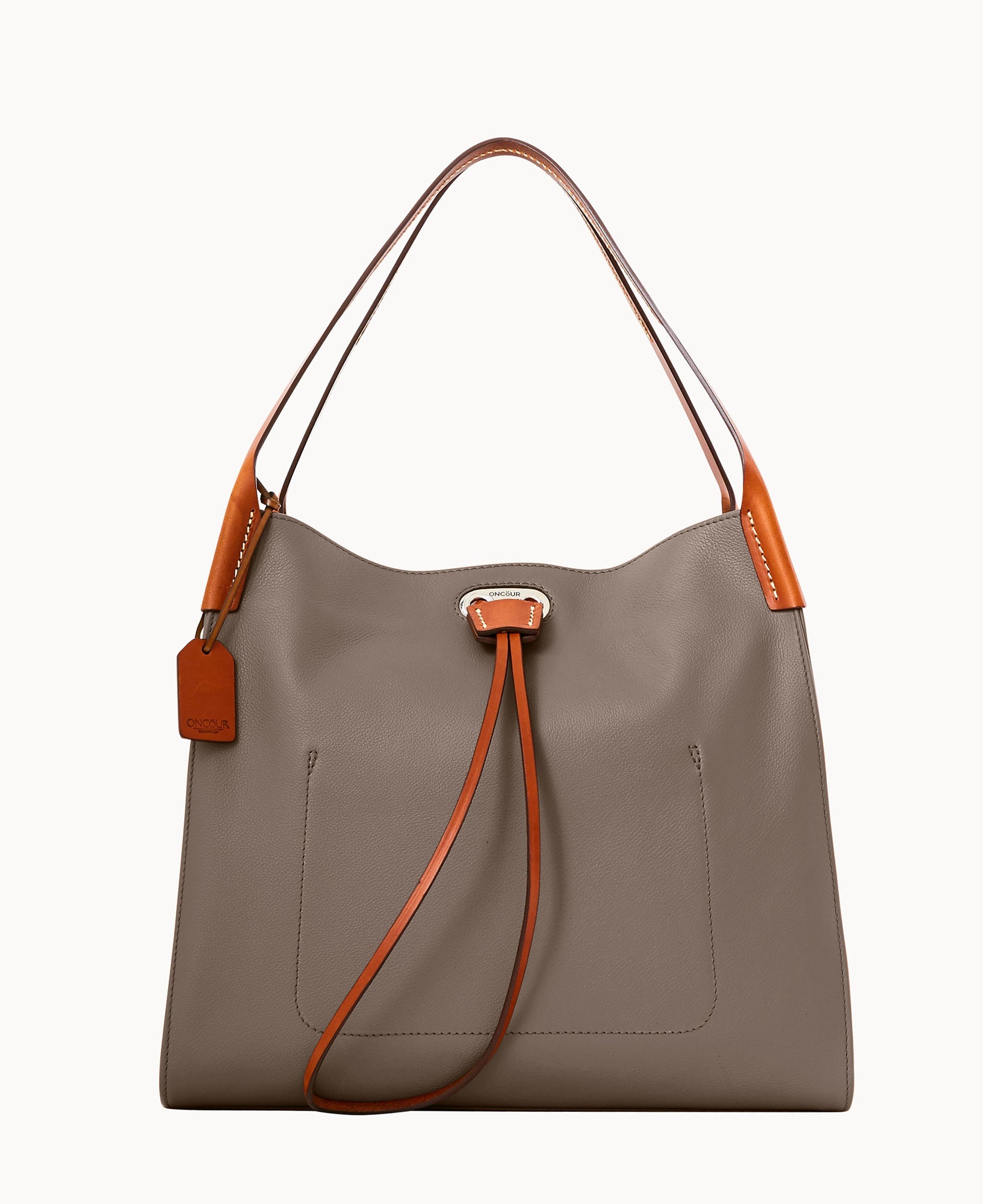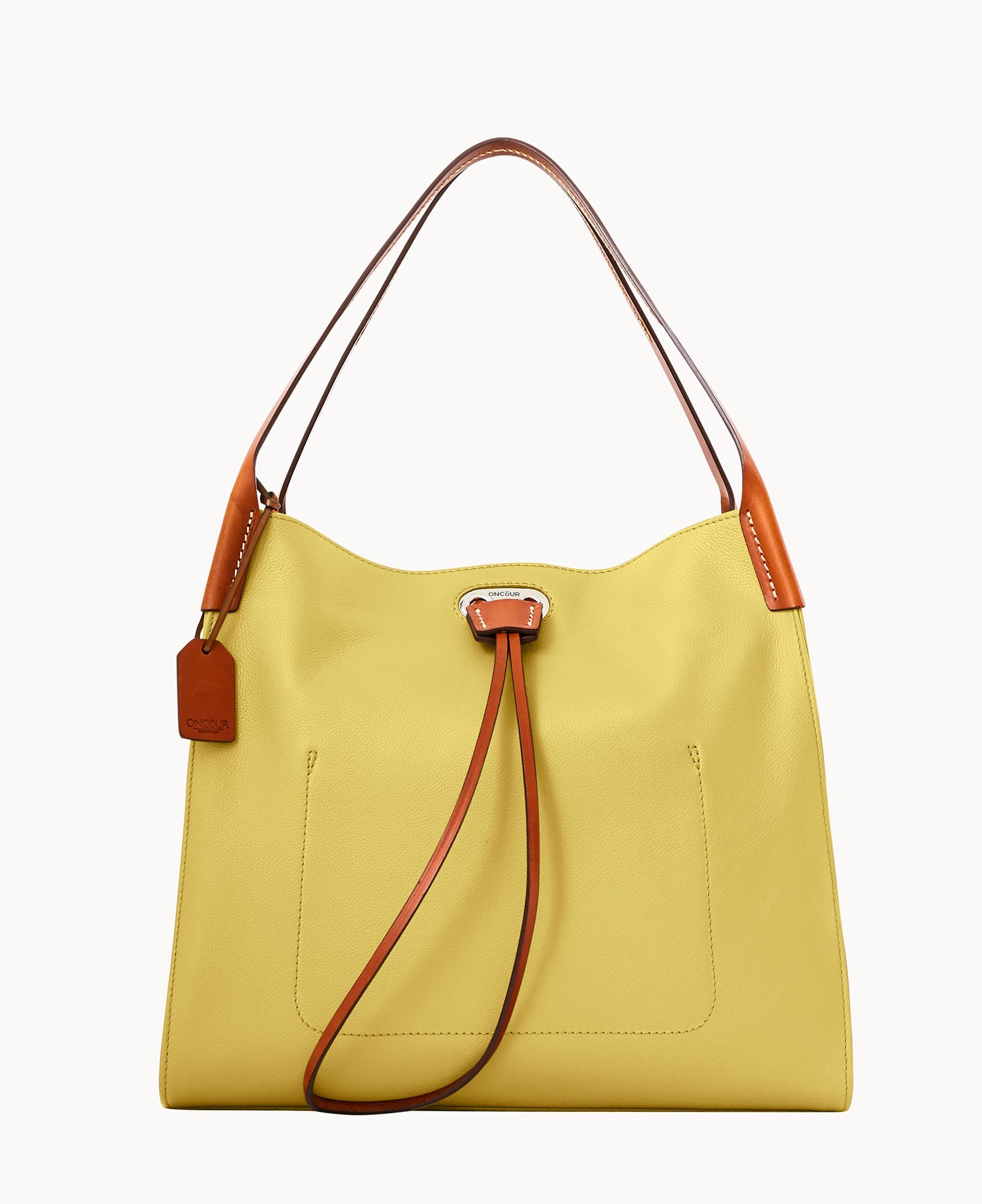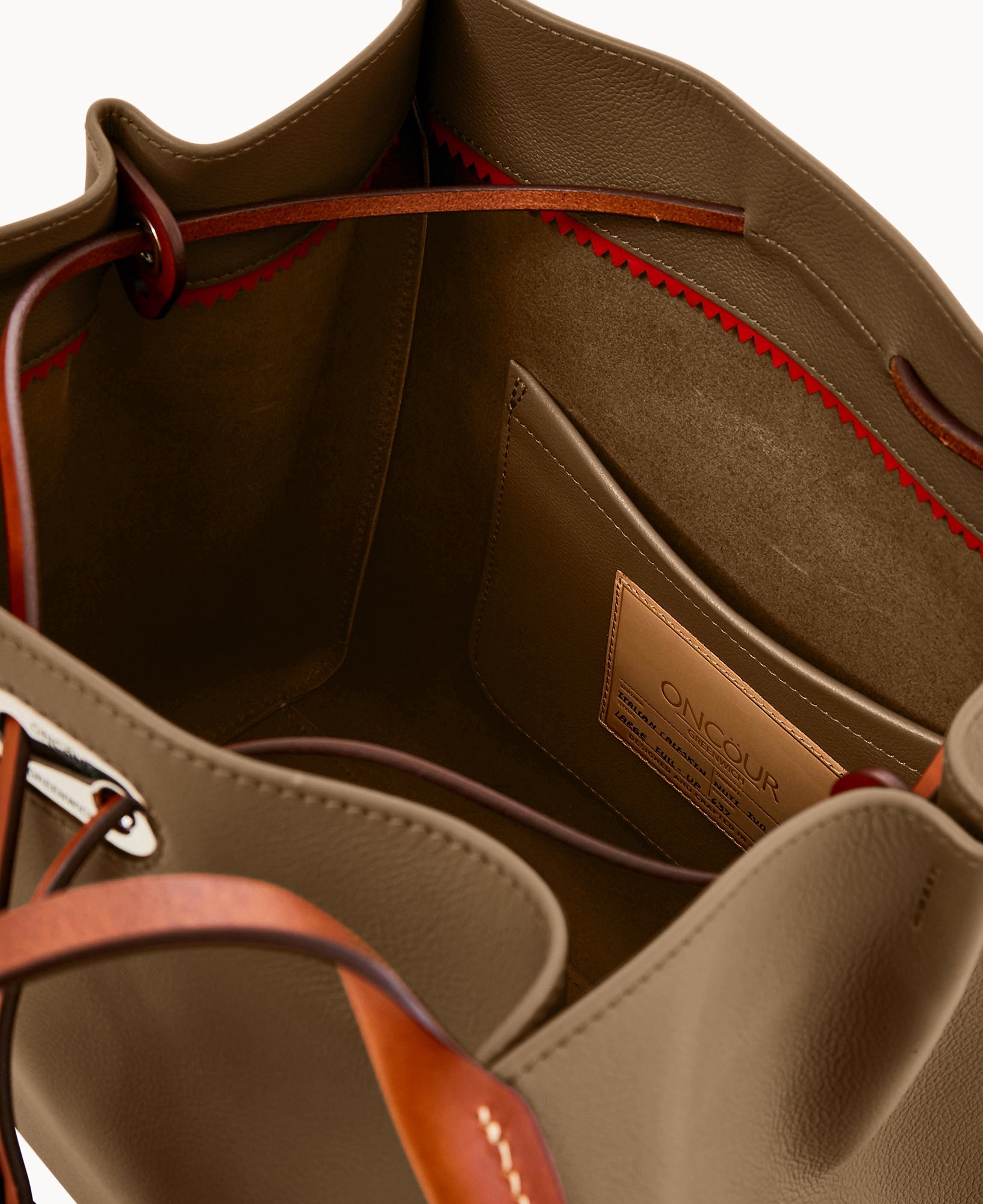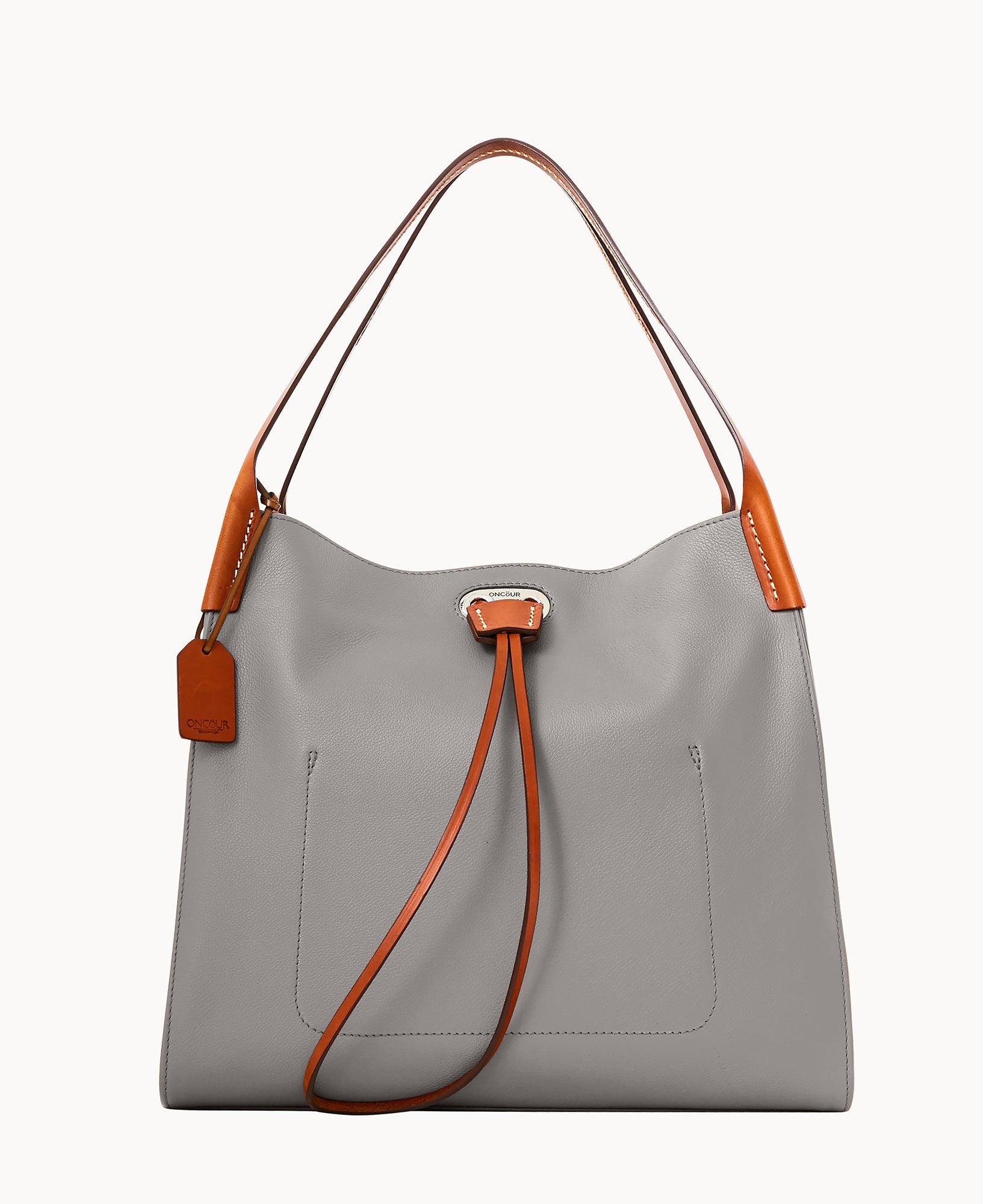 Two inside pockets. Inside key hook. Strap drop length 11". Drawstring closure.