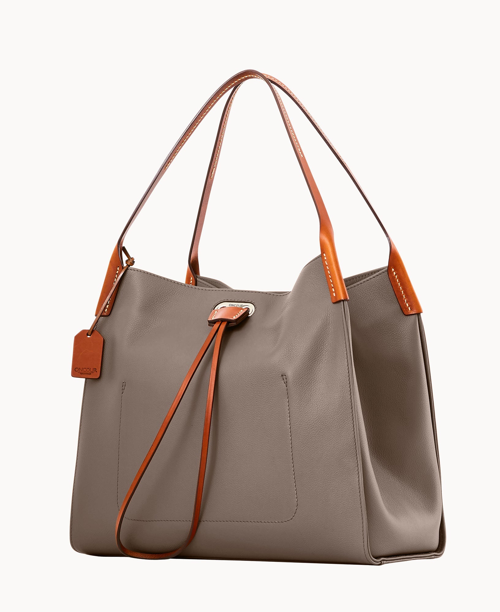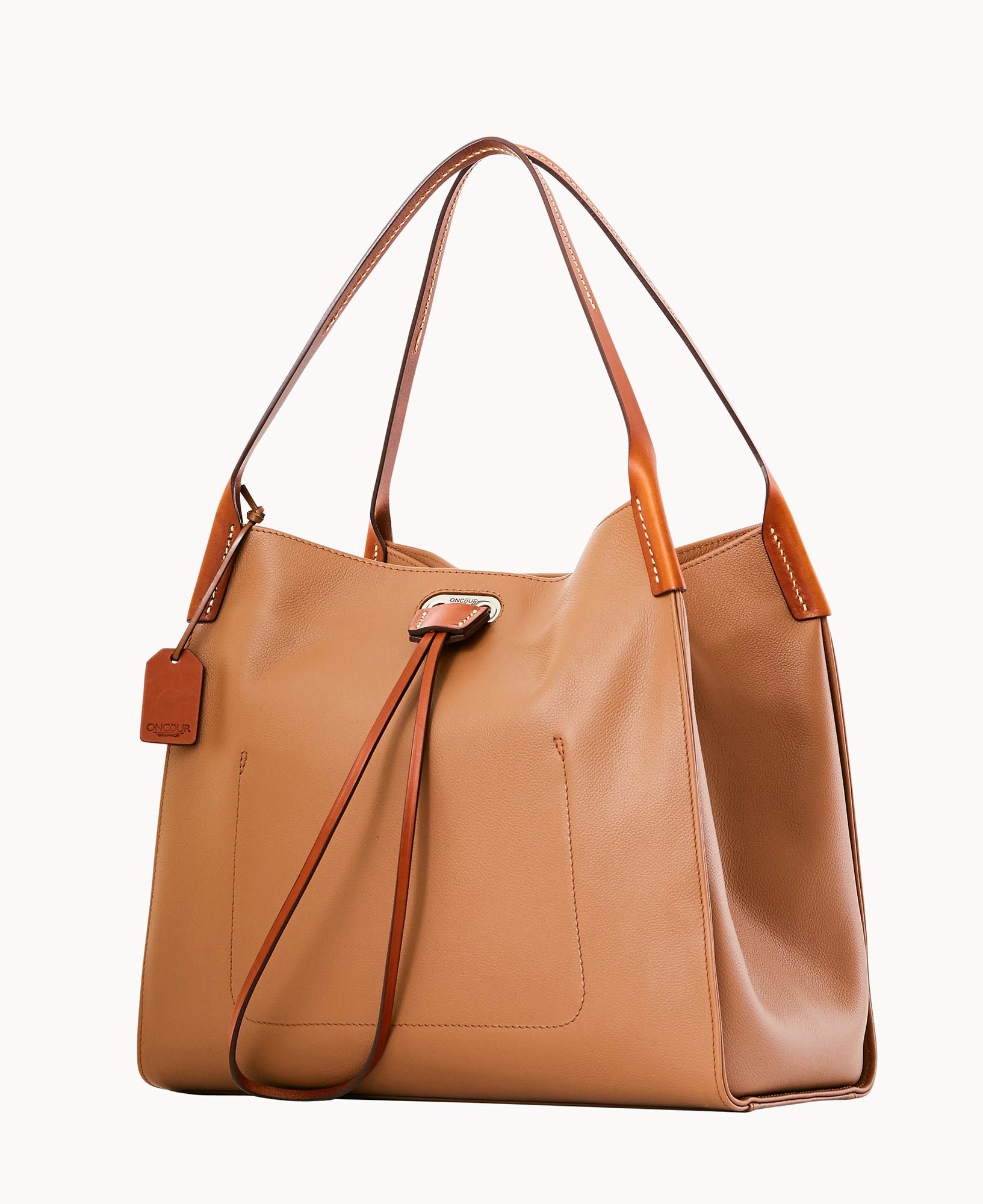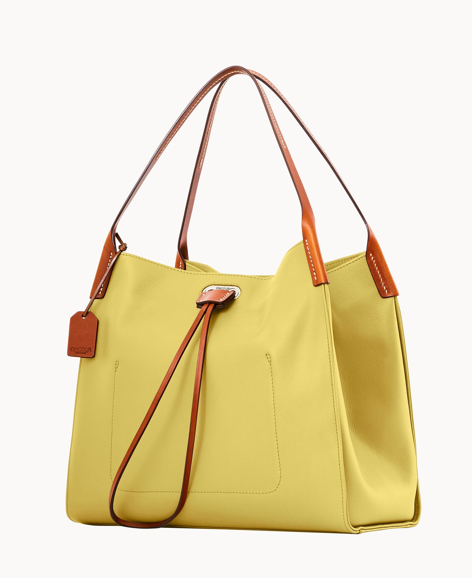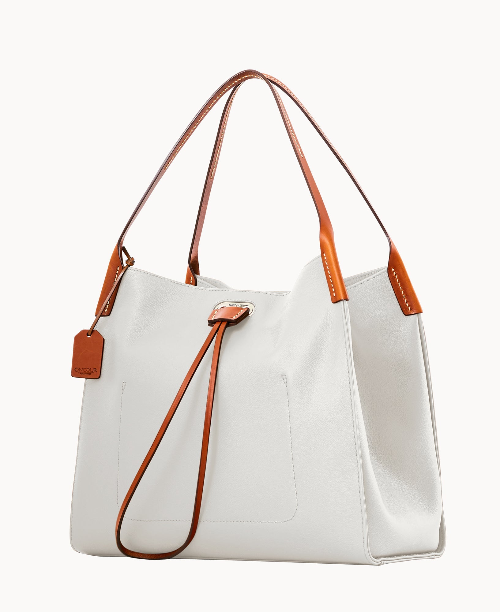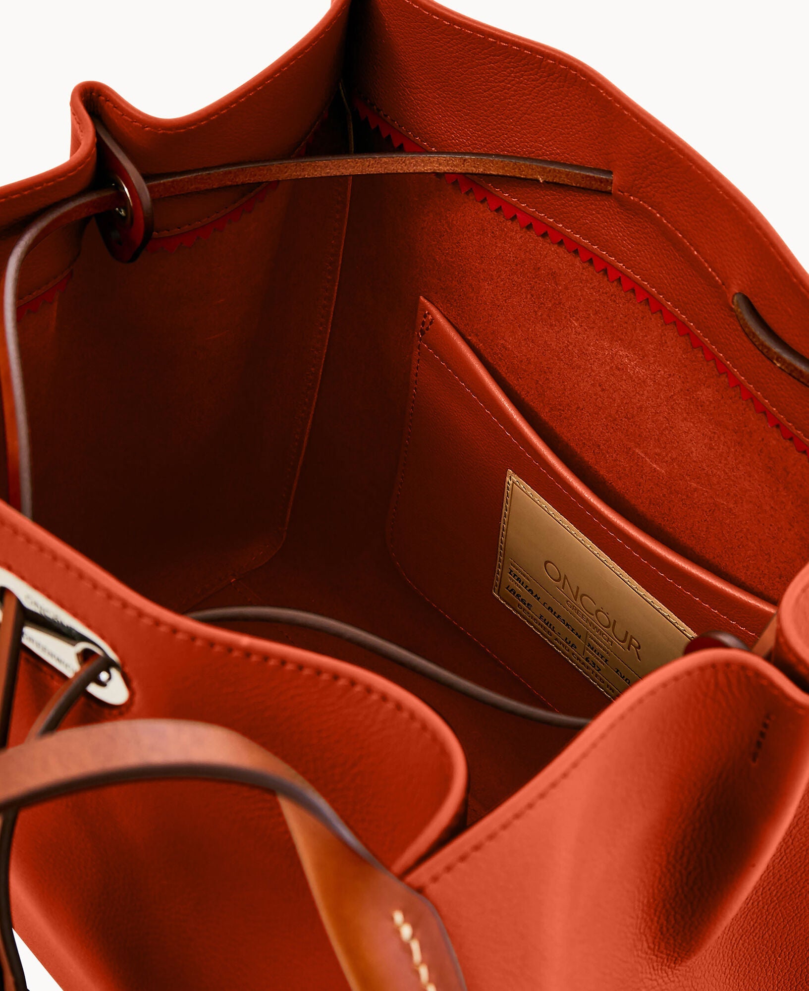 Two inside pockets. Inside key hook. Strap drop length 11". Drawstring closure.