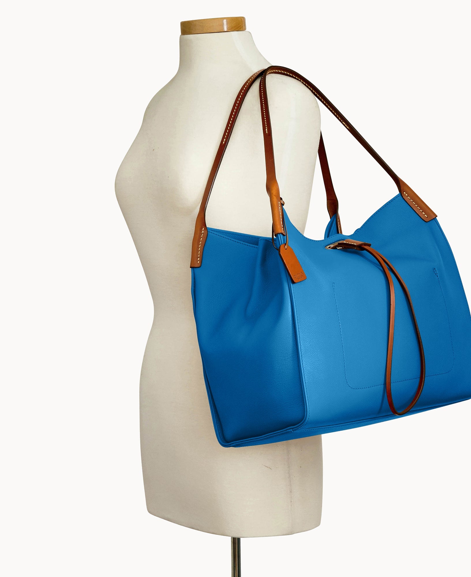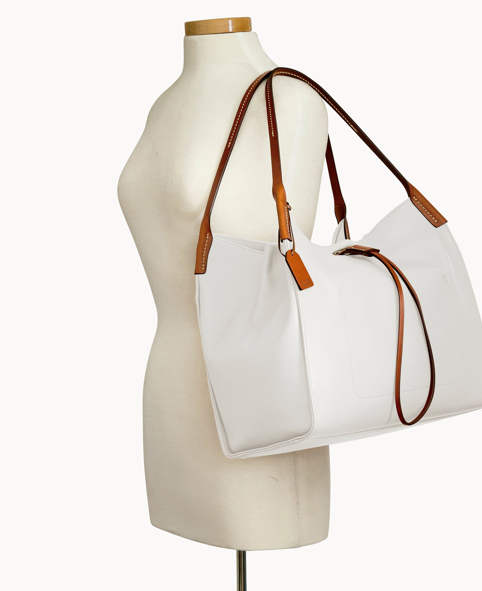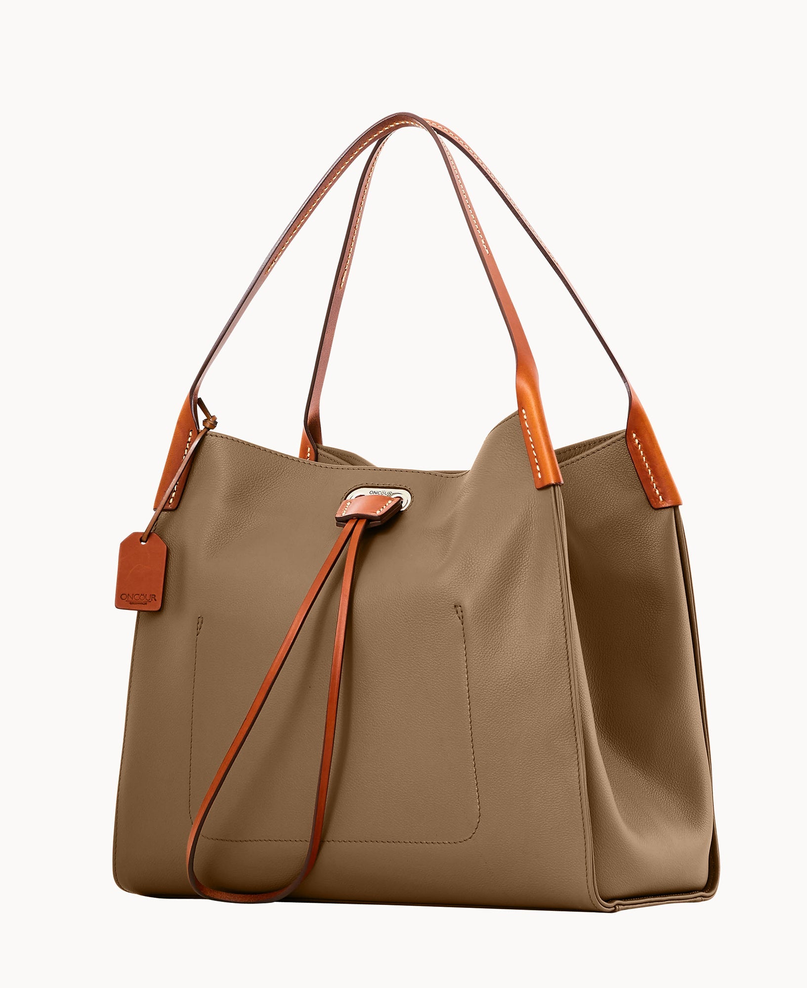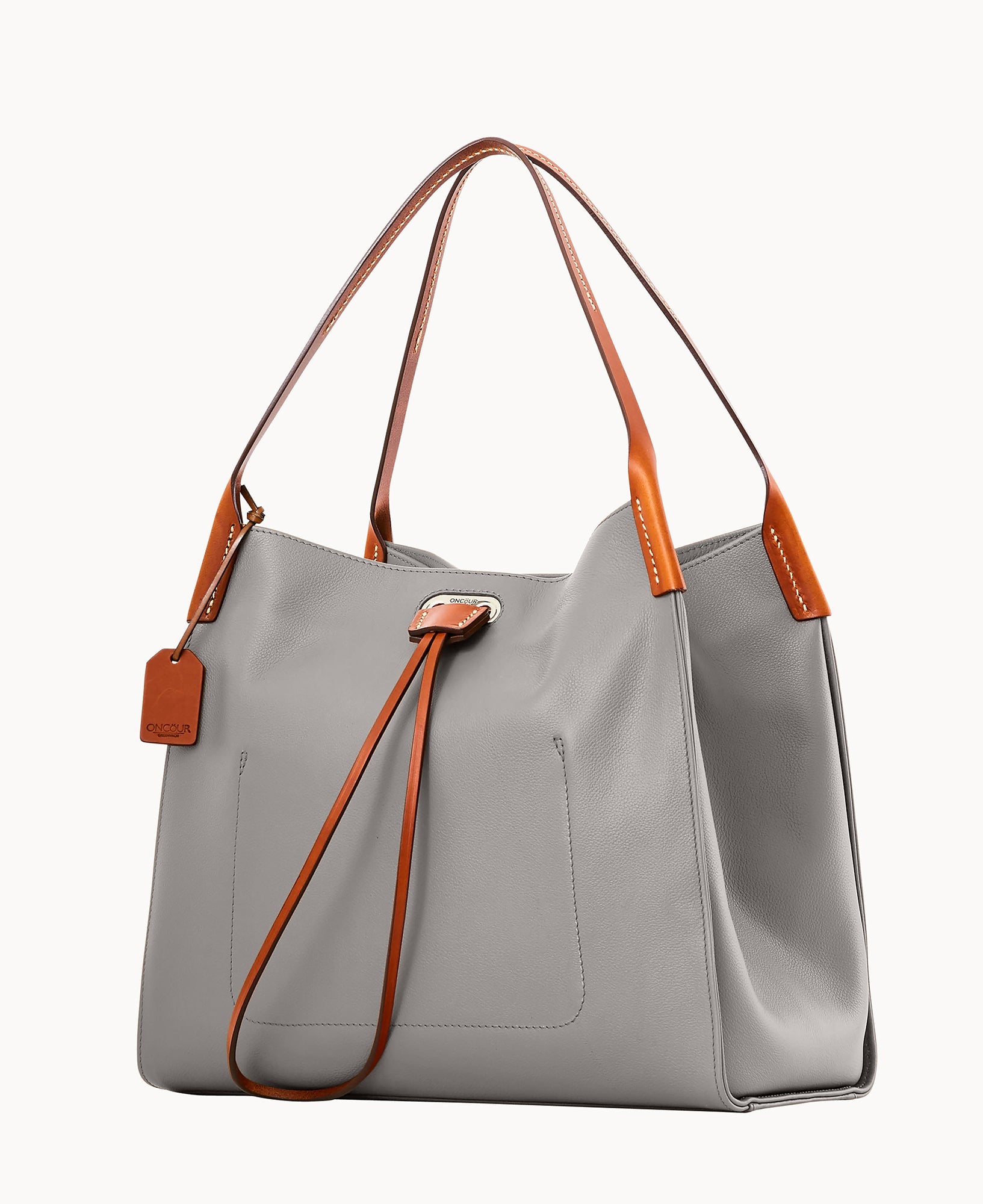 Two inside pockets. Inside key hook. Strap drop length 11". Drawstring closure.