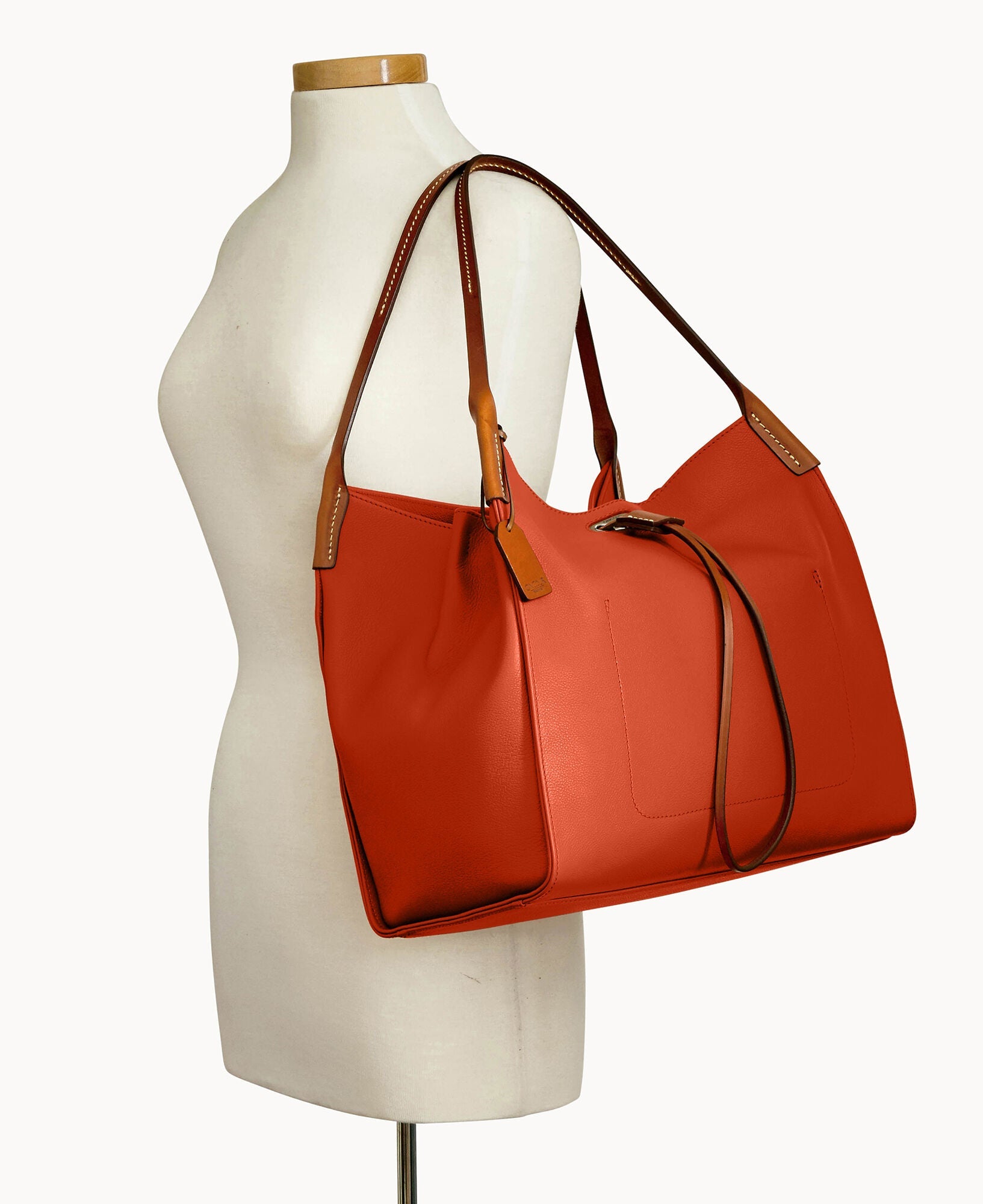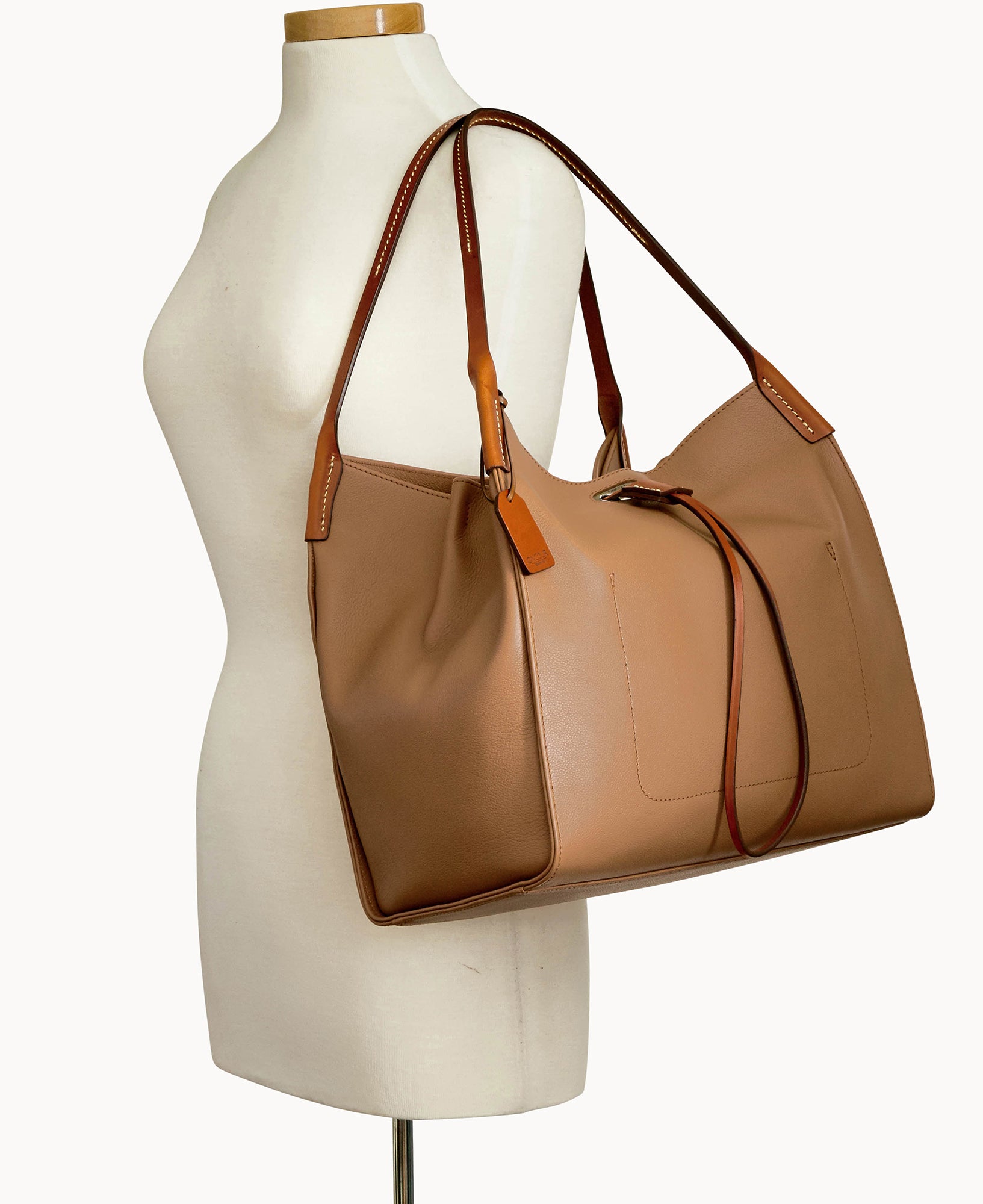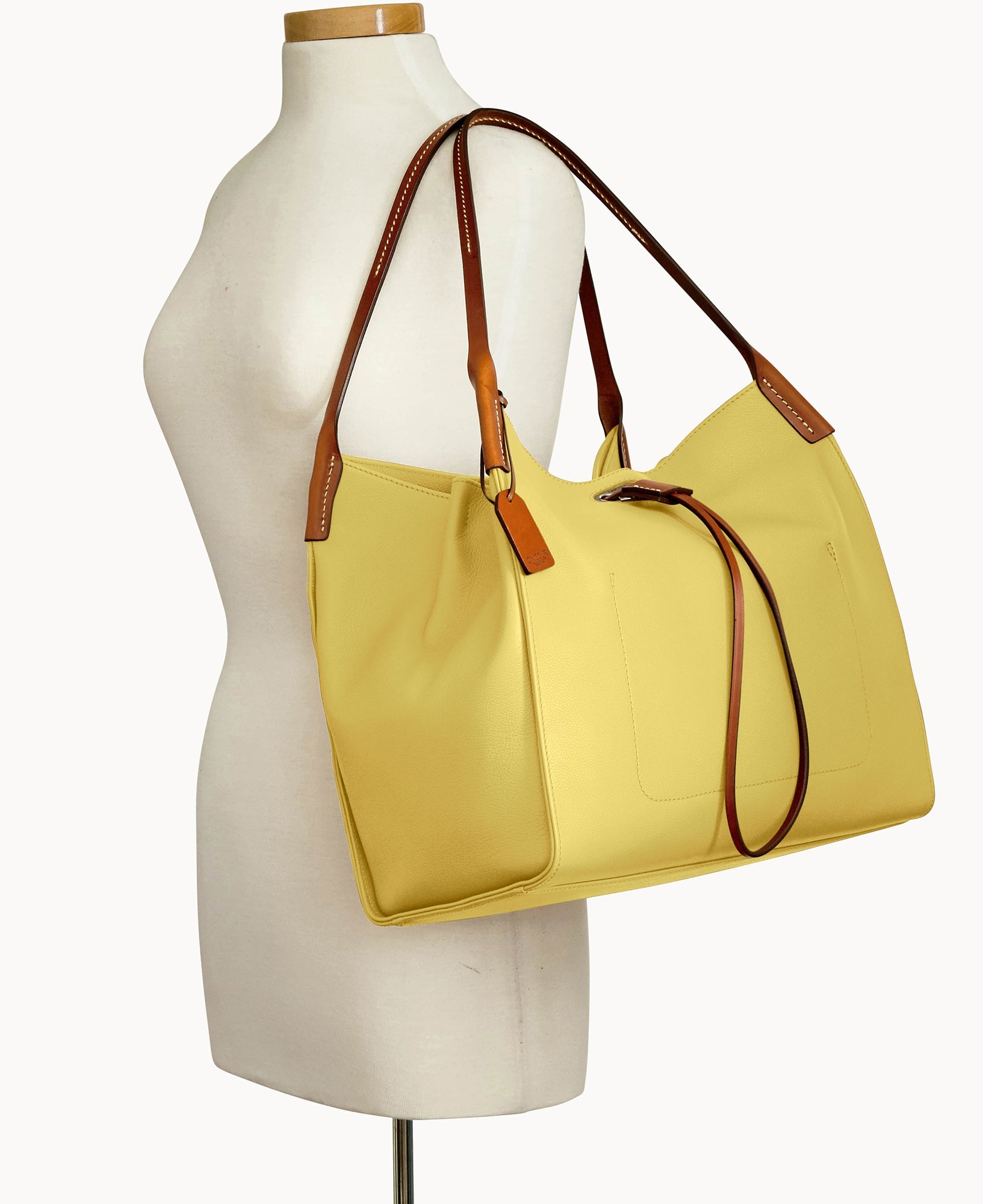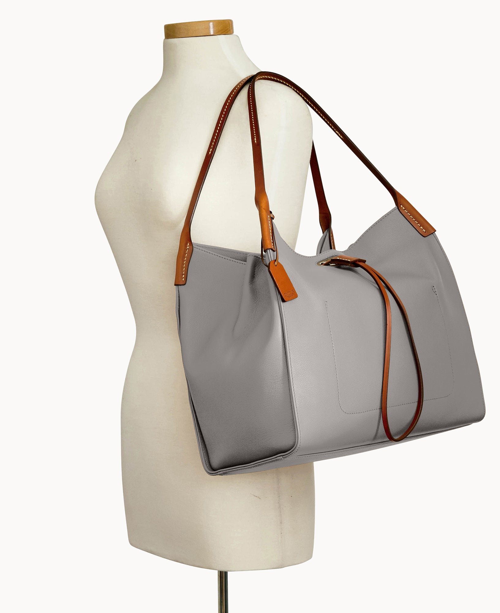 Two inside pockets. Inside key hook. Strap drop length 11". Drawstring closure.