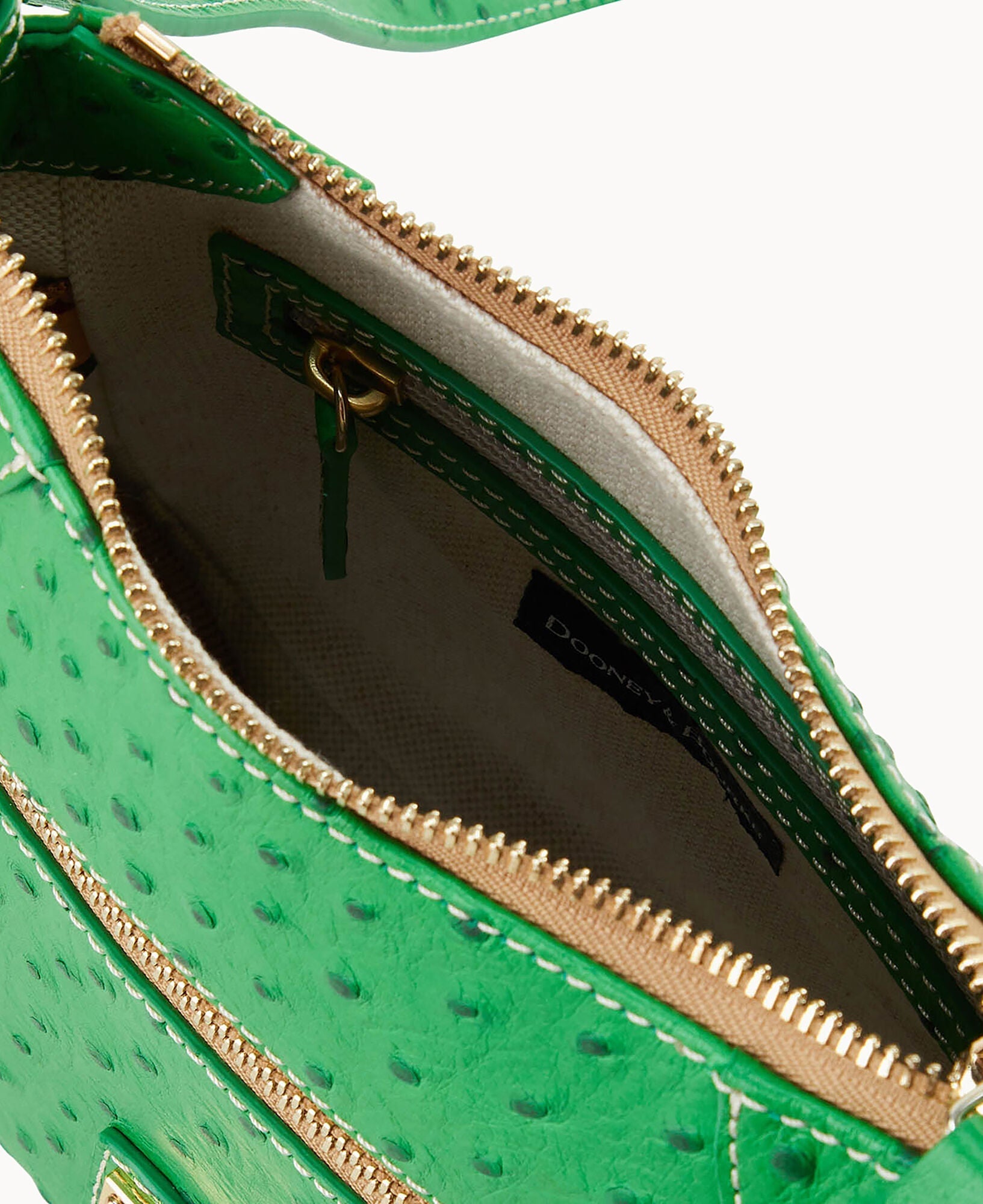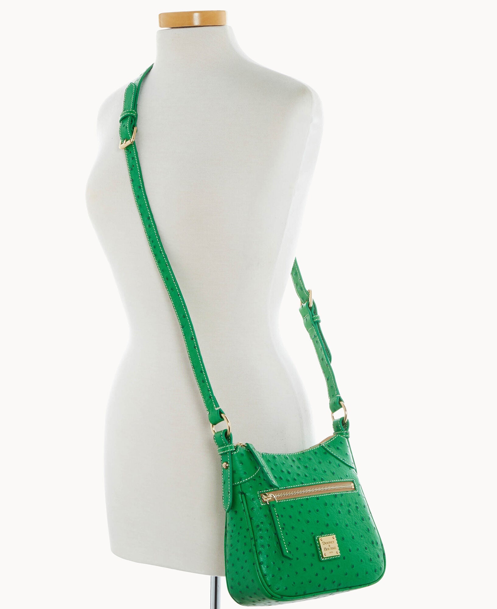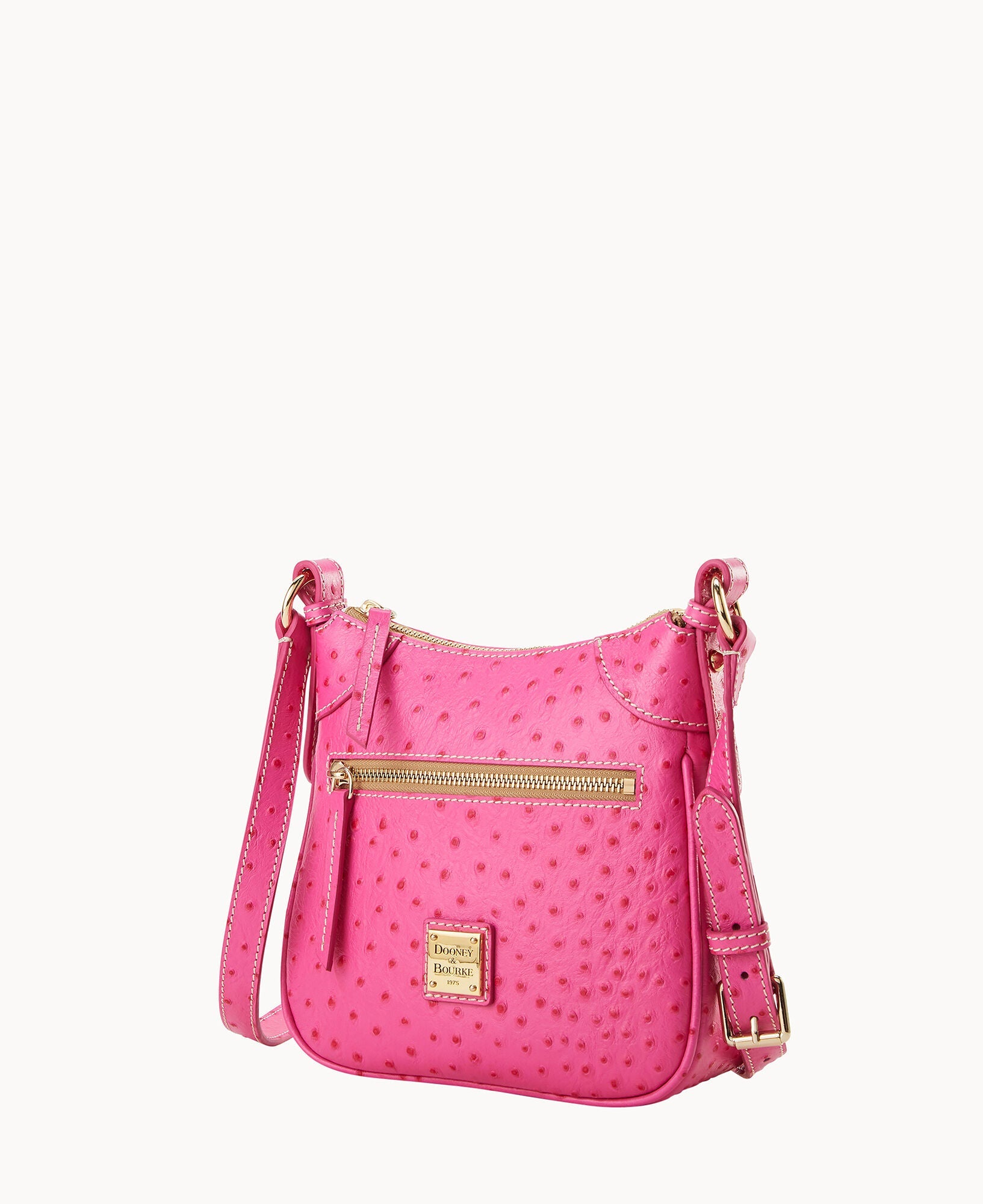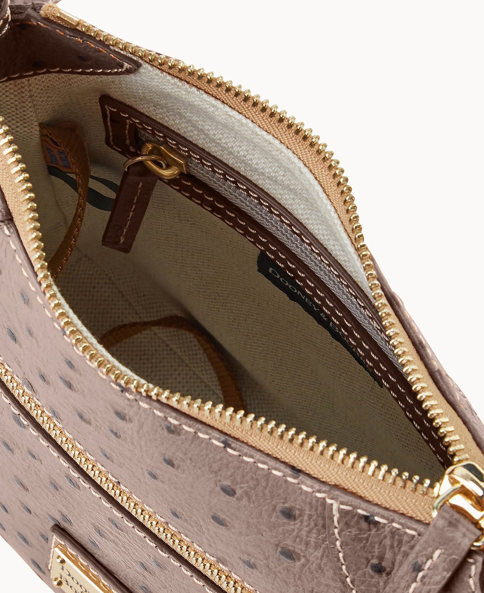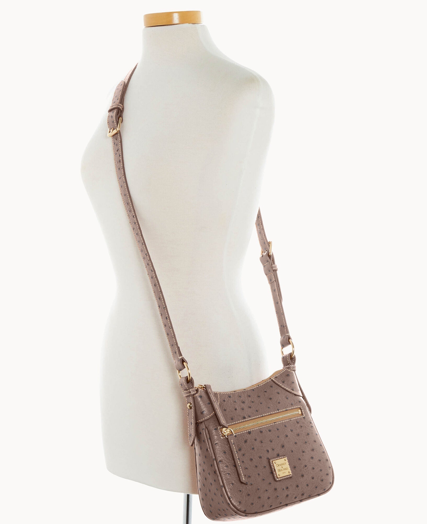 One outside zipper pocket. One inside pocket. One inside zipper pocket. Inside key hook. Lined. Zipper closure. Adjustable strap. Strap drop length 26".