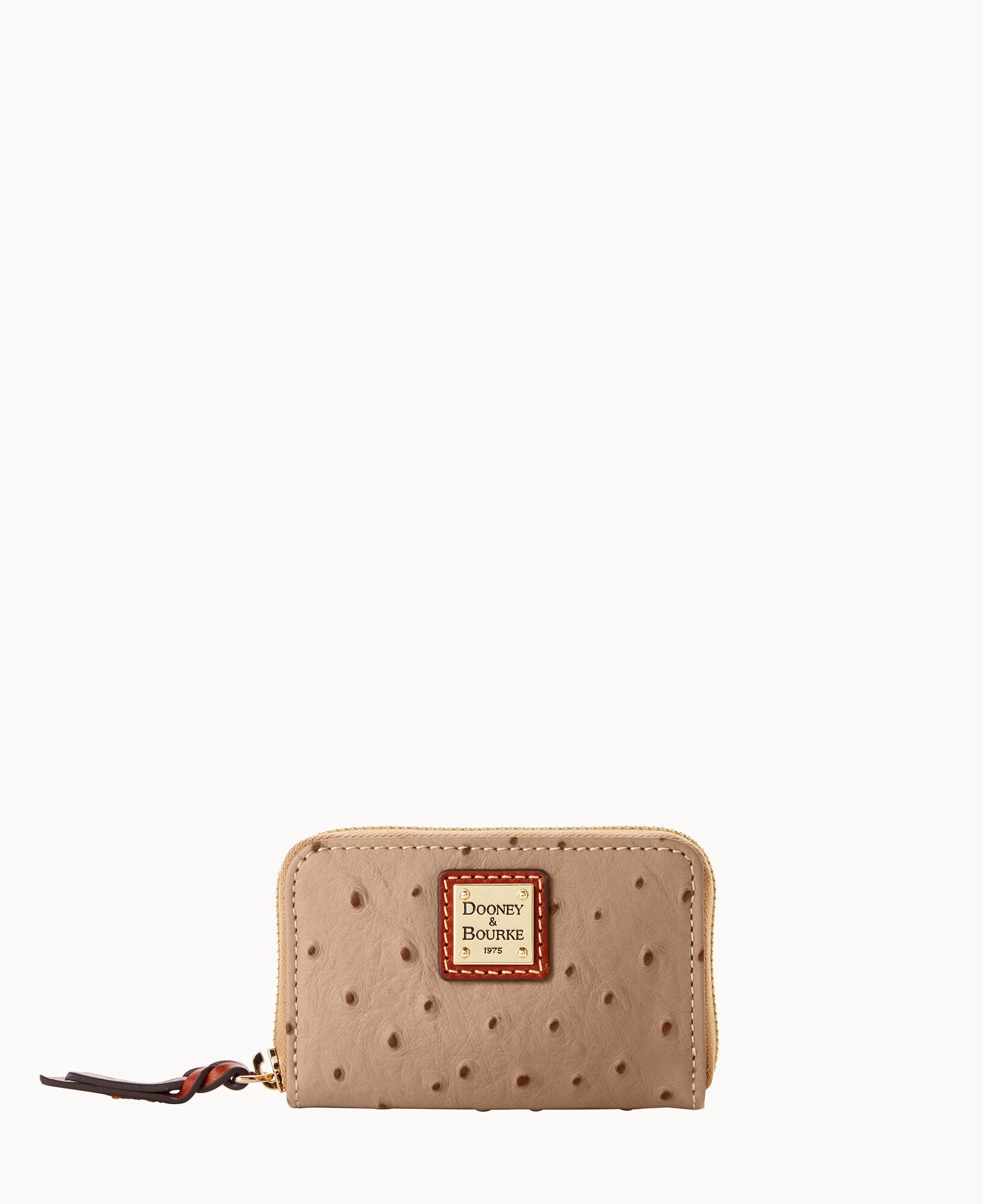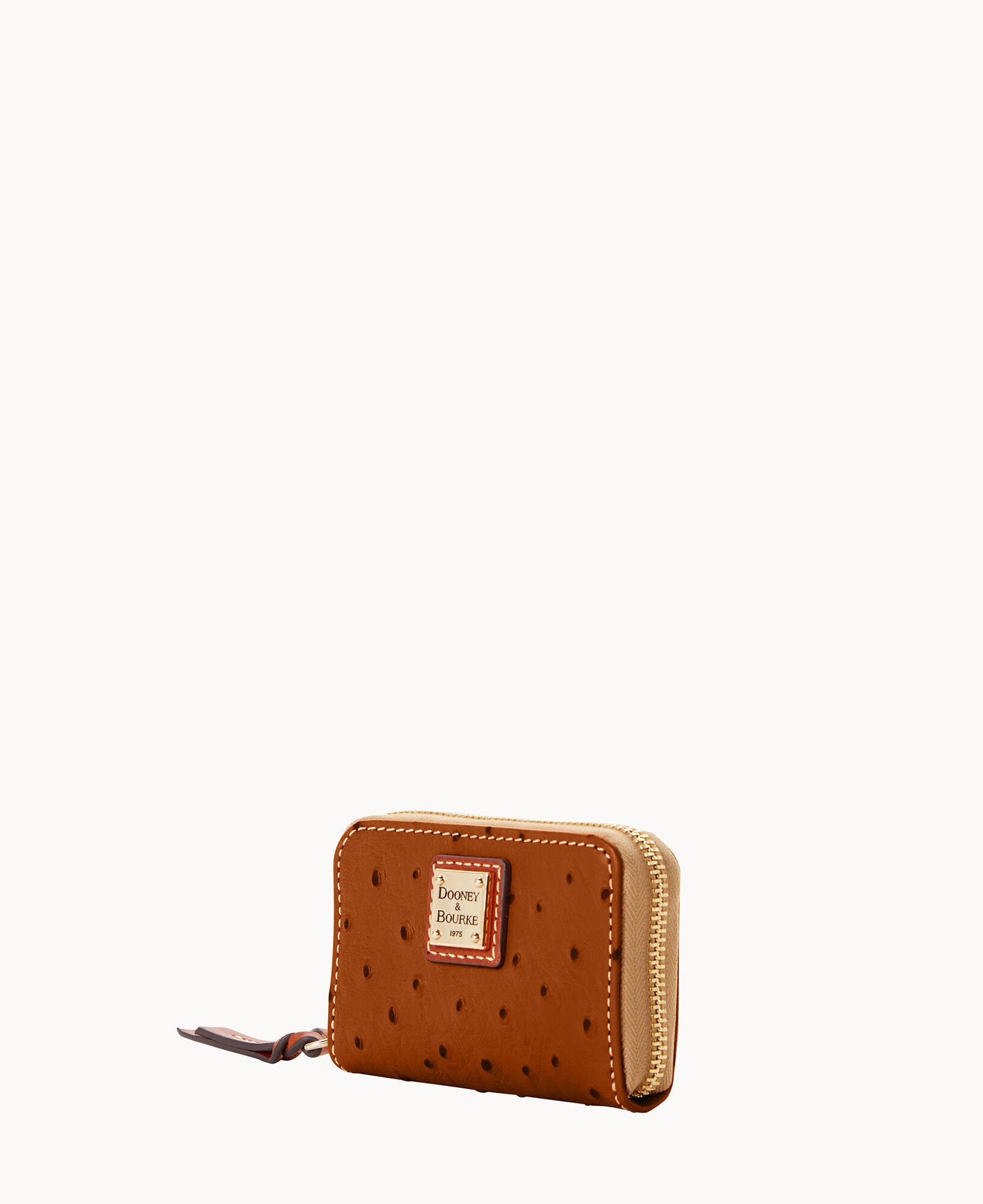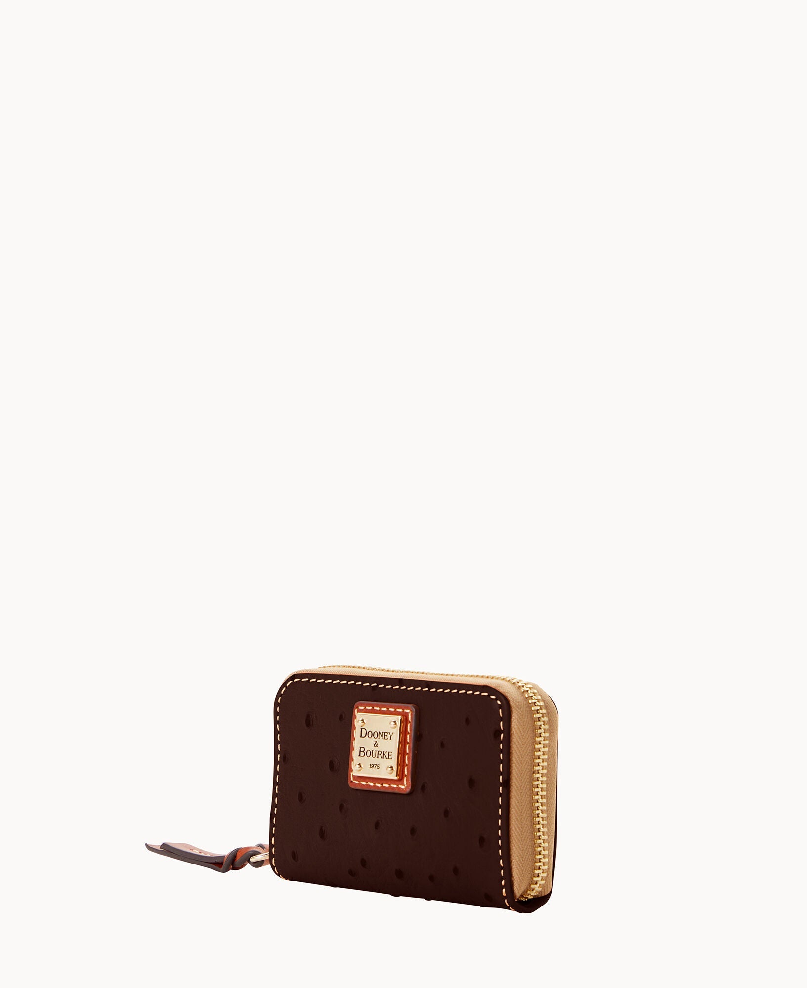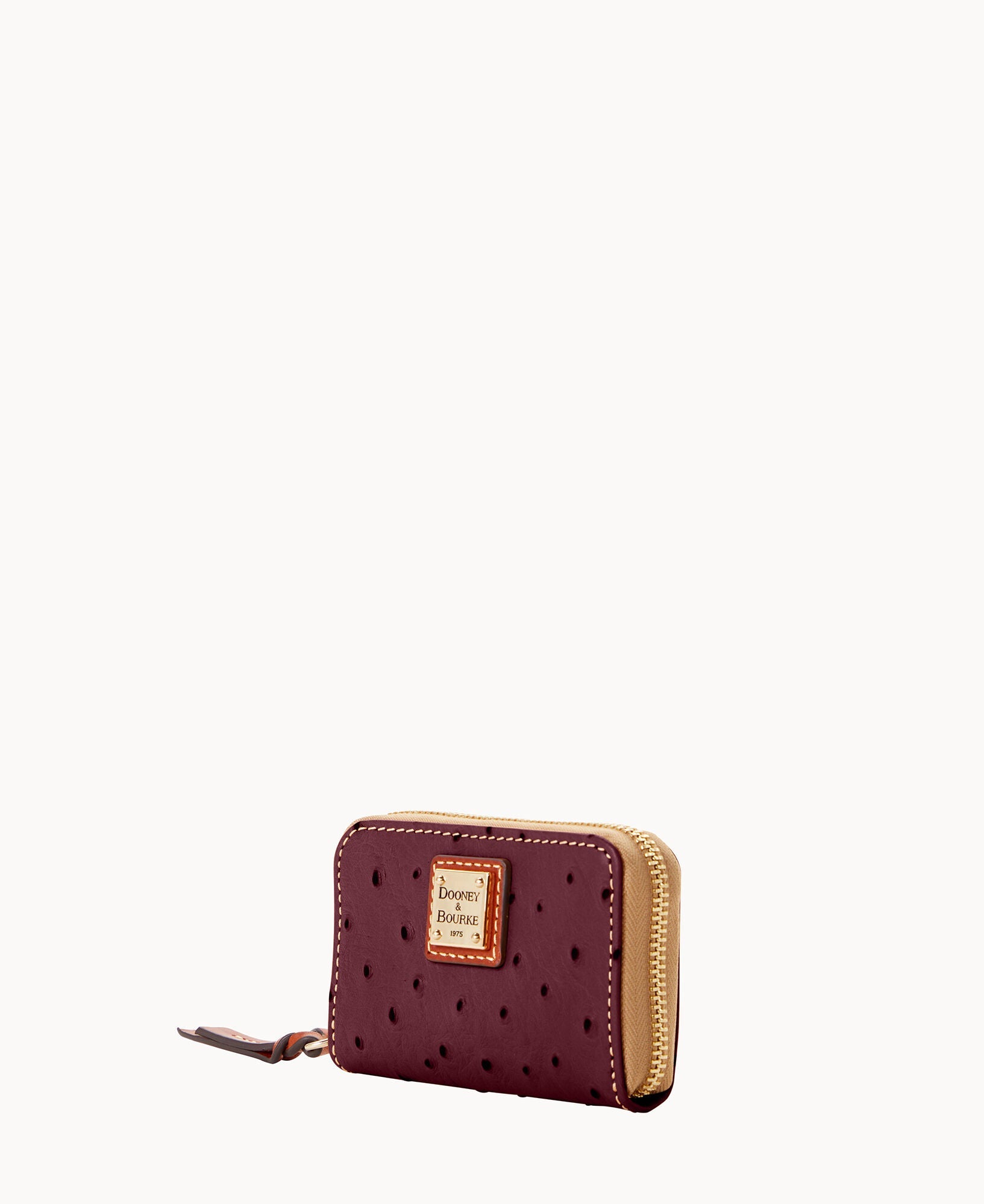 One inside zip pocket. Two inside compartments. Four credit card slots. Lined. Zipper closure.