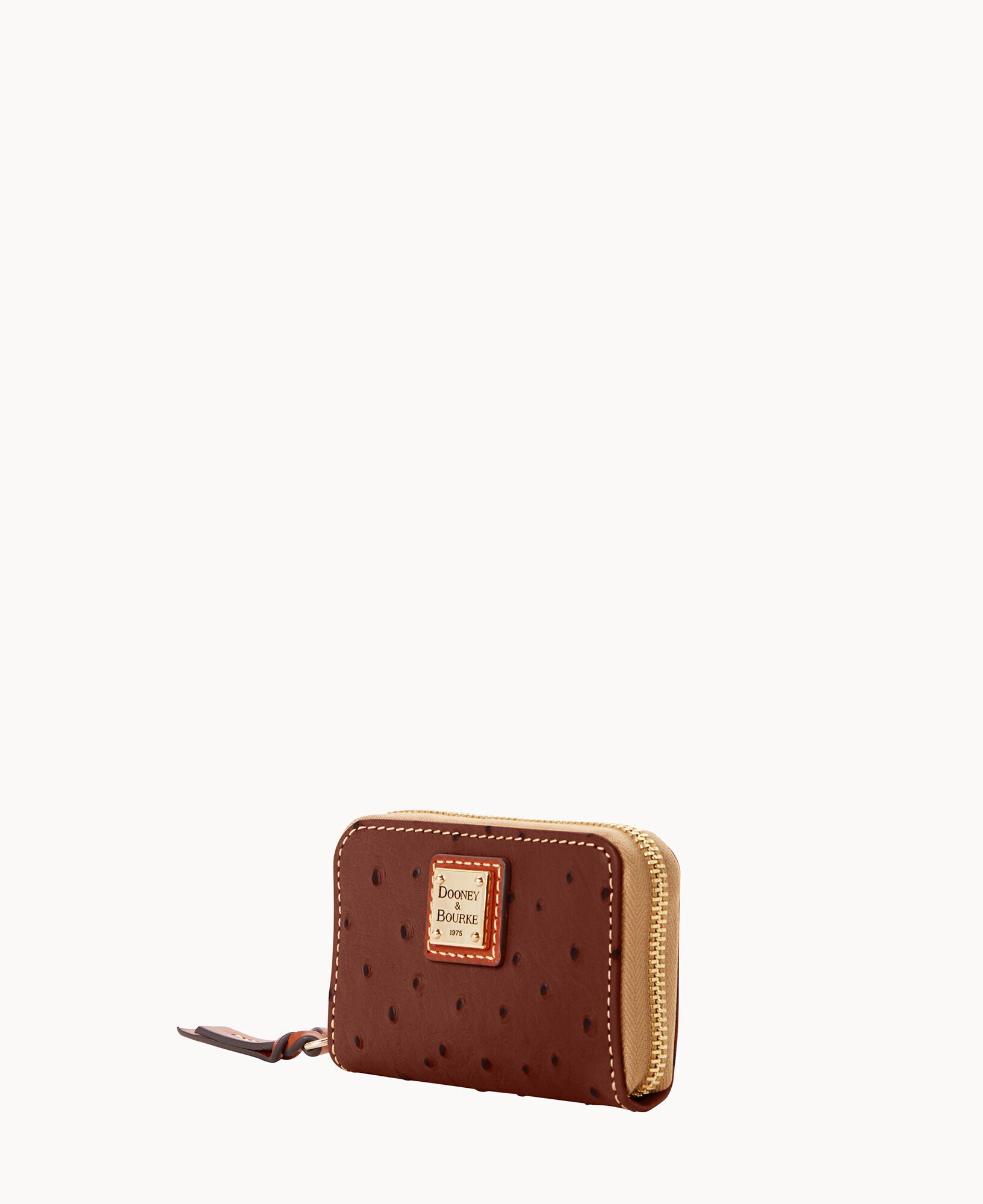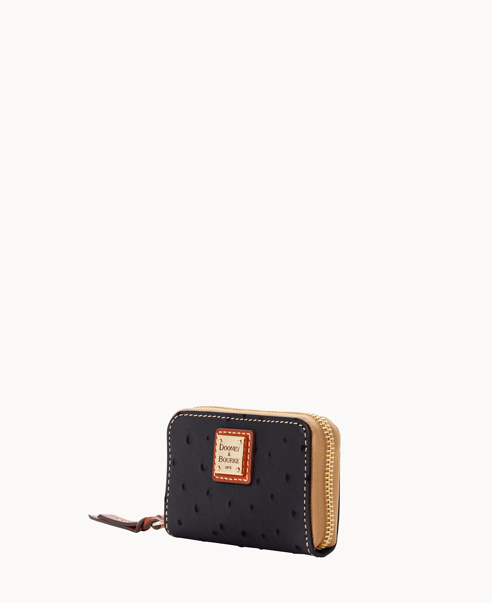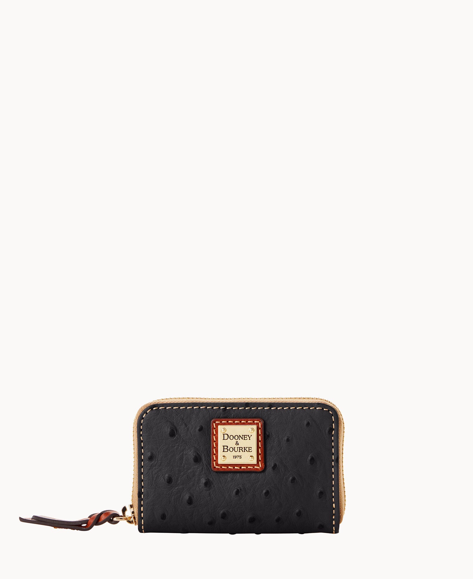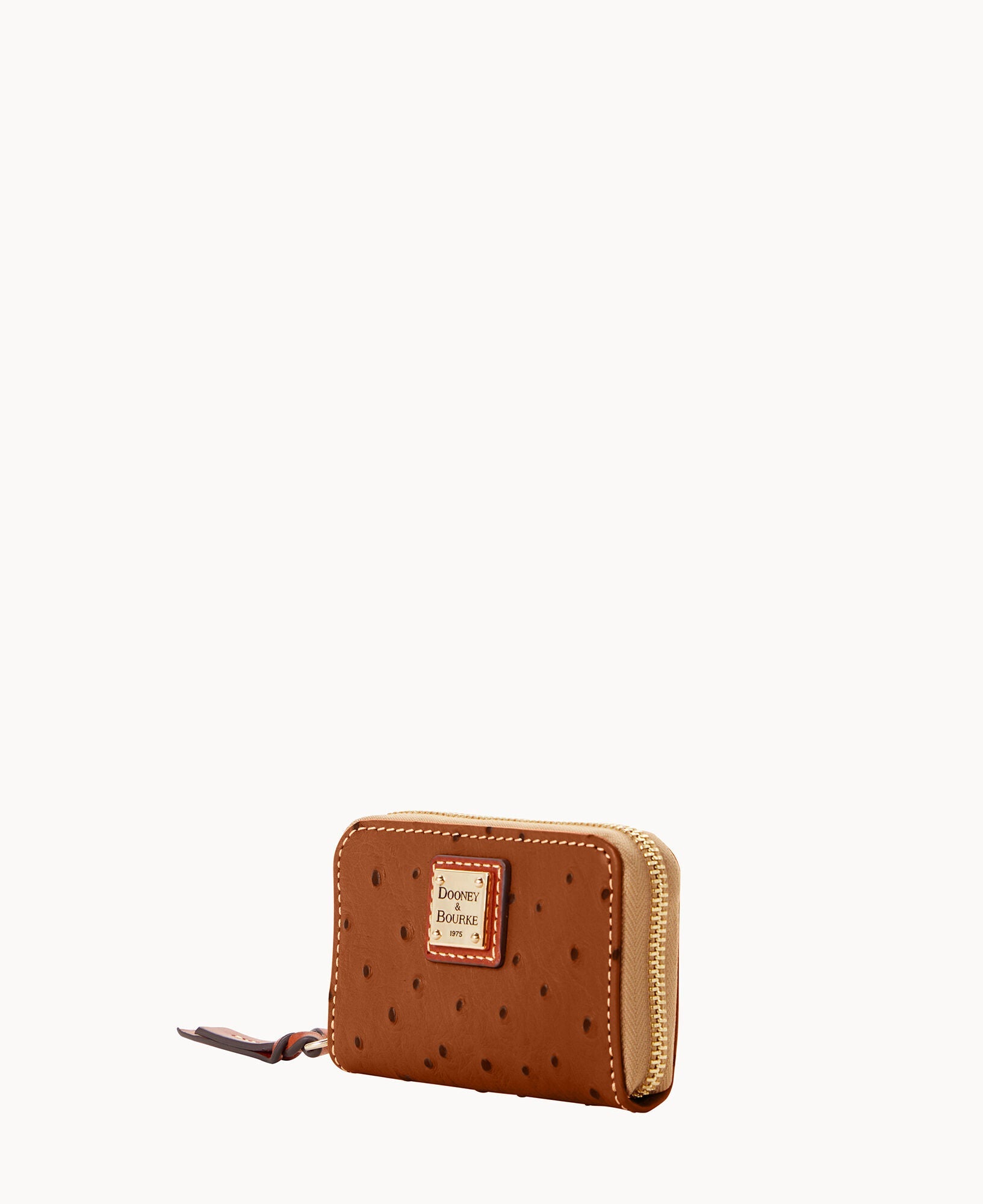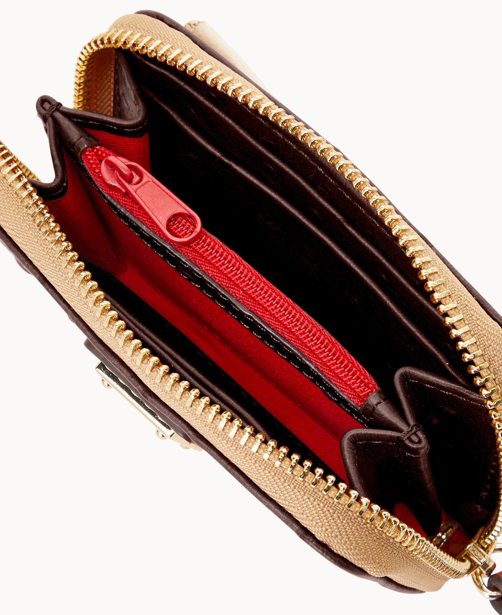 One inside zip pocket. Two inside compartments. Four credit card slots. Lined. Zipper closure.