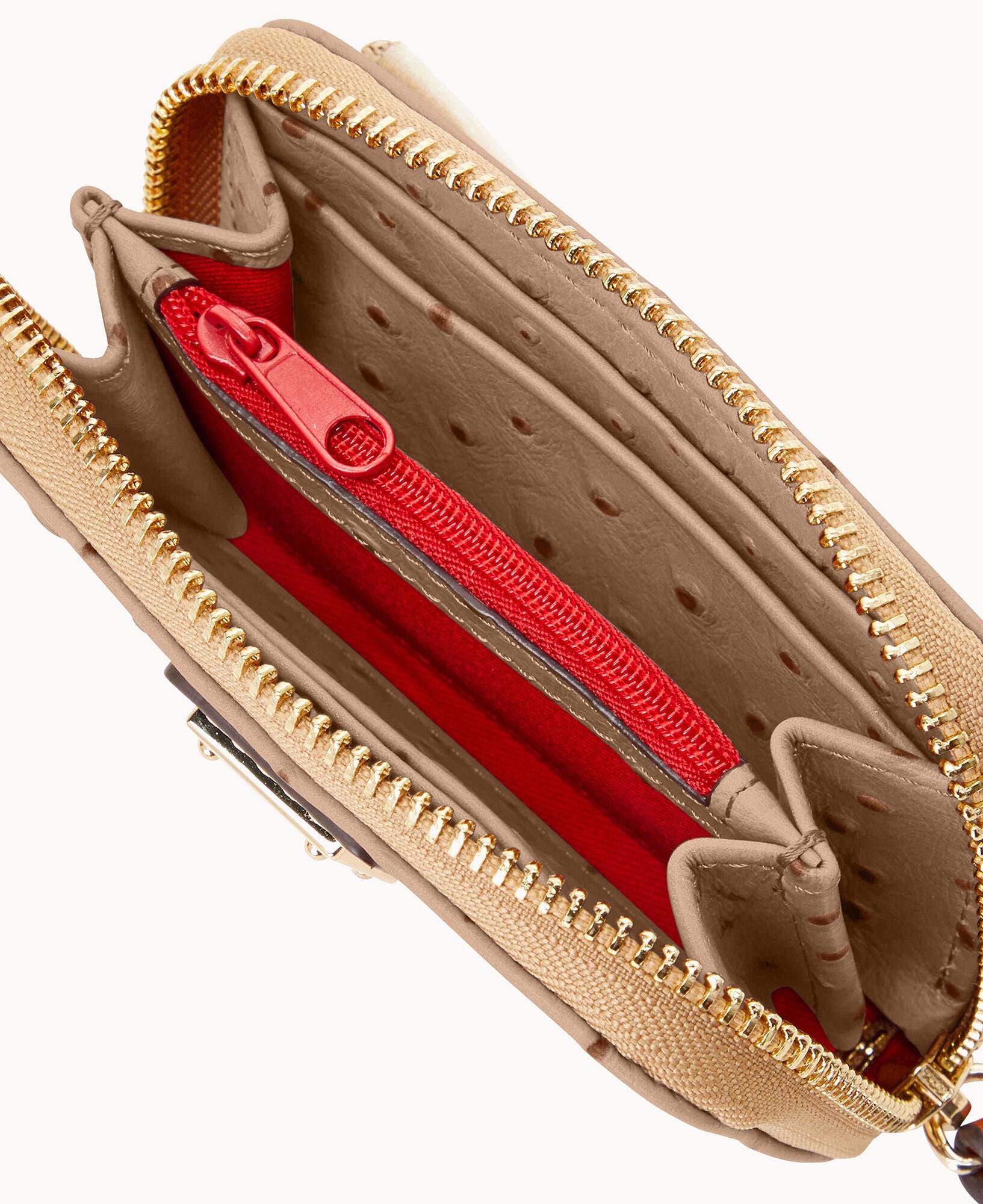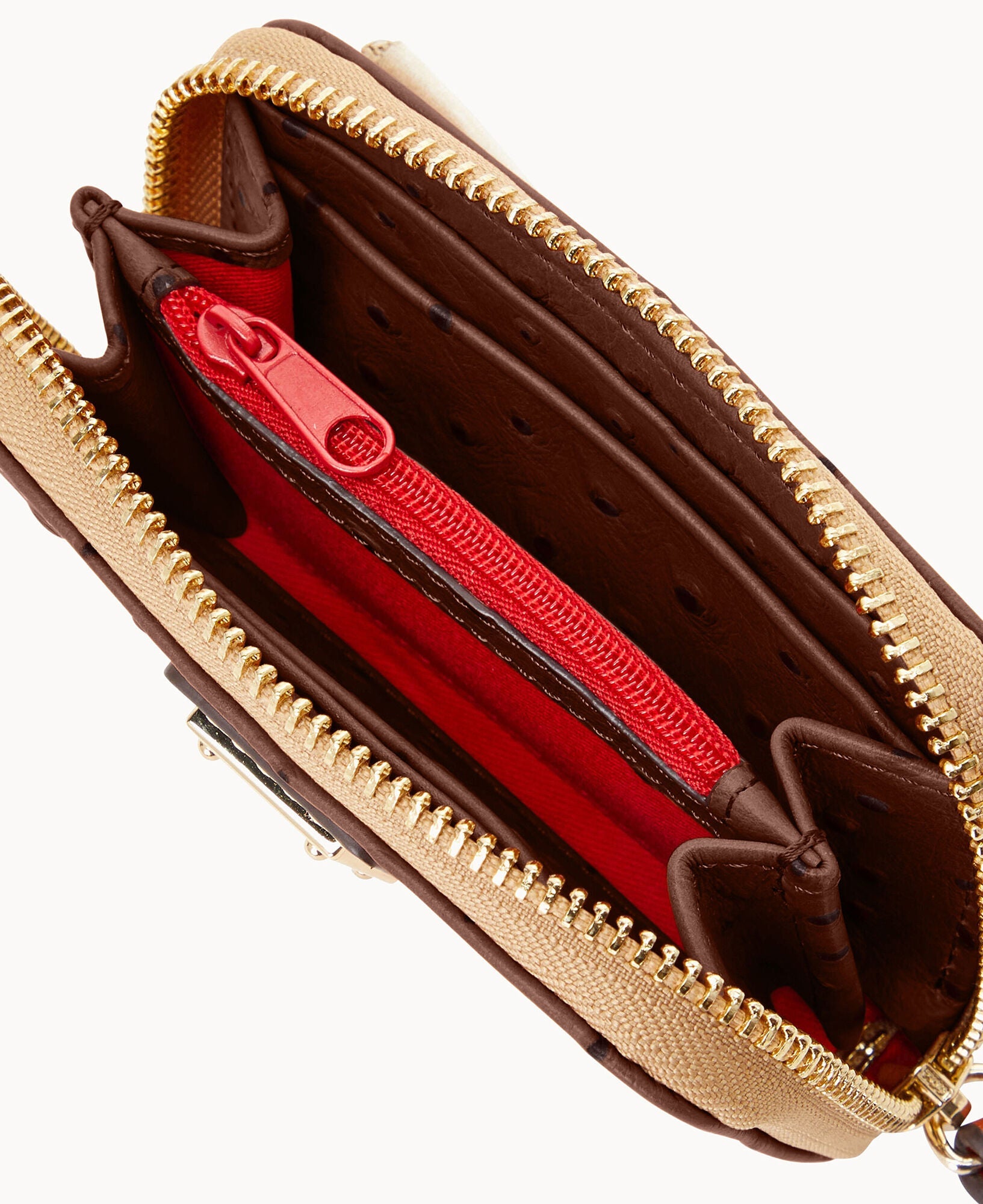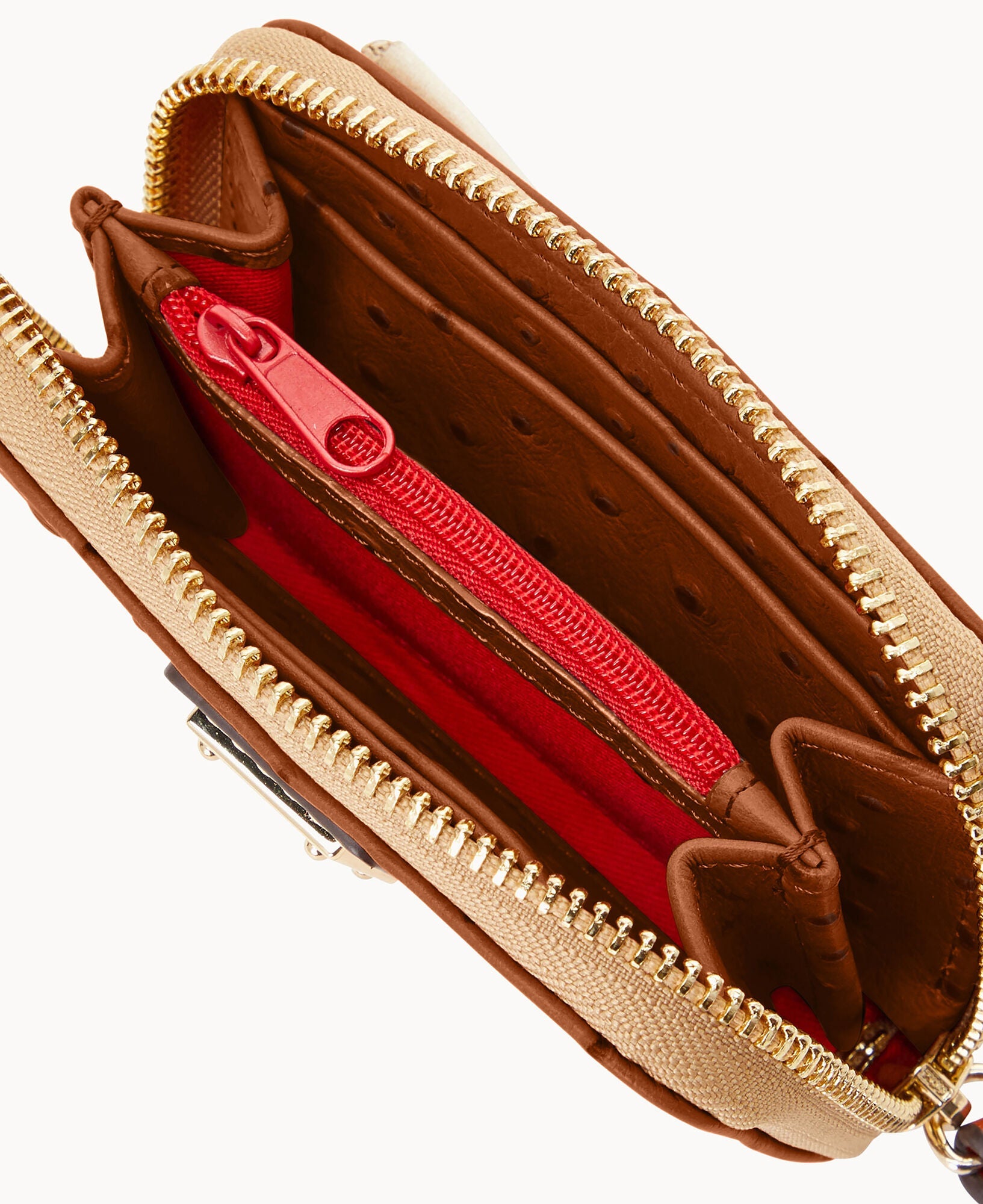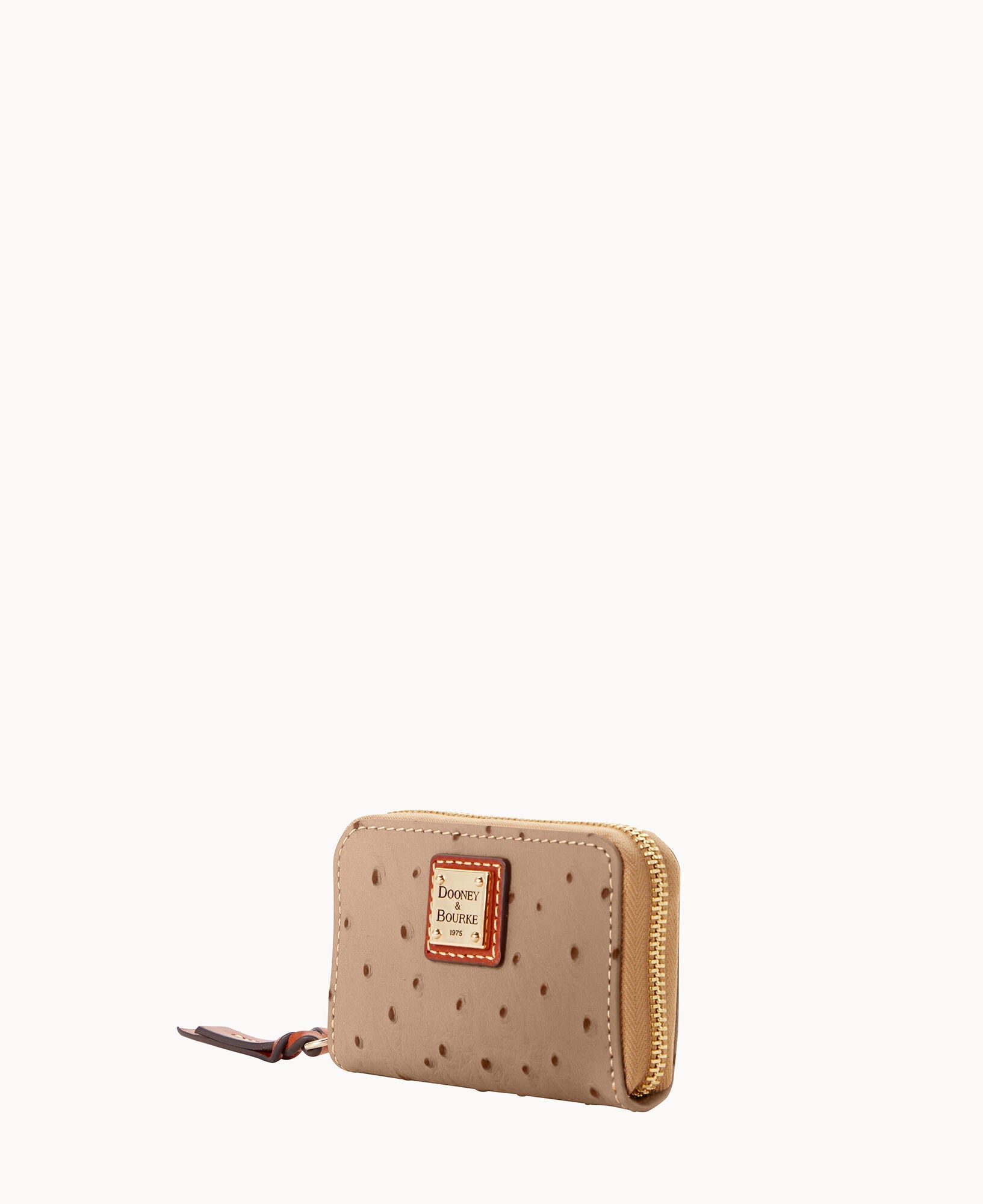One inside zip pocket. Two inside compartments. Four credit card slots. Lined. Zipper closure.