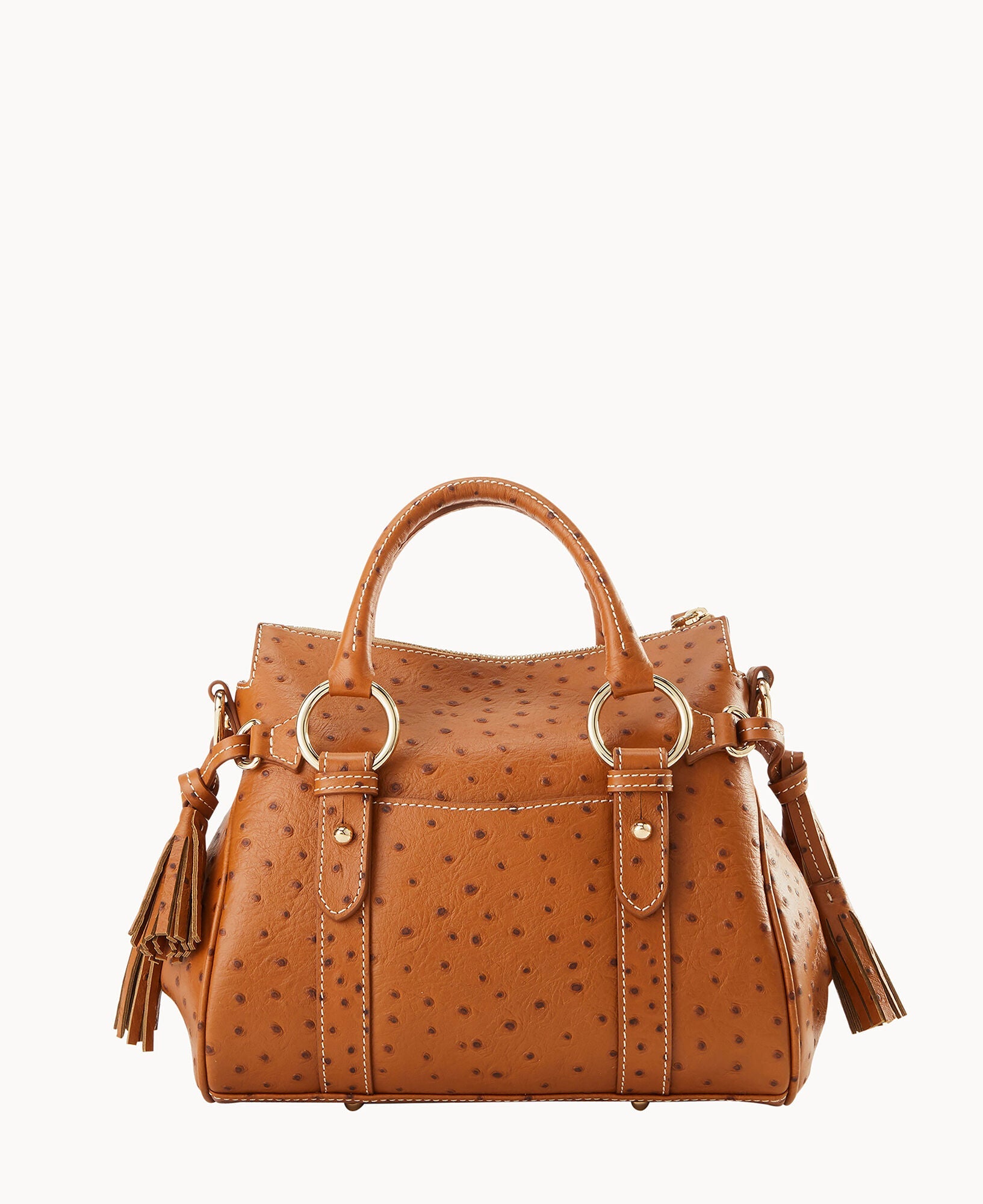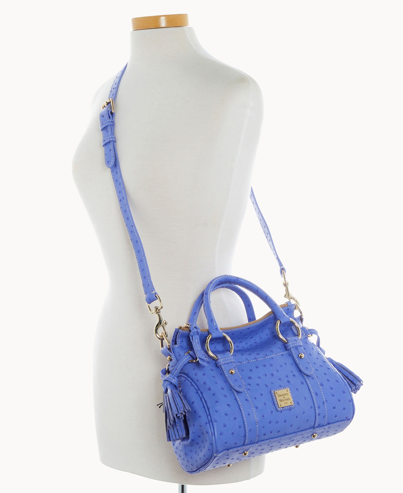 Two outside pockets. Two inside pockets. One inside zip pocket. Inside key hook. Handle drop length 11.25". Strap drop length 20". Feet. Zipper closure. Lined.