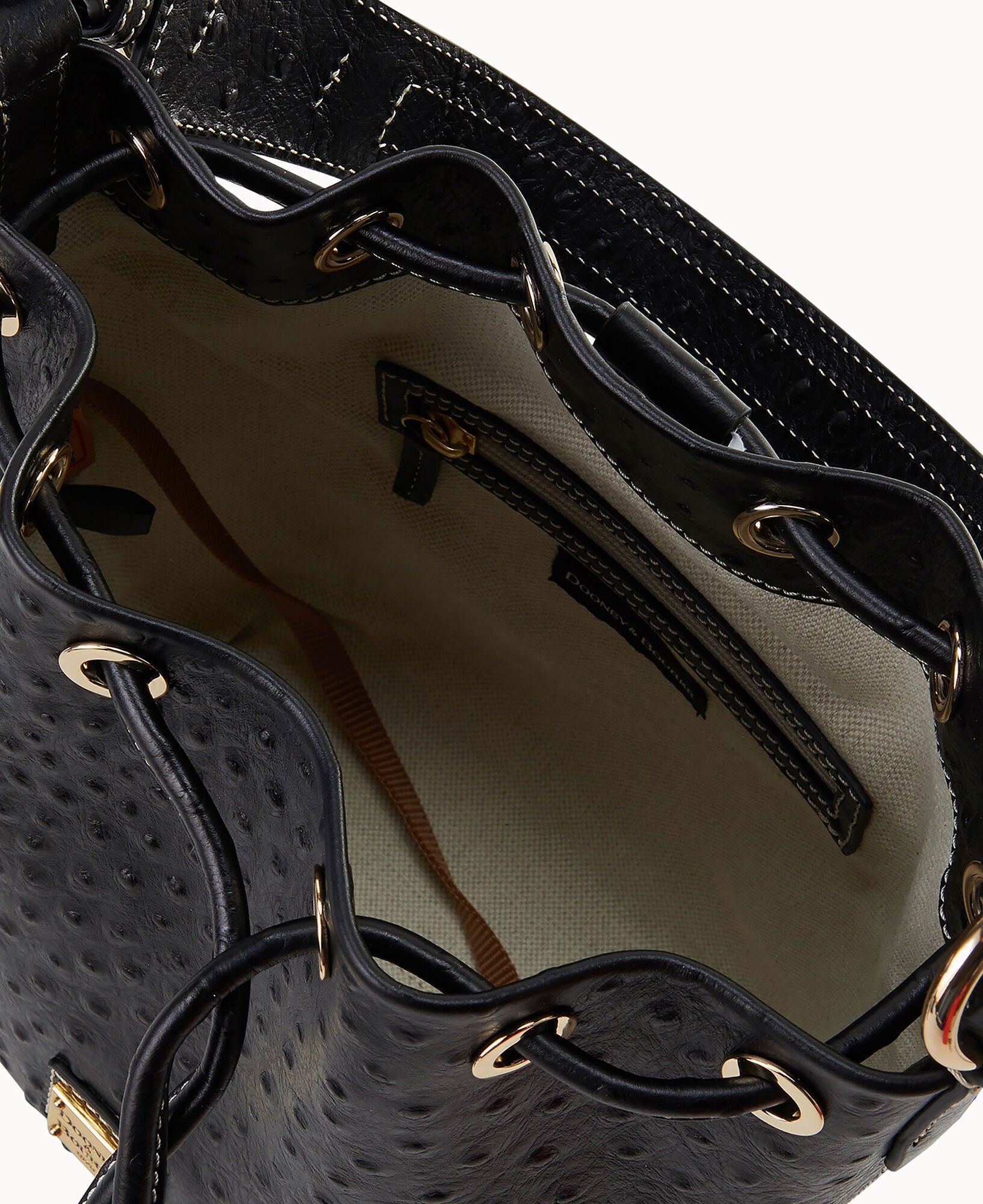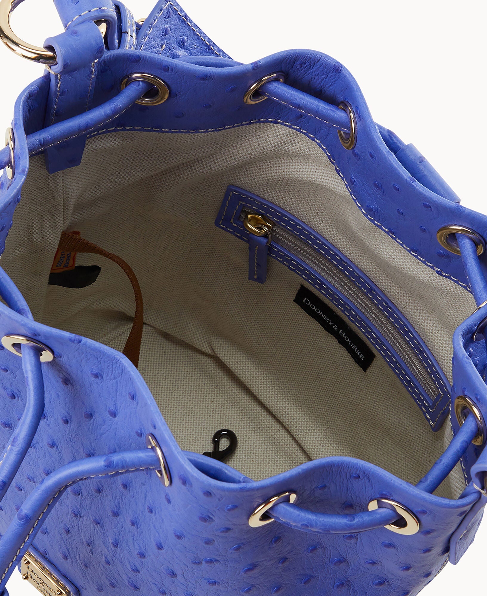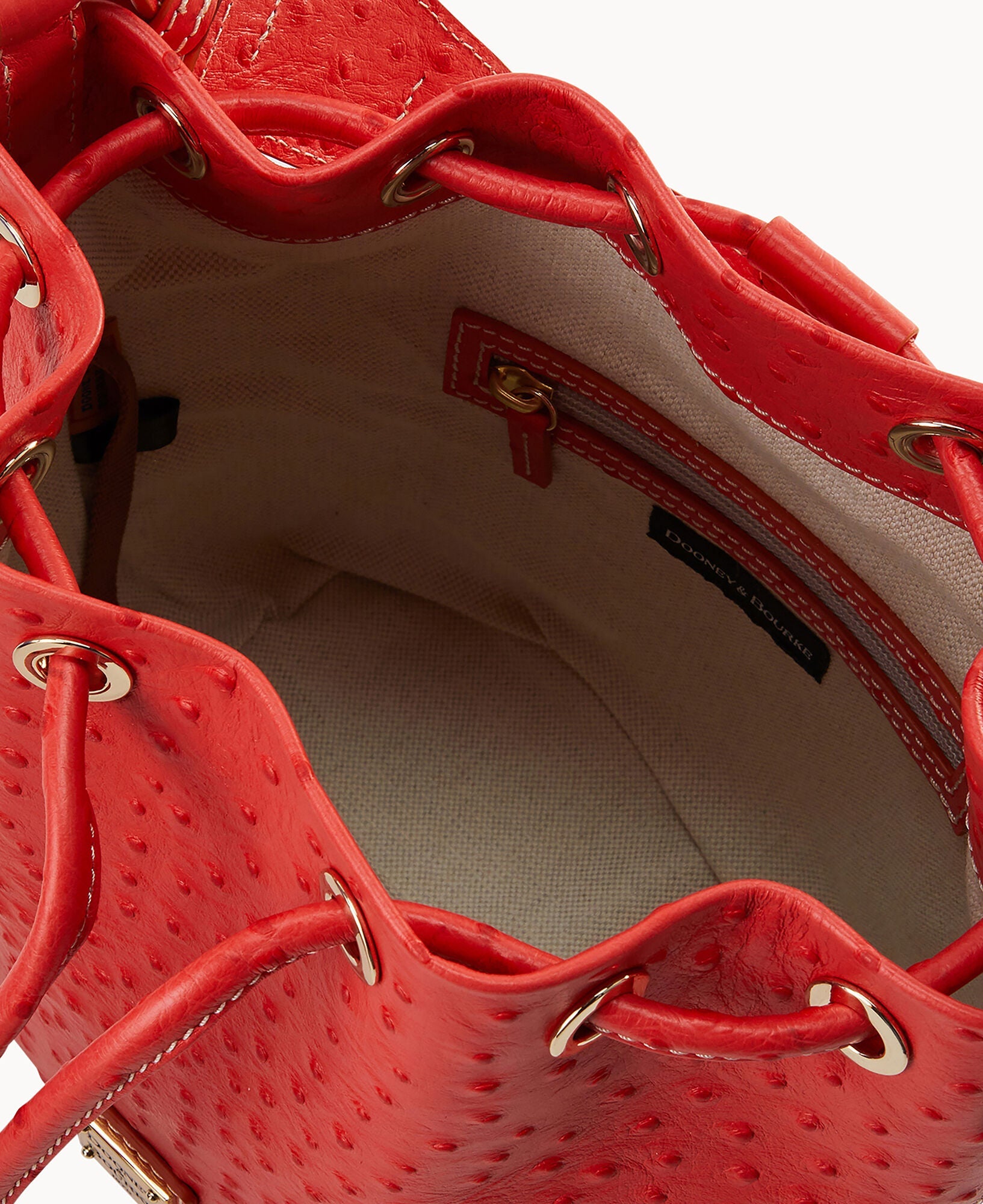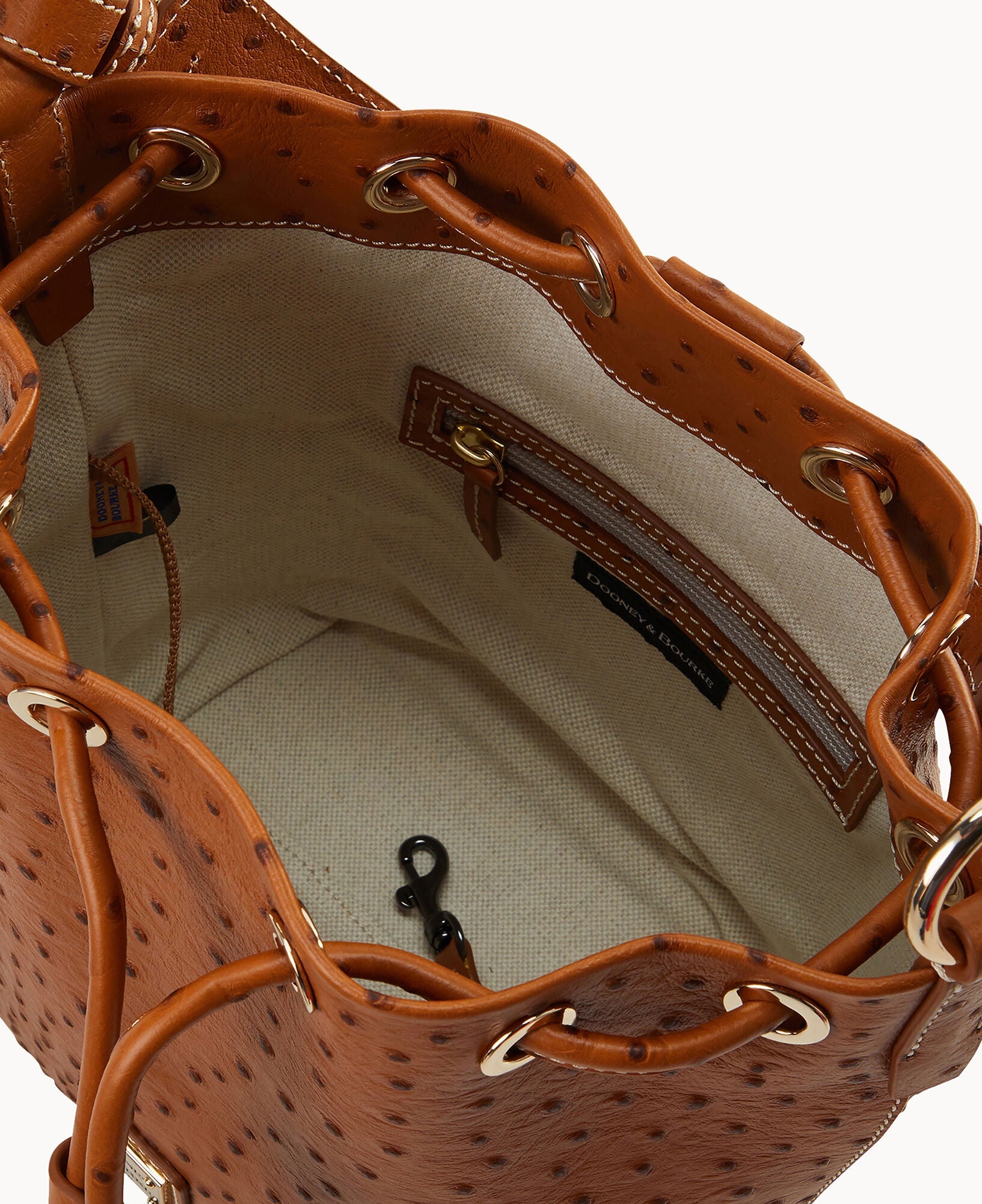 One inside pocket. One inside zip pocket. Inside key hook. Handle drop length 9". Drawstring closure. Lined.