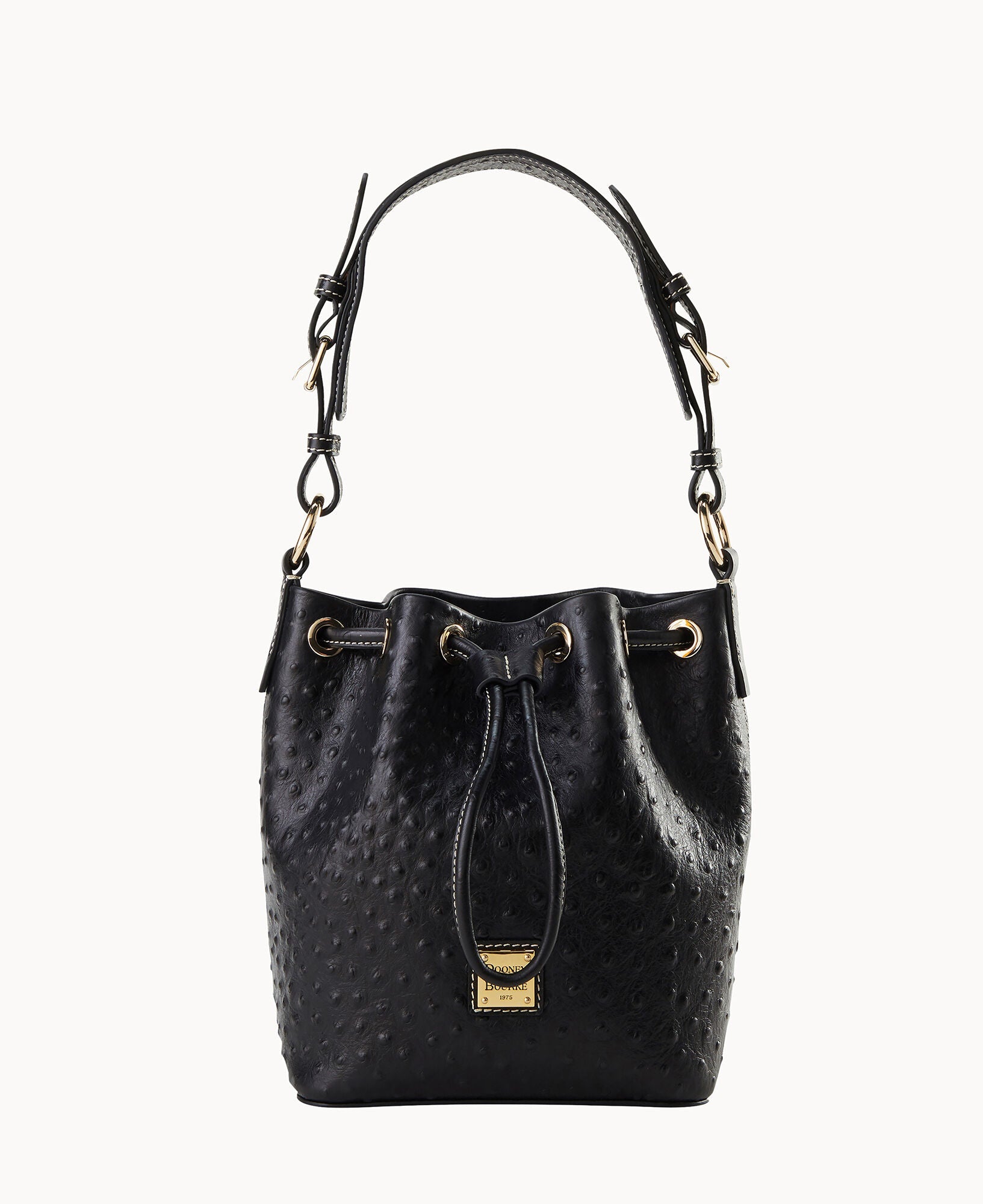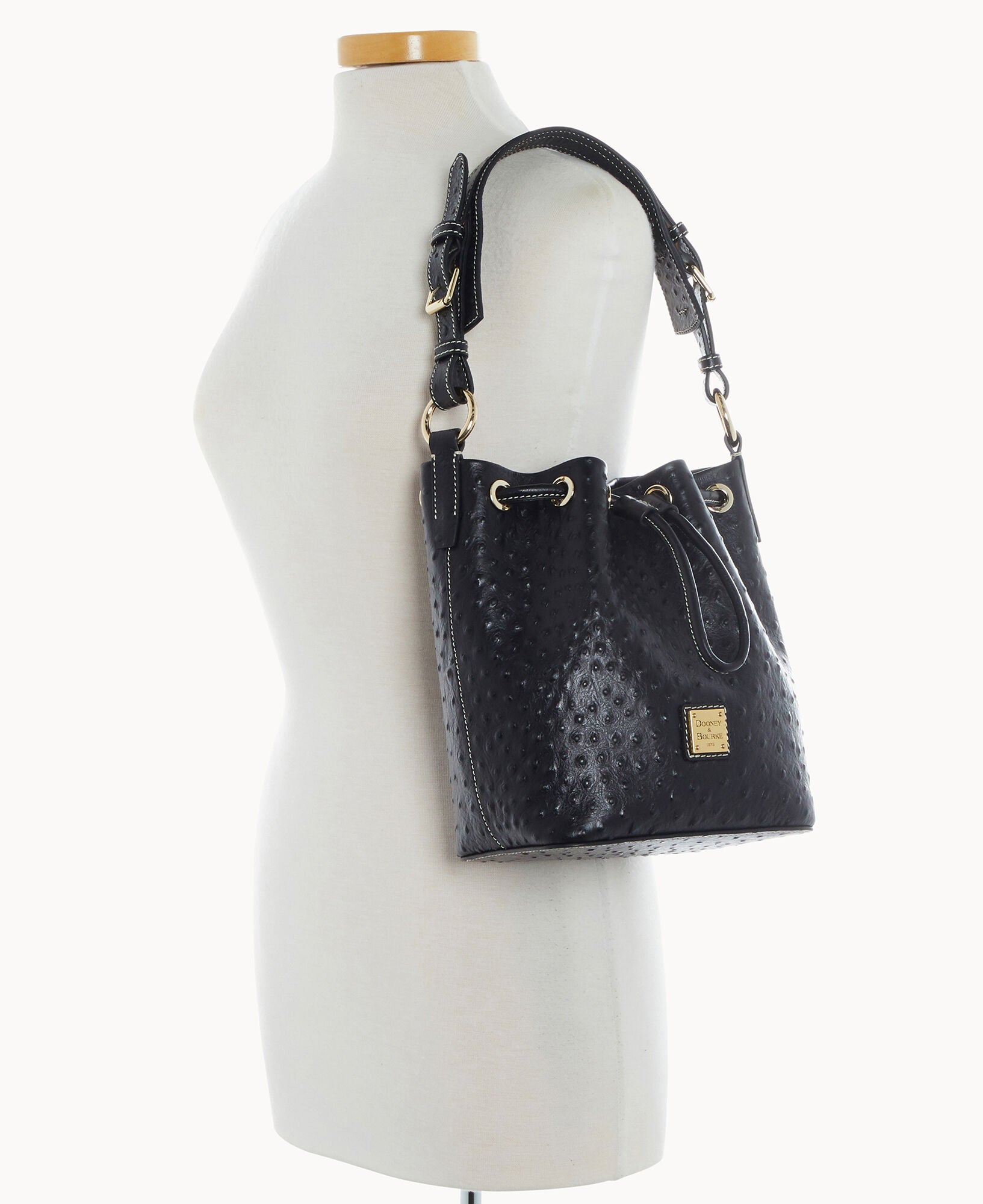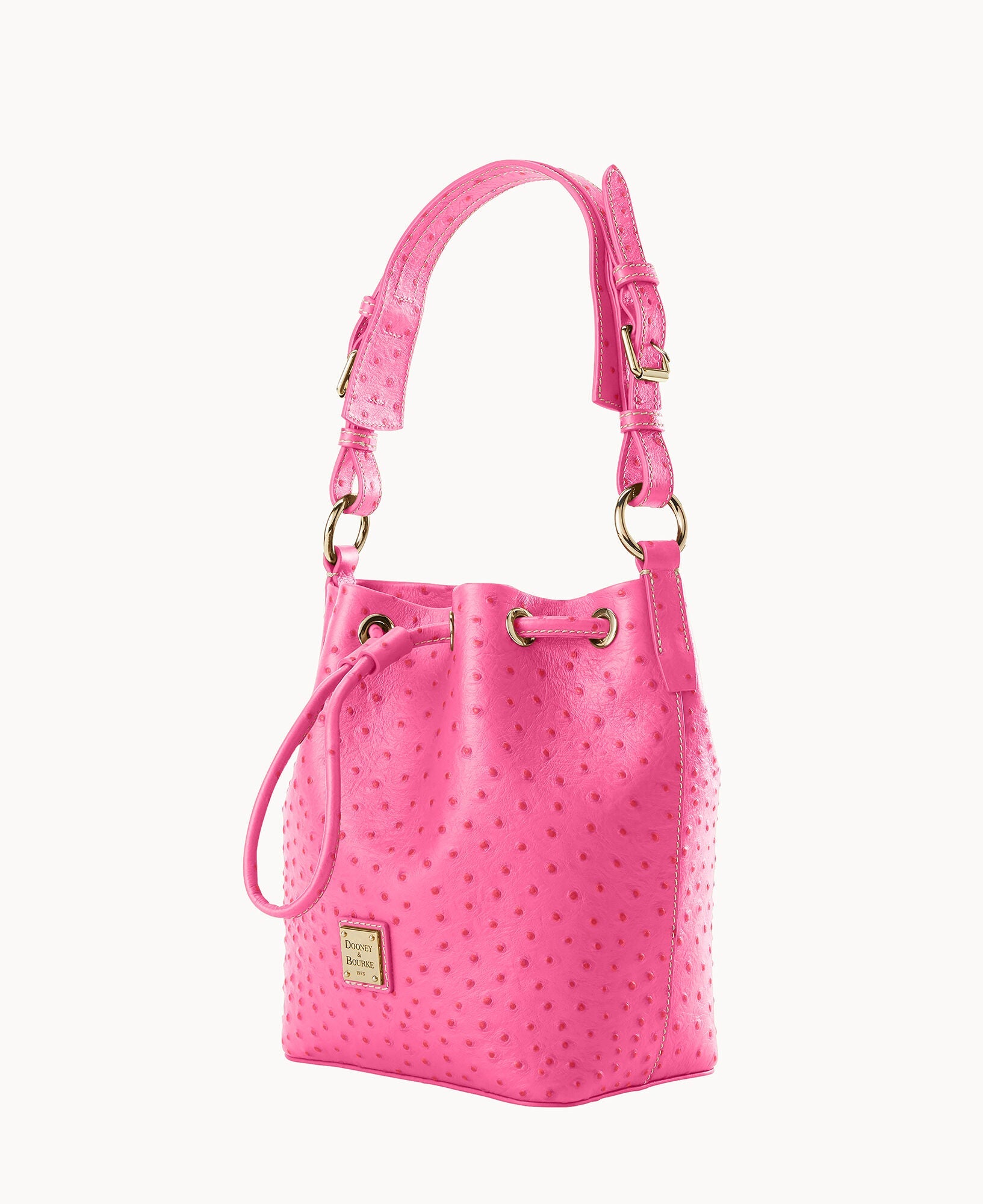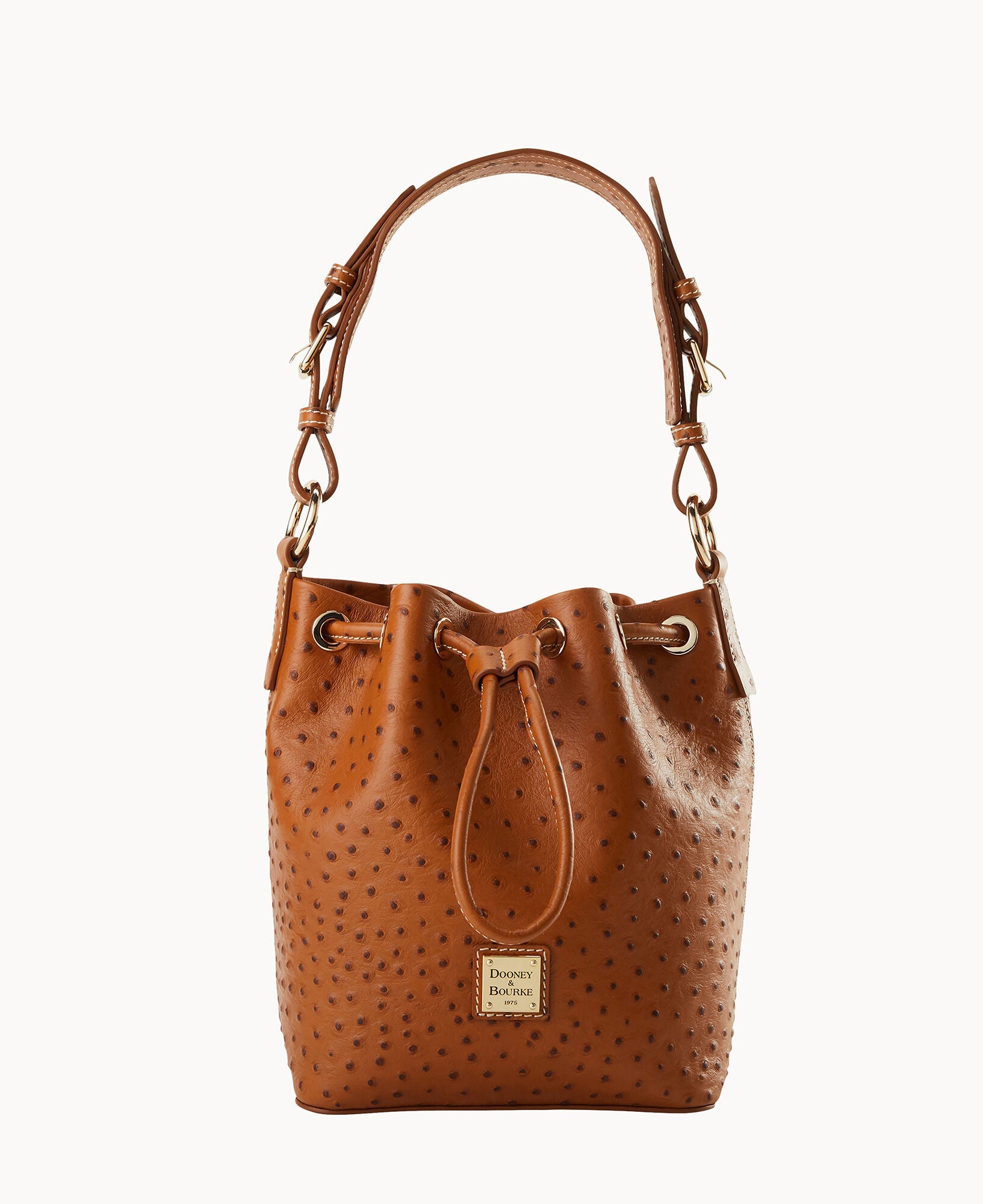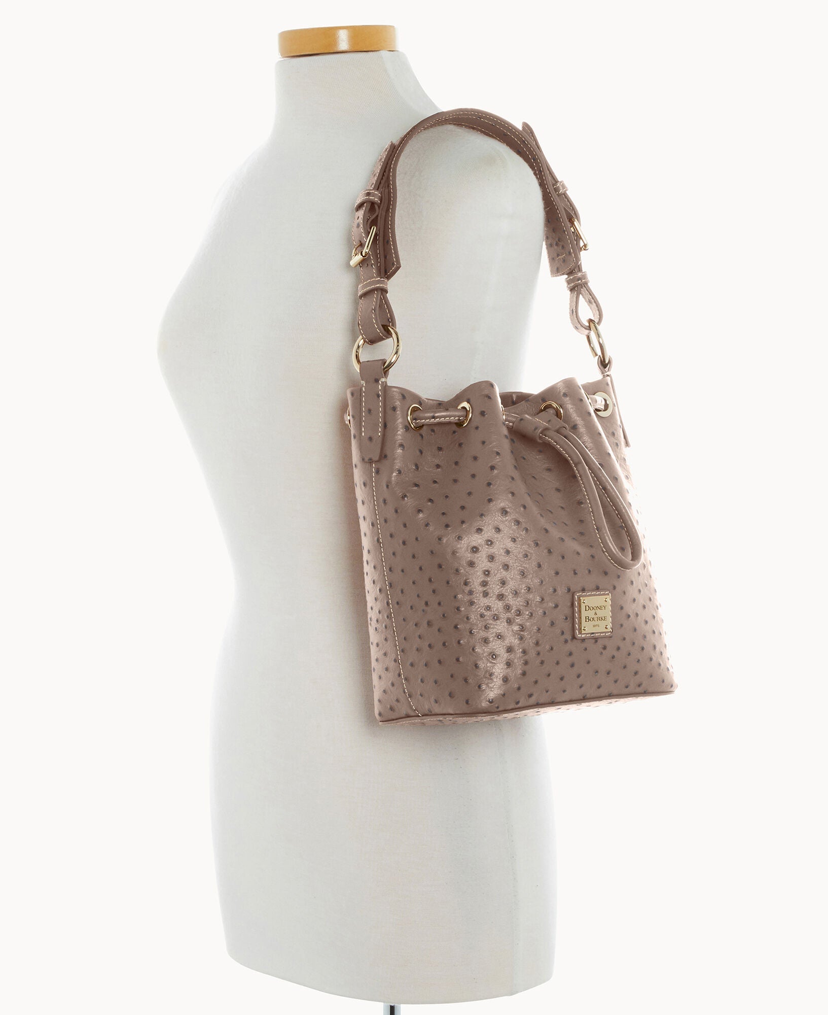 One inside pocket. One inside zip pocket. Inside key hook. Handle drop length 9". Drawstring closure. Lined.