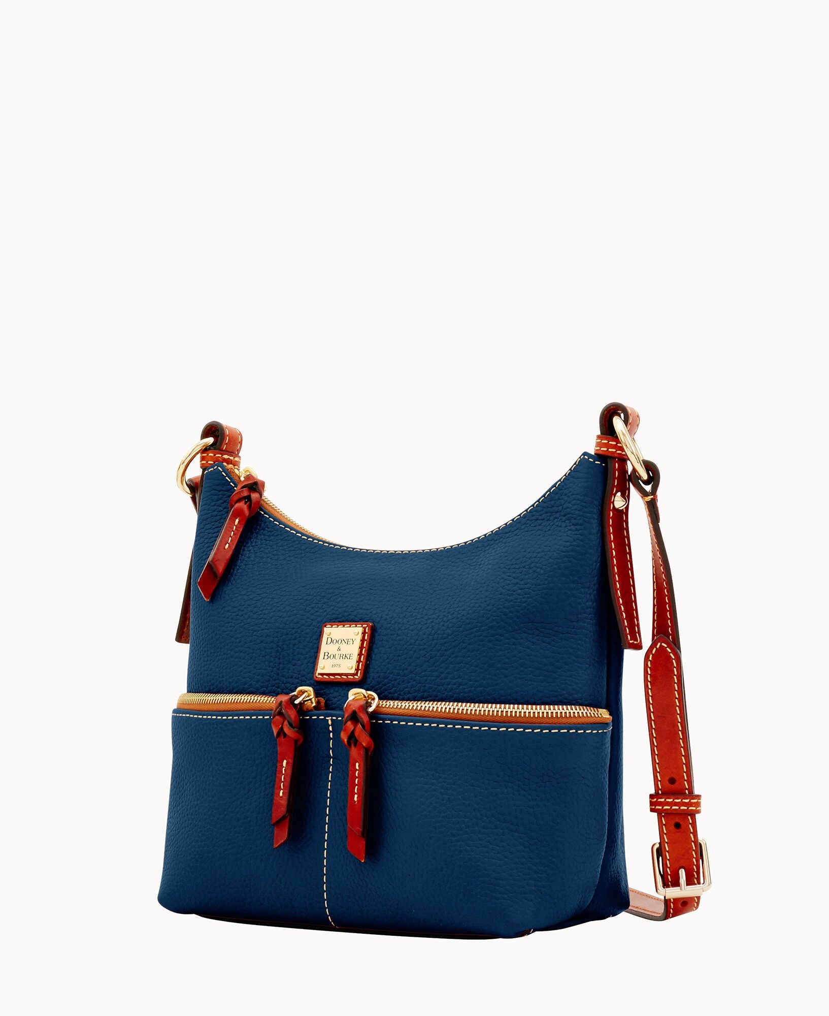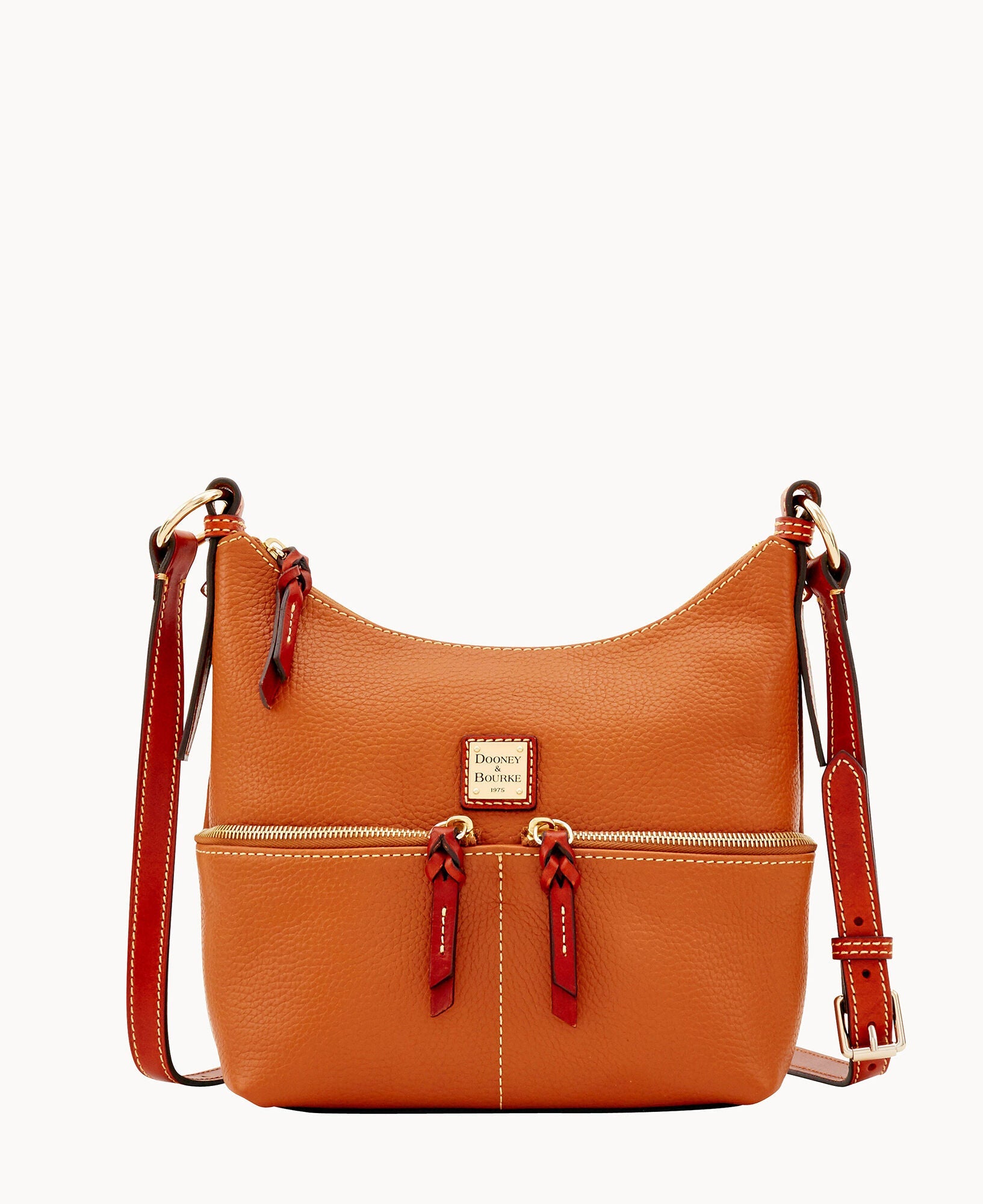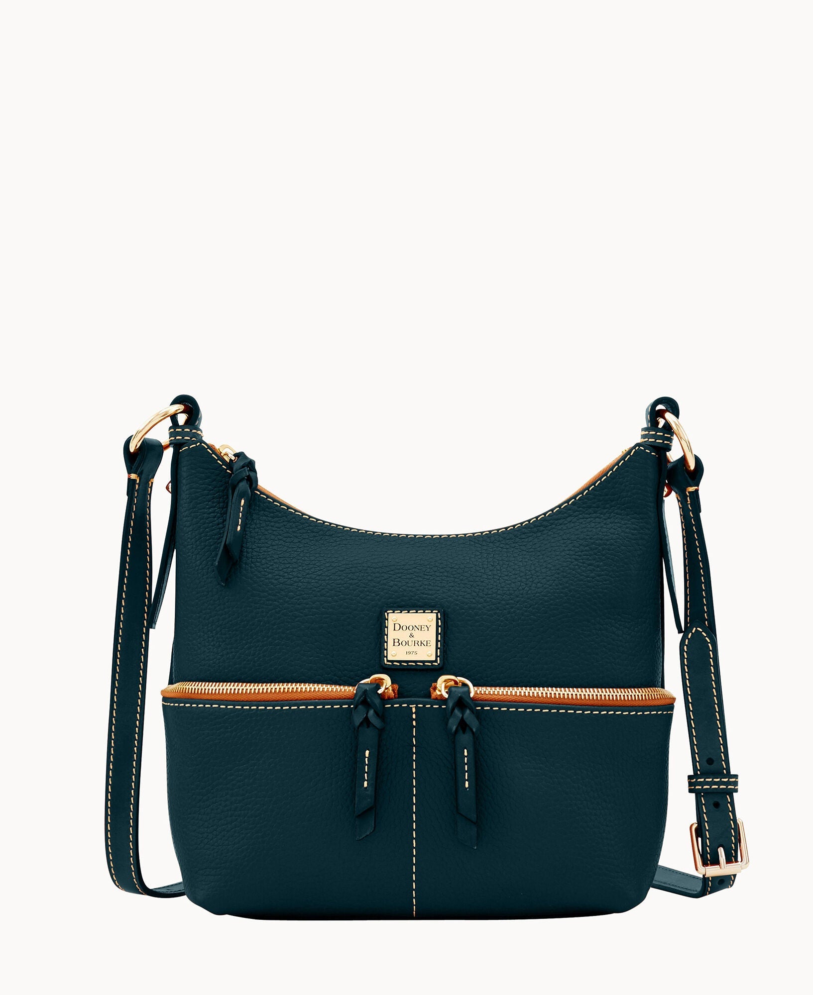 Two outside zip pockets. One inside zip pocket. Two inside pockets. Cell phone pocket. Inside key hook. Strap drop length 27". Lined. Zipper closure.