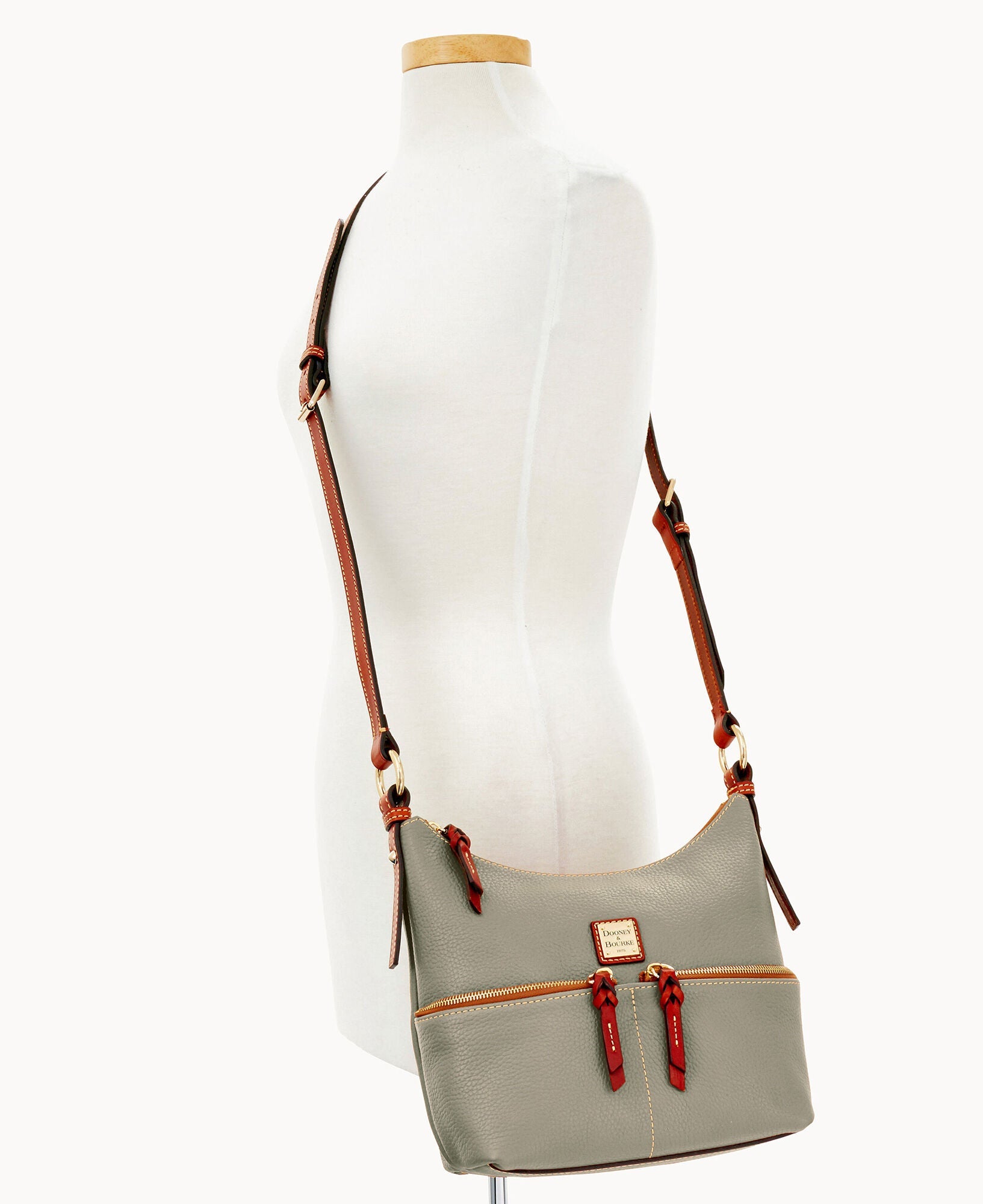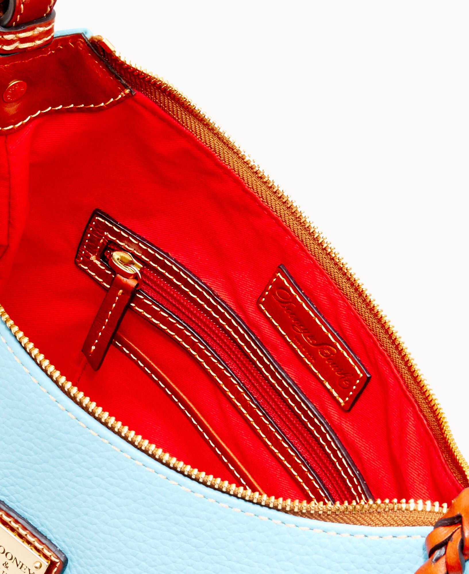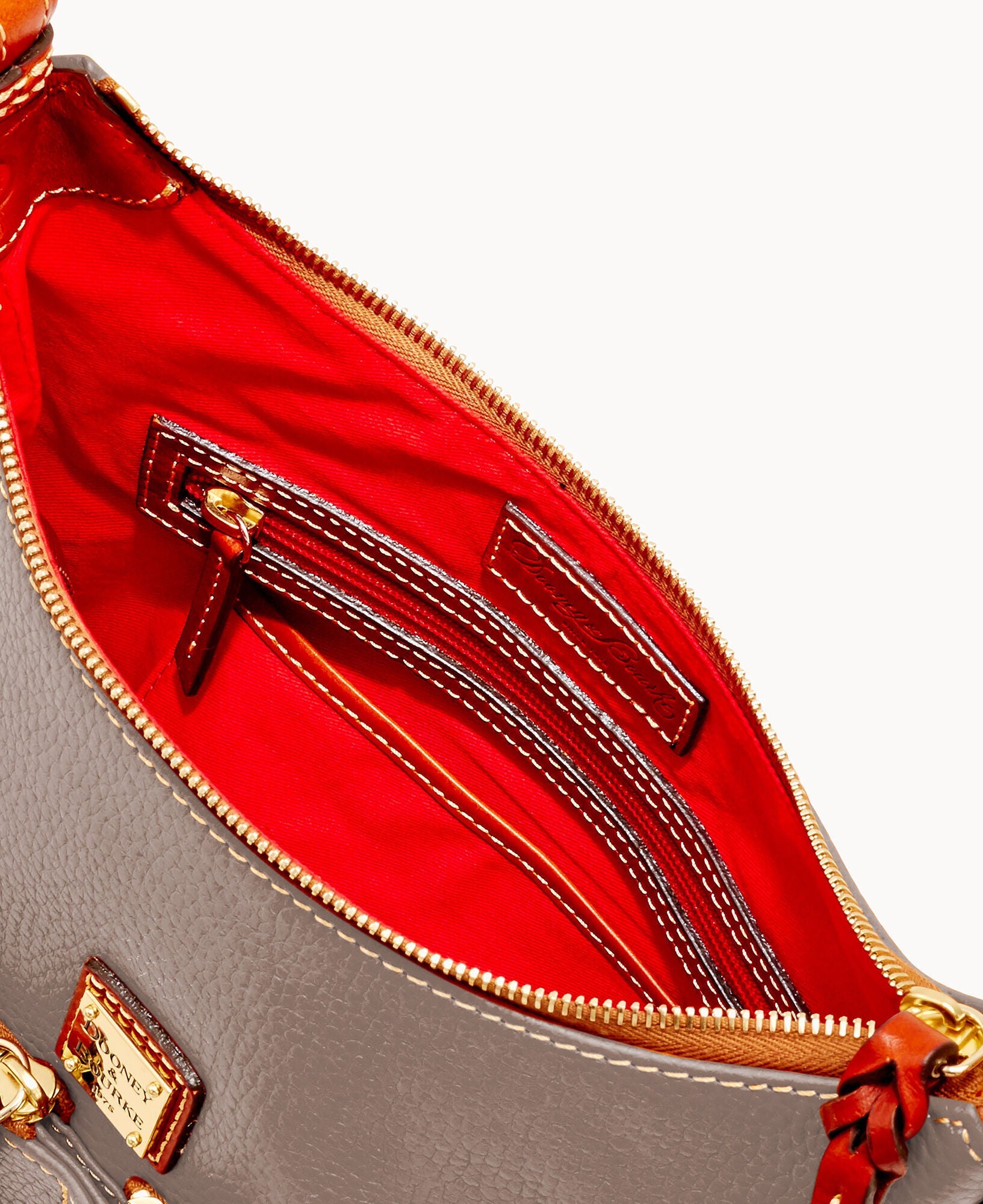 Two outside zip pockets. One inside zip pocket. Two inside pockets. Cell phone pocket. Inside key hook. Strap drop length 27". Lined. Zipper closure.