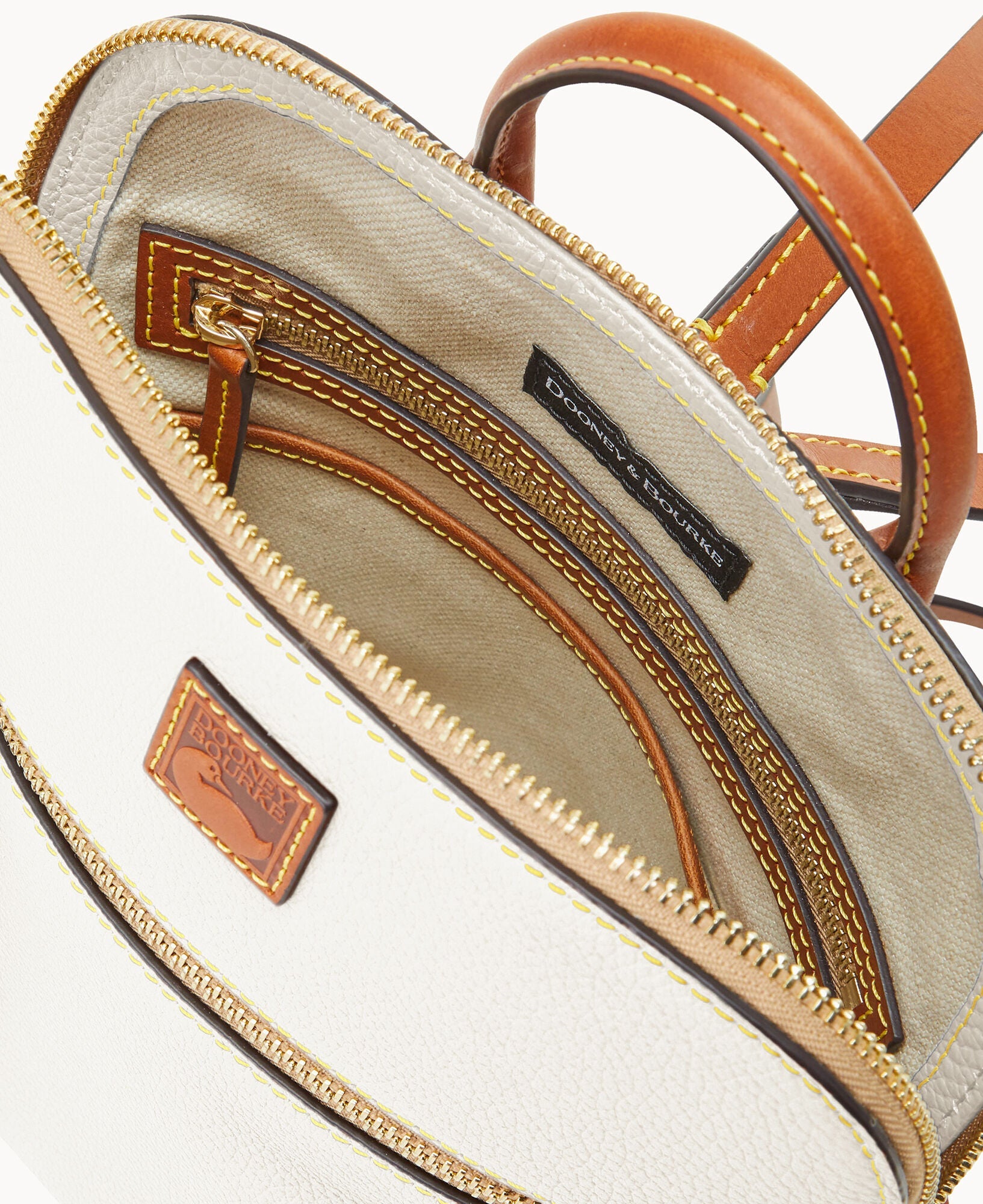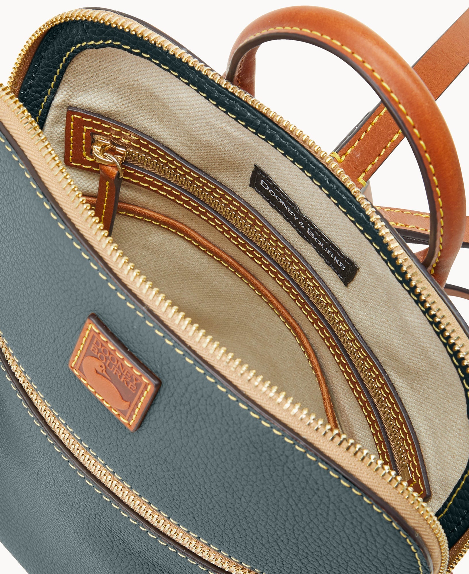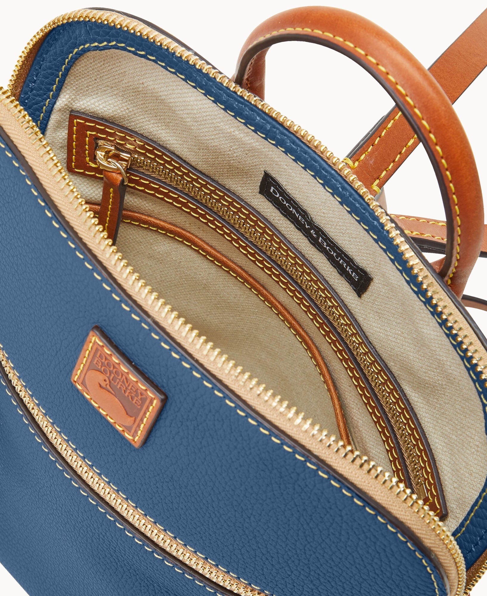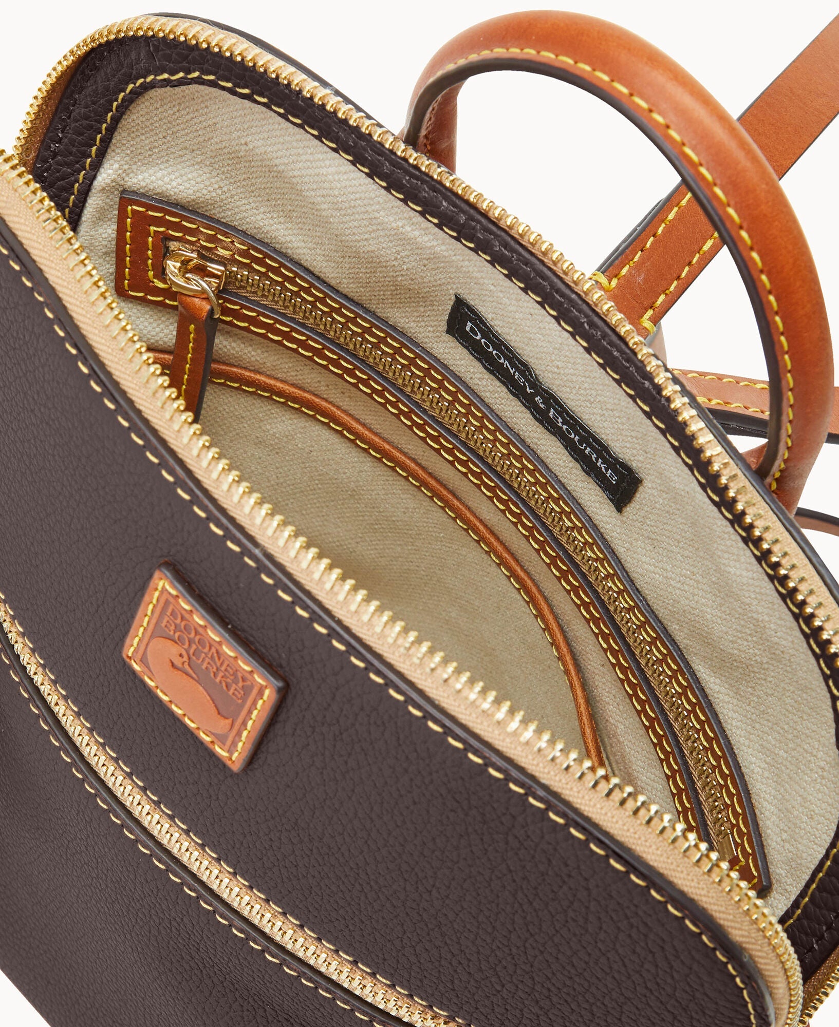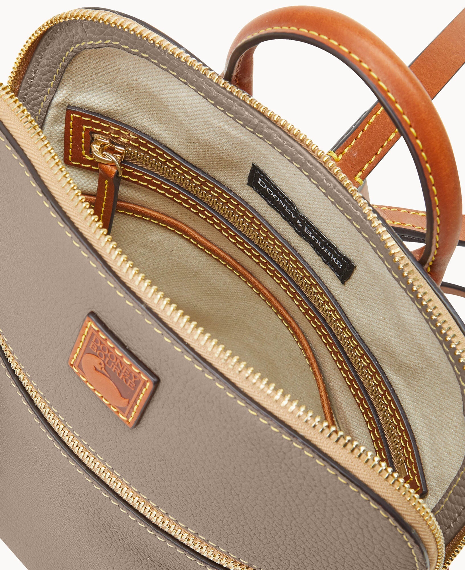 One outside zip pocket. Two inside slip pockets. One insie phone pocket. One inside zip pocket. Inside key hook. Adjustable straps. Strap drop length 14". Handle drop length 2". Feet. Lined. Zipper closure.