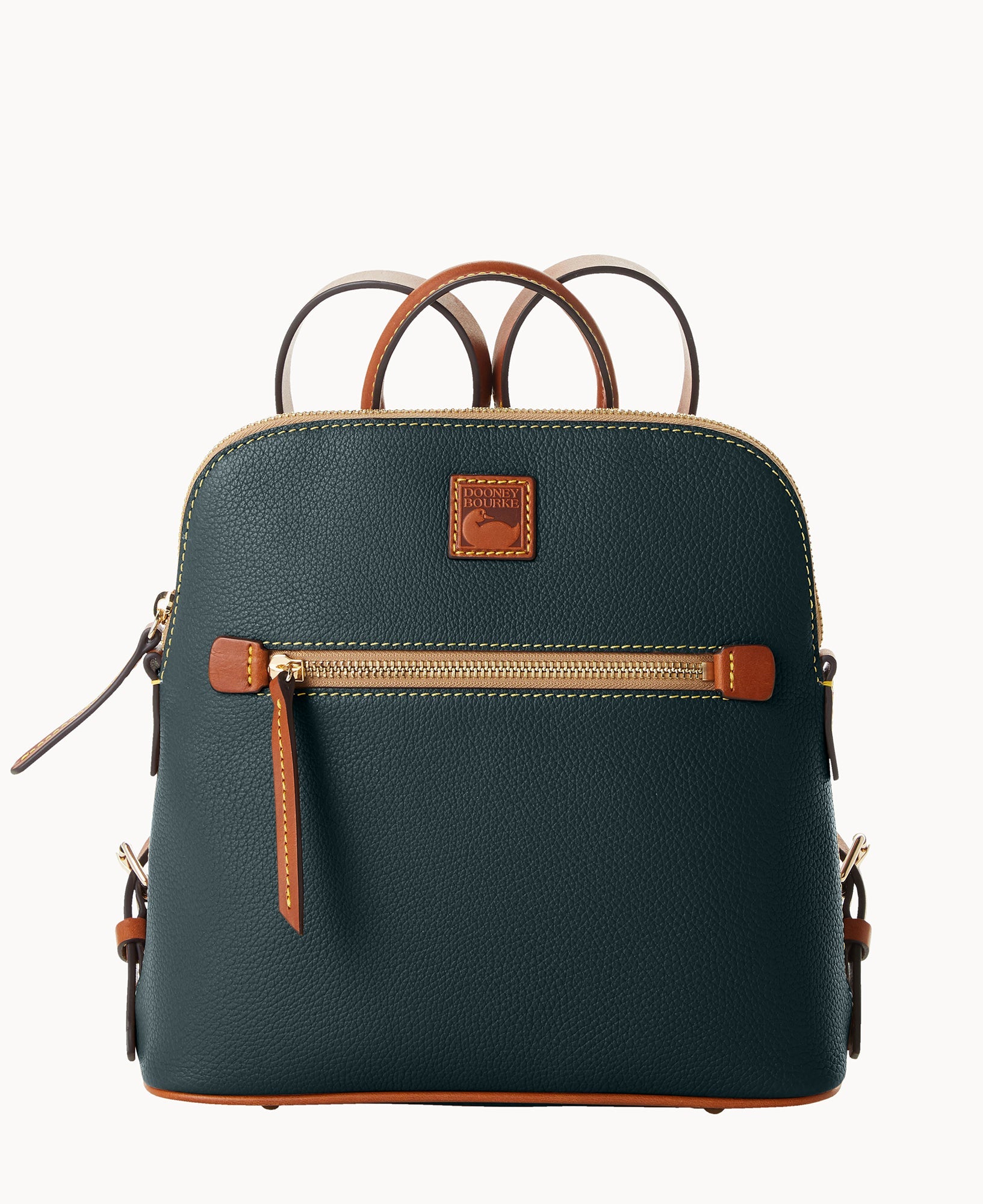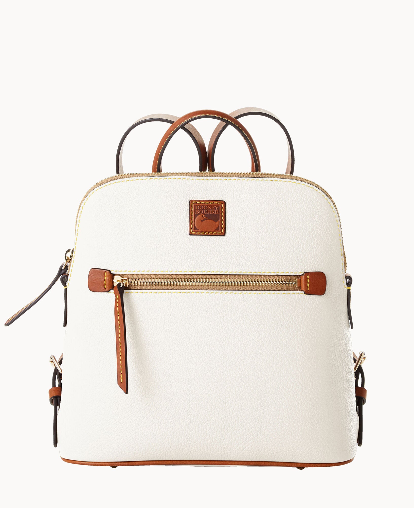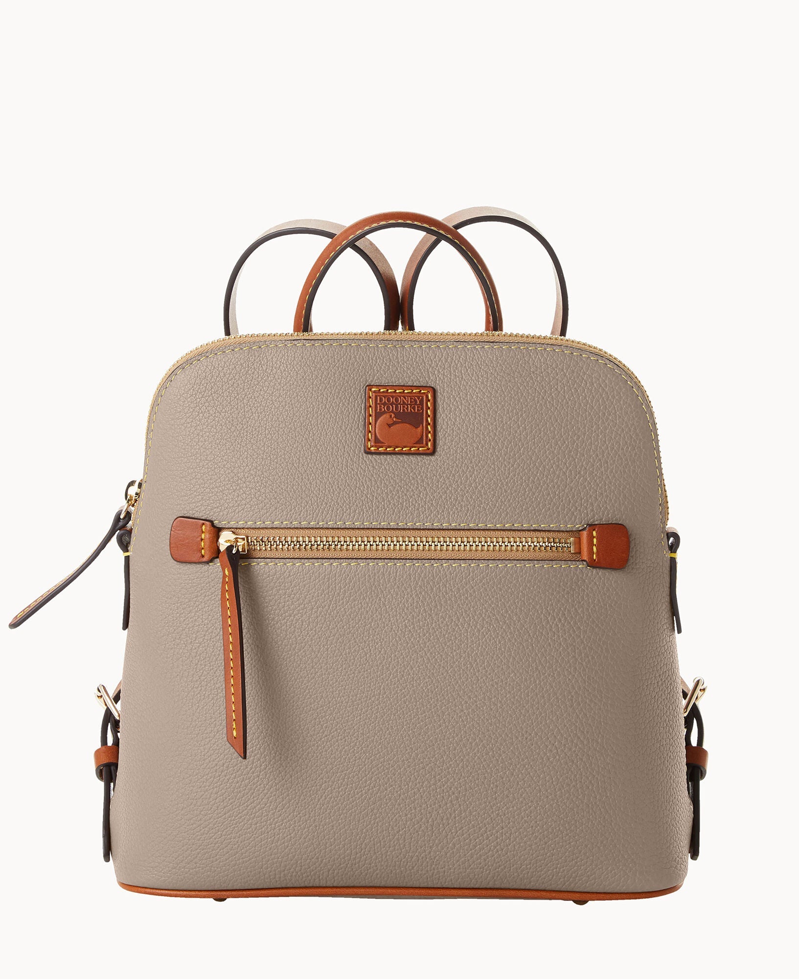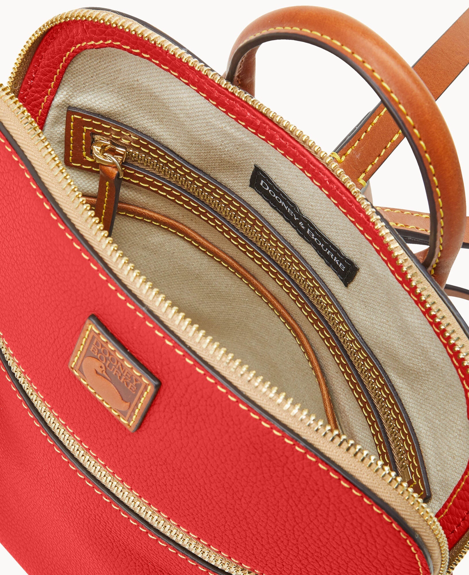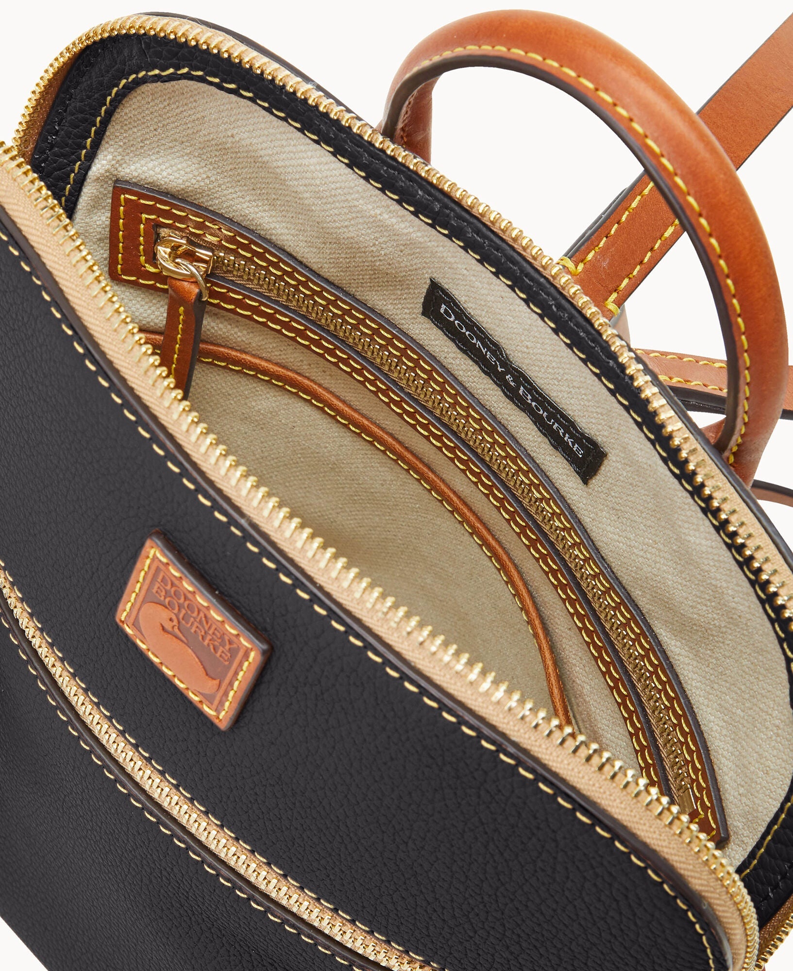 One outside zip pocket. Two inside slip pockets. One insie phone pocket. One inside zip pocket. Inside key hook. Adjustable straps. Strap drop length 14". Handle drop length 2". Feet. Lined. Zipper closure.