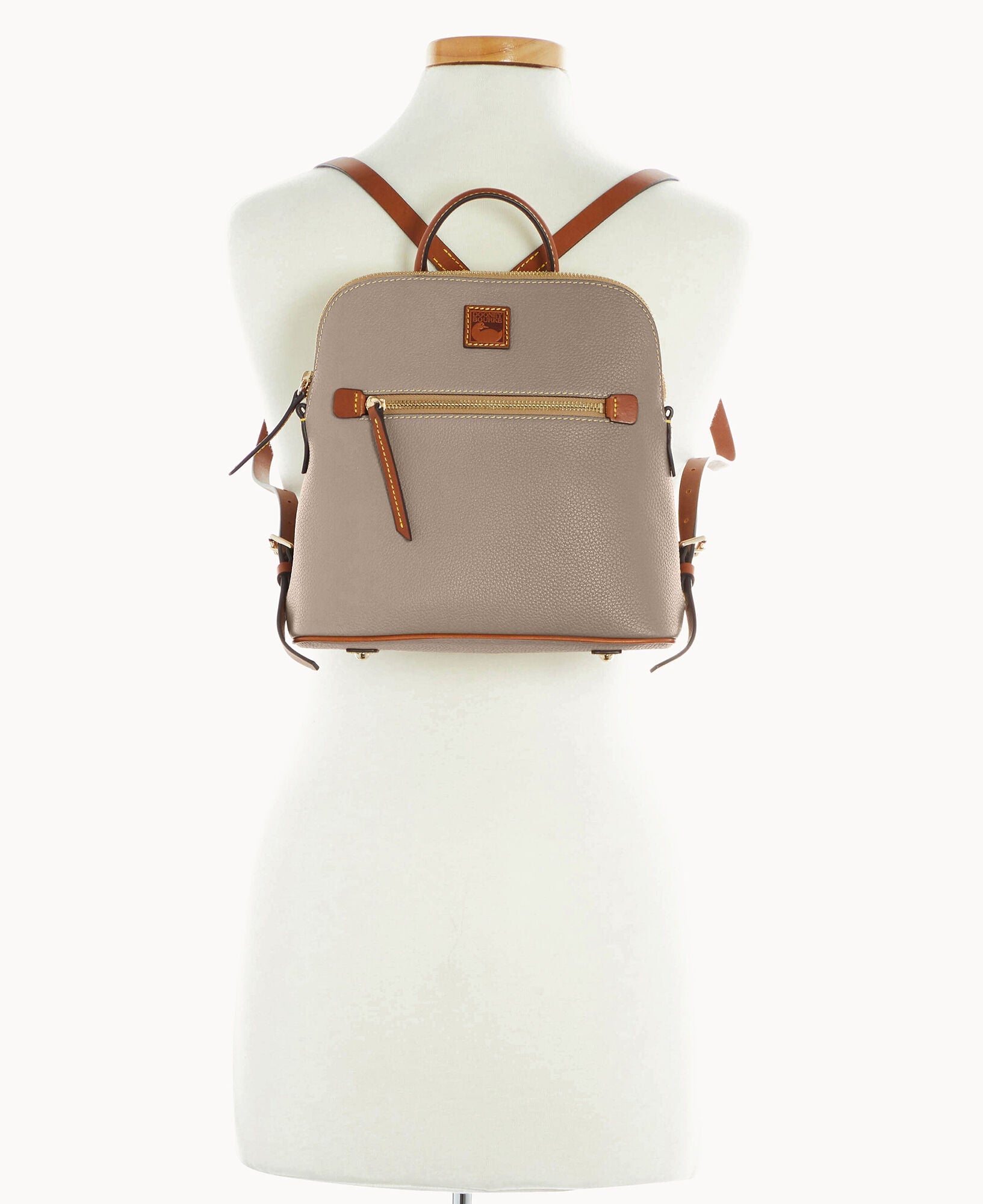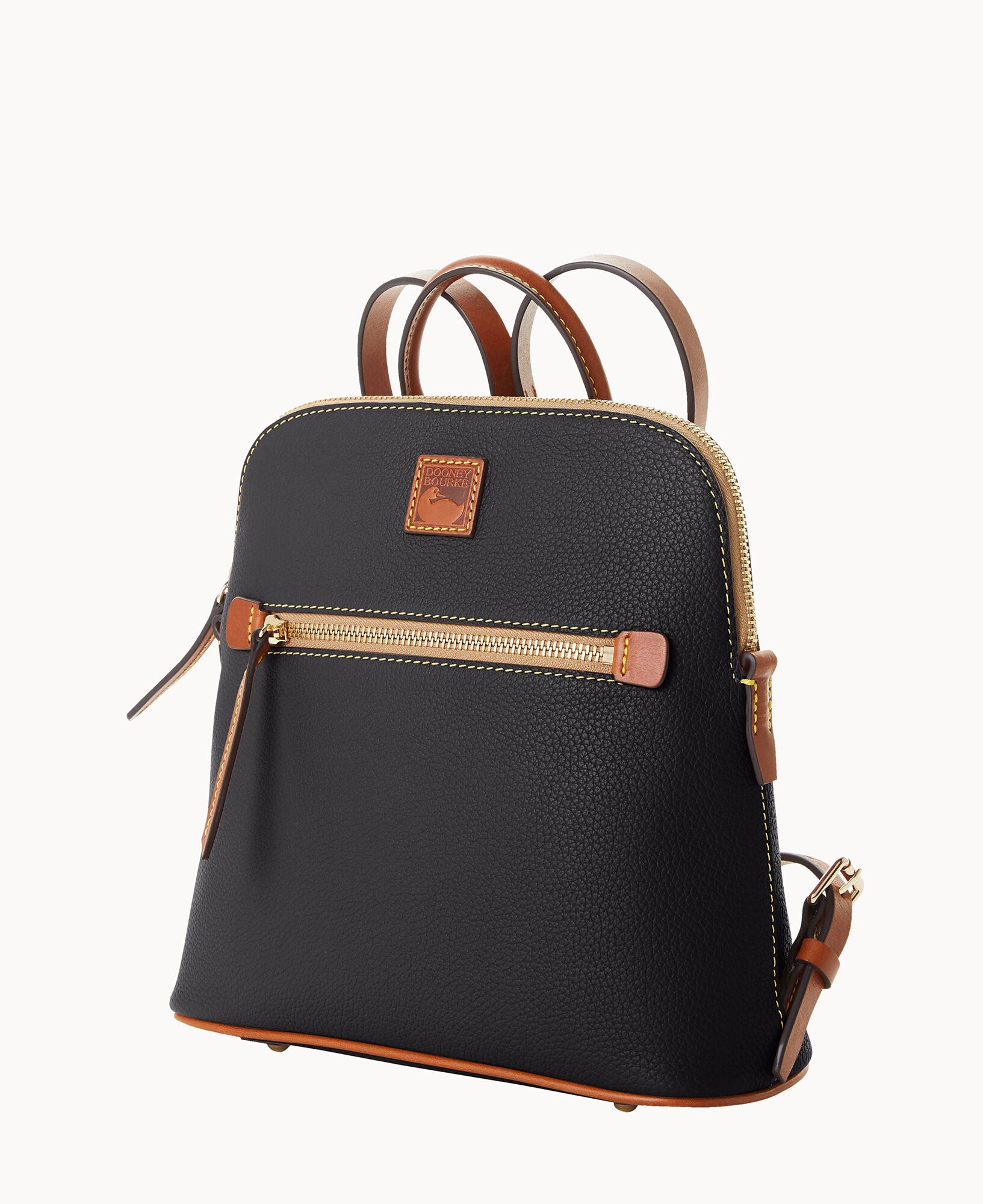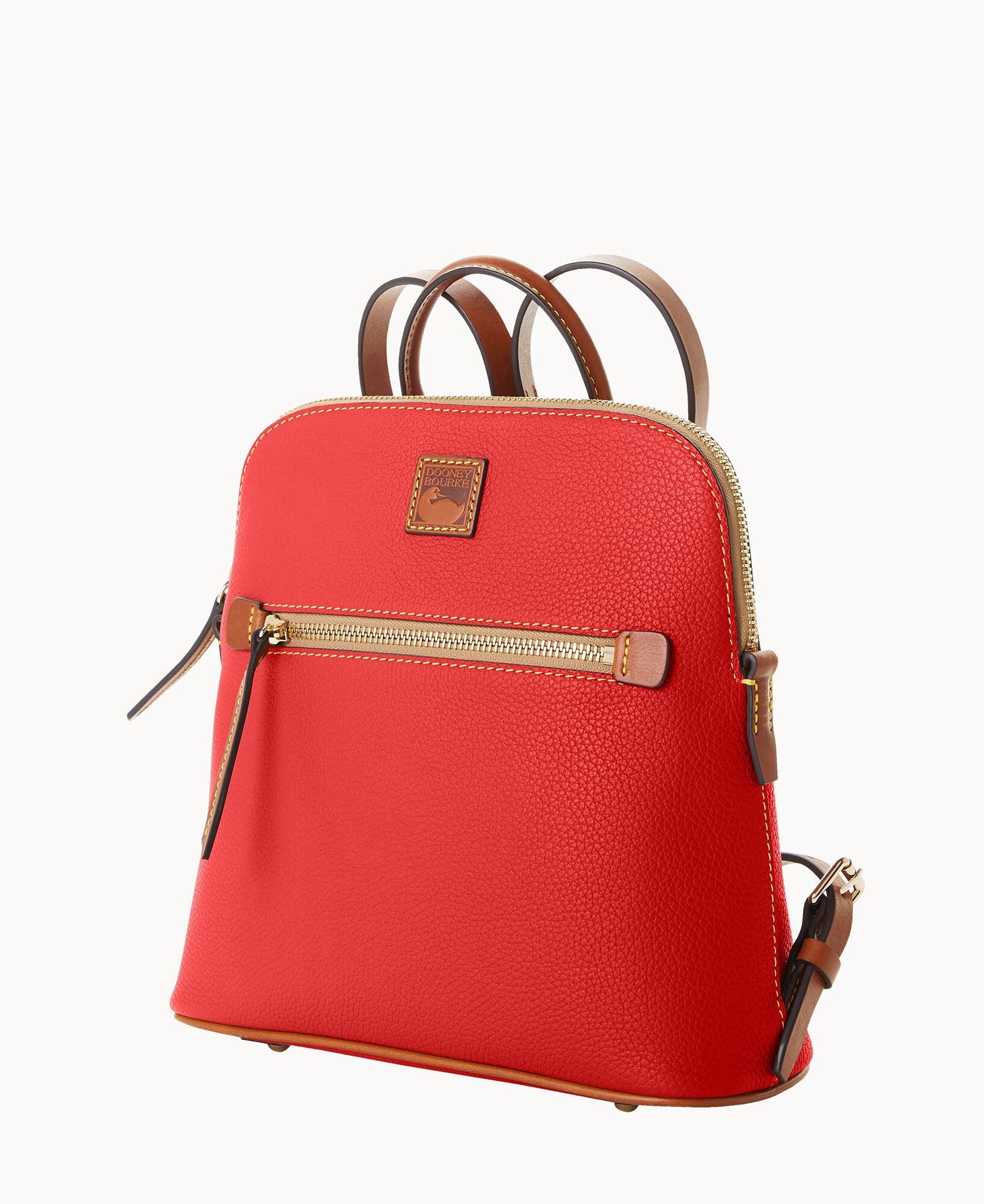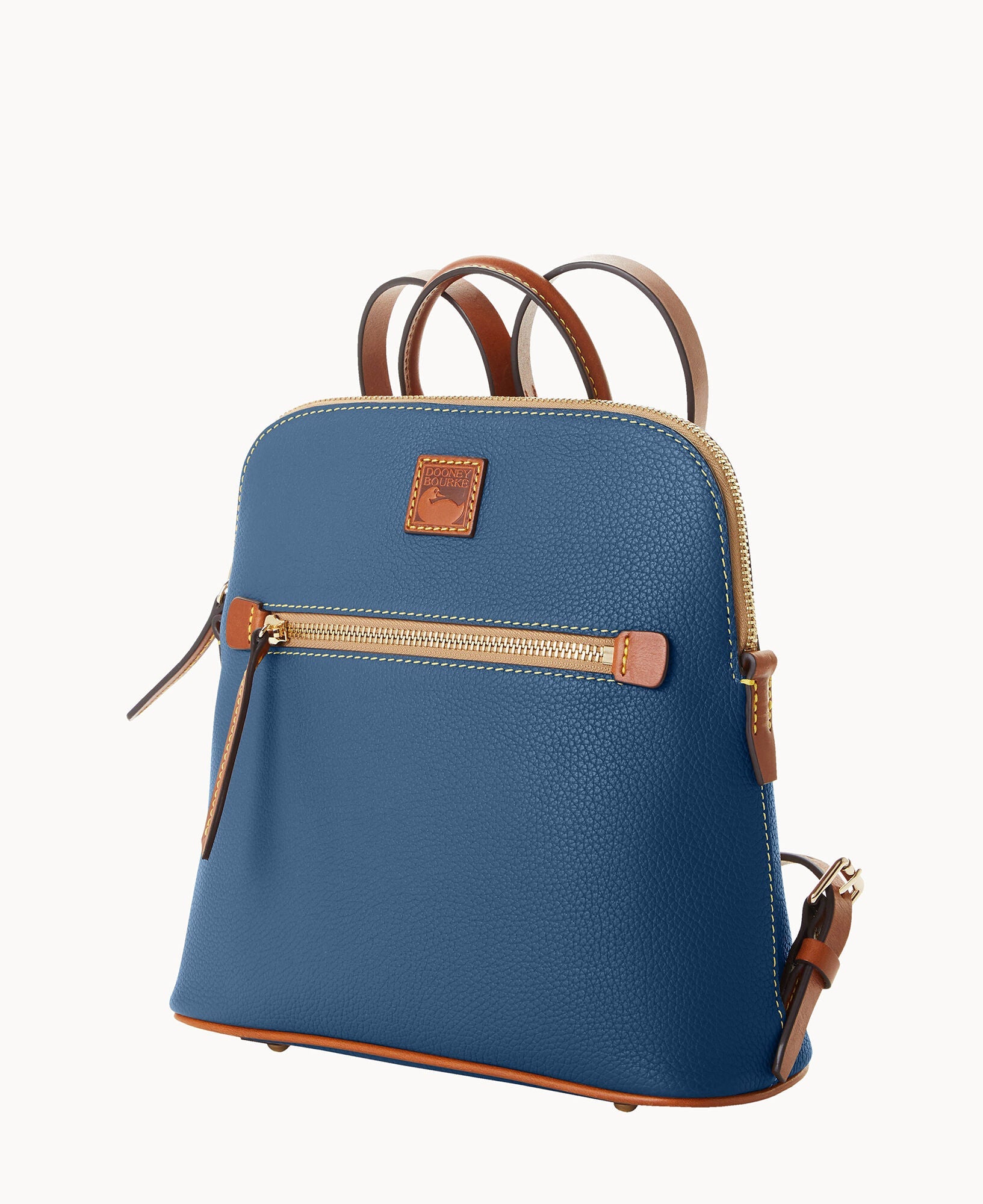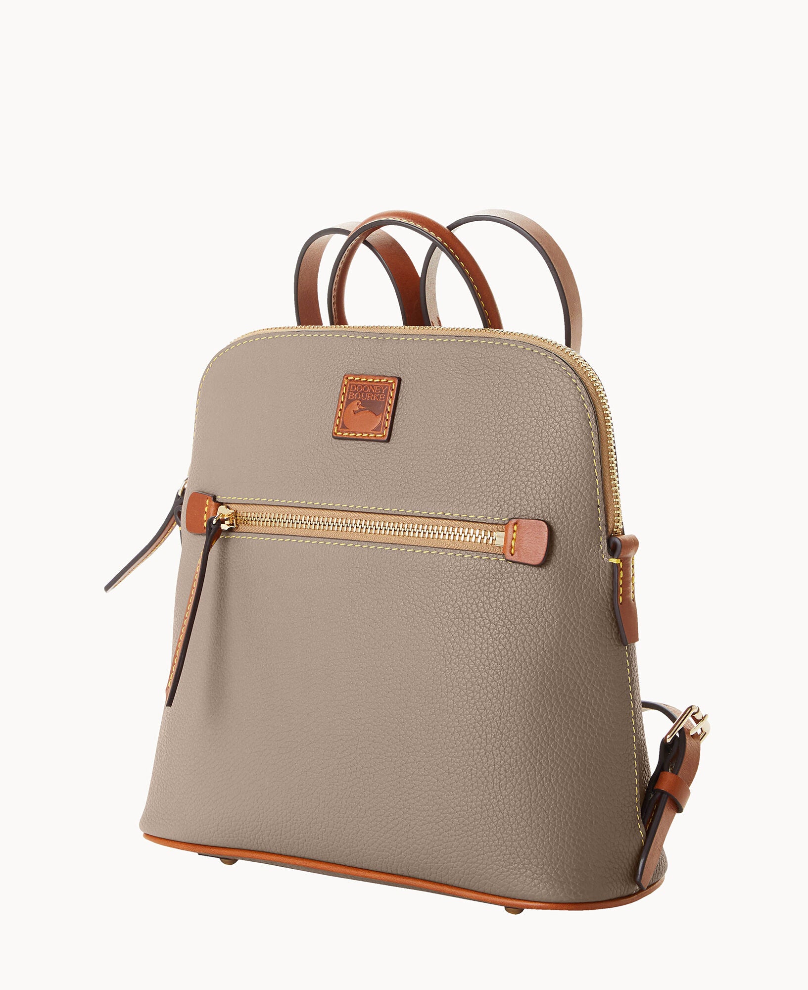 One outside zip pocket. Two inside slip pockets. One insie phone pocket. One inside zip pocket. Inside key hook. Adjustable straps. Strap drop length 14". Handle drop length 2". Feet. Lined. Zipper closure.