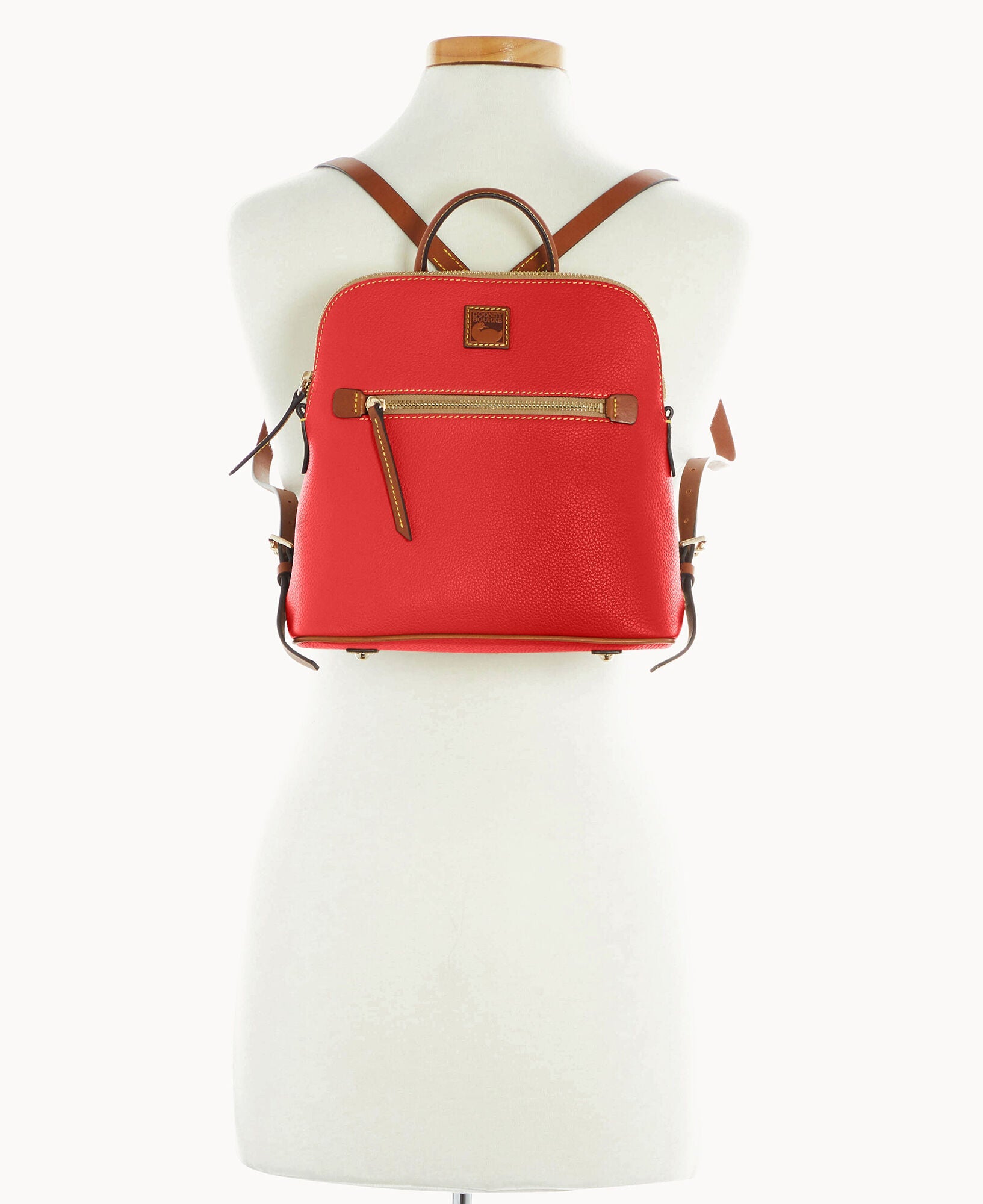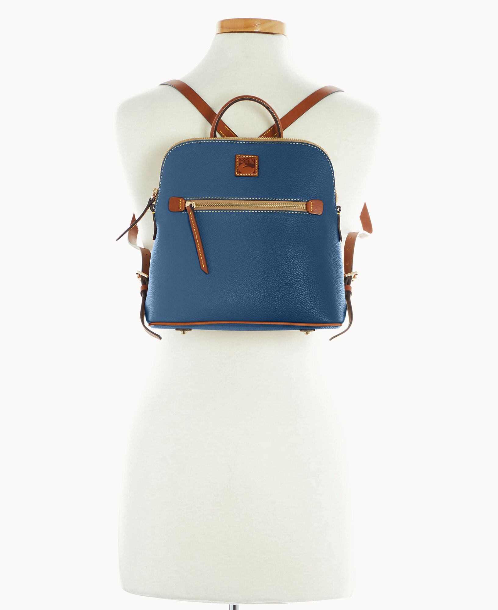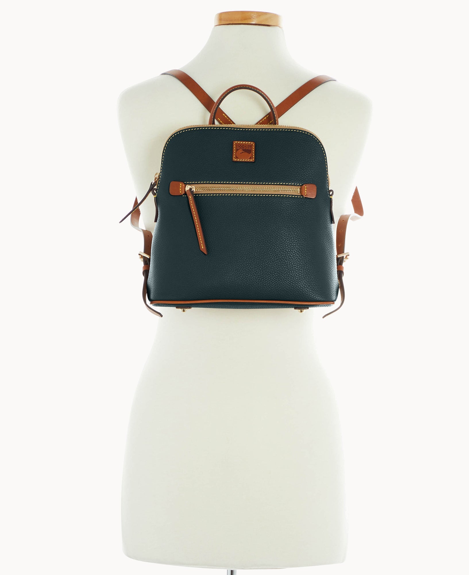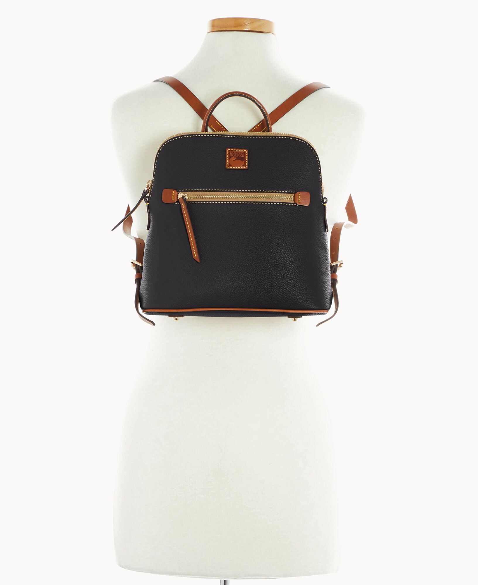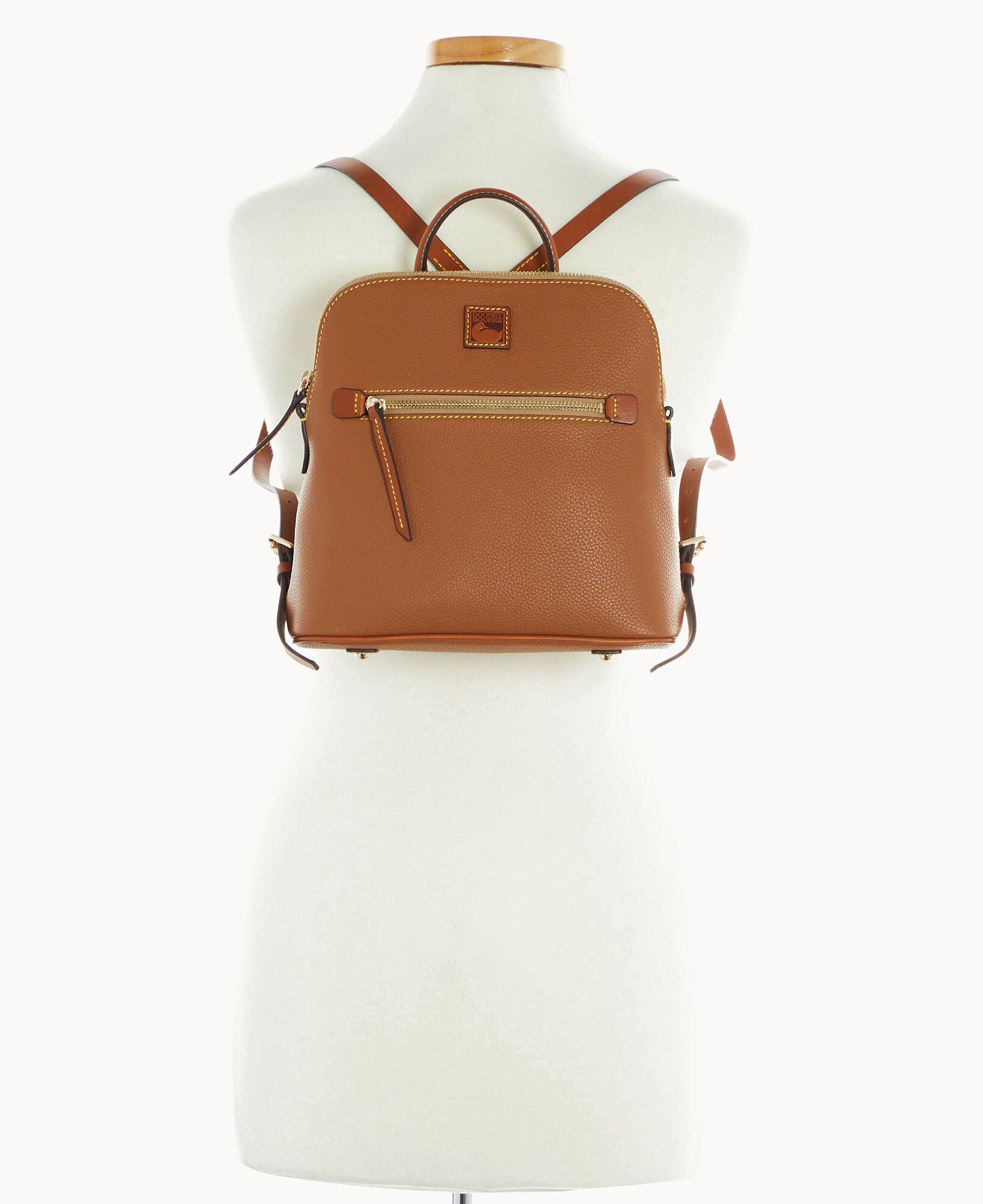 One outside zip pocket. Two inside slip pockets. One insie phone pocket. One inside zip pocket. Inside key hook. Adjustable straps. Strap drop length 14". Handle drop length 2". Feet. Lined. Zipper closure.