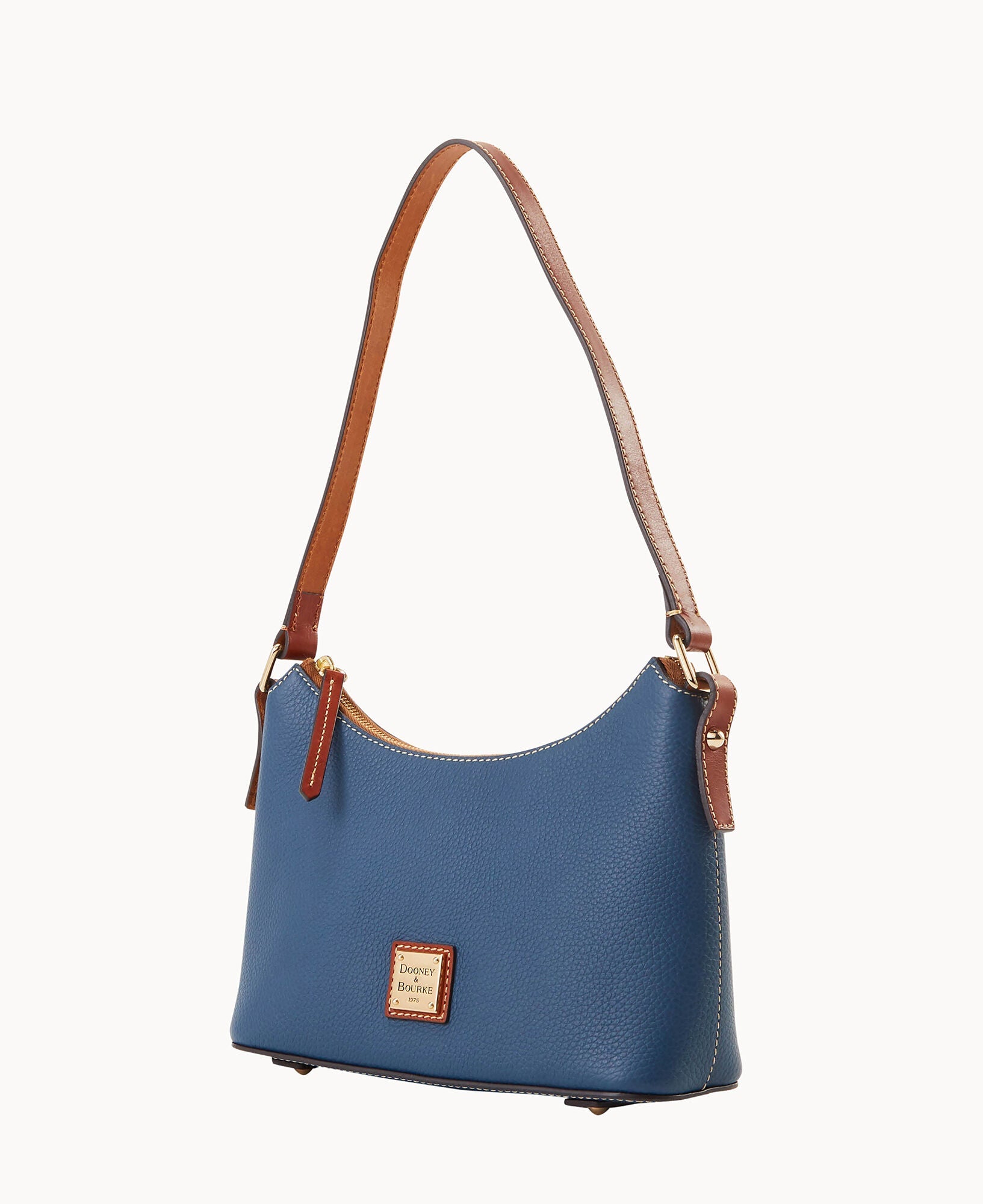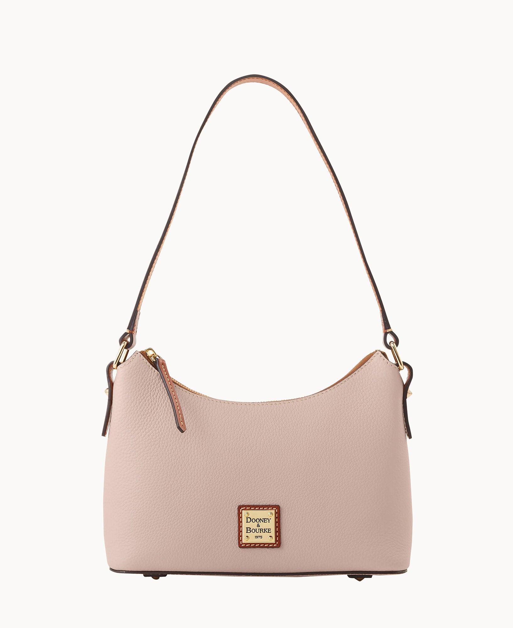 Two inside slip pockets. Inside key hook. Strap drop length 11". Lined. Feet. Zipper closure.