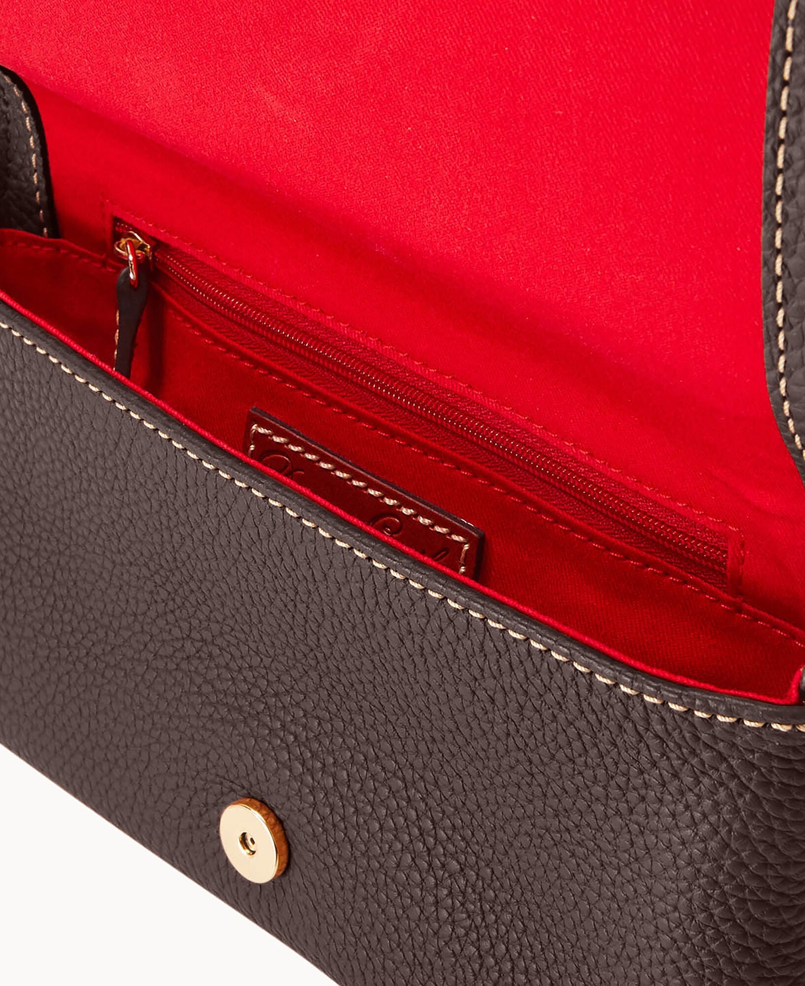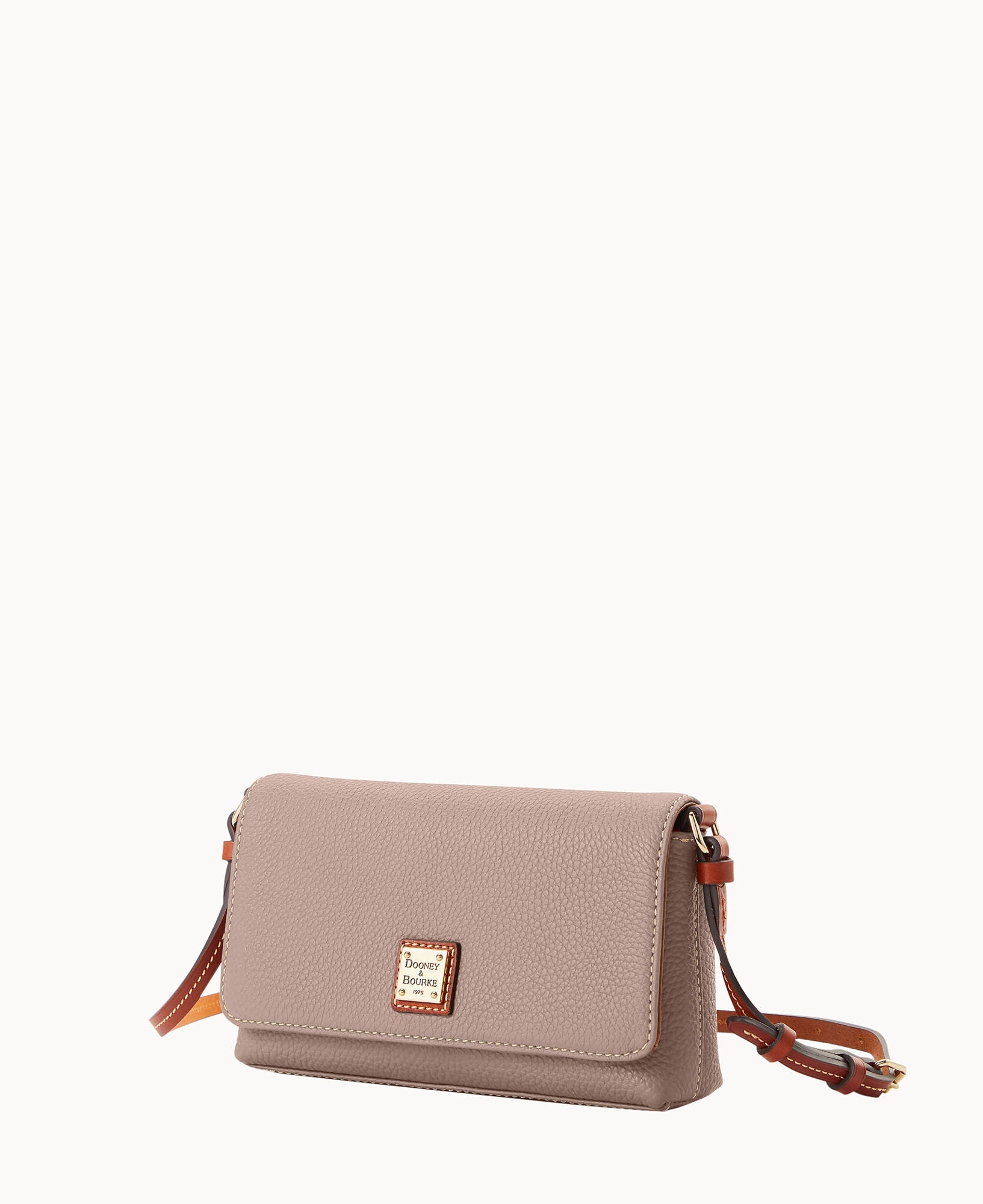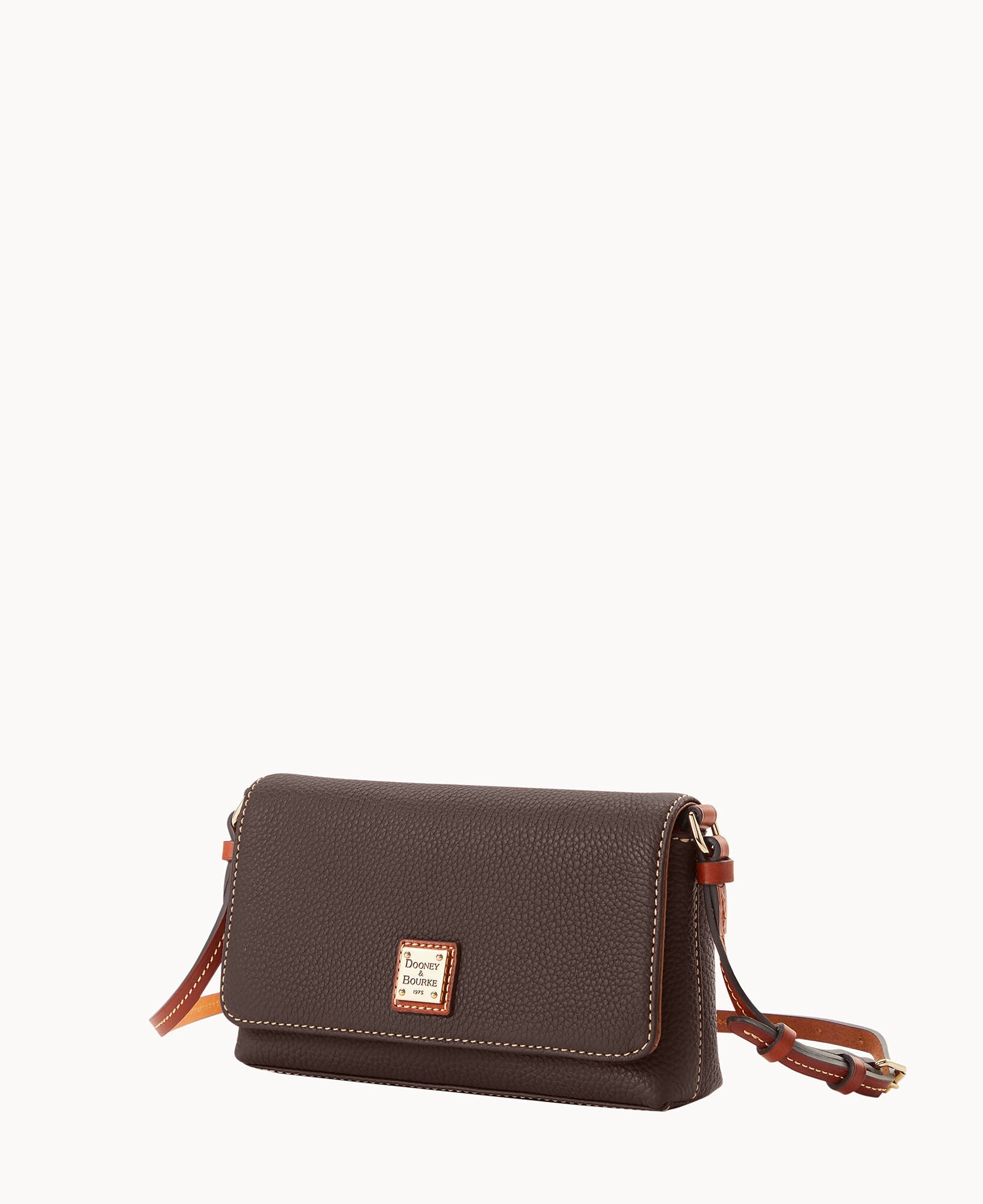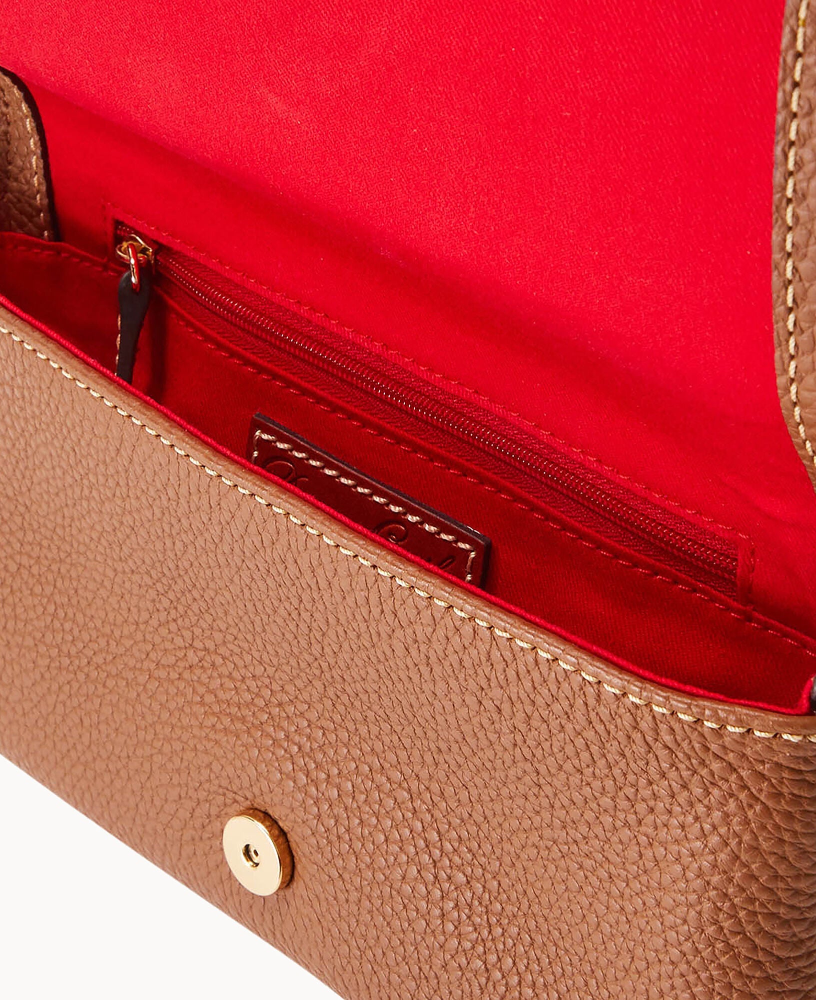 One outside slip pocket. One inside zip pocket. One inside slip pocket. Inside key hook. Adjustable strap. Detachable strap. Strap drop length 25". Lined. Magnetic closure.