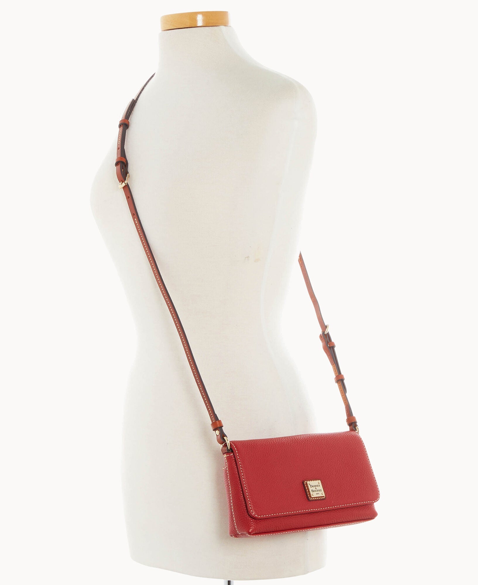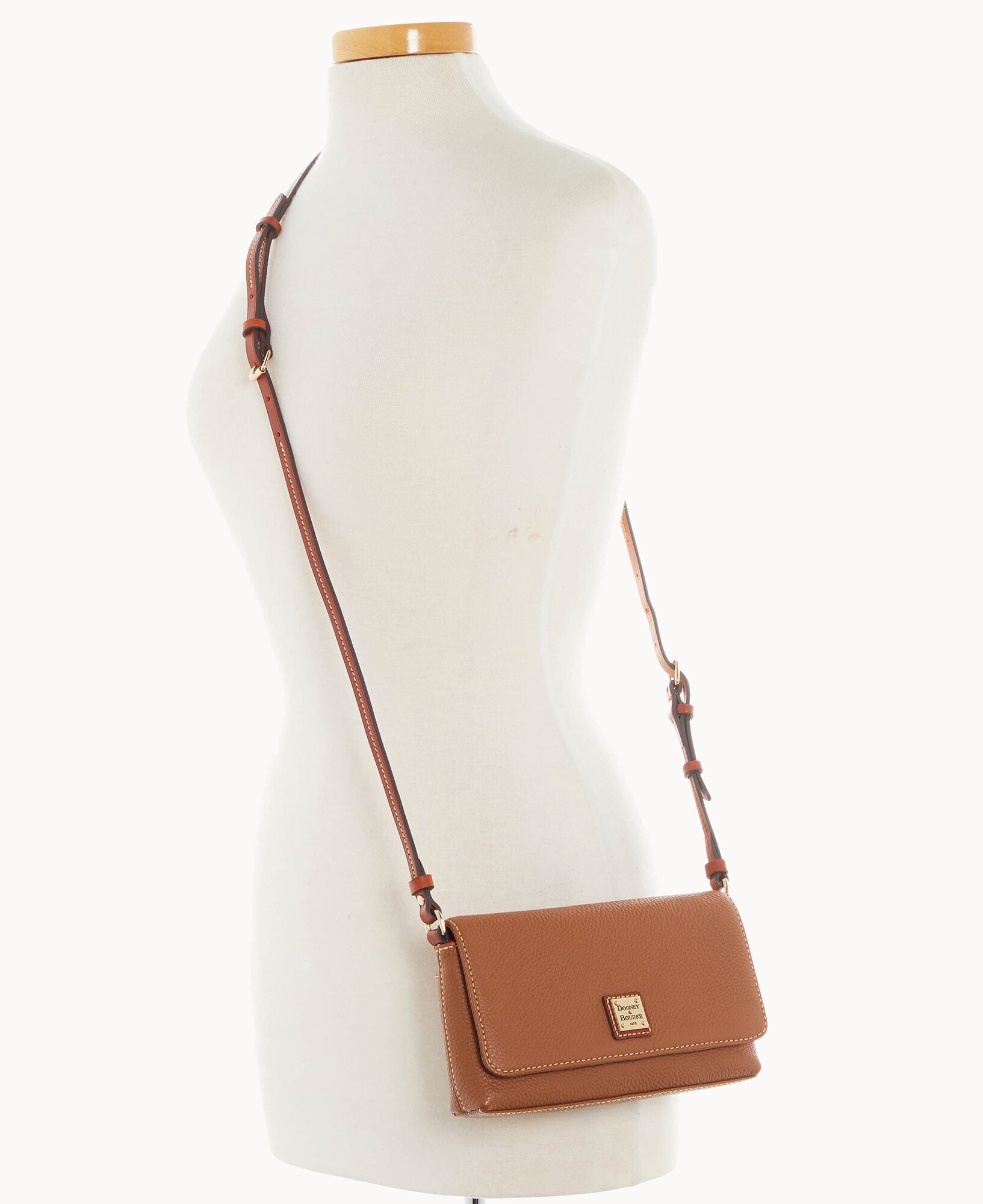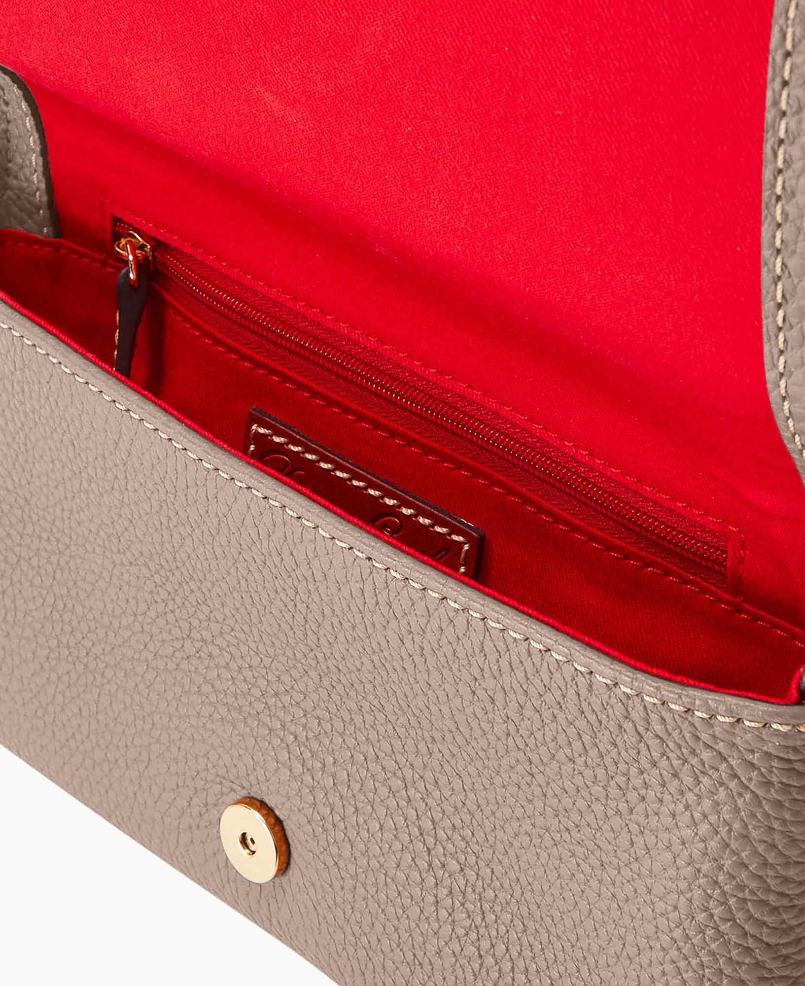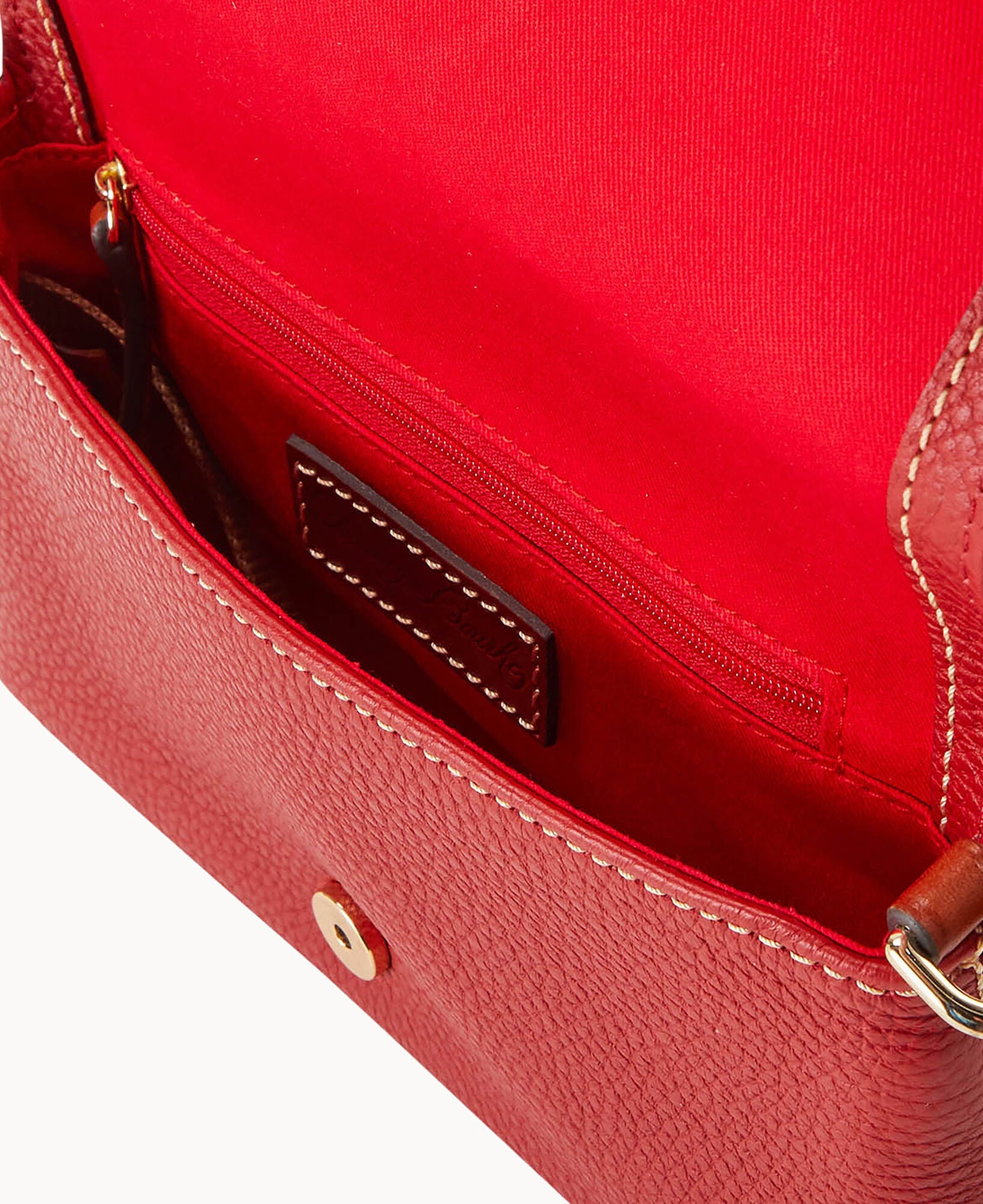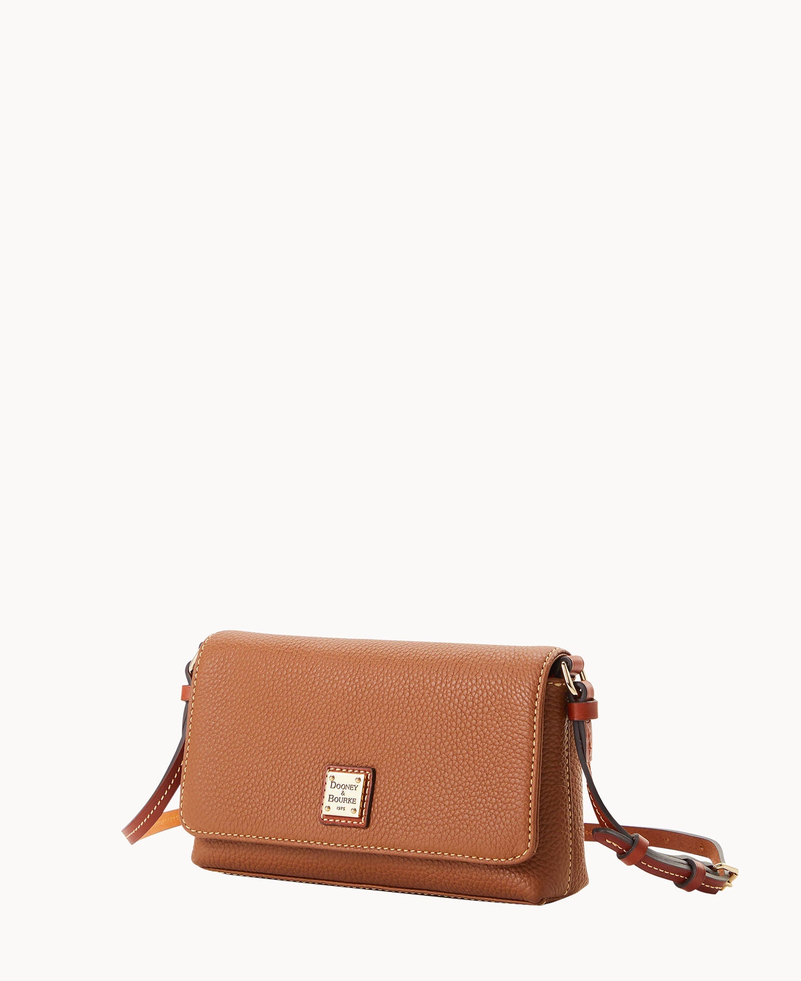 One outside slip pocket. One inside zip pocket. One inside slip pocket. Inside key hook. Adjustable strap. Detachable strap. Strap drop length 25". Lined. Magnetic closure.