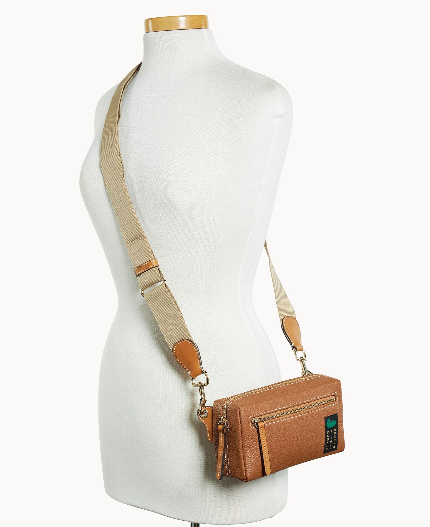 One outside zip pocket. One inside pocket. Adjustable, detachable shoulder strap. Strap drop length 24". Includes a leather and twill shoulder strap for multiple carrying options. Lined. Zipper closure.