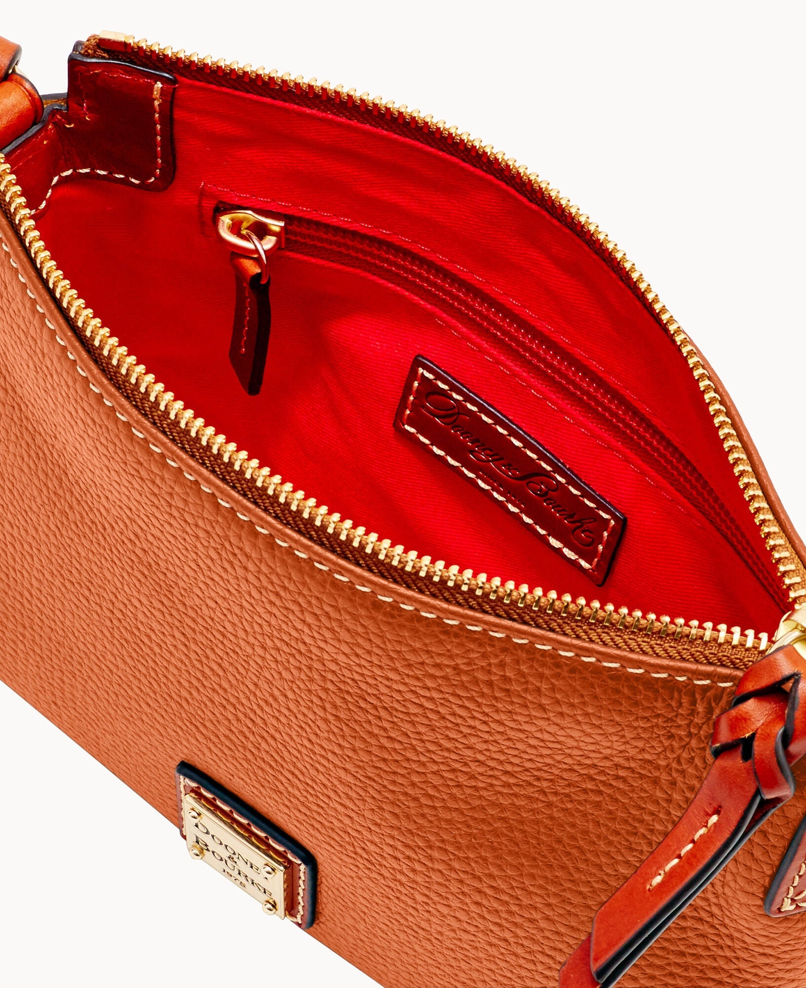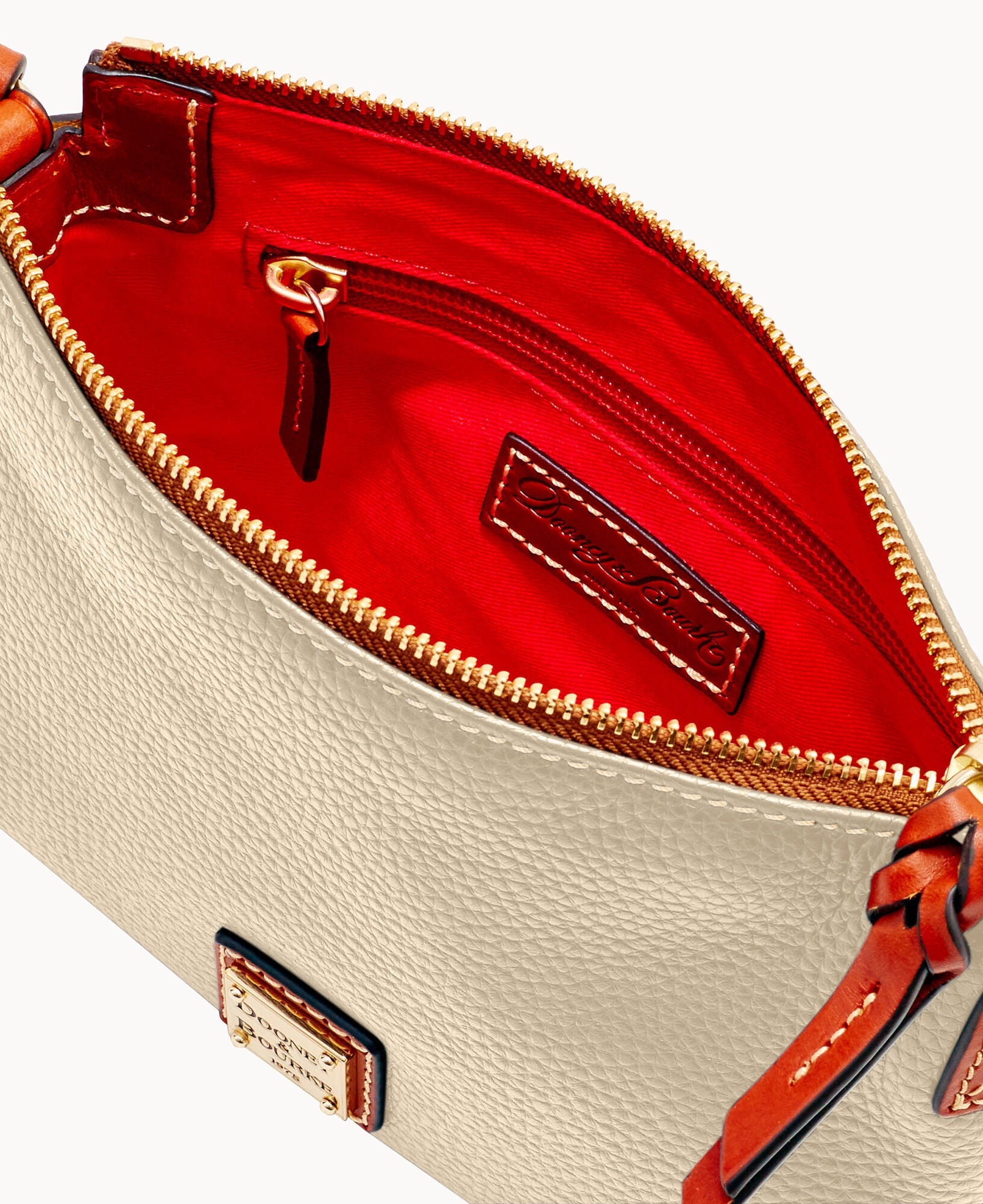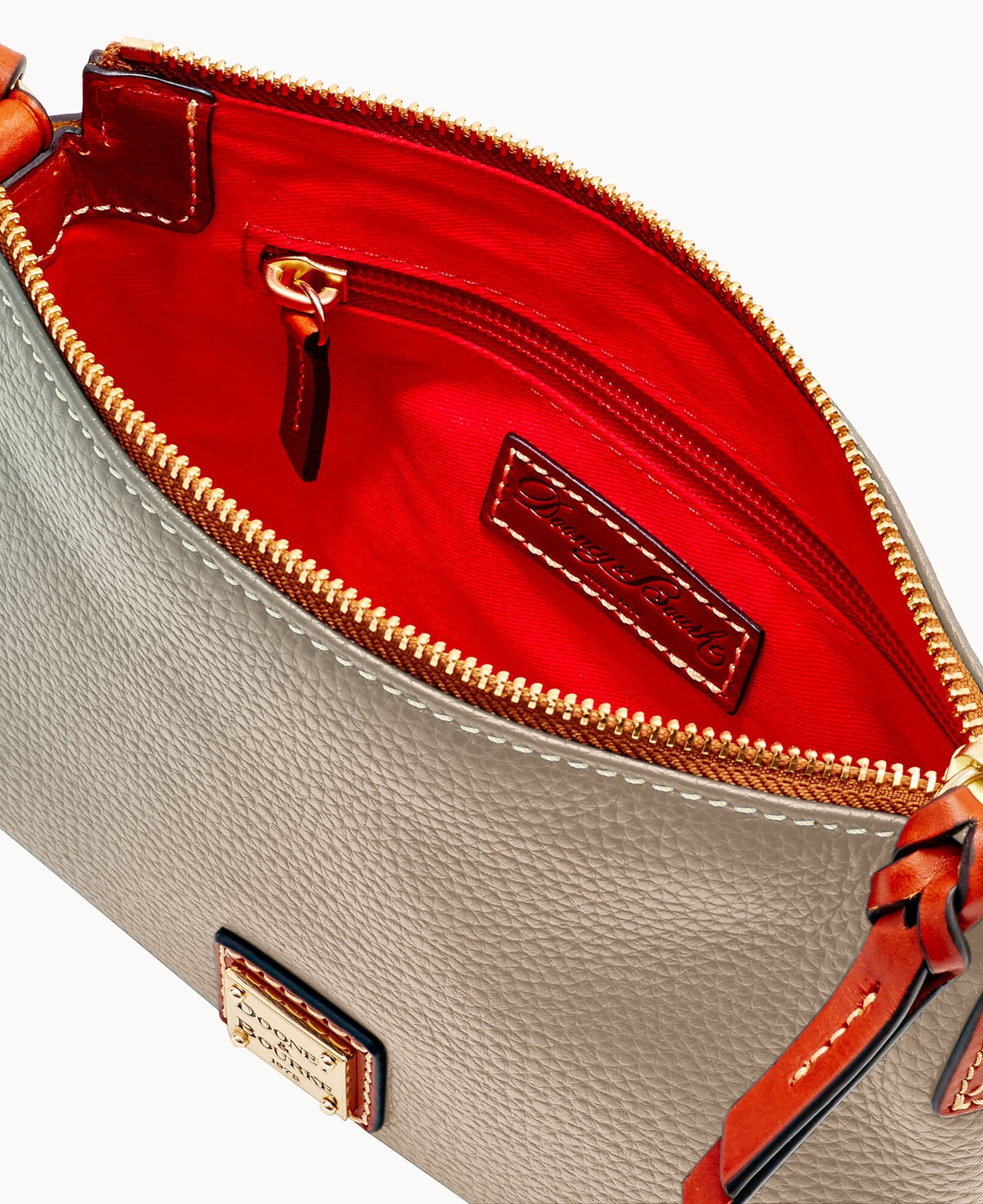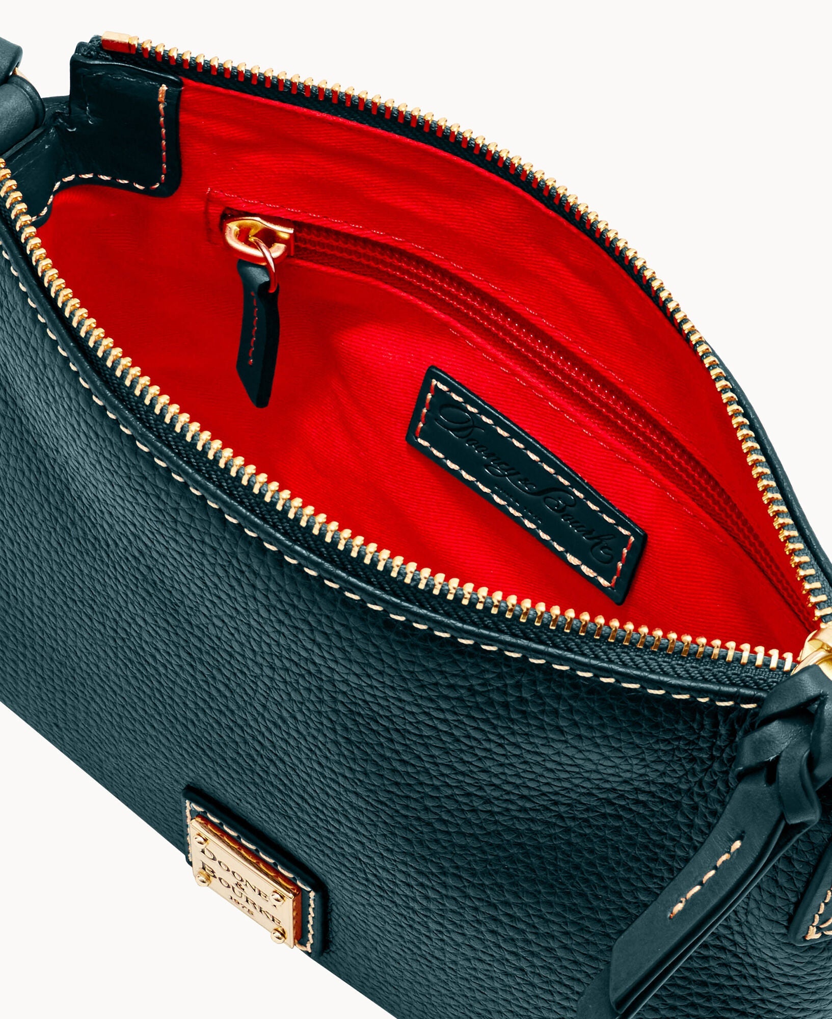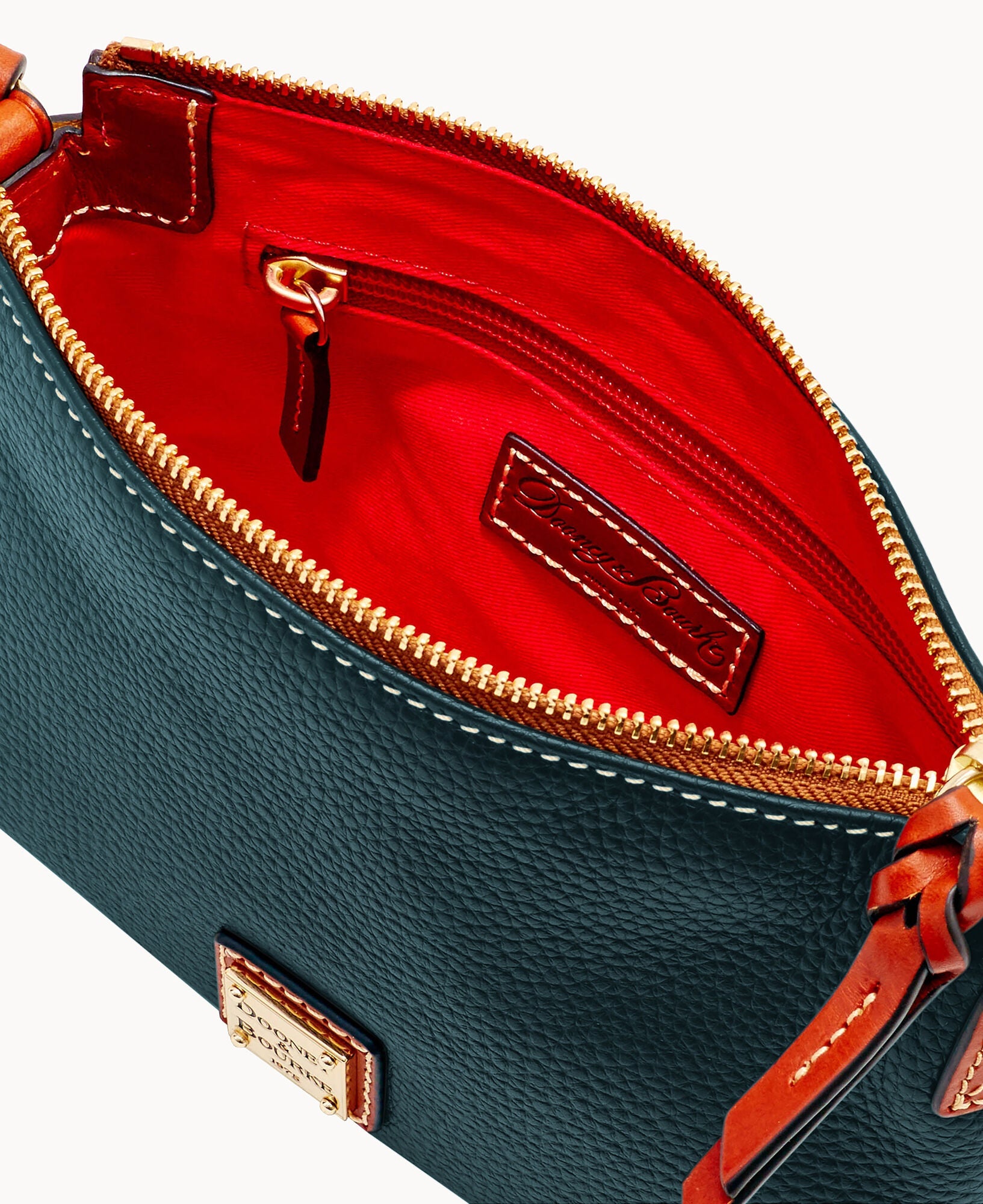 One inside zip pocket. Two inside pockets. Cell phone pocket. Adjustable shoulder strap. Strap drop length 25". Lined. Zipper closure.