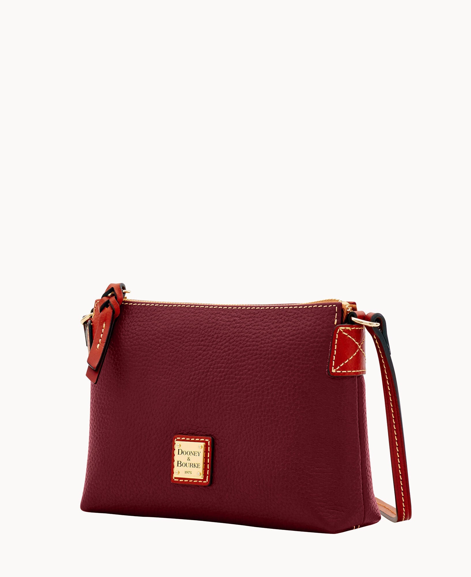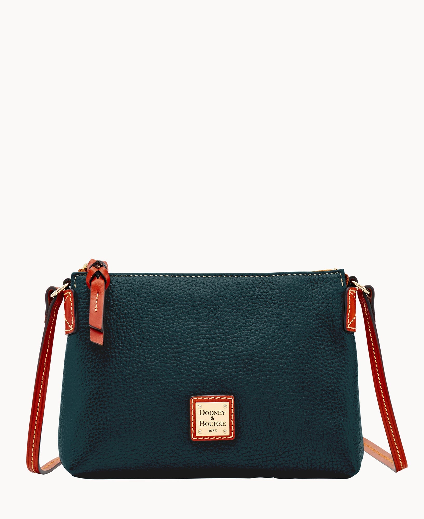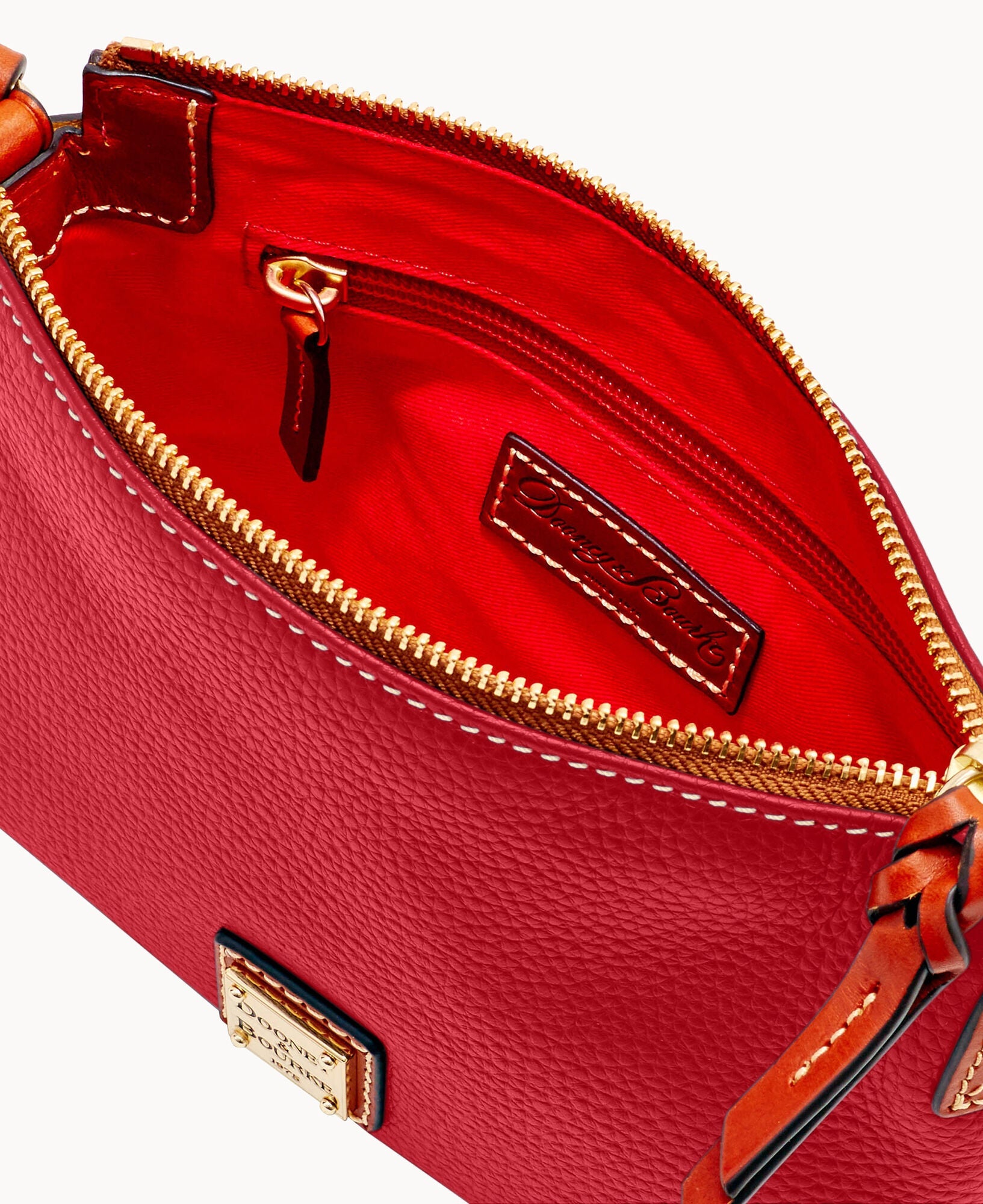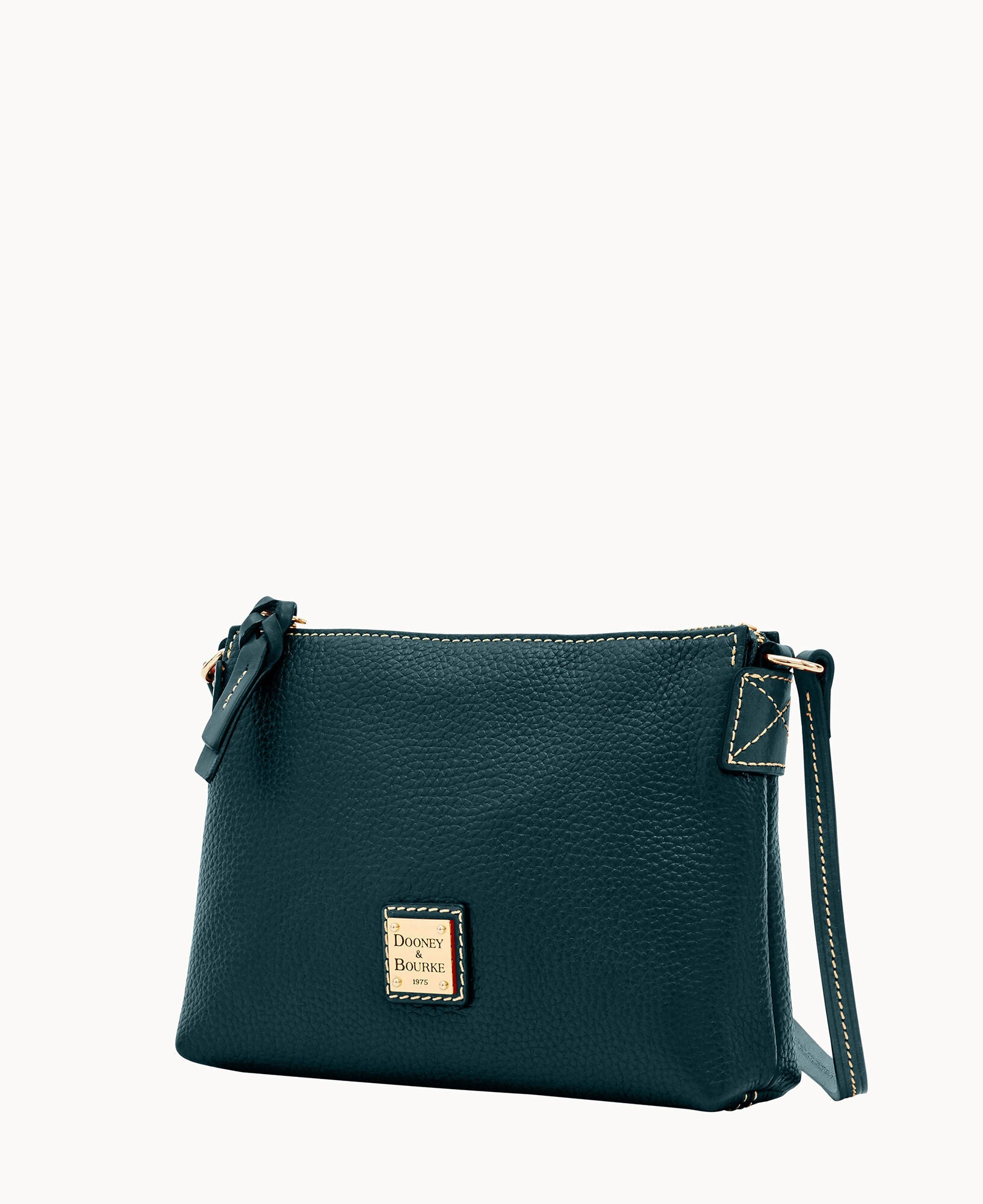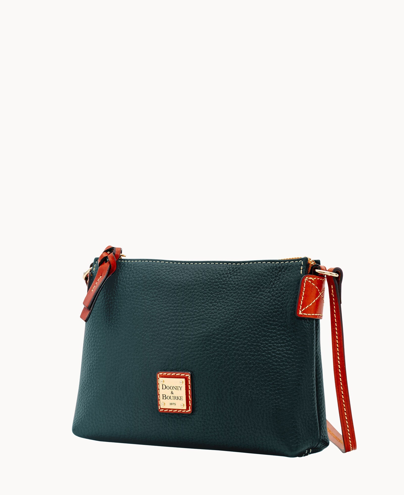 One inside zip pocket. Two inside pockets. Cell phone pocket. Adjustable shoulder strap. Strap drop length 25". Lined. Zipper closure.