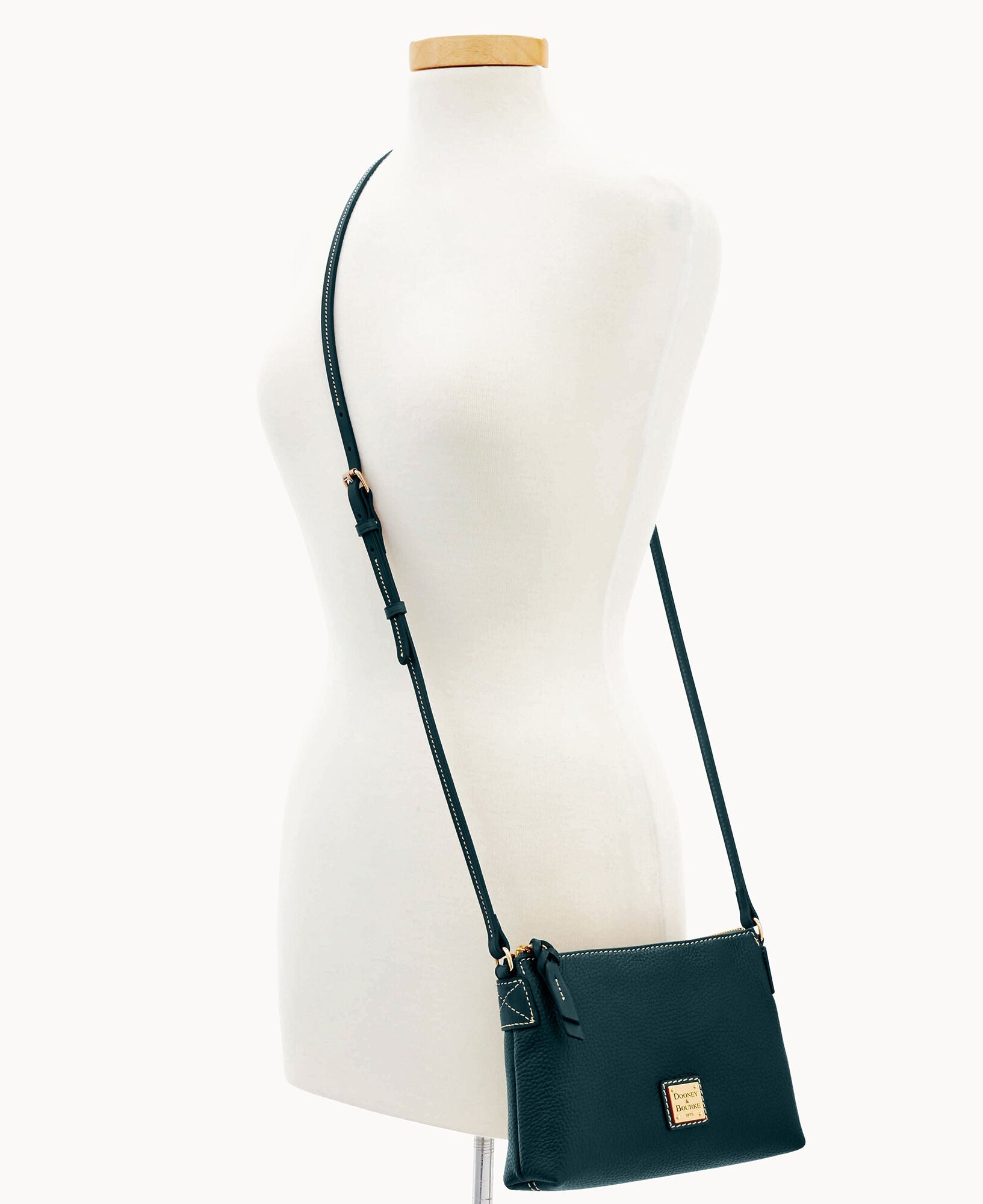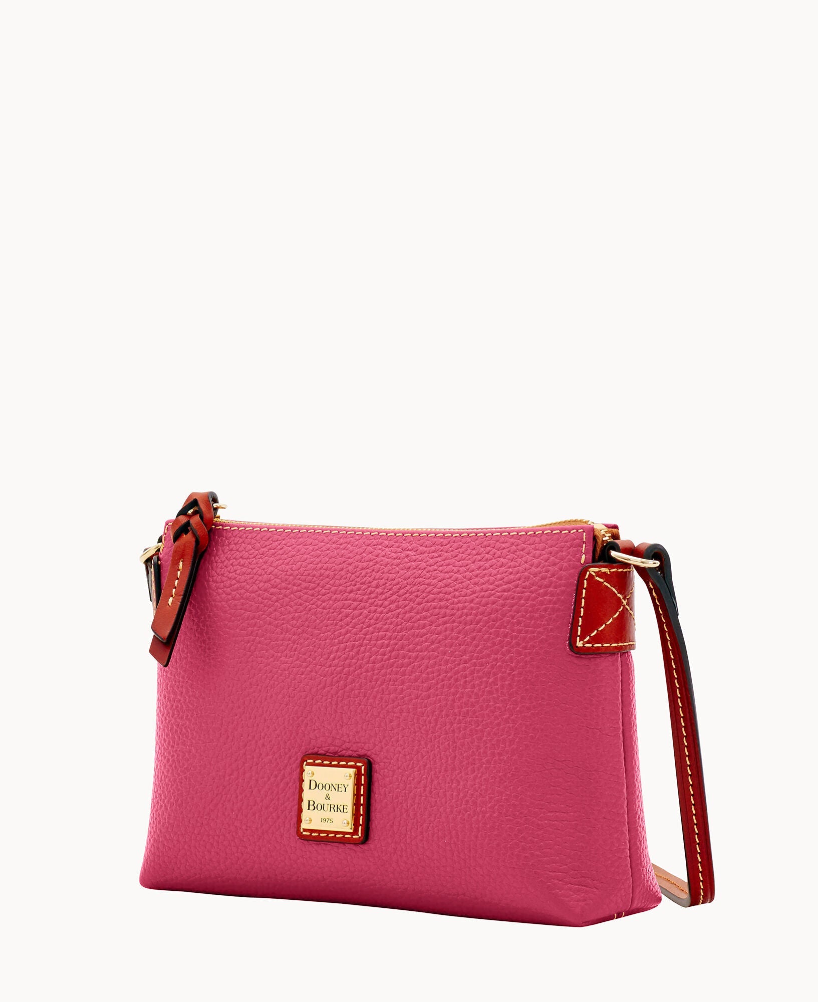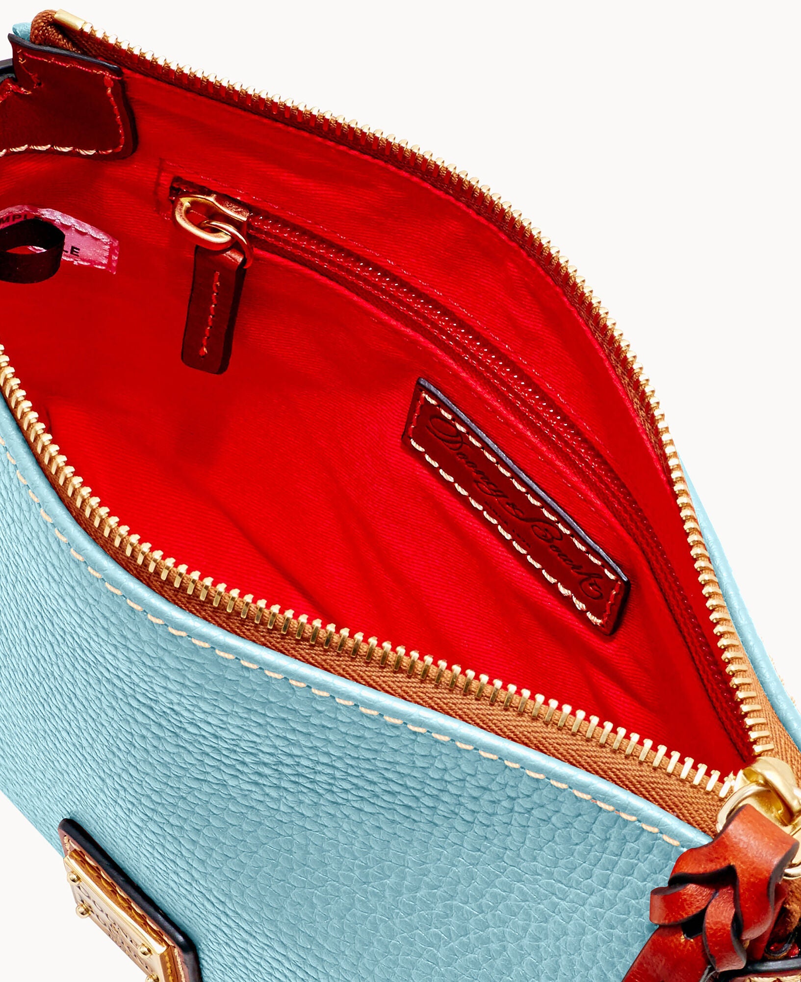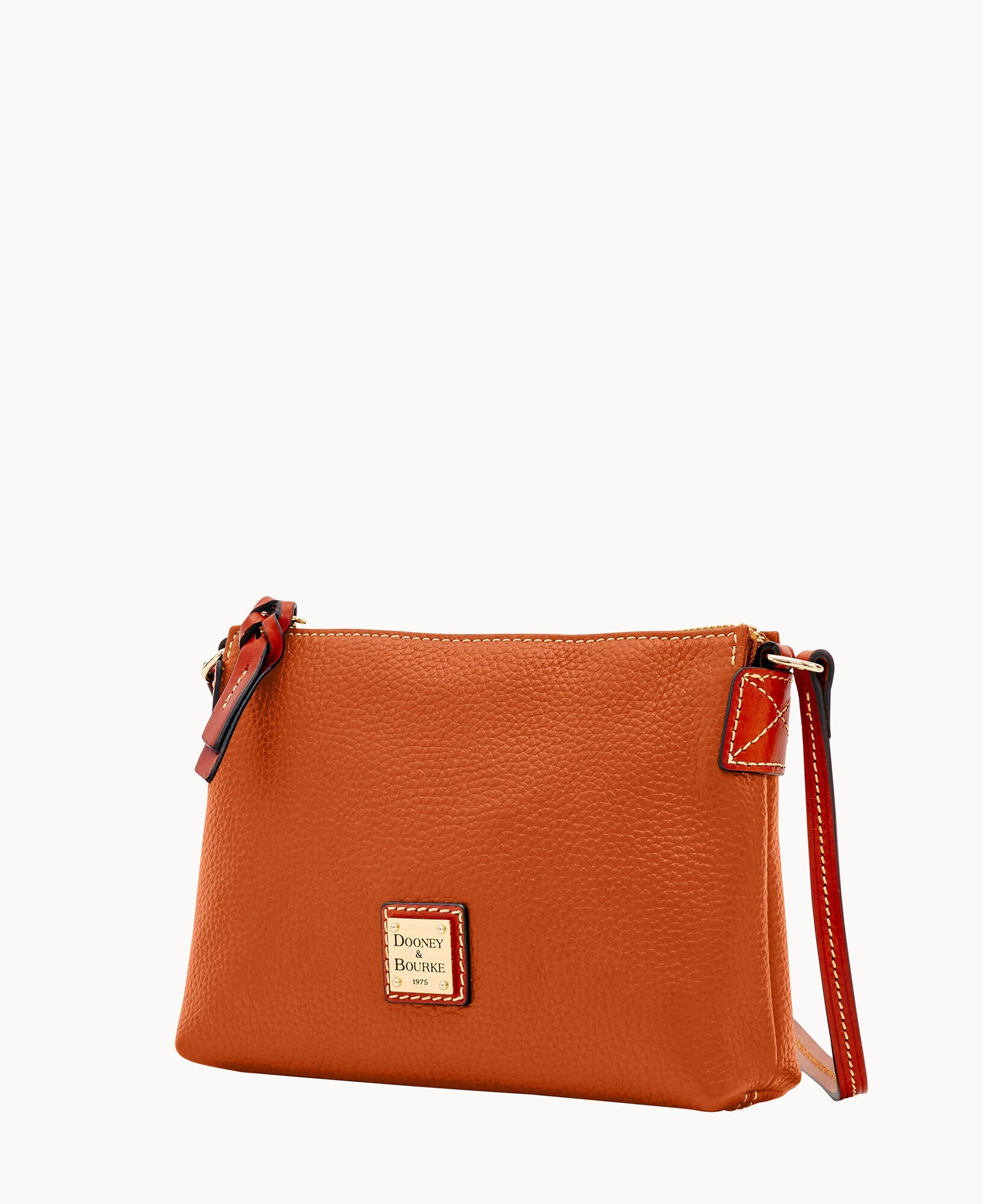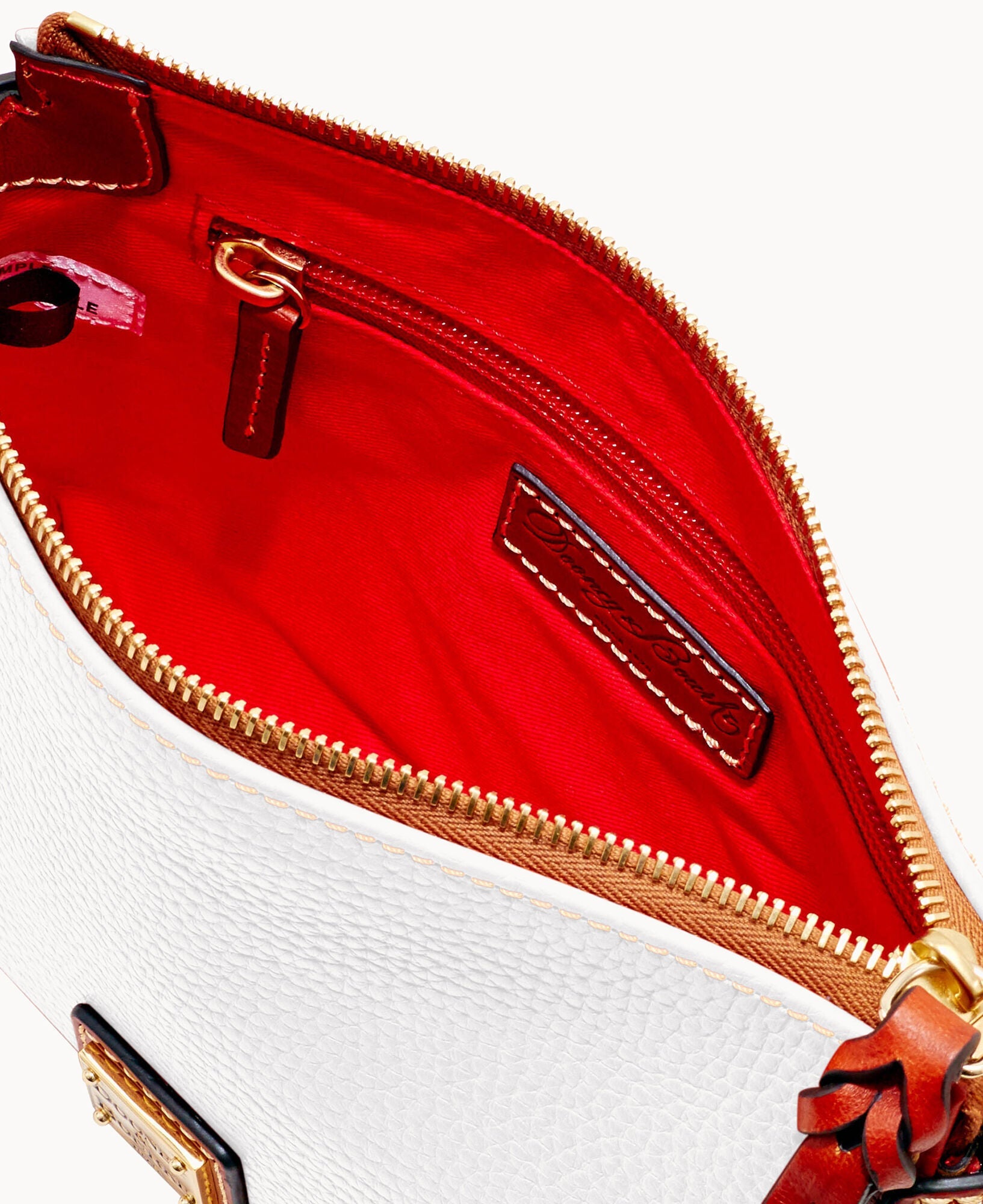One inside zip pocket. Two inside pockets. Cell phone pocket. Adjustable shoulder strap. Strap drop length 25". Lined. Zipper closure.