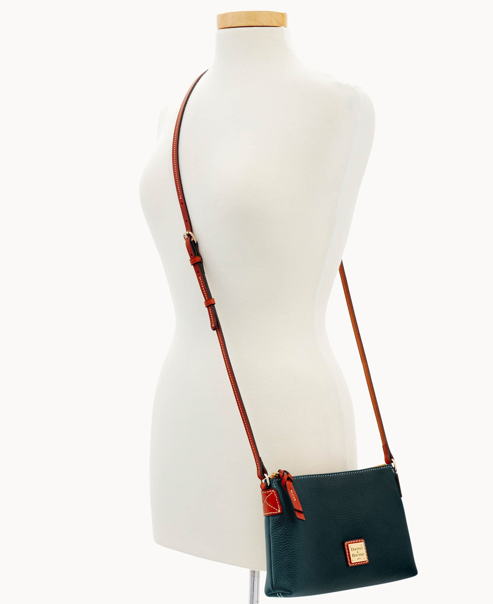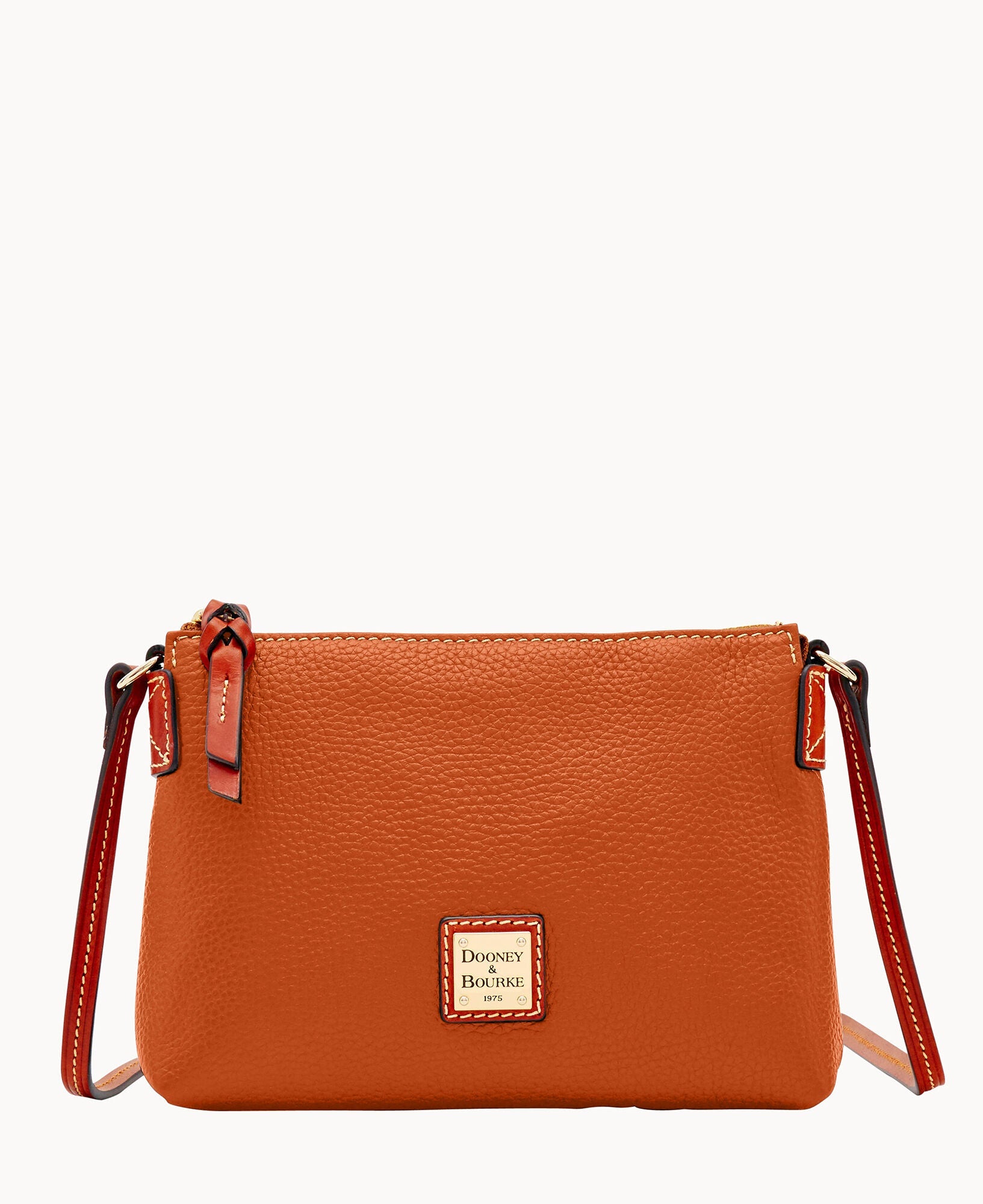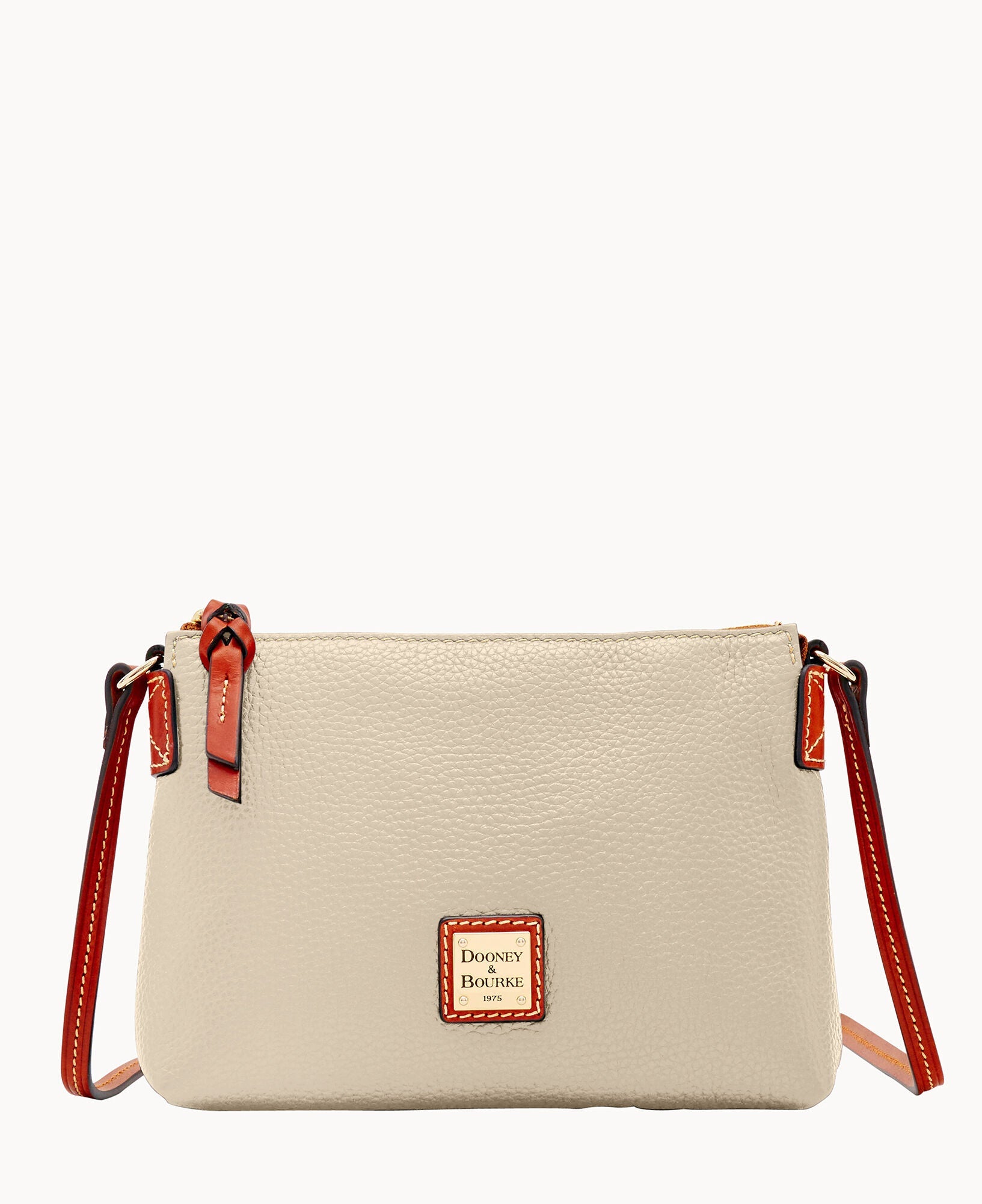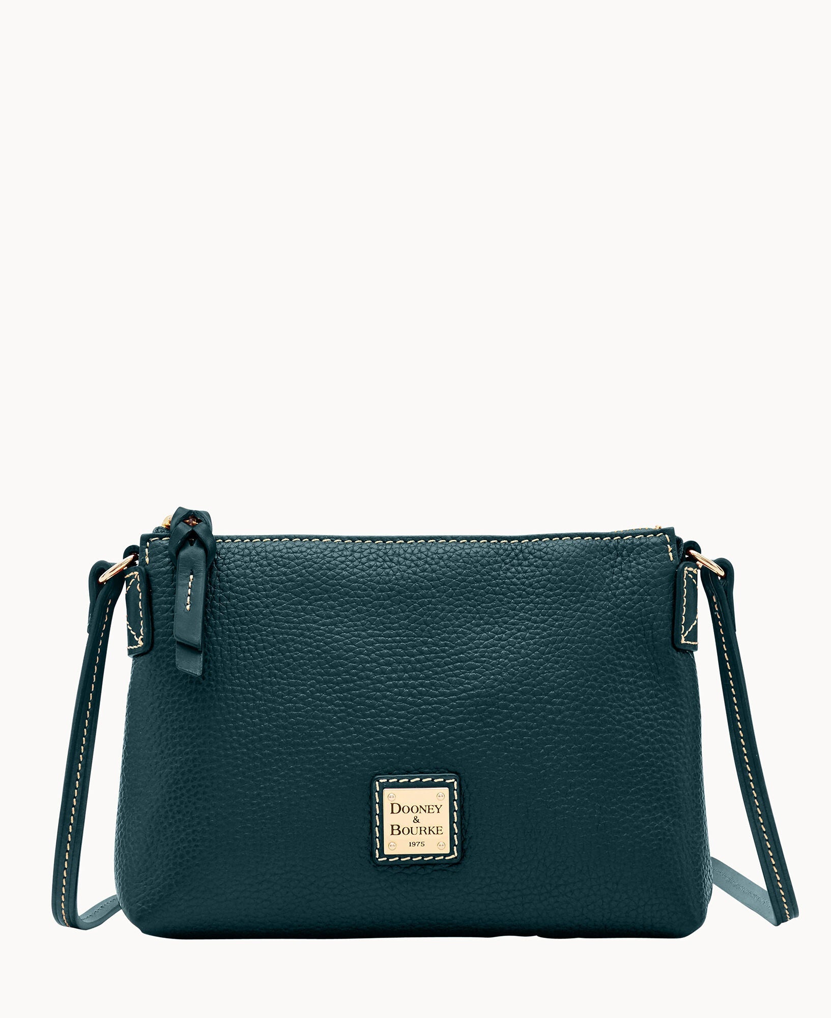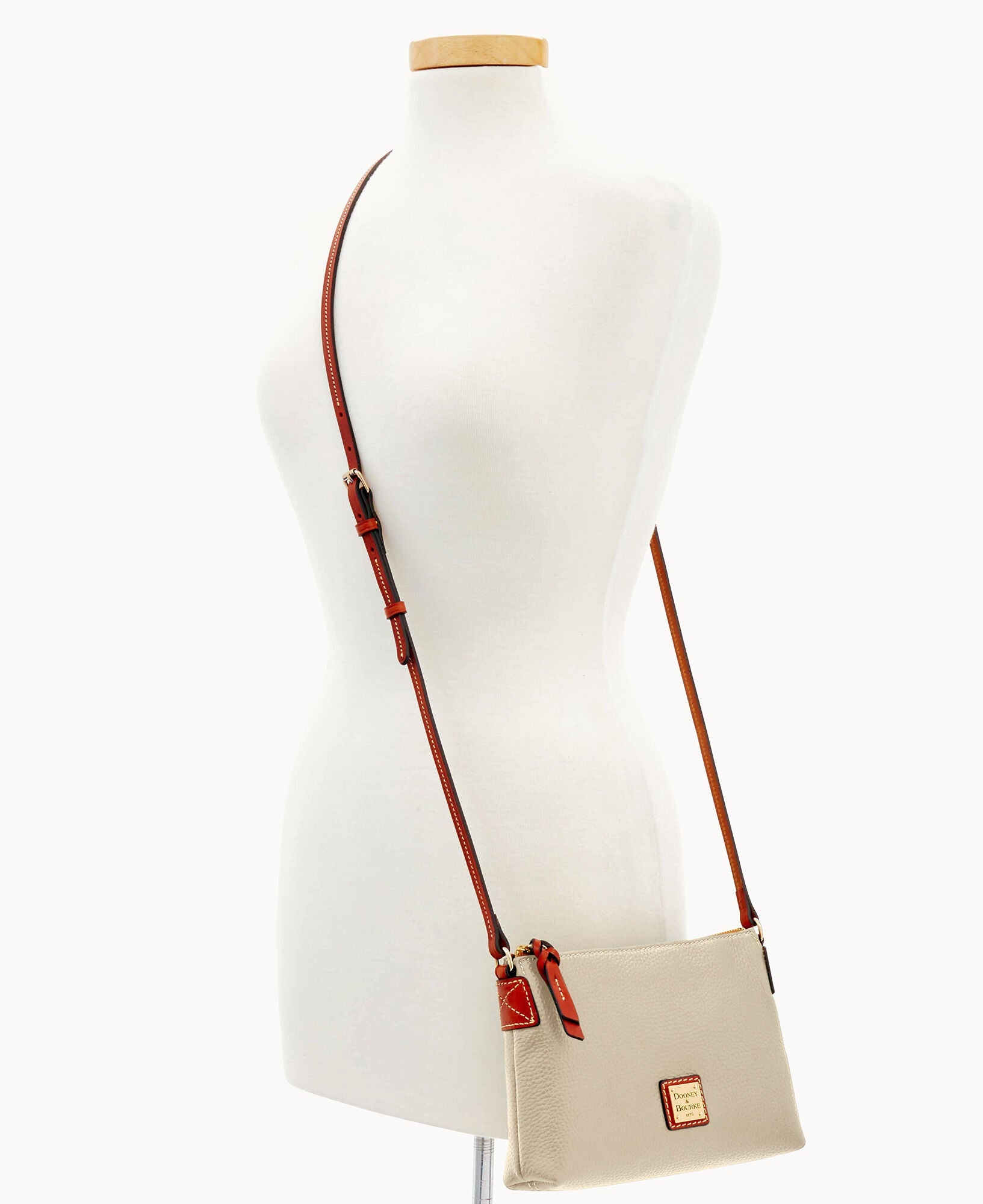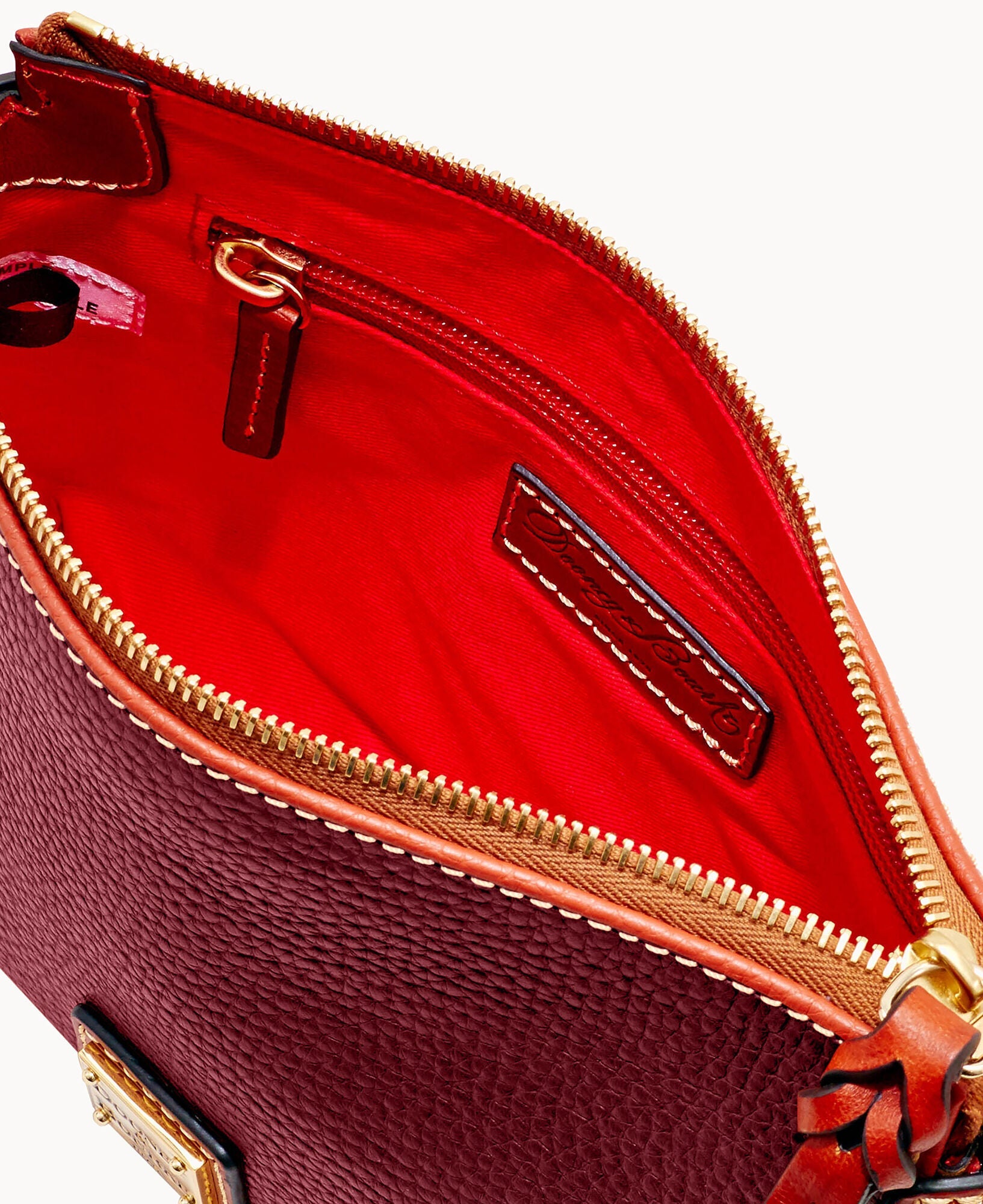 One inside zip pocket. Two inside pockets. Cell phone pocket. Adjustable shoulder strap. Strap drop length 25". Lined. Zipper closure.