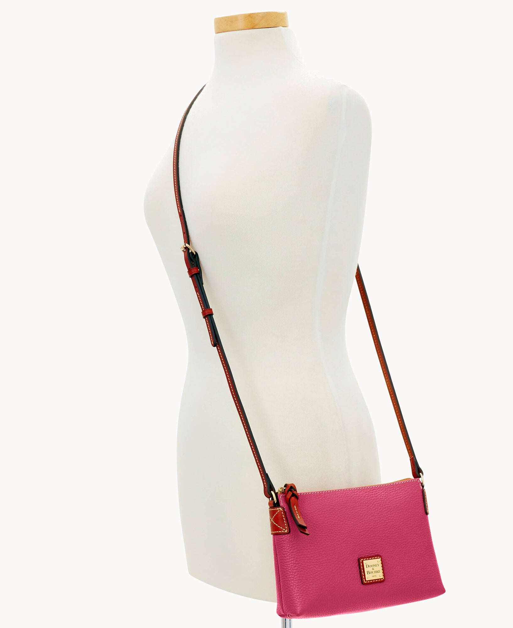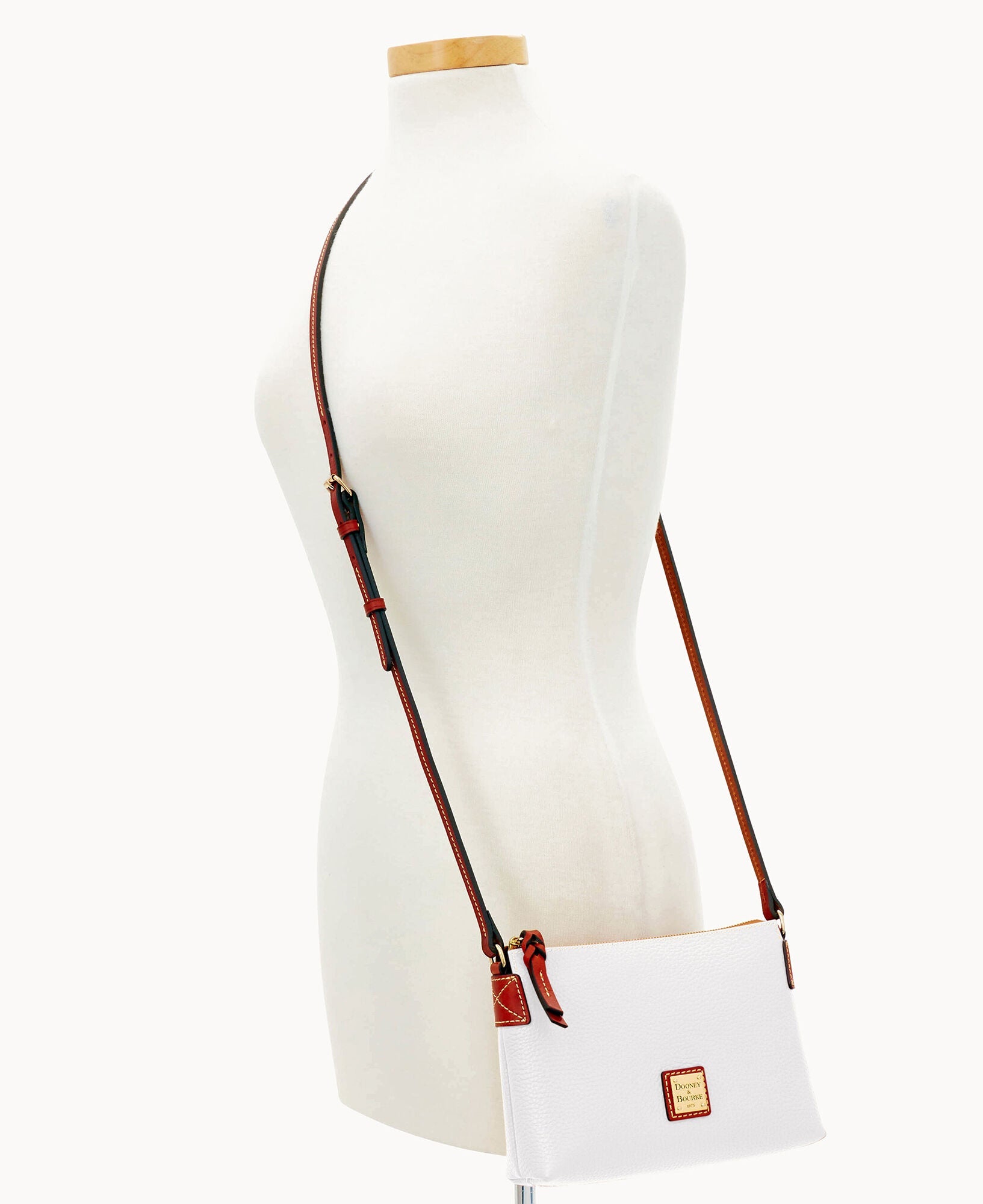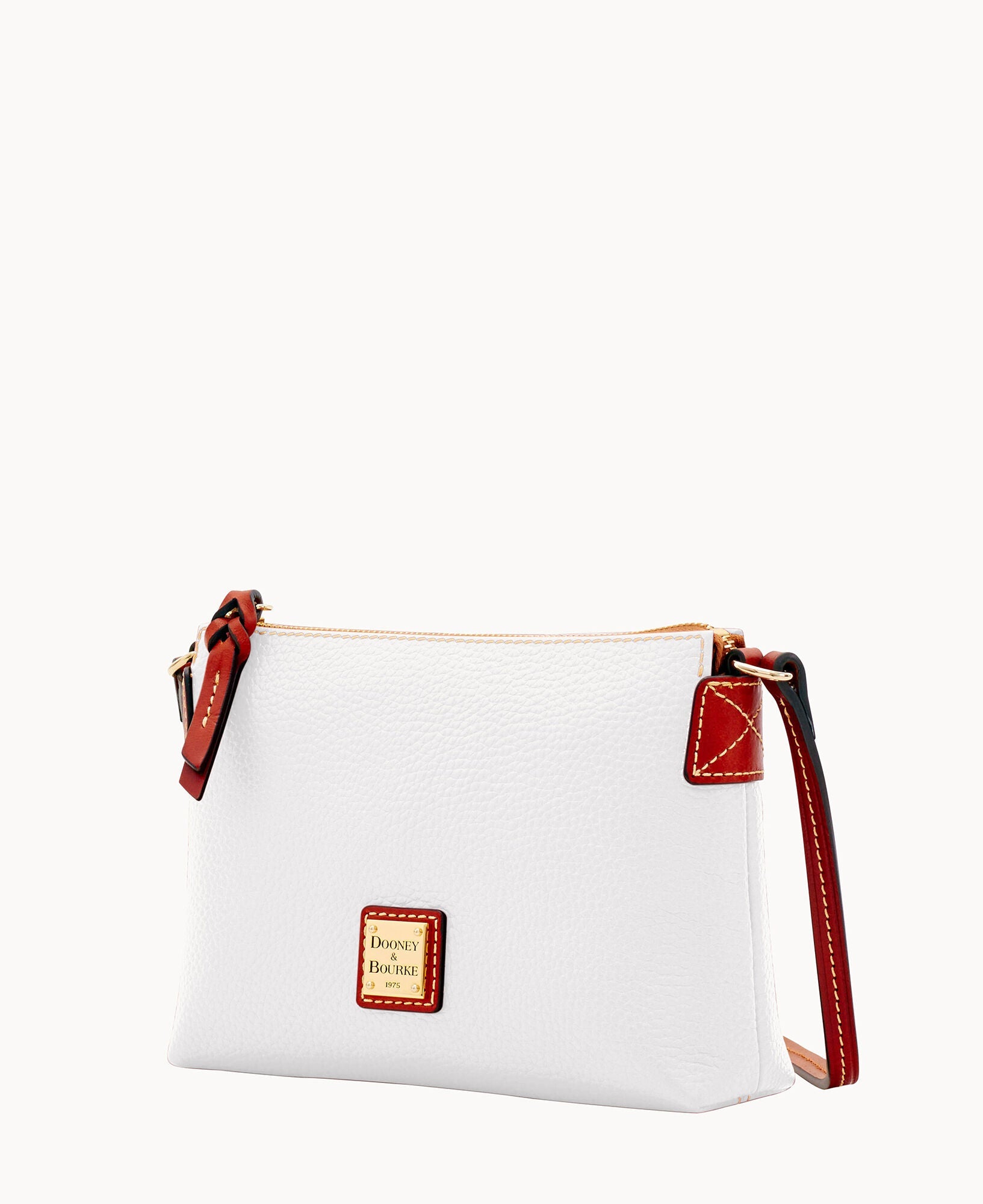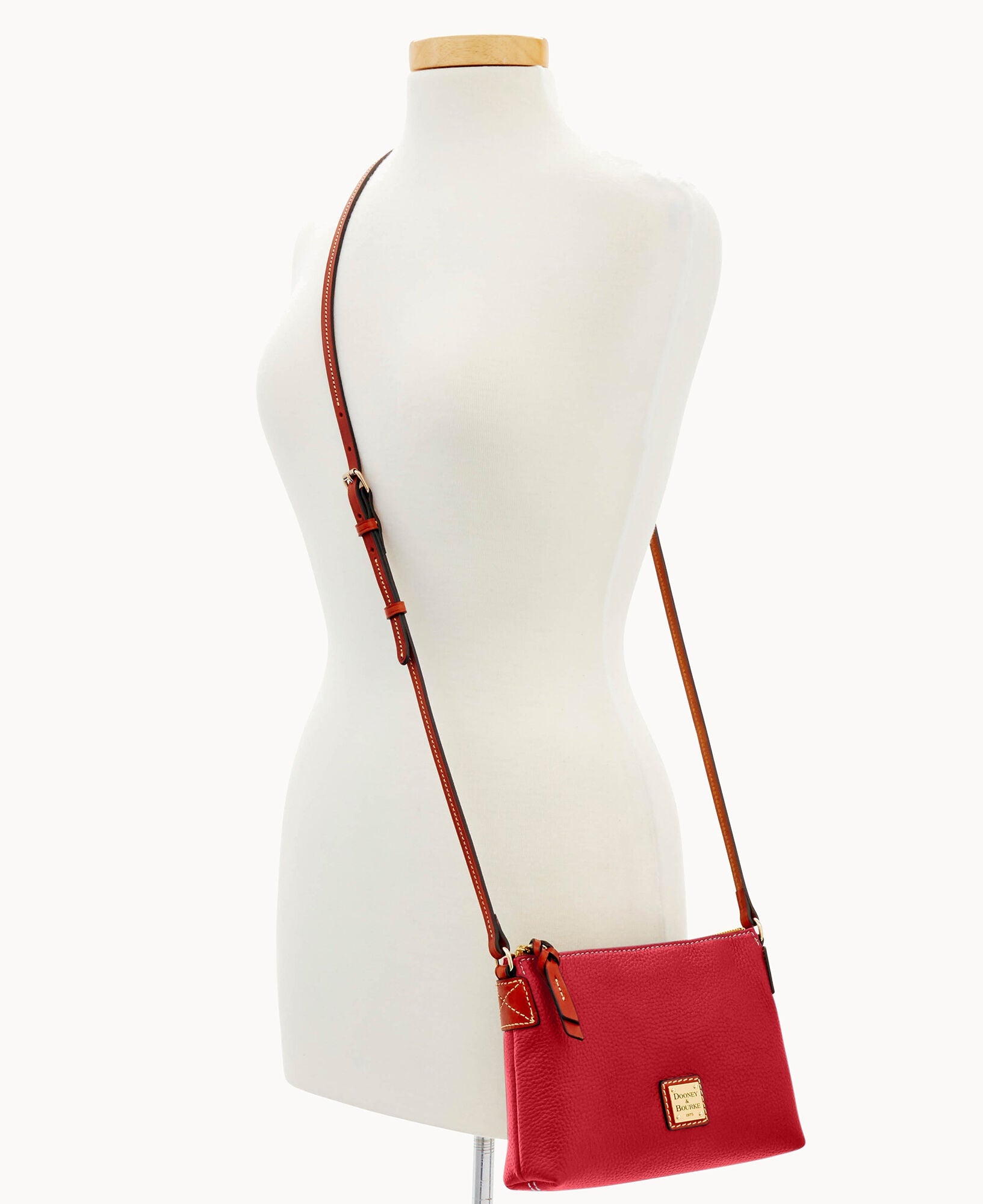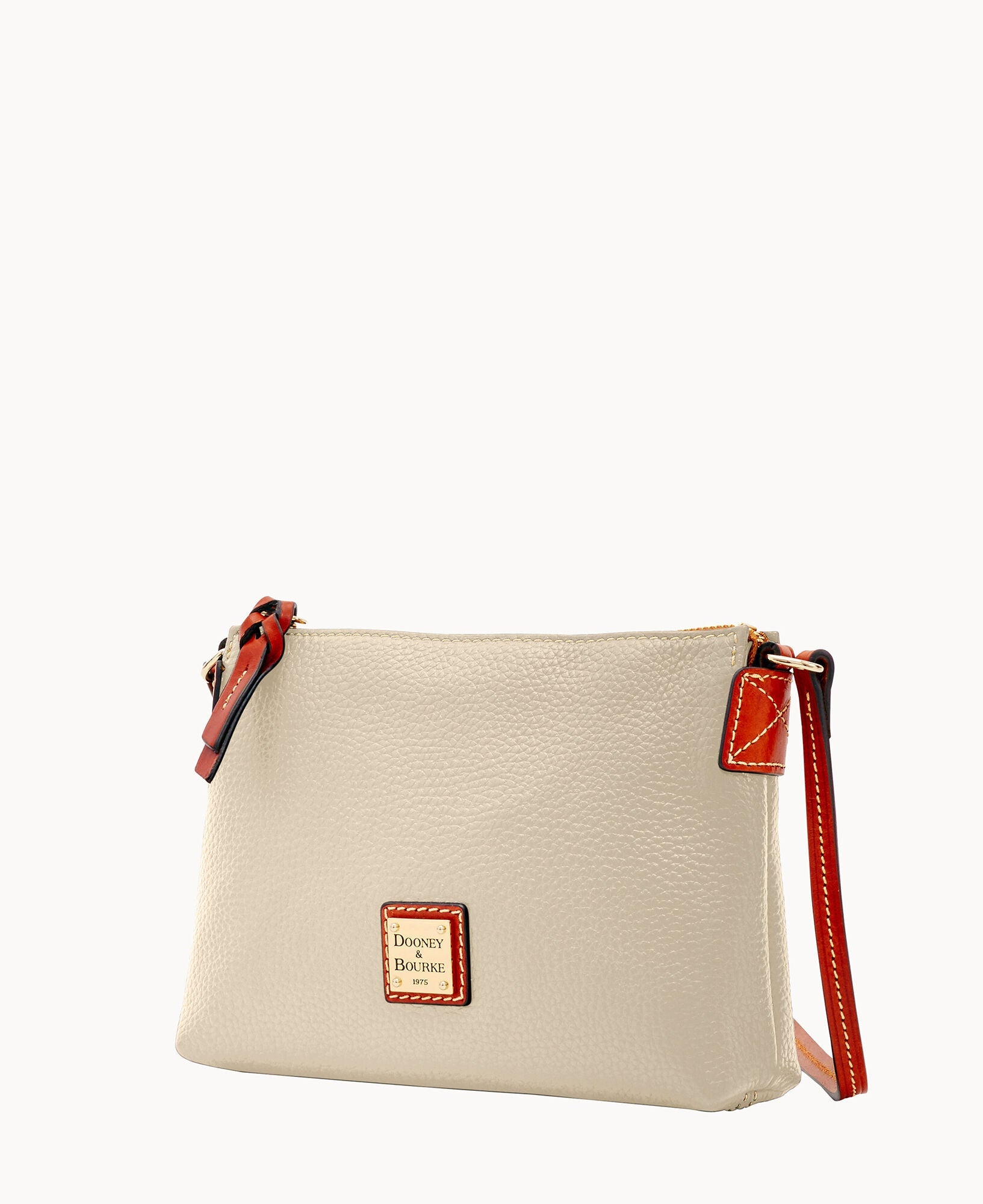 One inside zip pocket. Two inside pockets. Cell phone pocket. Adjustable shoulder strap. Strap drop length 25". Lined. Zipper closure.