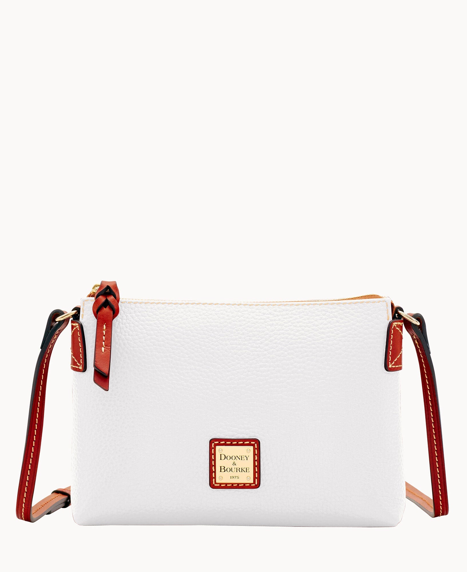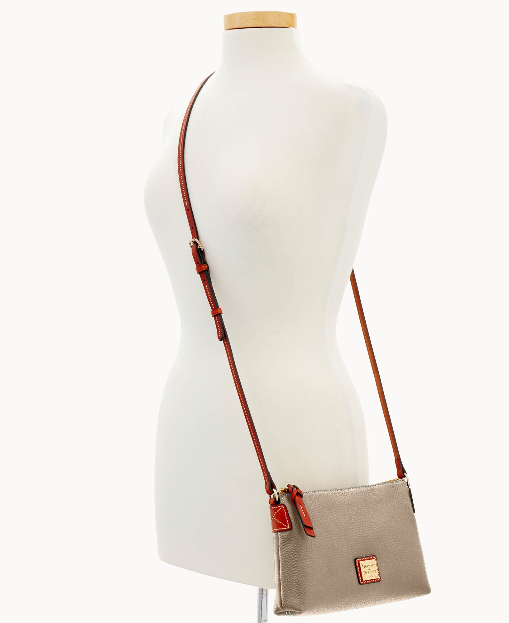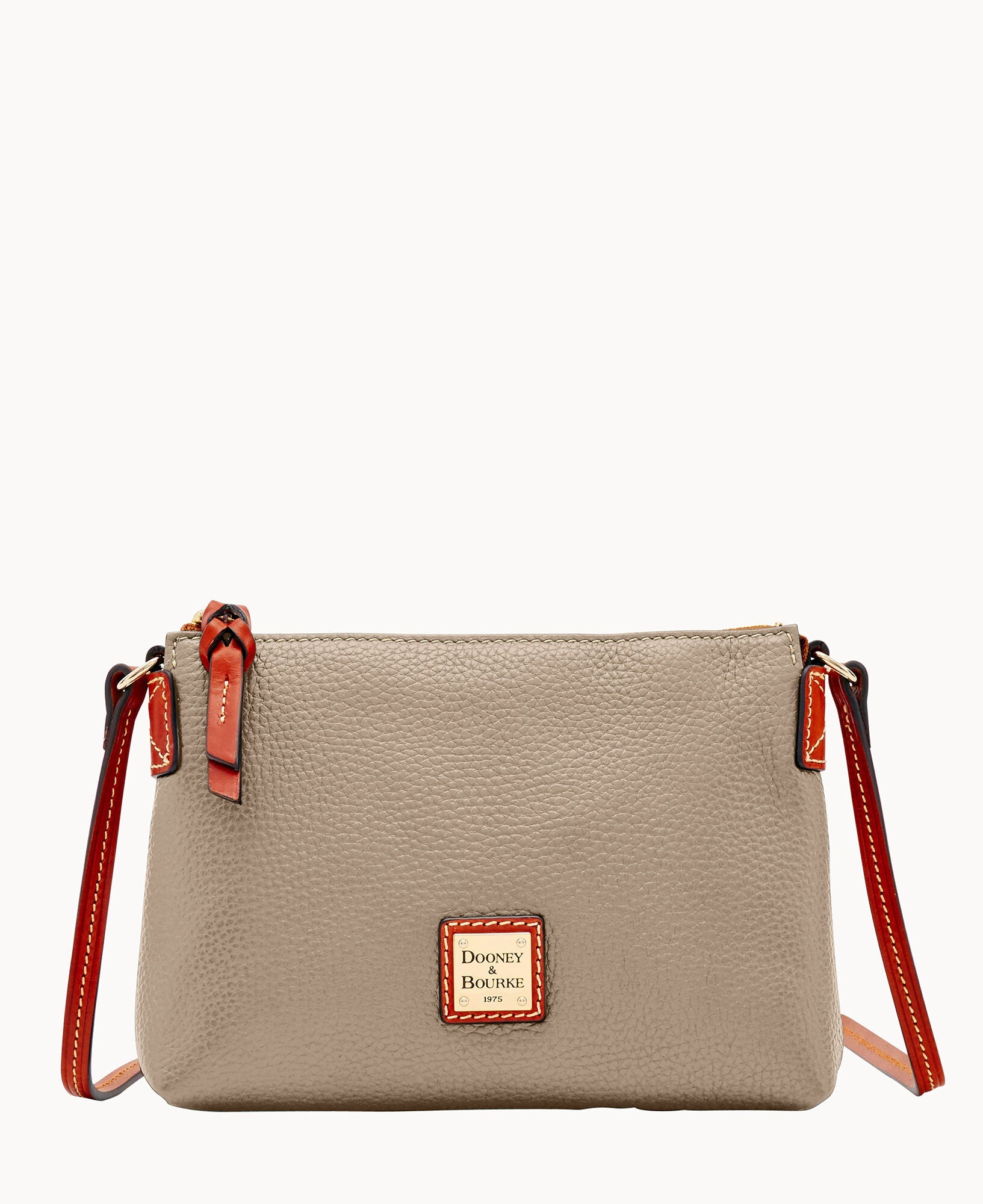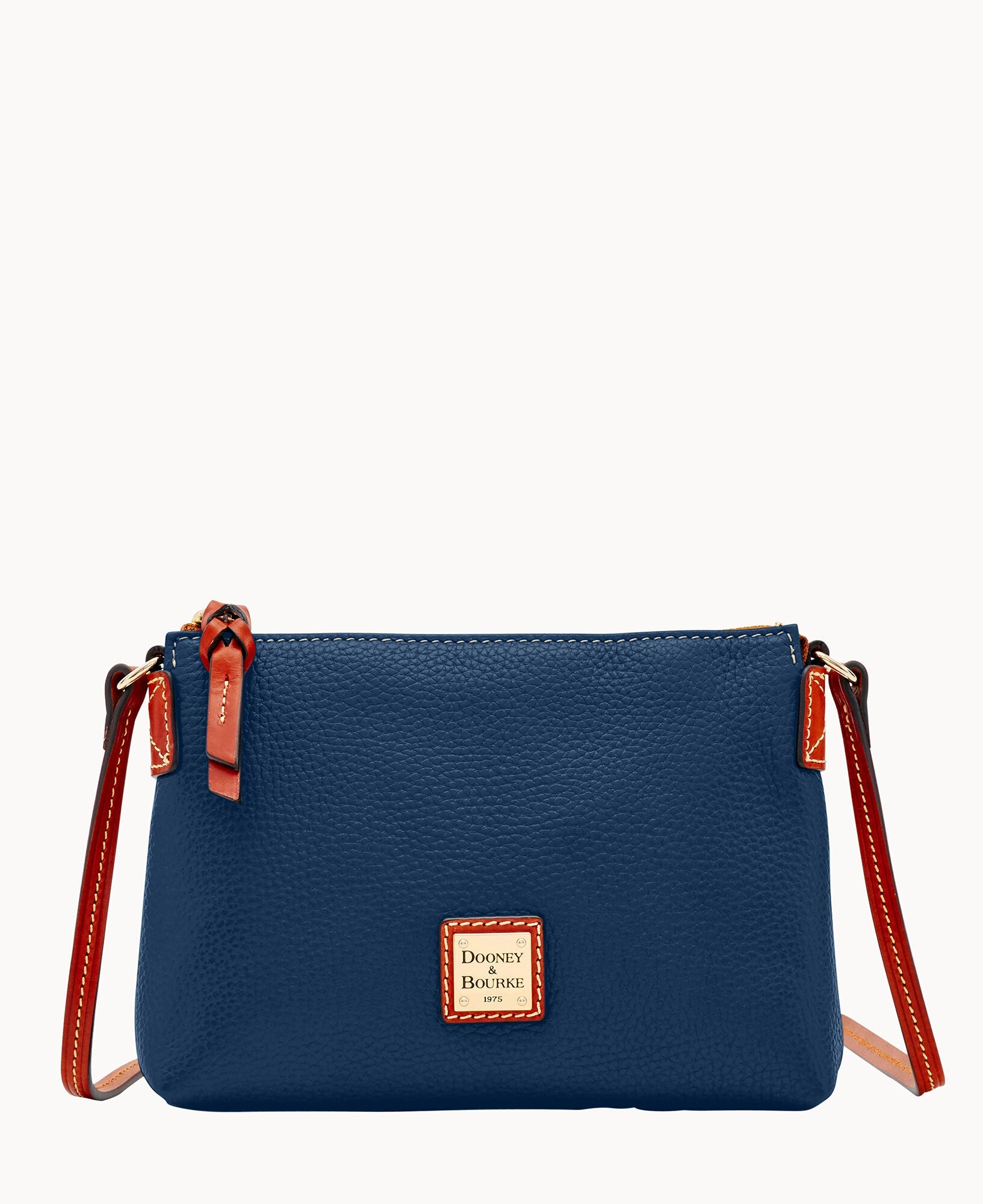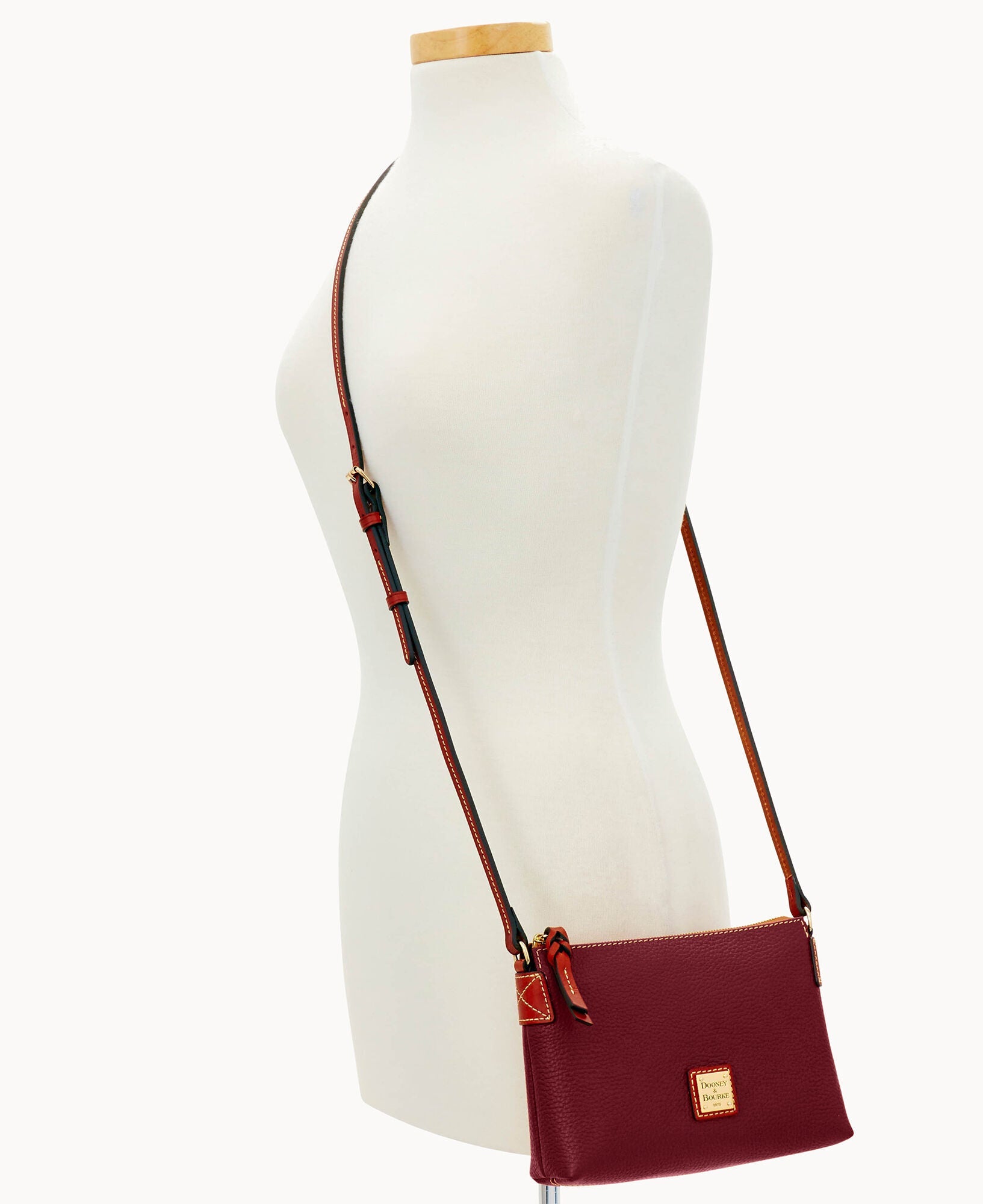 One inside zip pocket. Two inside pockets. Cell phone pocket. Adjustable shoulder strap. Strap drop length 25". Lined. Zipper closure.
