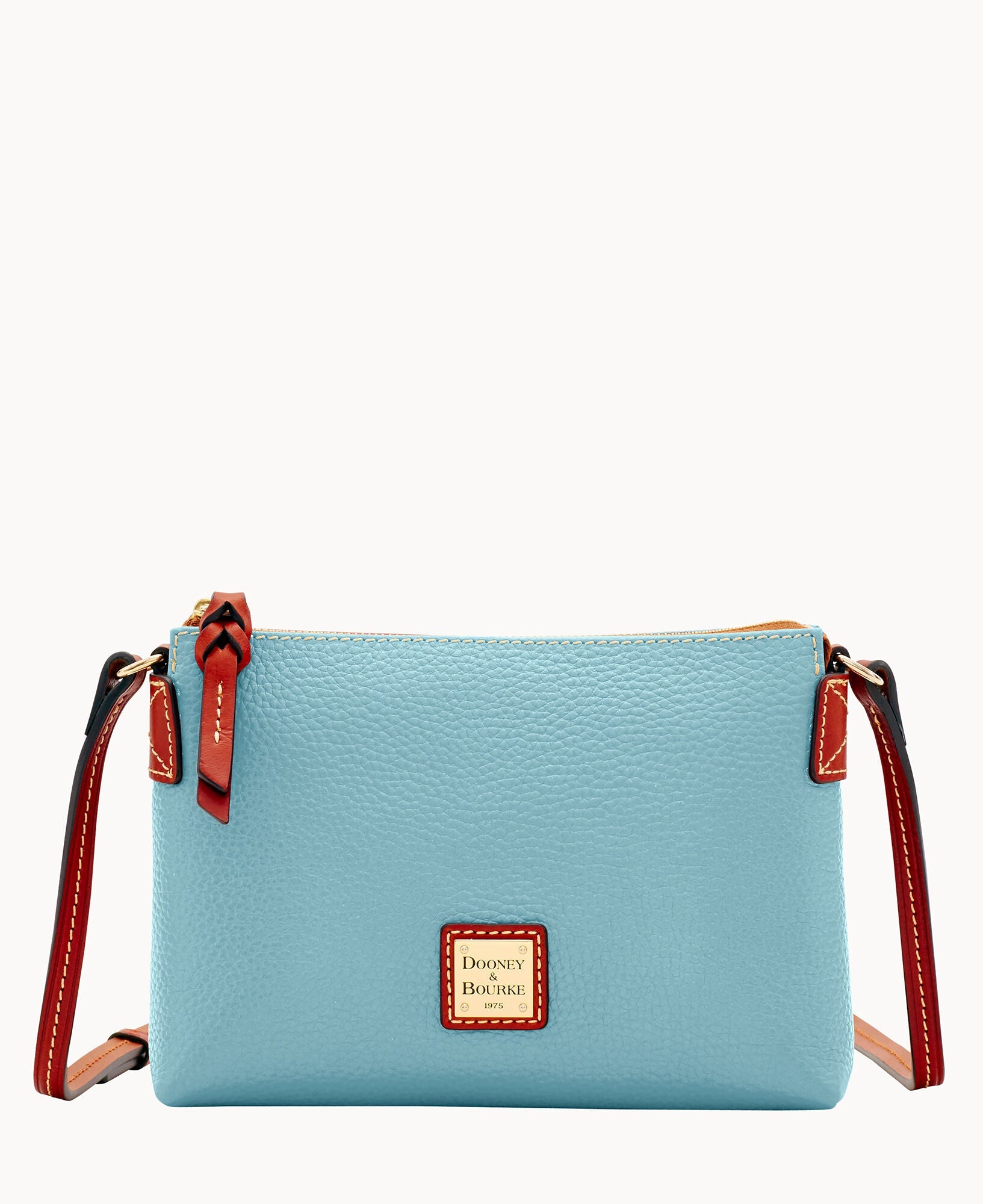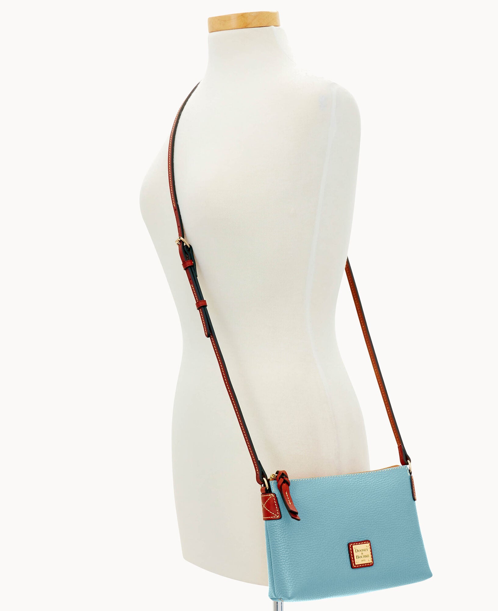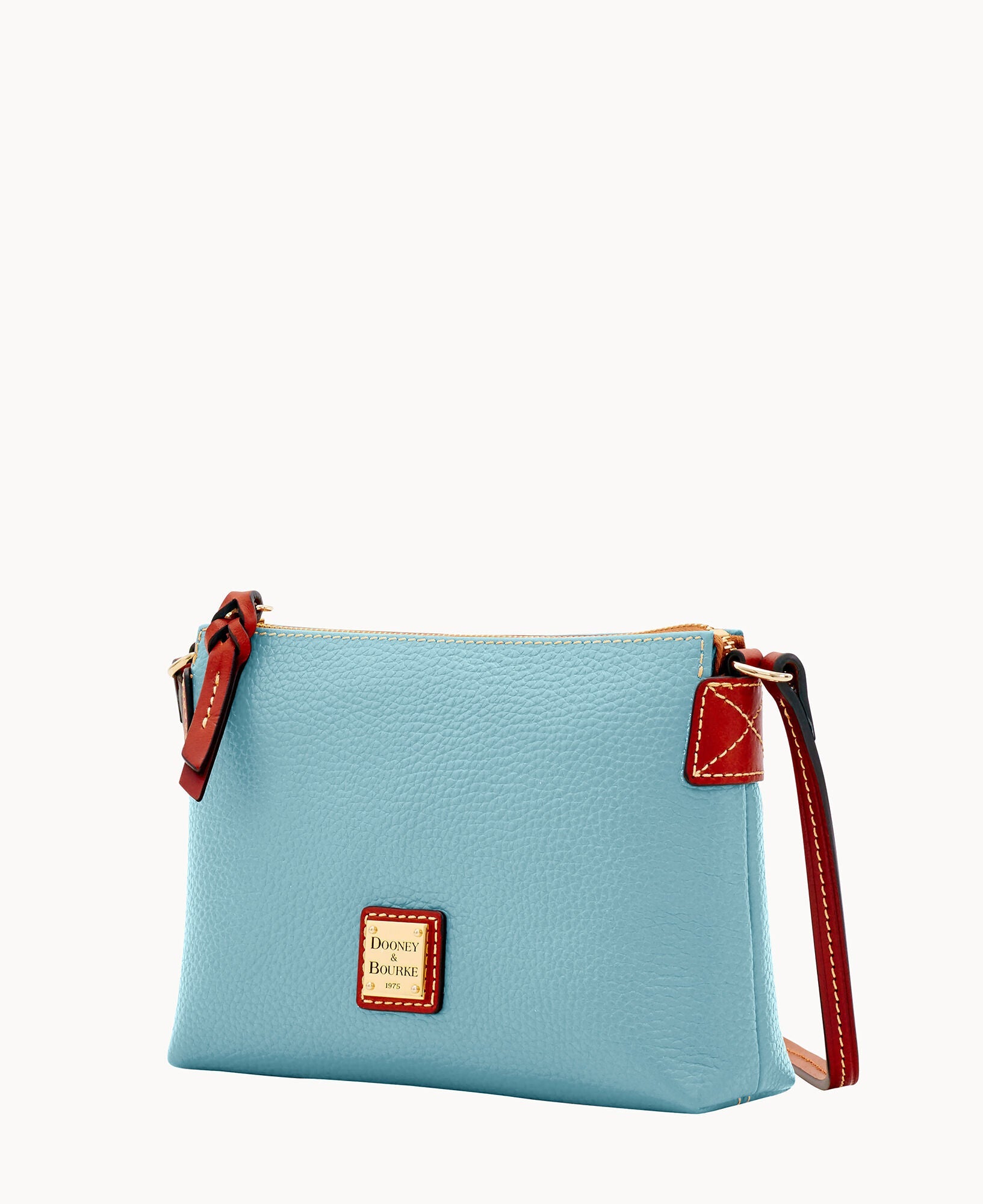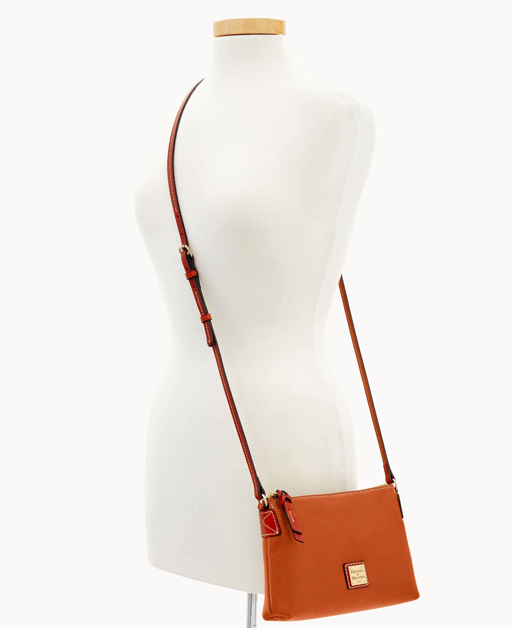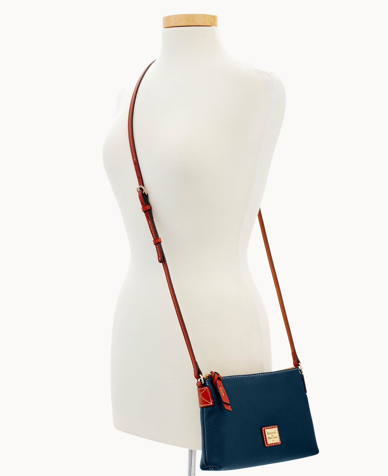 One inside zip pocket. Two inside pockets. Cell phone pocket. Adjustable shoulder strap. Strap drop length 25". Lined. Zipper closure.