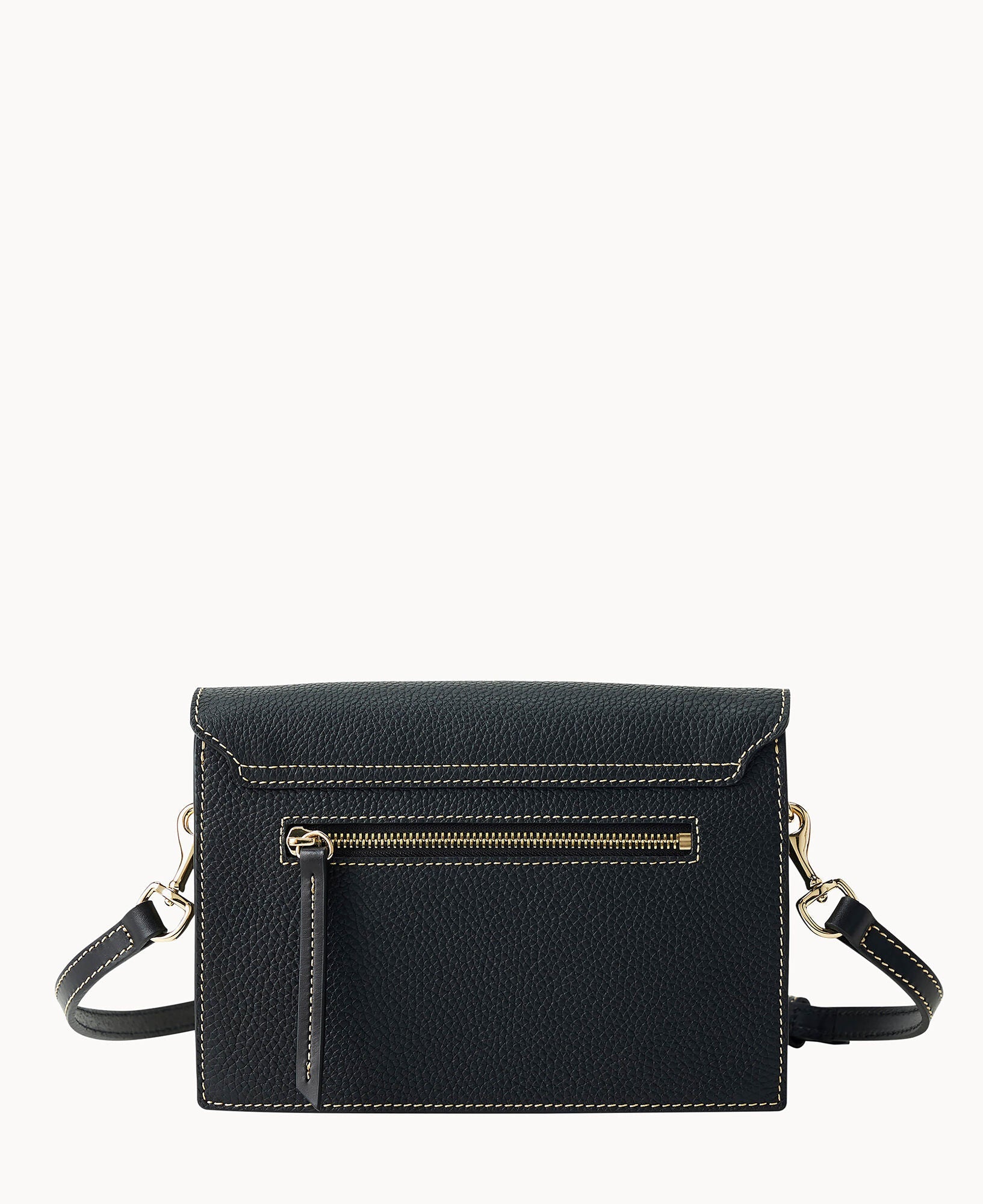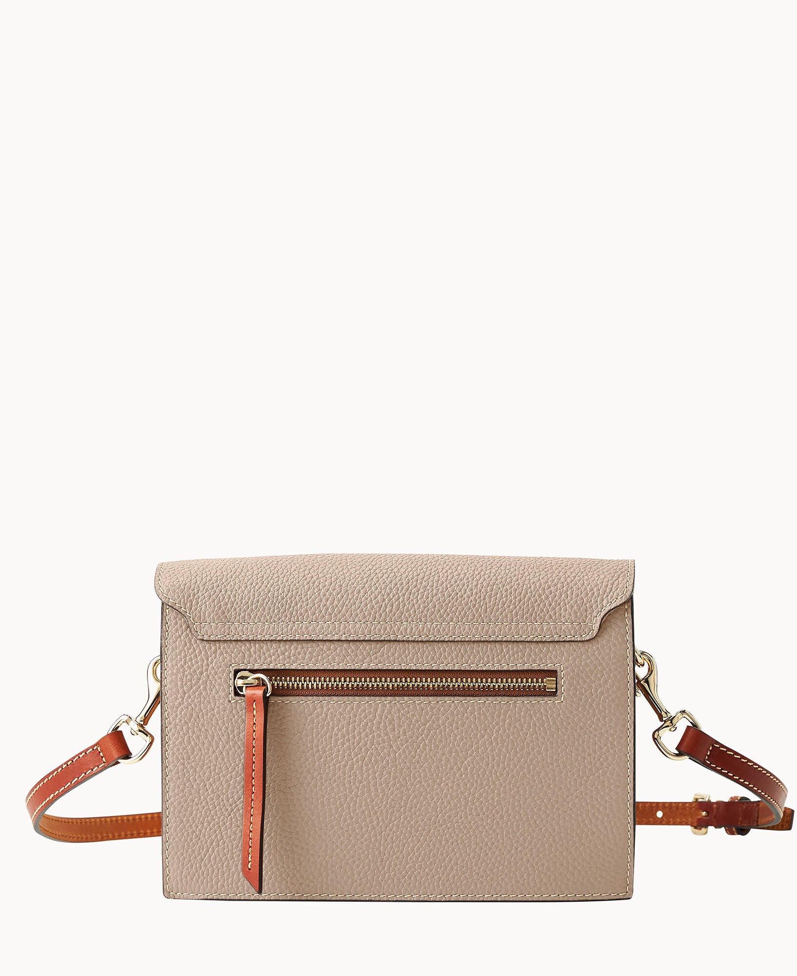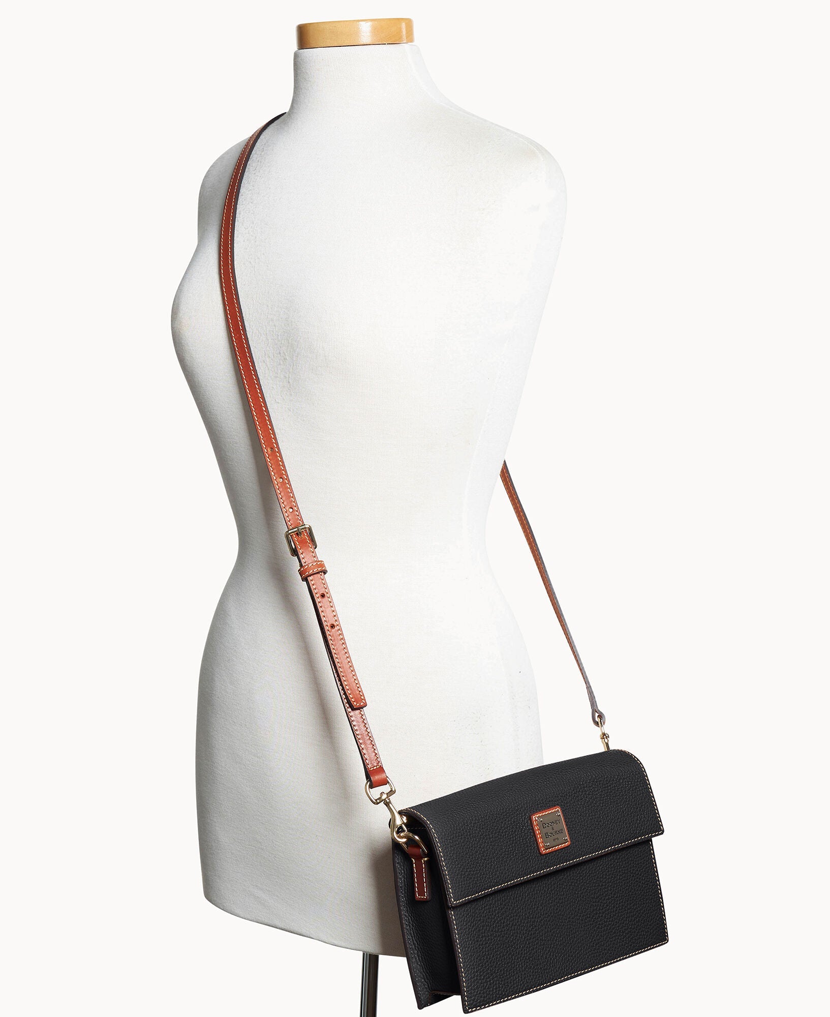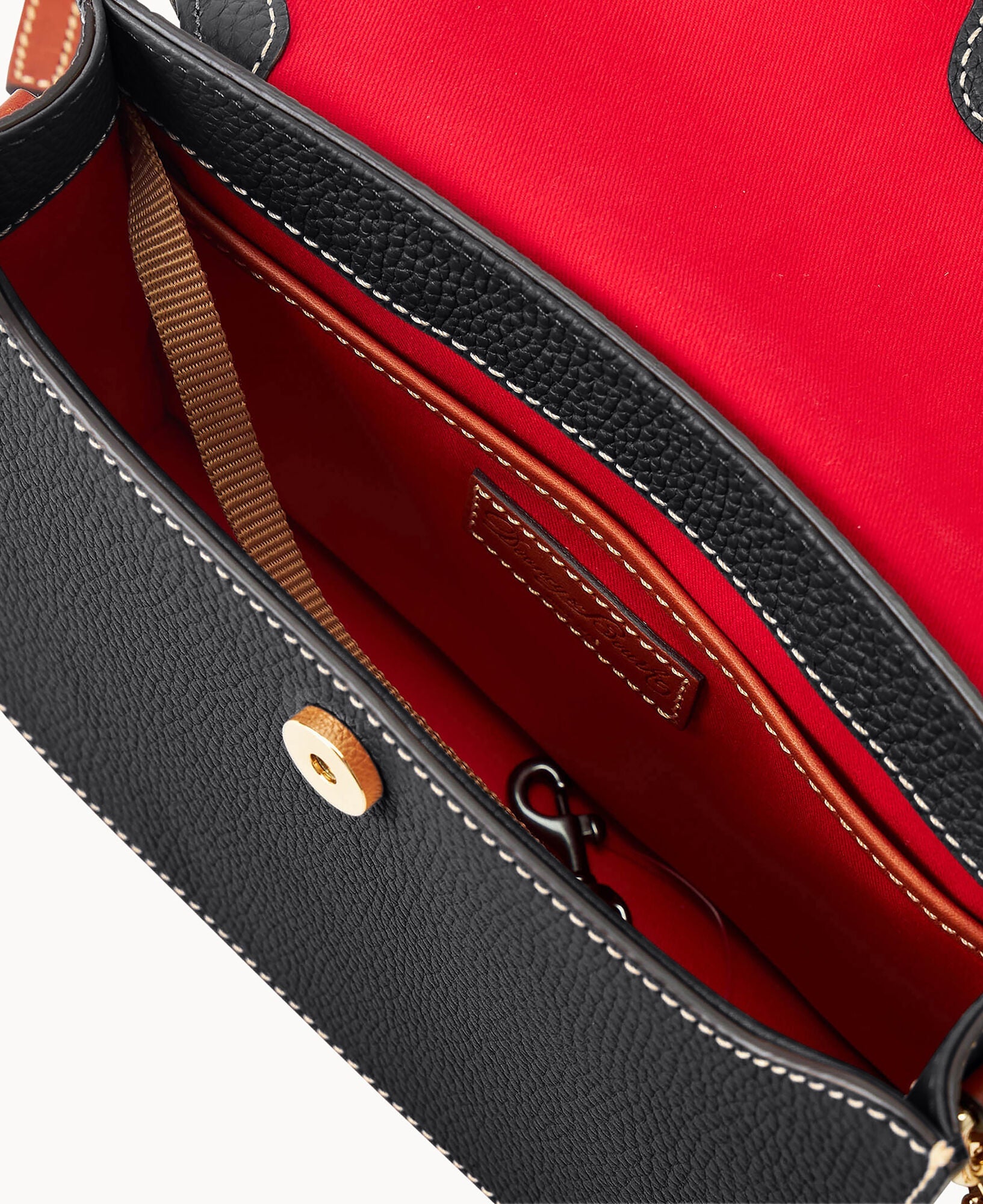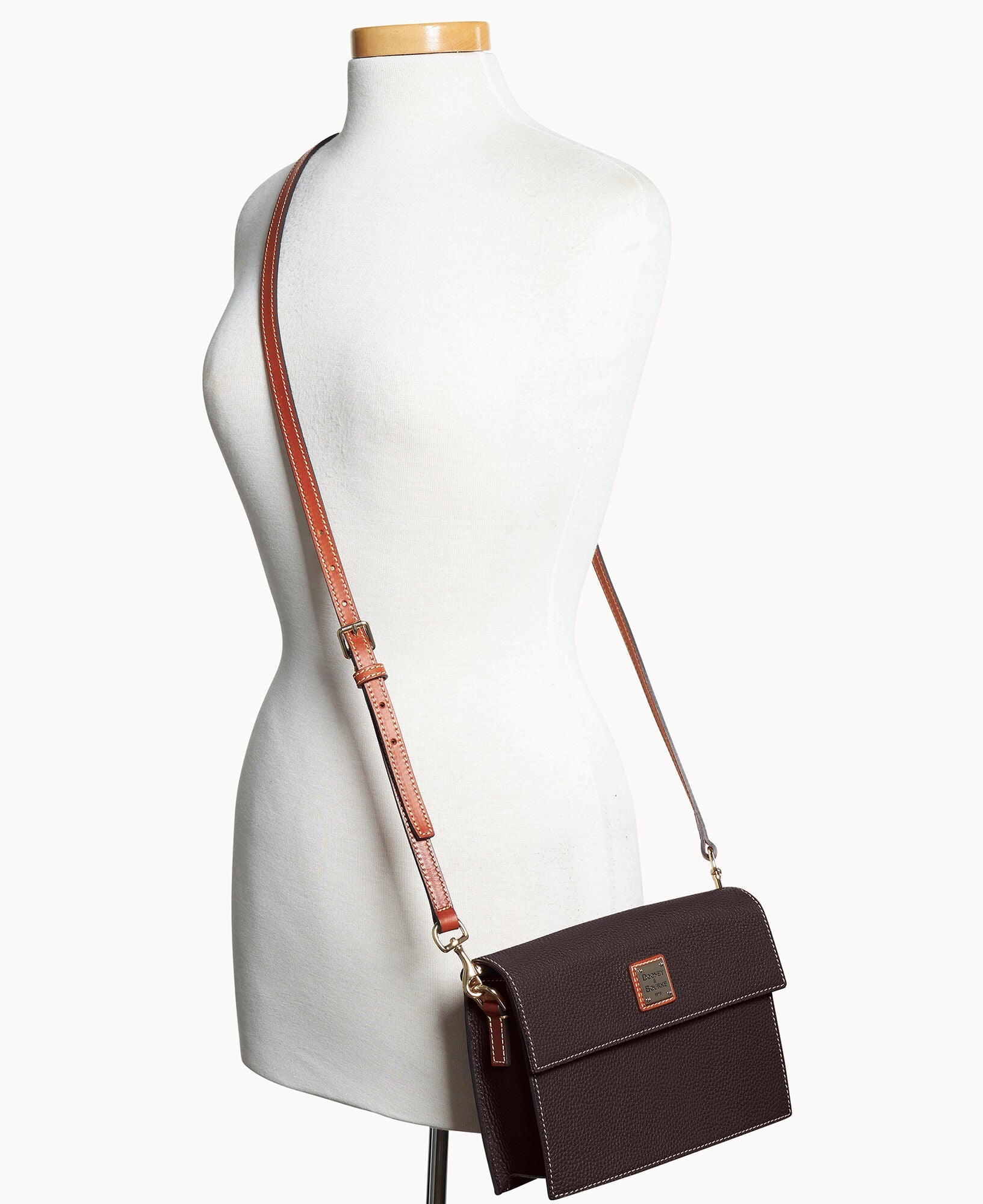 One outside zip pocket. One inside zip pocket. One inside pocket. Inside key hook. Adjustable, detachable shoulder strap. Strap drop length 26". Lined. Magnetic snap flap closure.