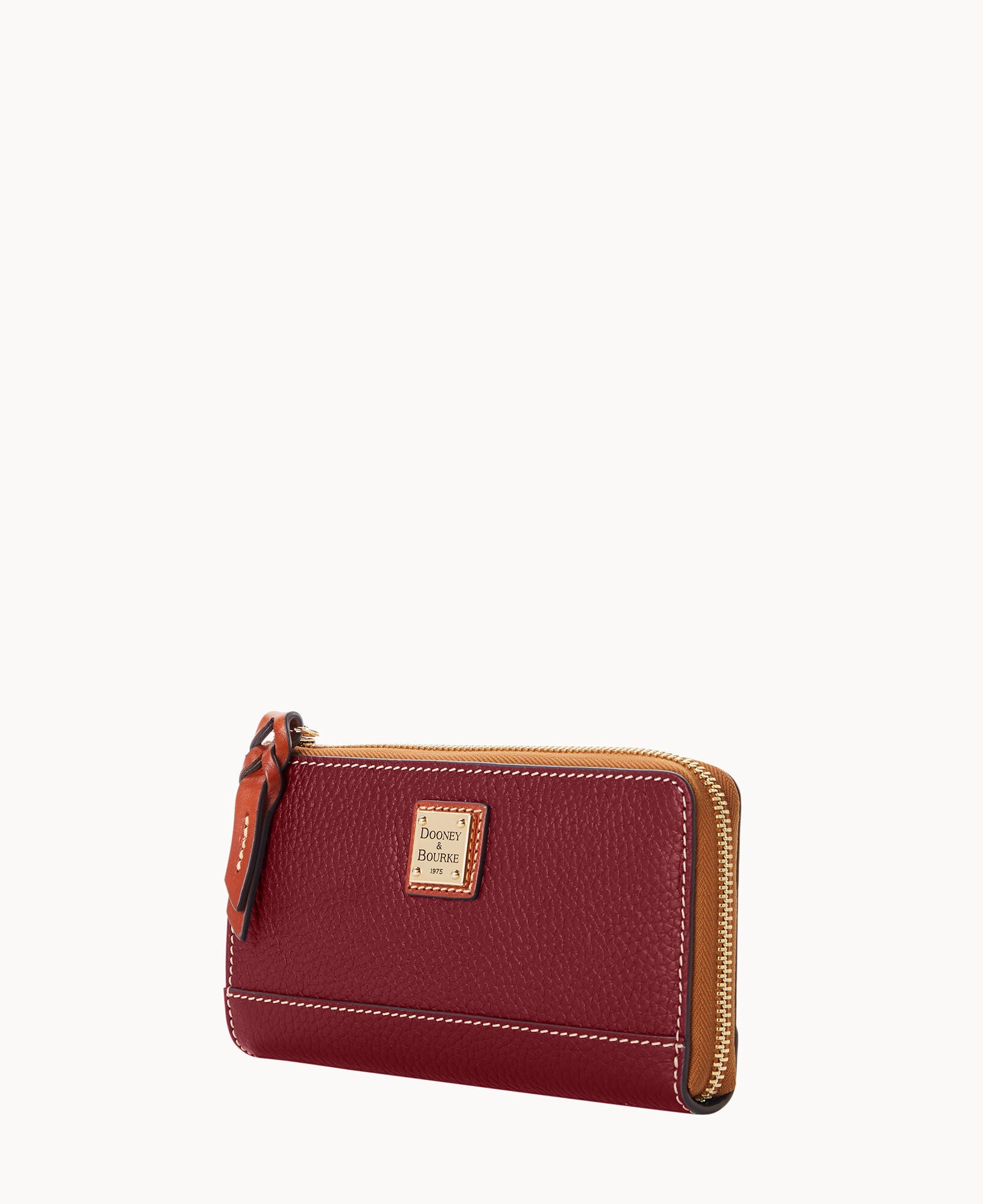 One inside zip pocket. Two inside compartments. Three credit card slots. Detachable wrist strap. Lined. Zipper closure.