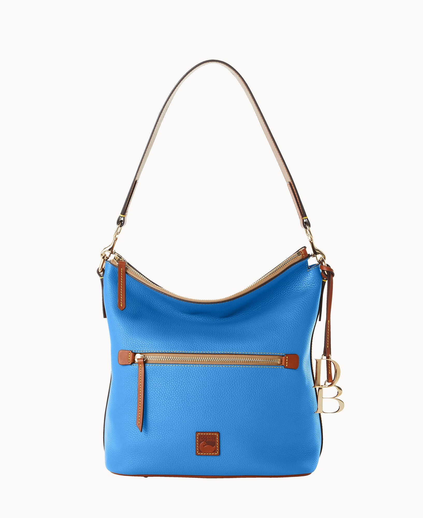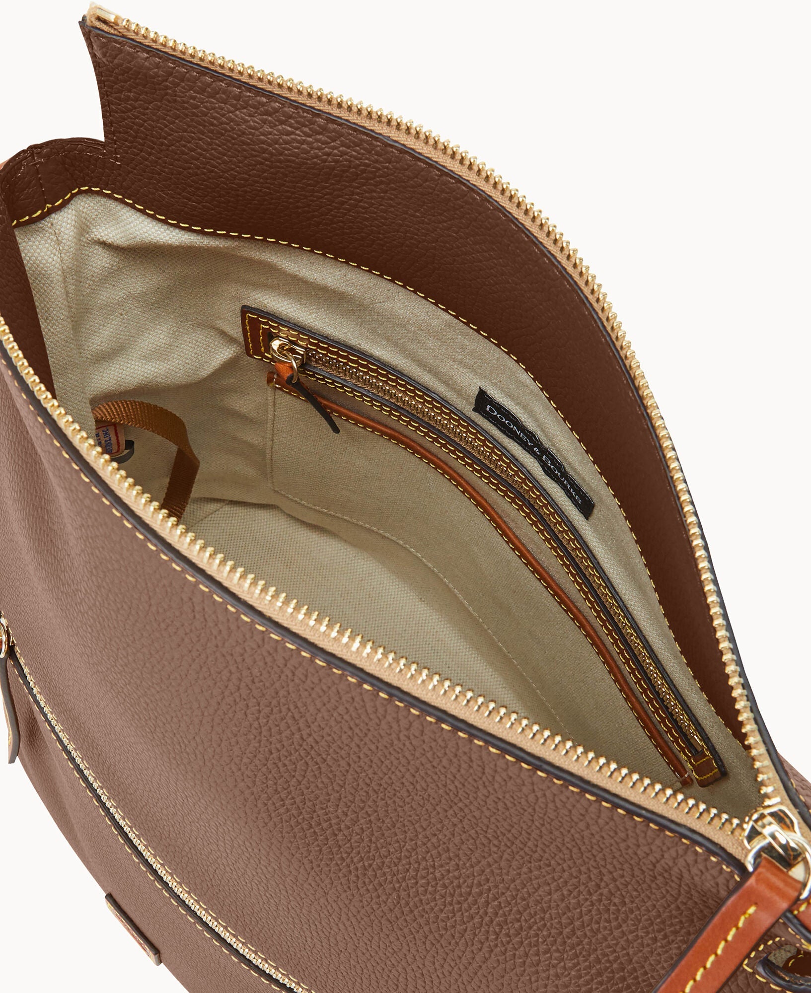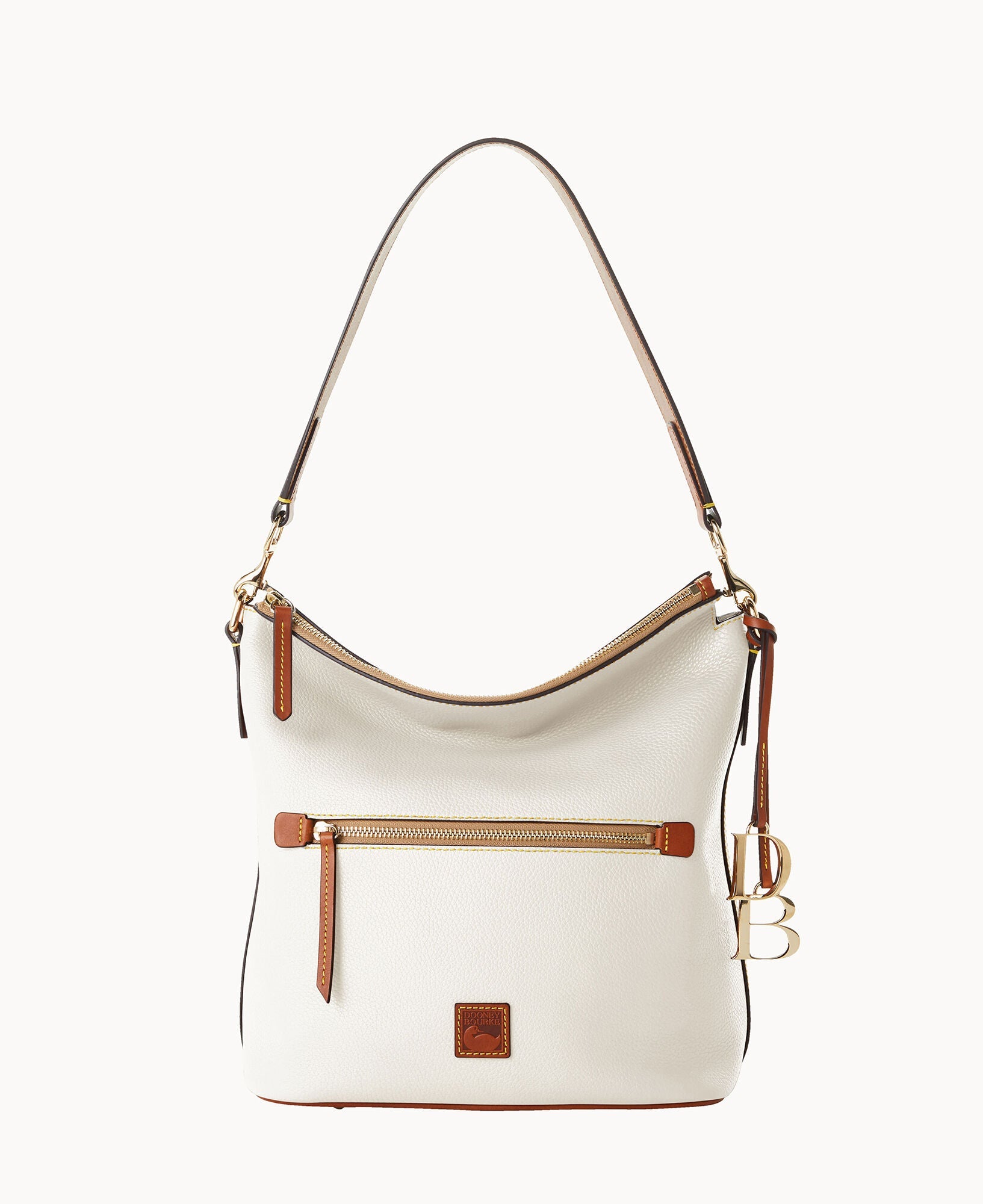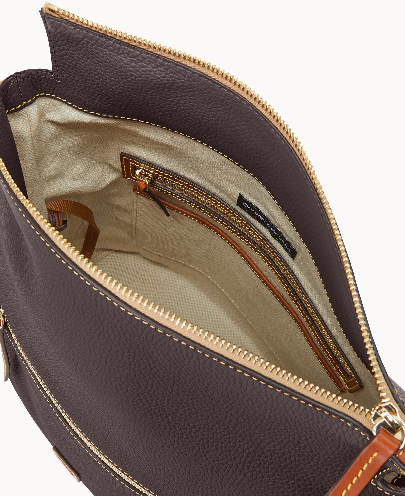 One outside zip pocket. One inside zip pocket. Two inside pockets. Cell phone pocket. Inside key hook. Handle length 13". Lined. Zipper closure. Removable DB medallion.