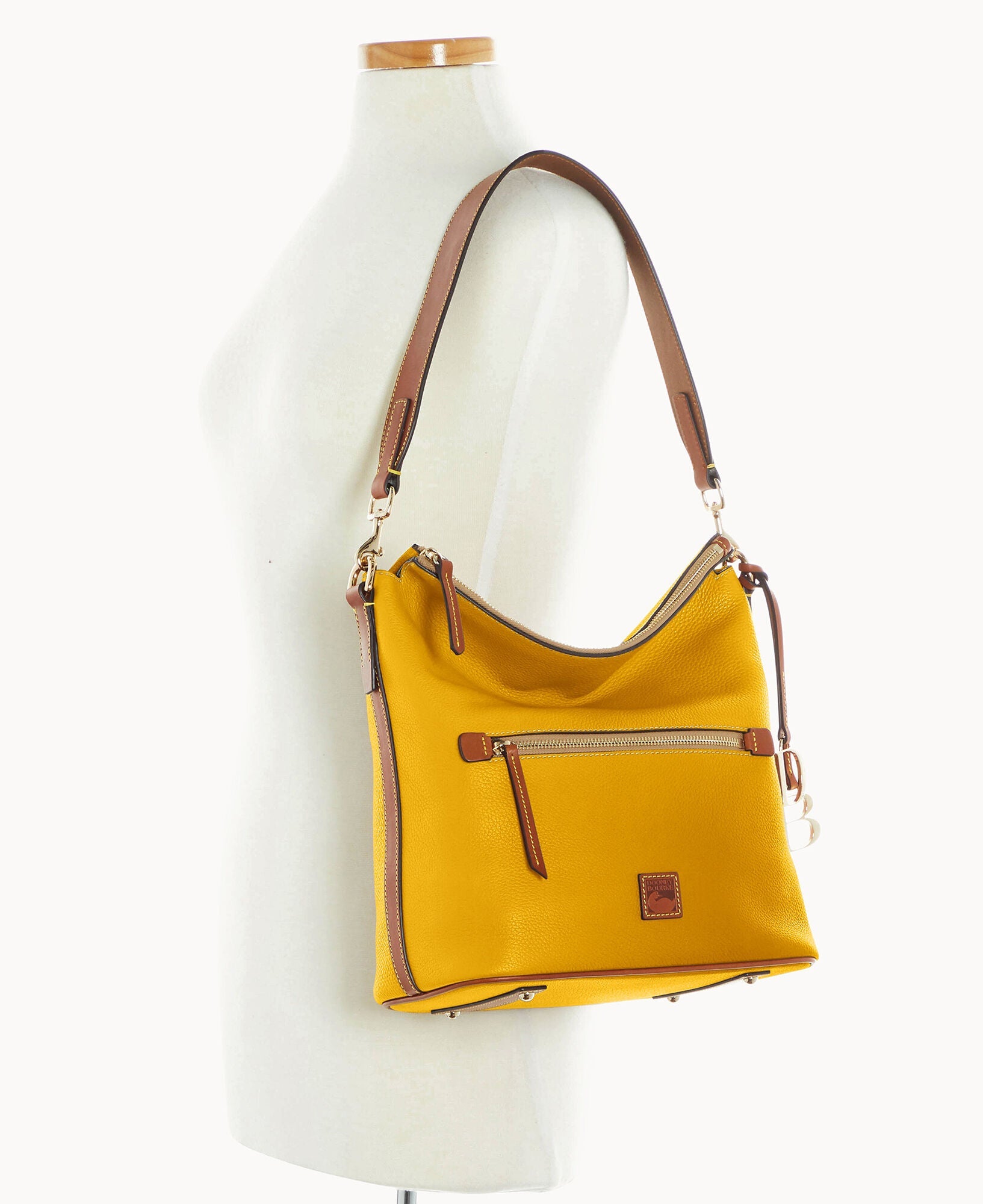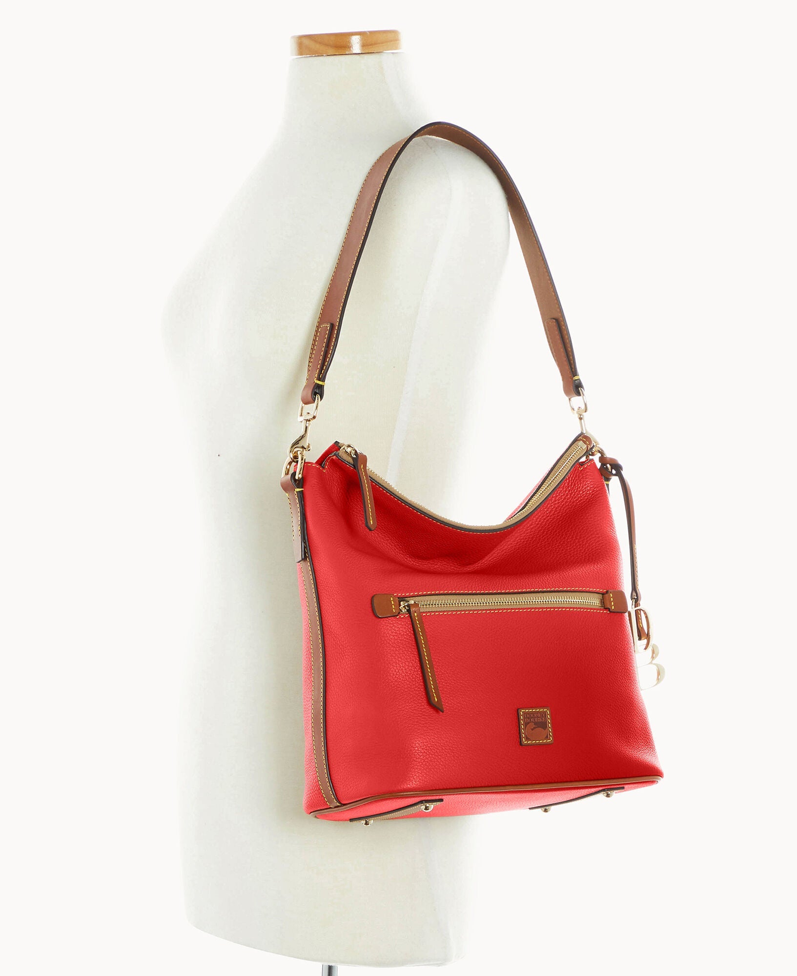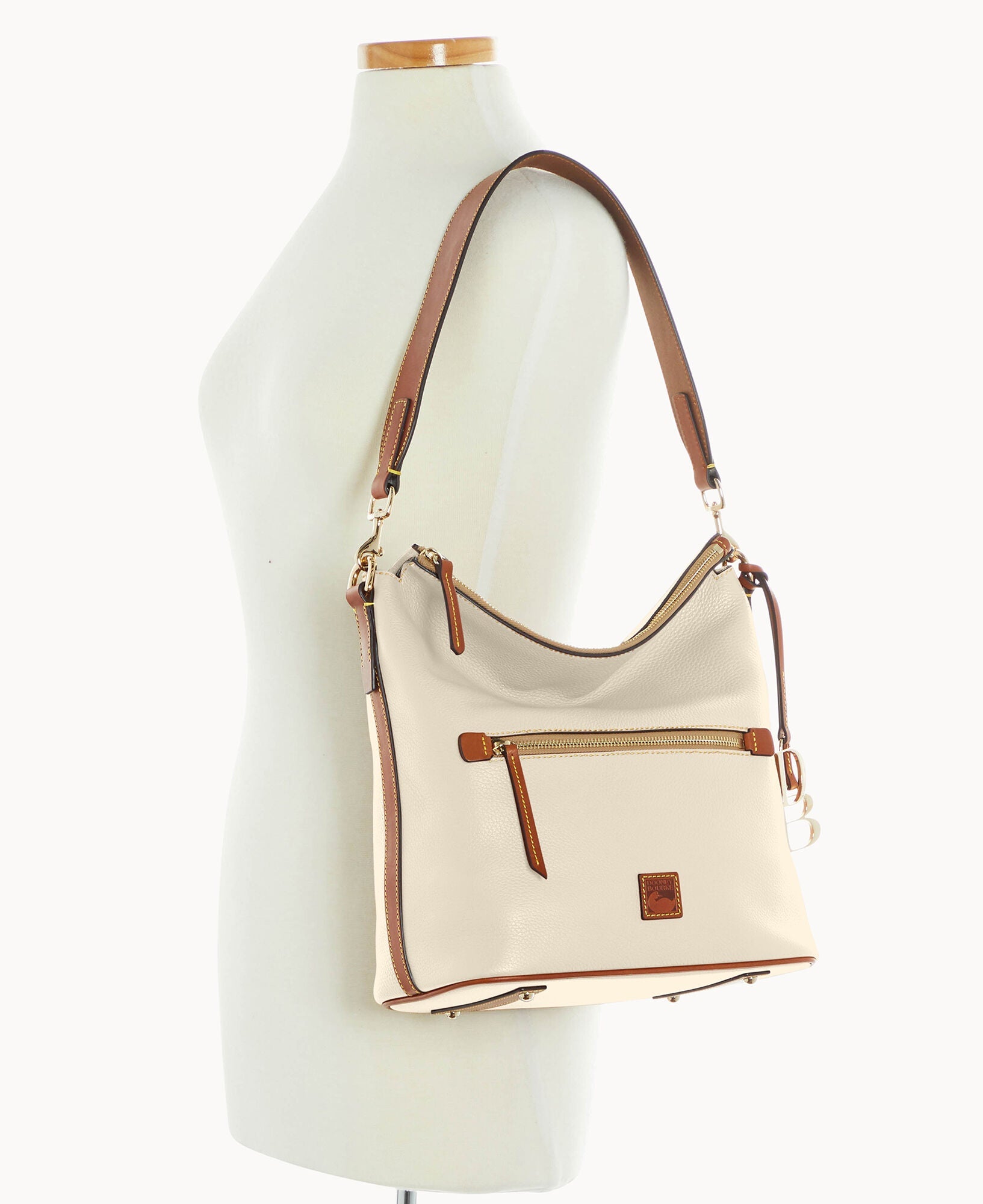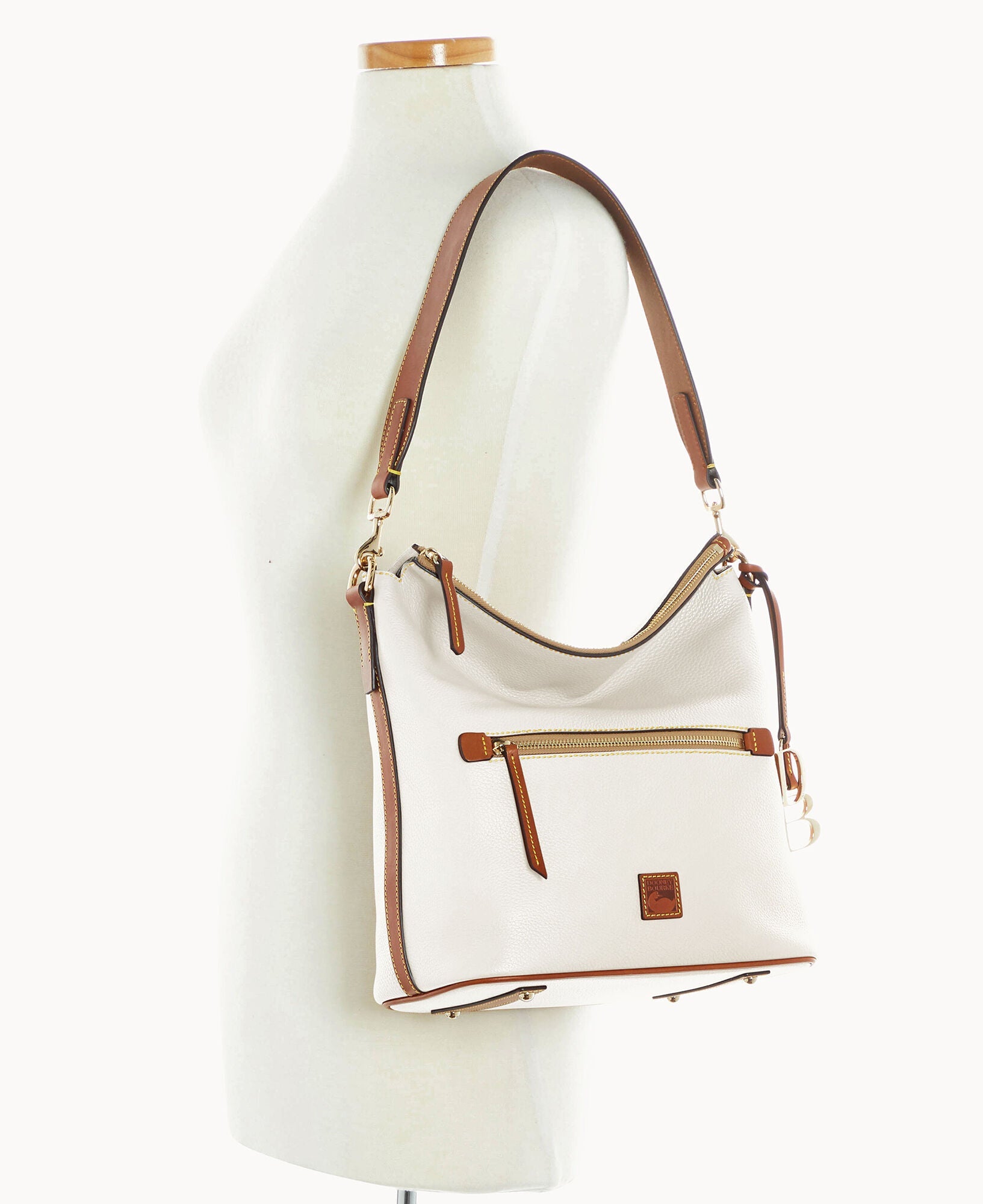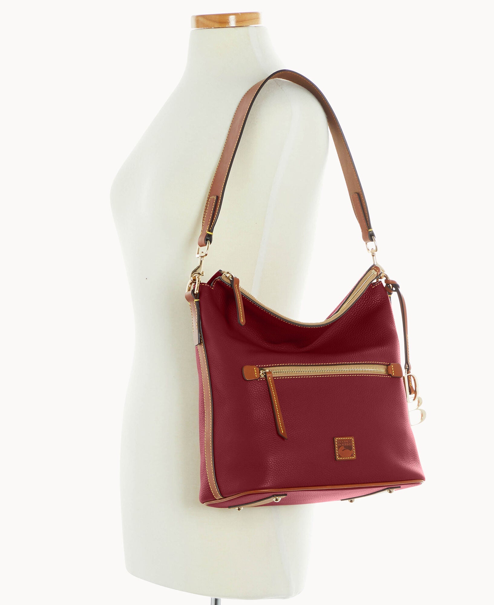 One outside zip pocket. One inside zip pocket. Two inside pockets. Cell phone pocket. Inside key hook. Handle length 13". Lined. Zipper closure. Removable DB medallion.