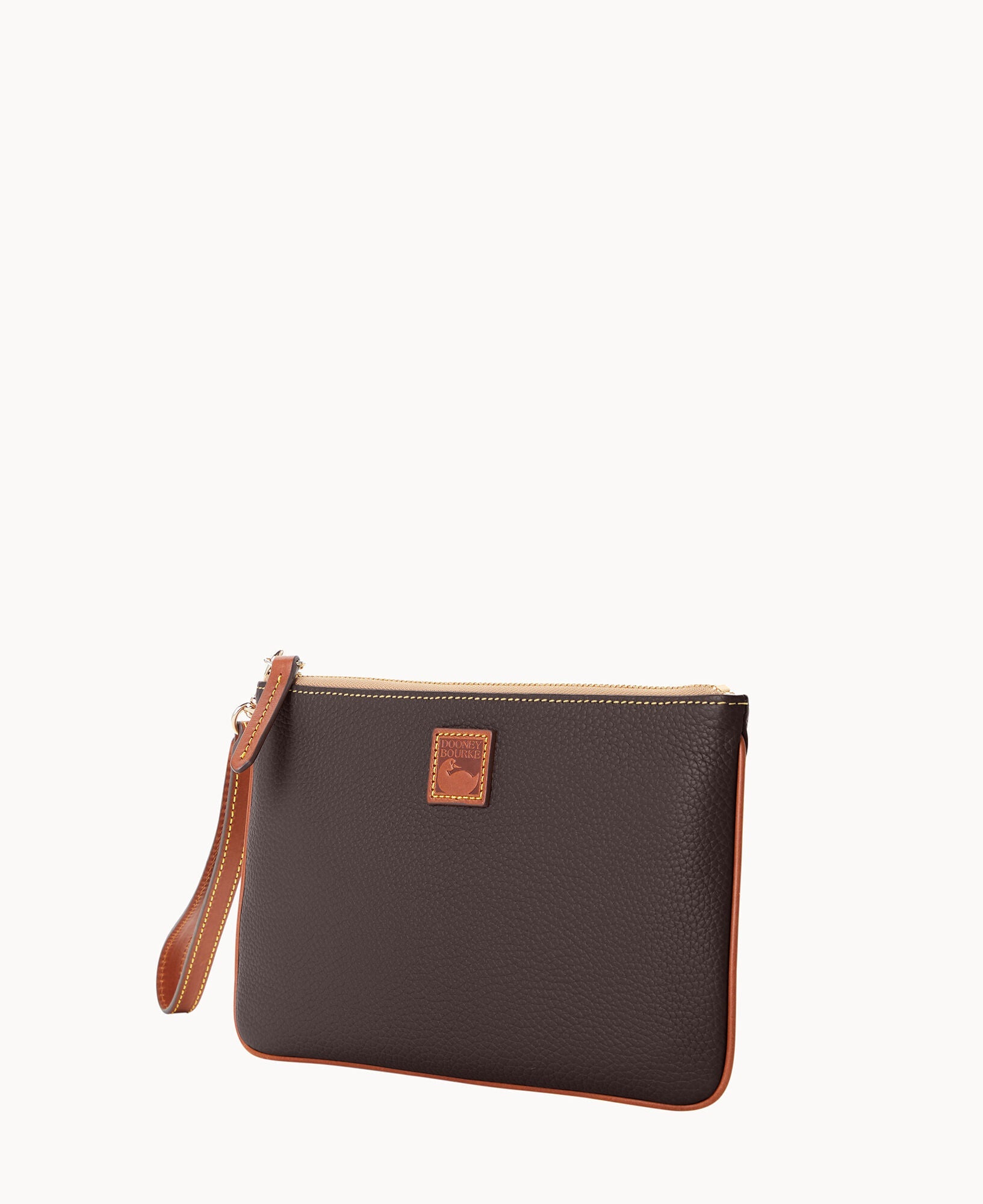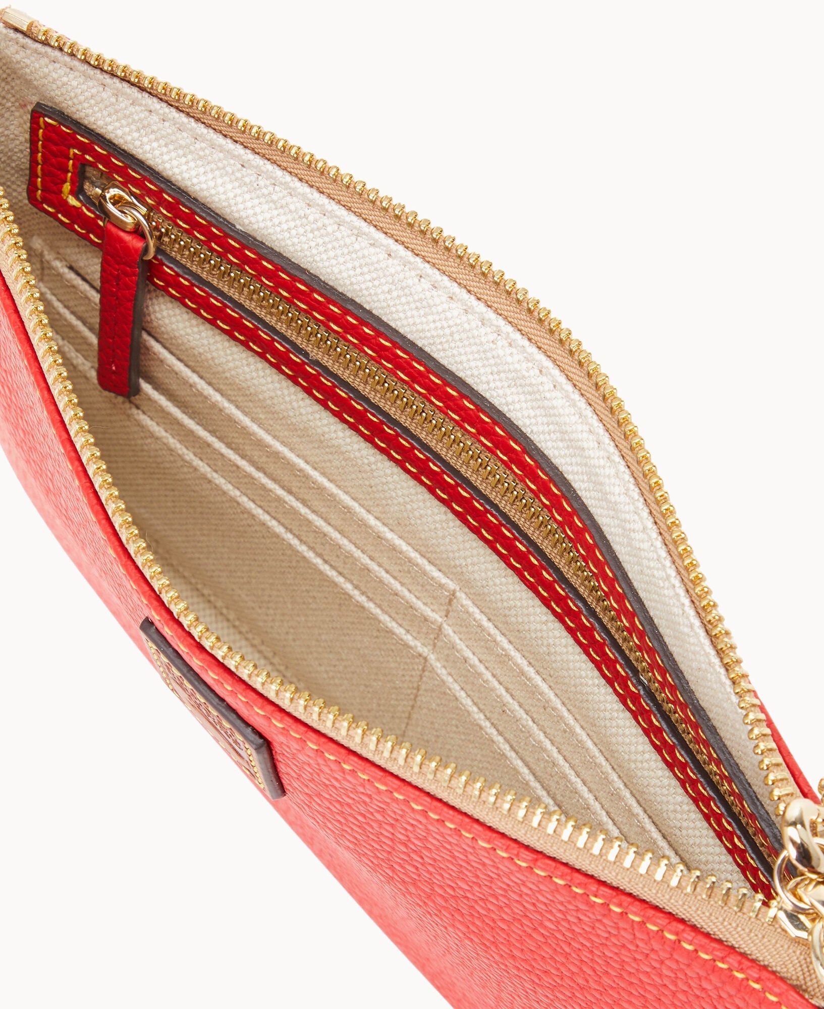 One inside zip pocket. One inside pocket. Six credit card slots. Detachable wrist strap. Lined. Zipper closure.