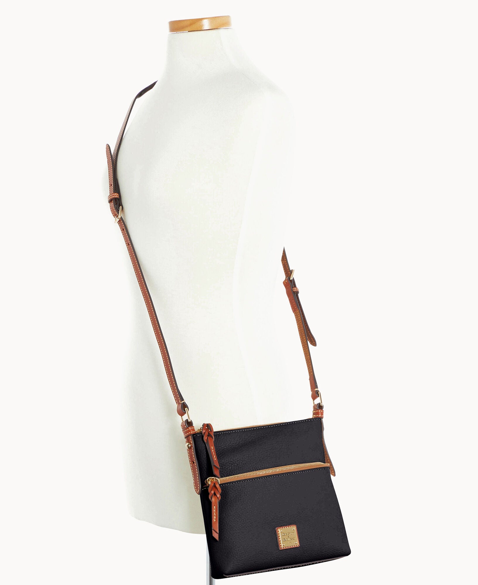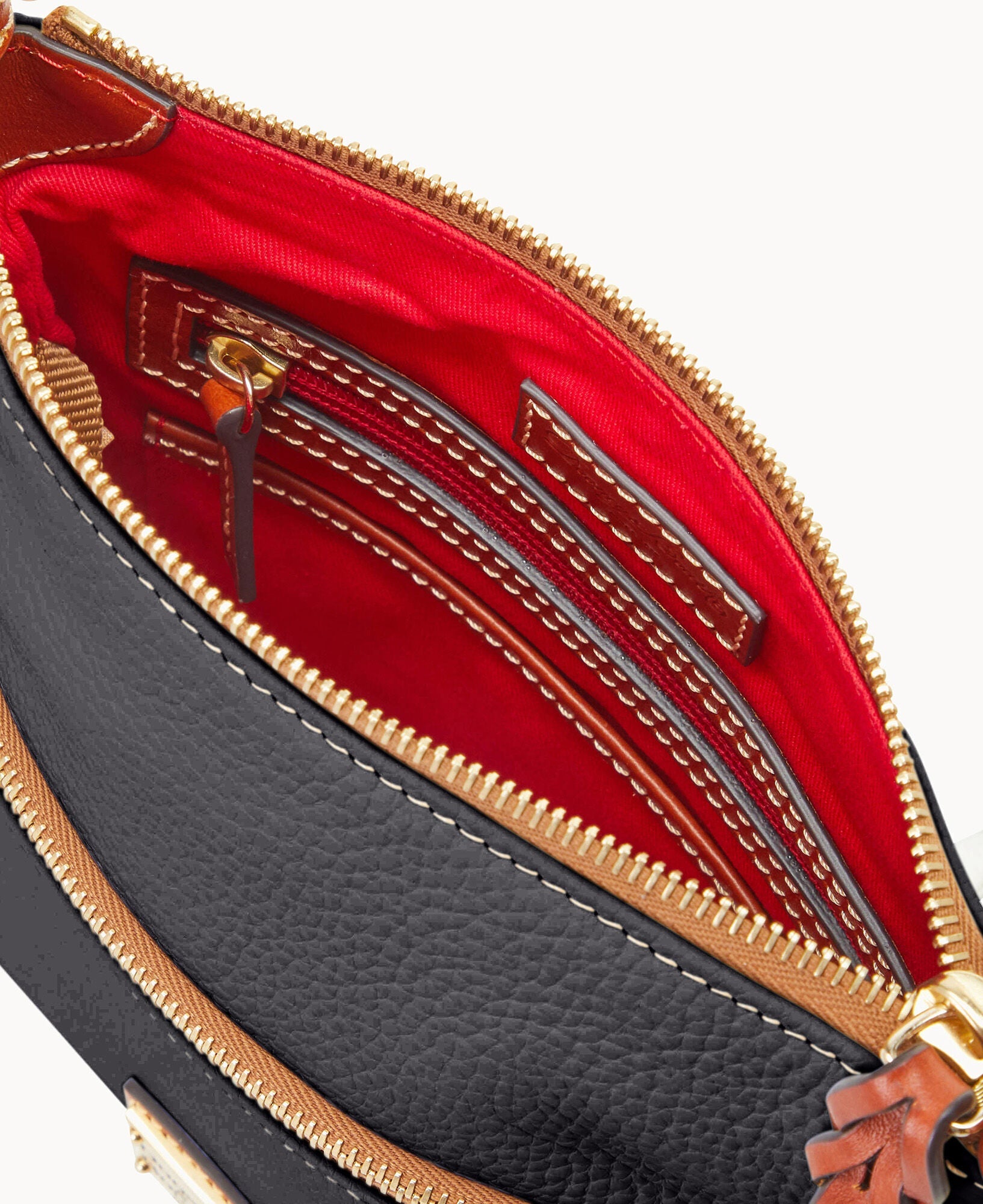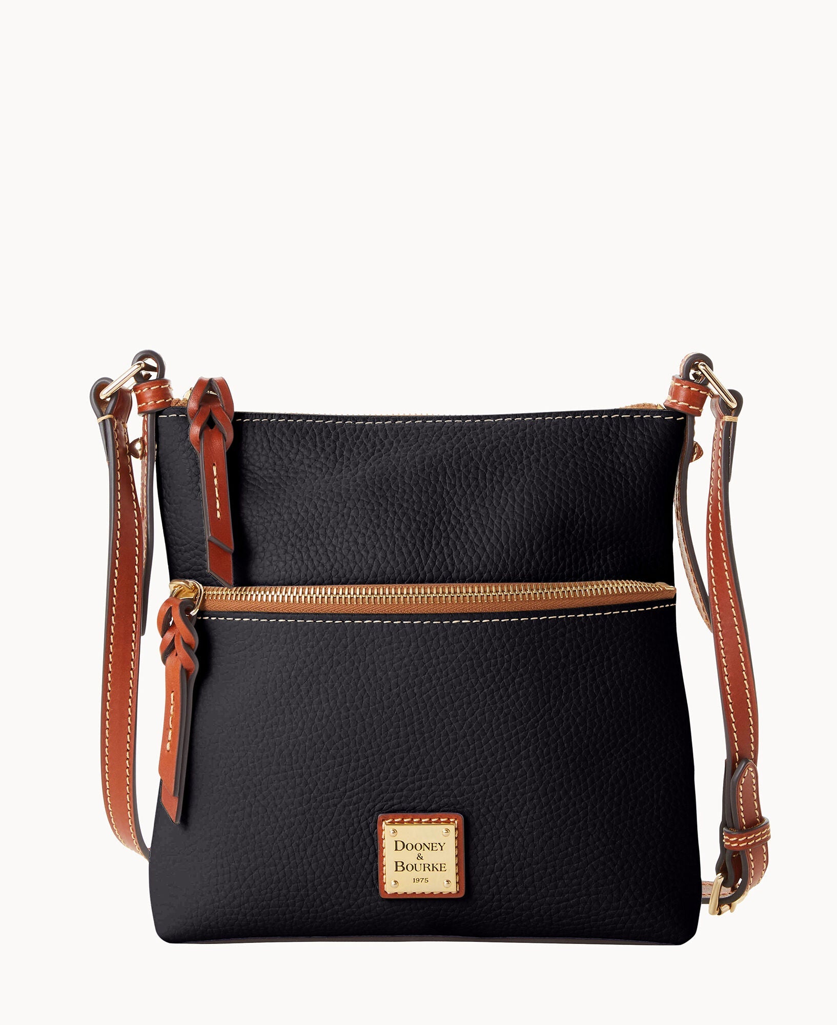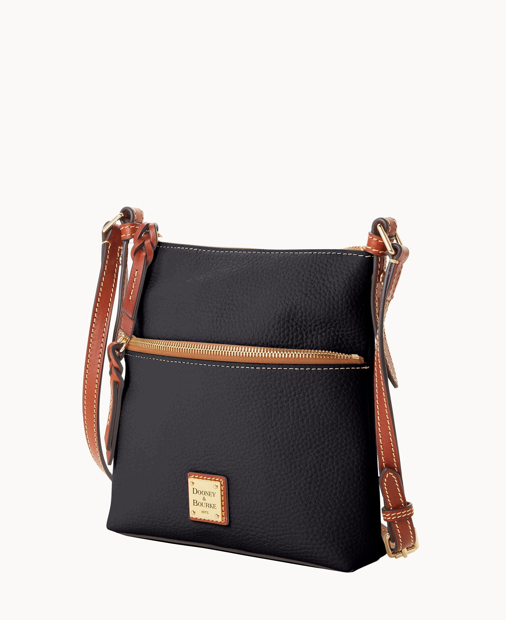 One outside zip pocket. One inside zip pocket. Two inside pockets. Cell phone pocket. Inside key hook. Adjustable shoulder strap. Strap drop length 26". Lined. Feet. Zipper closure.