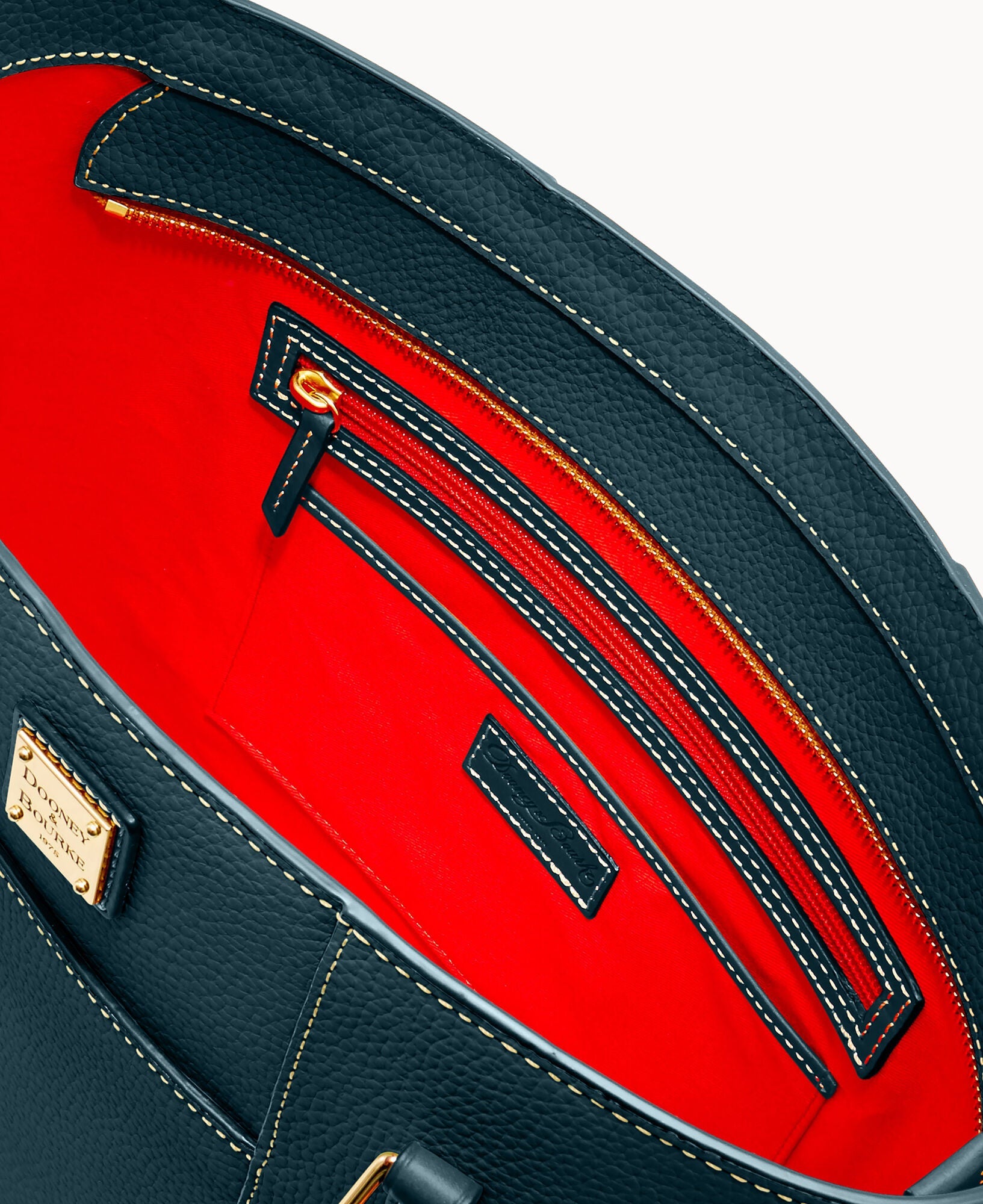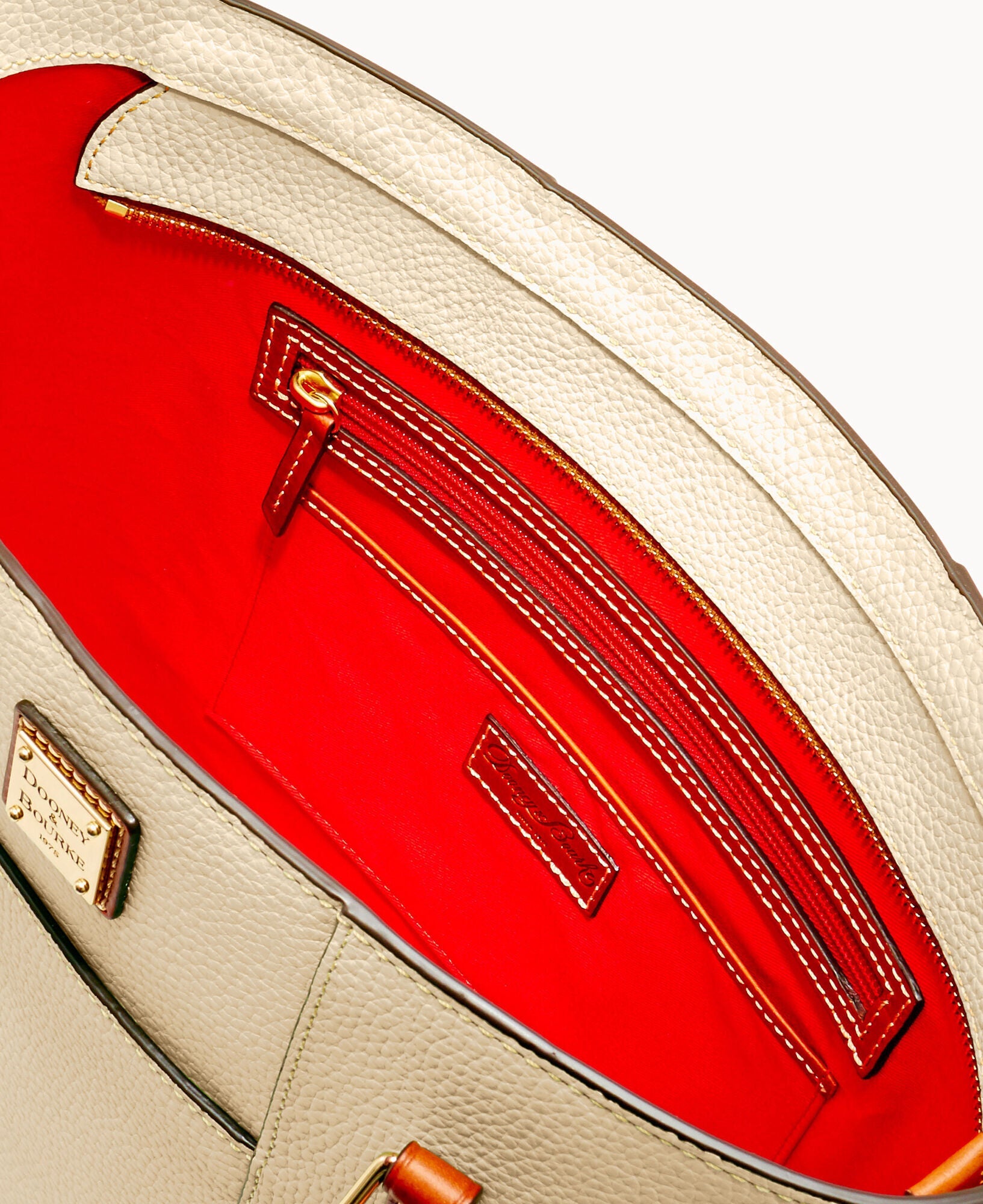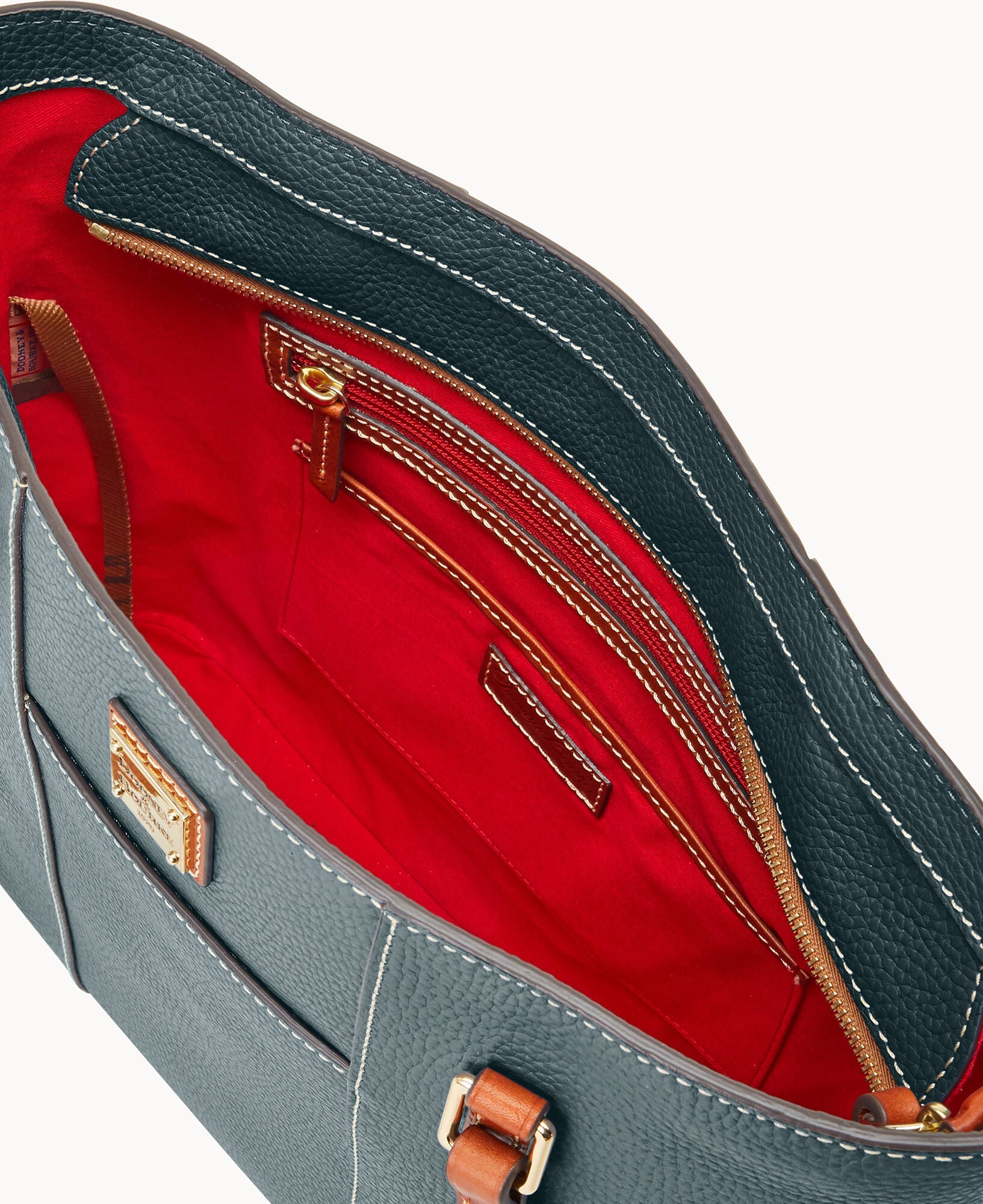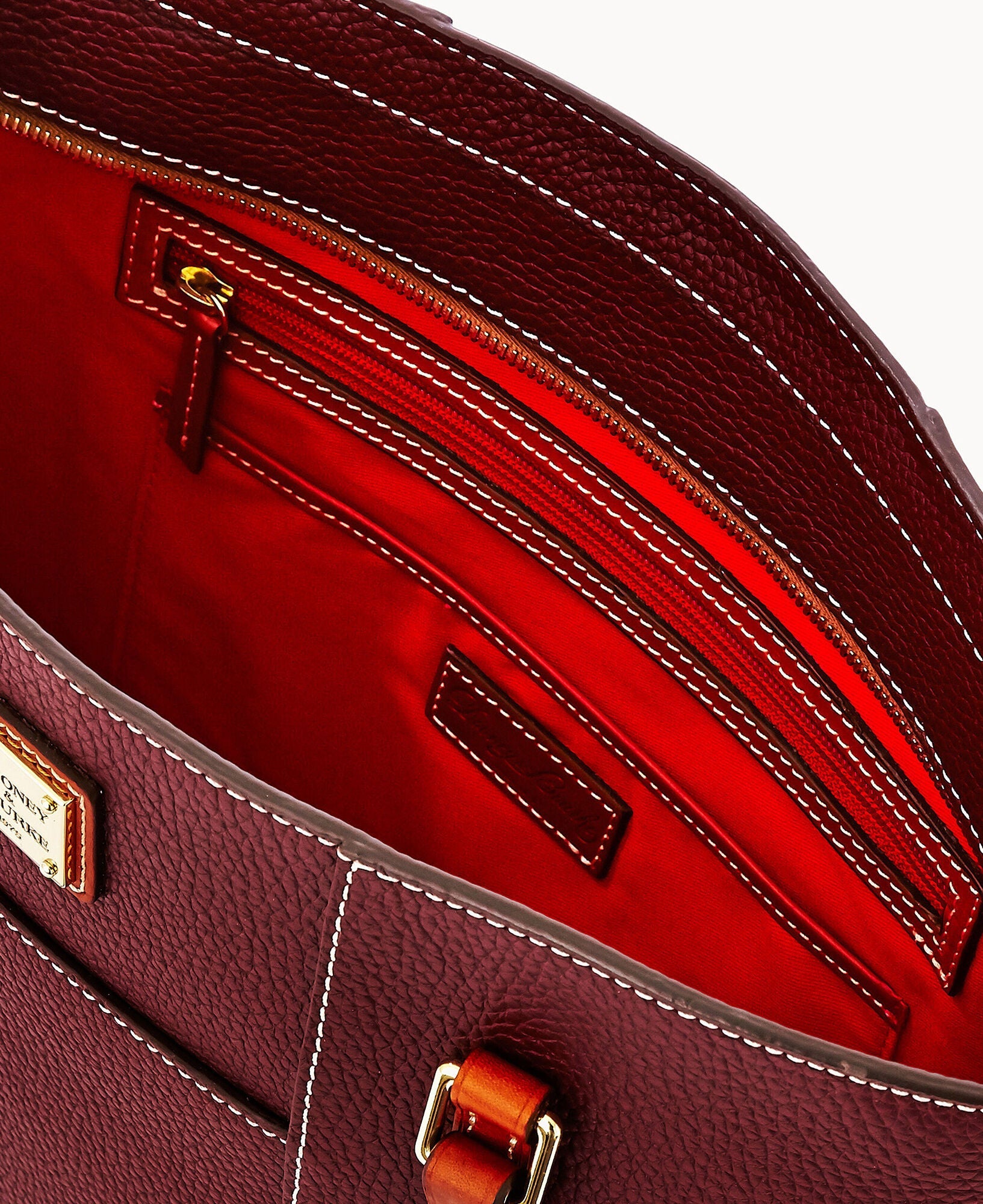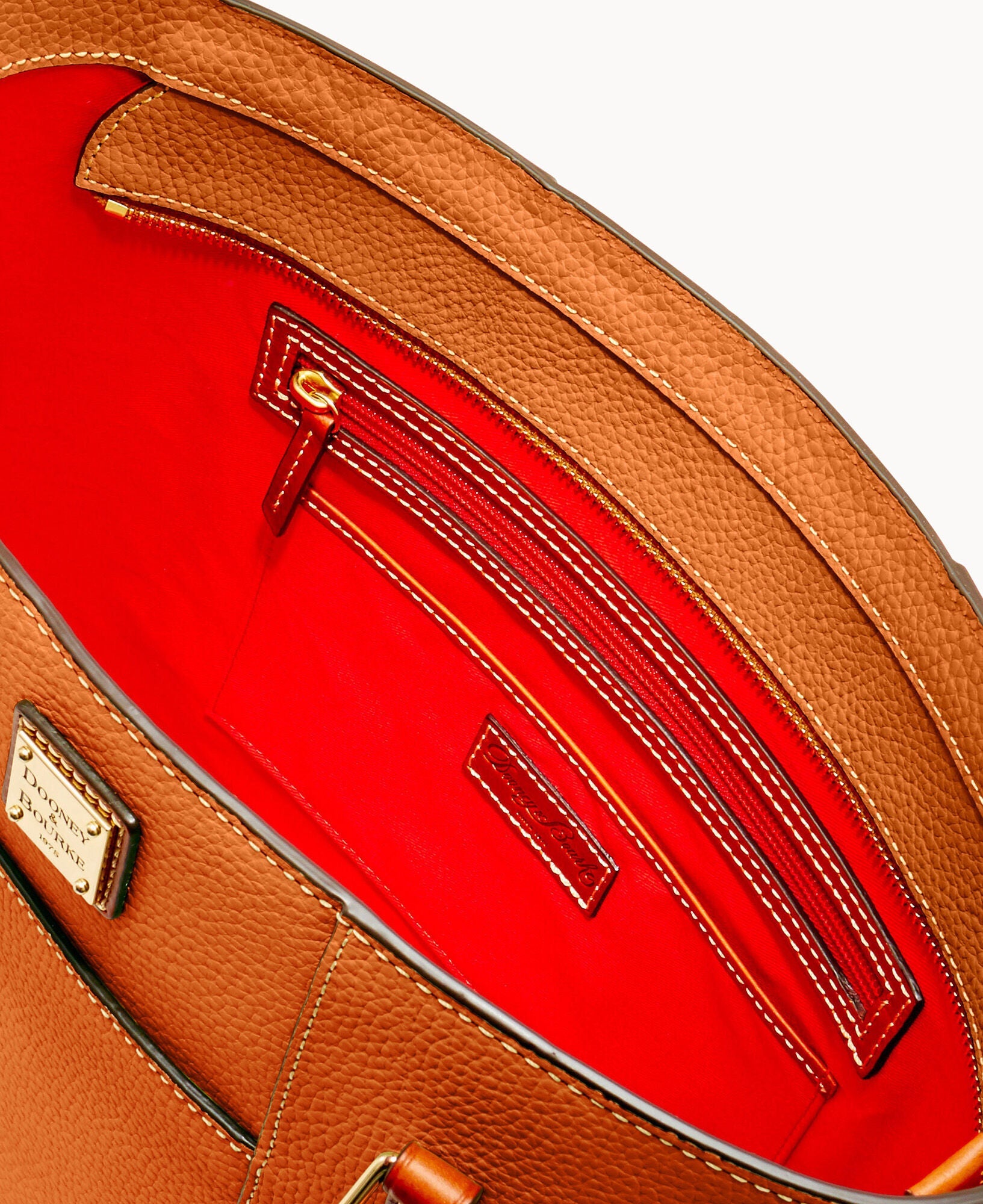 Outside front and back pockets. One inside zip pocket. Two inside pockets. Cell phone pocket. Inside key hook. Handle drop length 12". Strap drop length 12". Lined. Feet. Zipper closure.