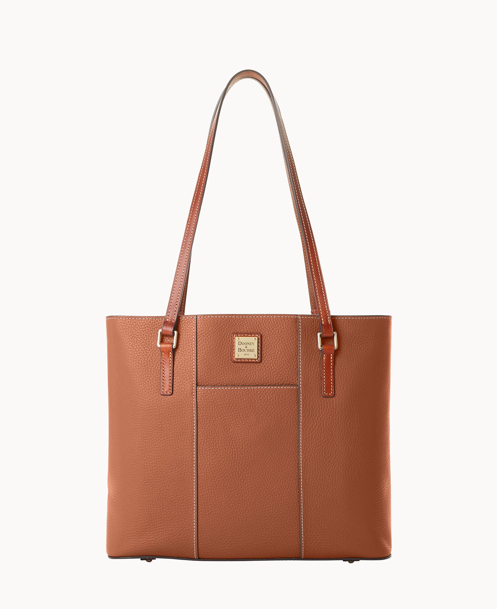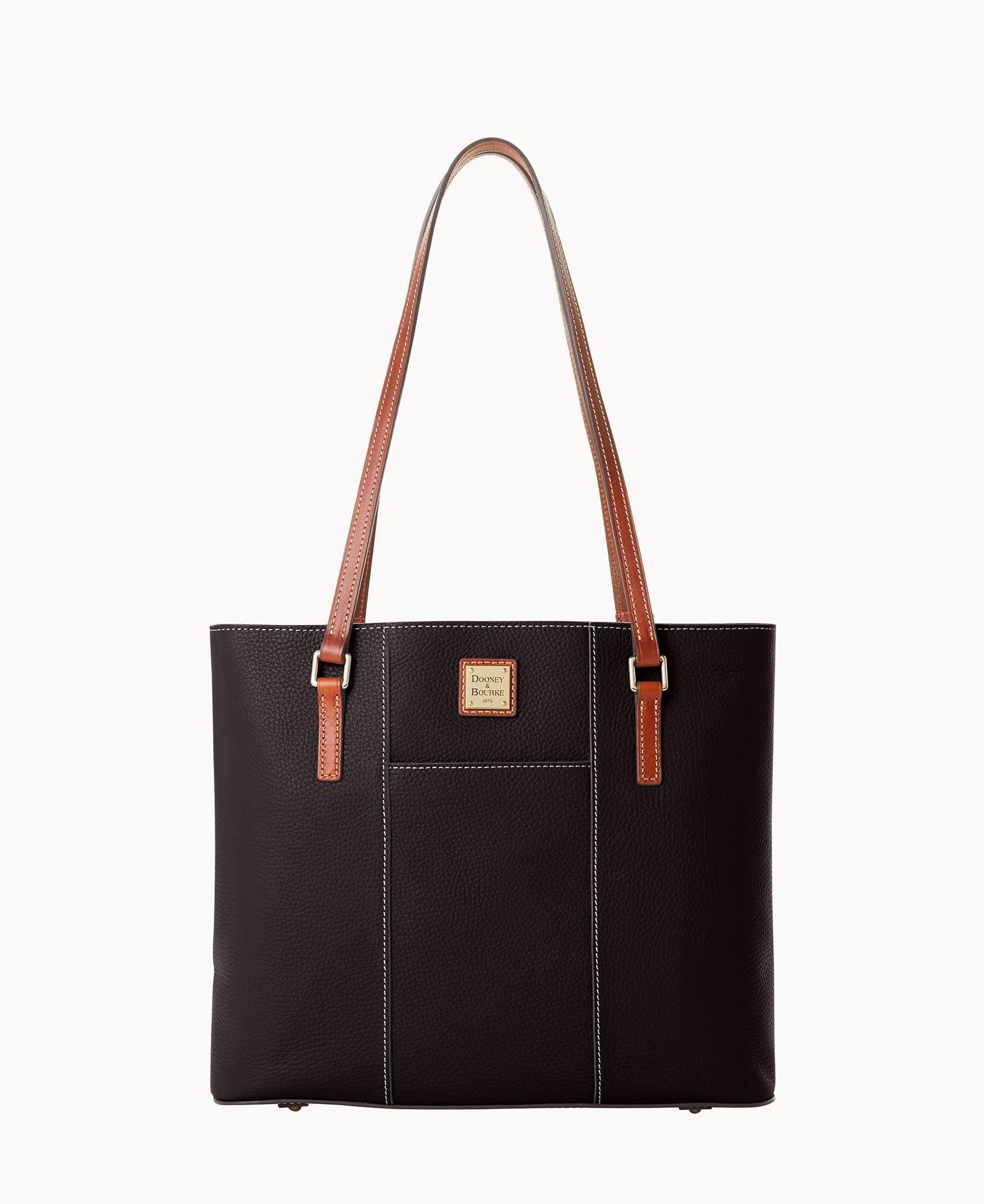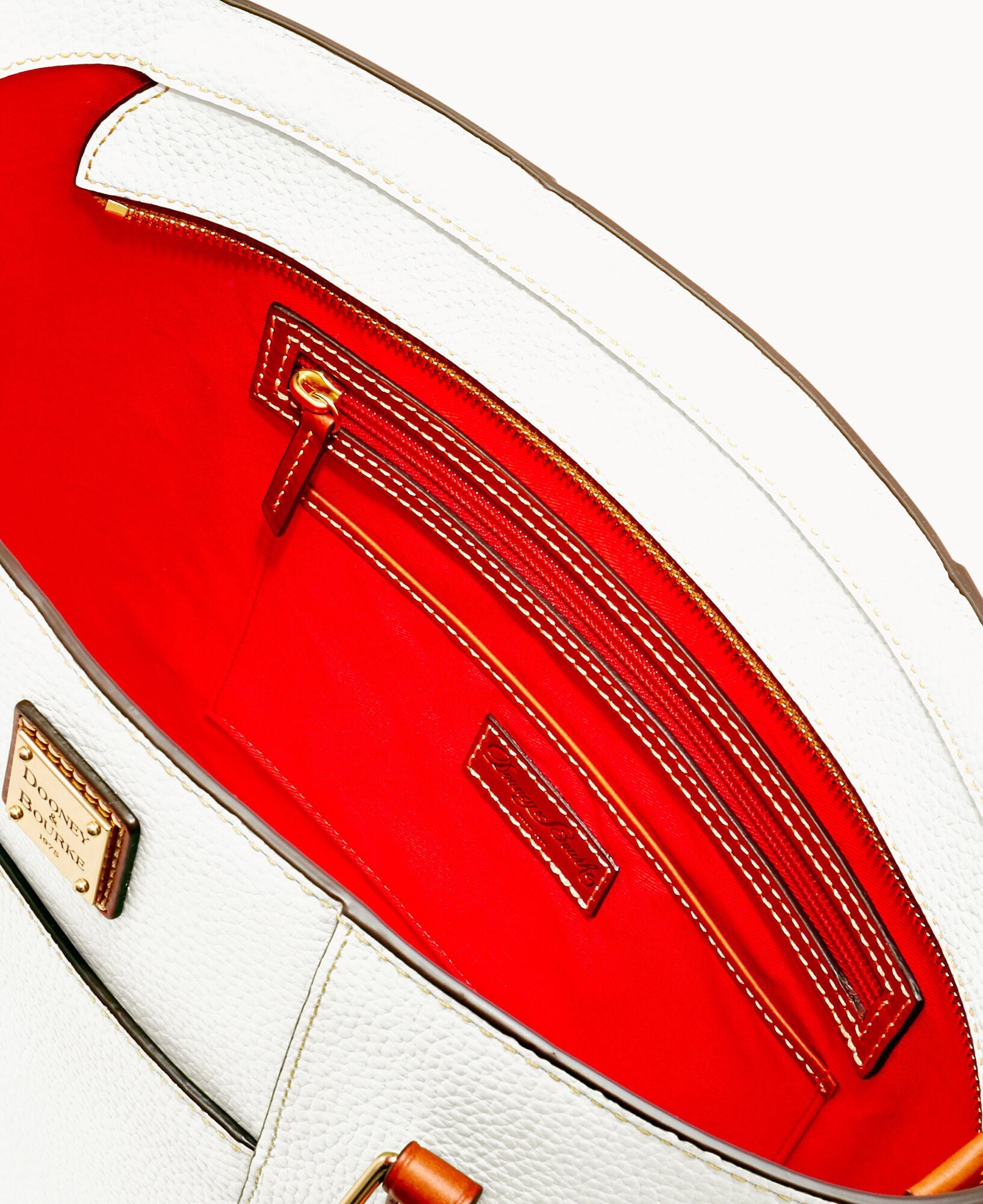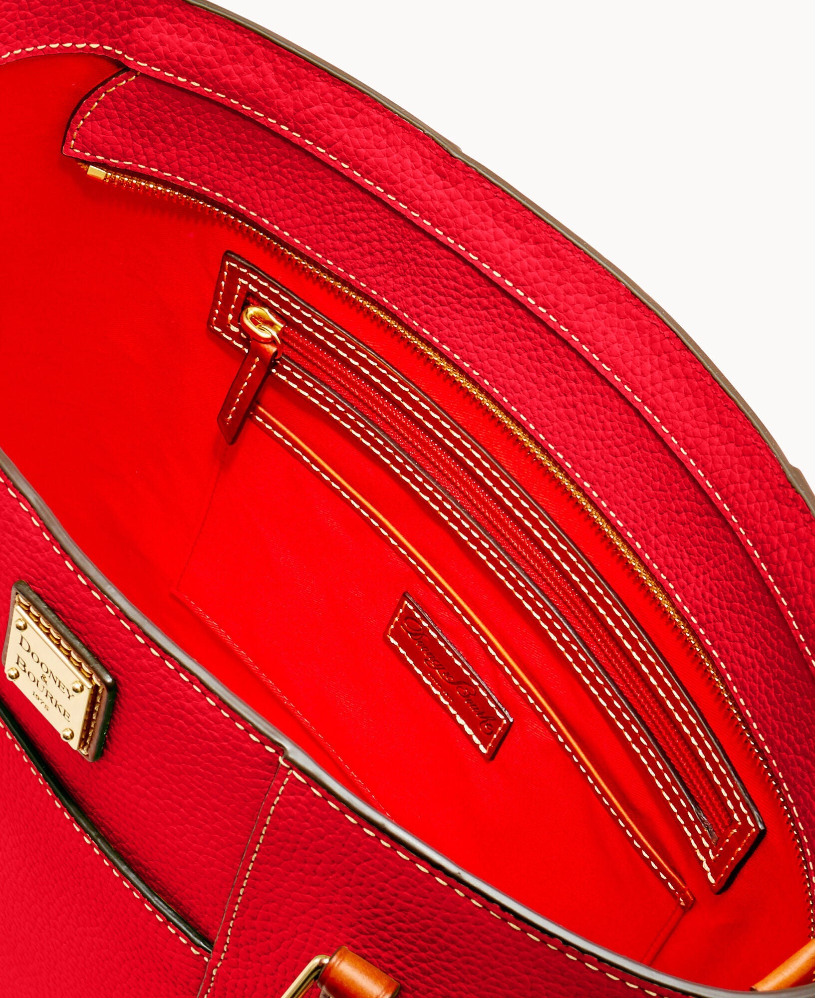Outside front and back pockets. One inside zip pocket. Two inside pockets. Cell phone pocket. Inside key hook. Handle drop length 12". Strap drop length 12". Lined. Feet. Zipper closure.