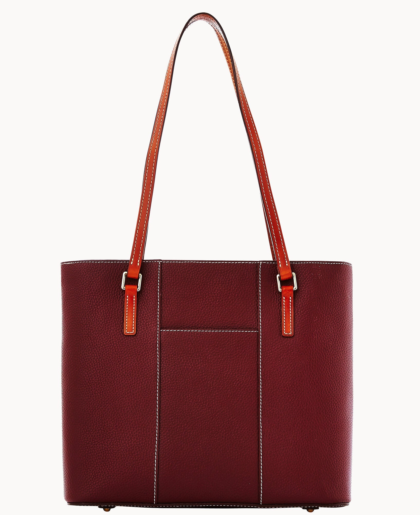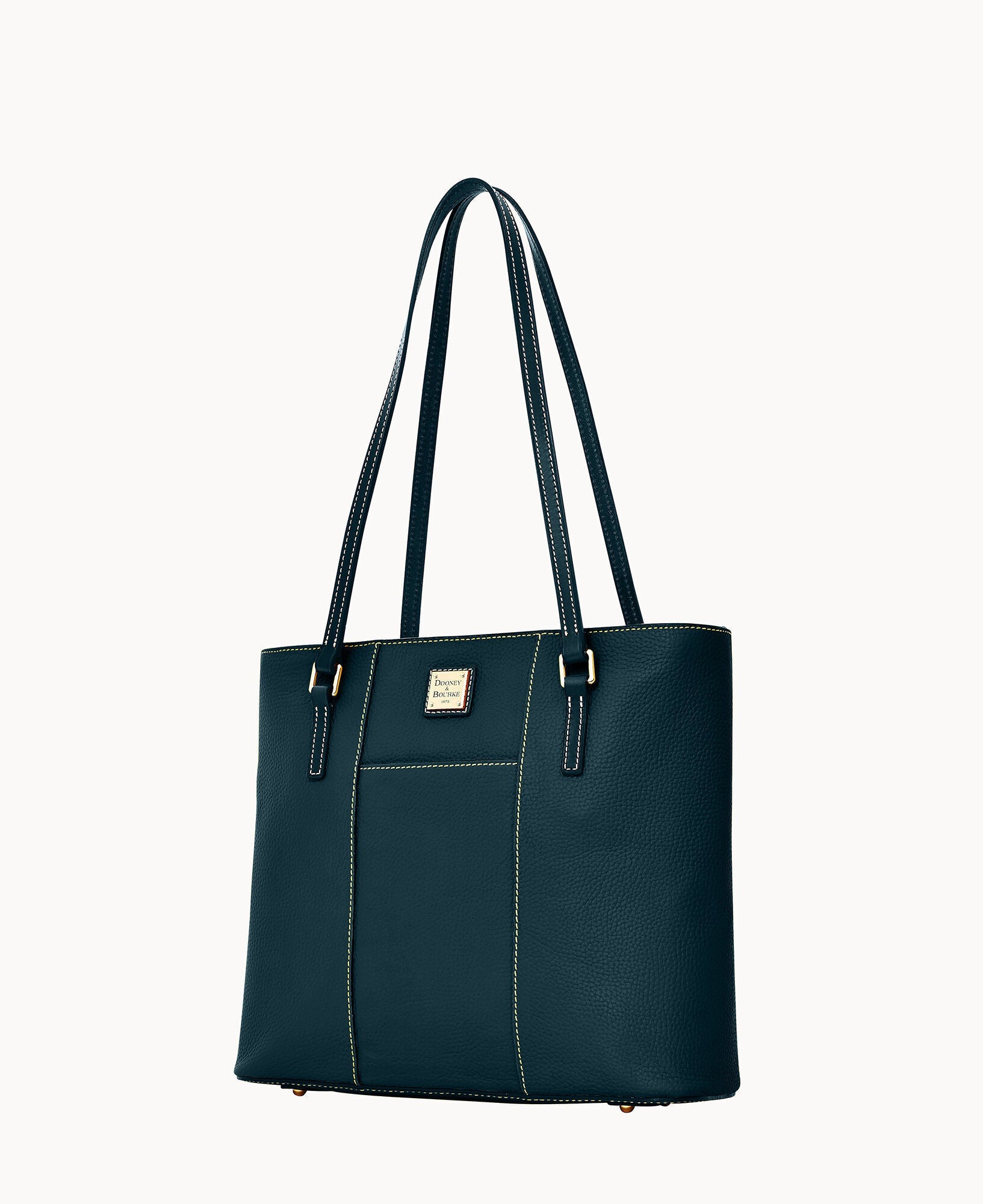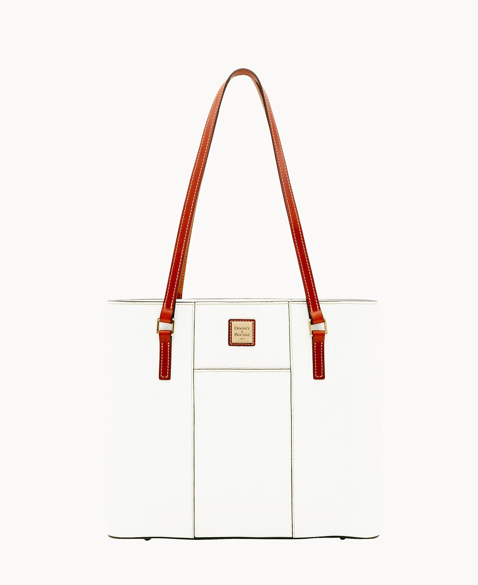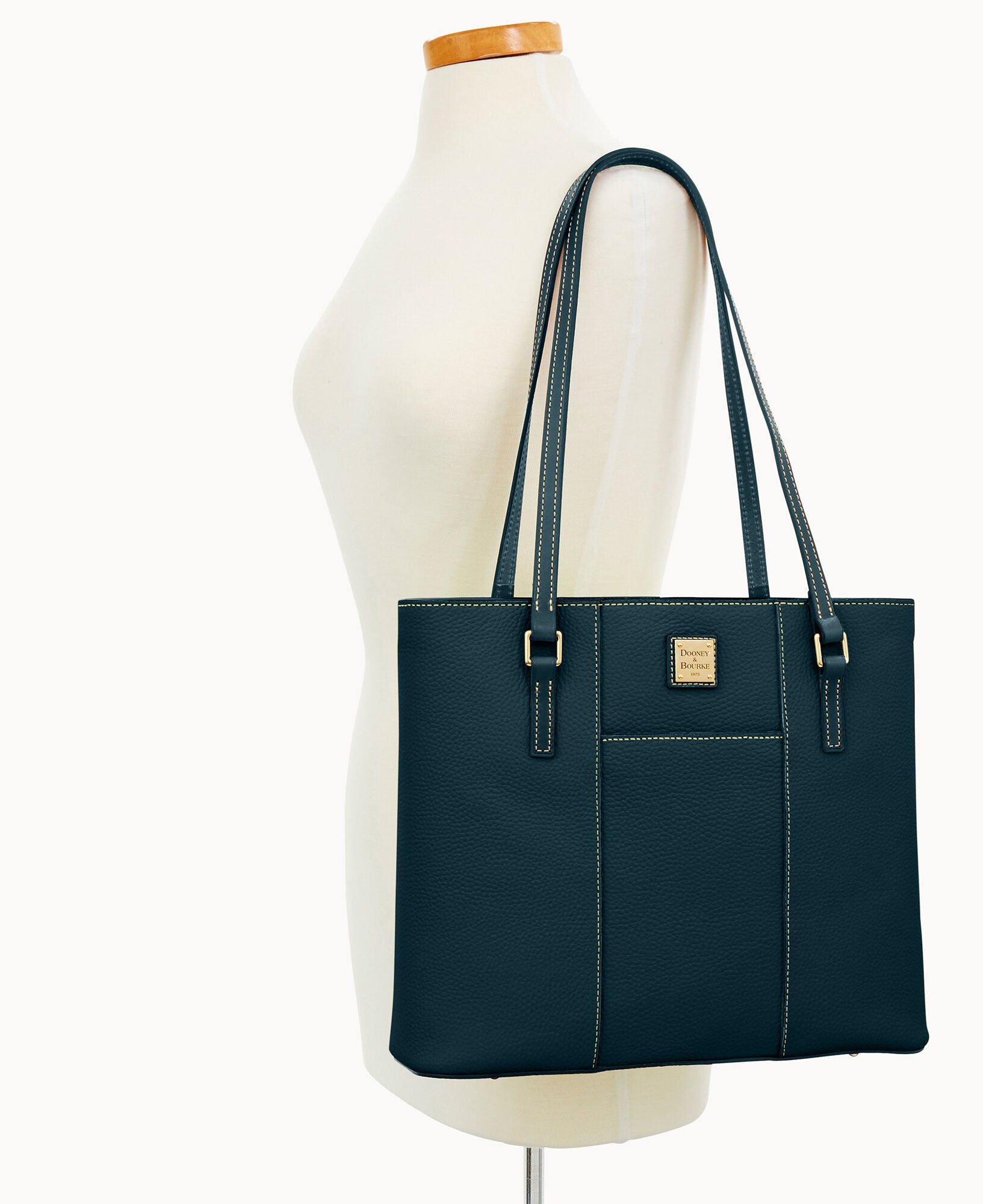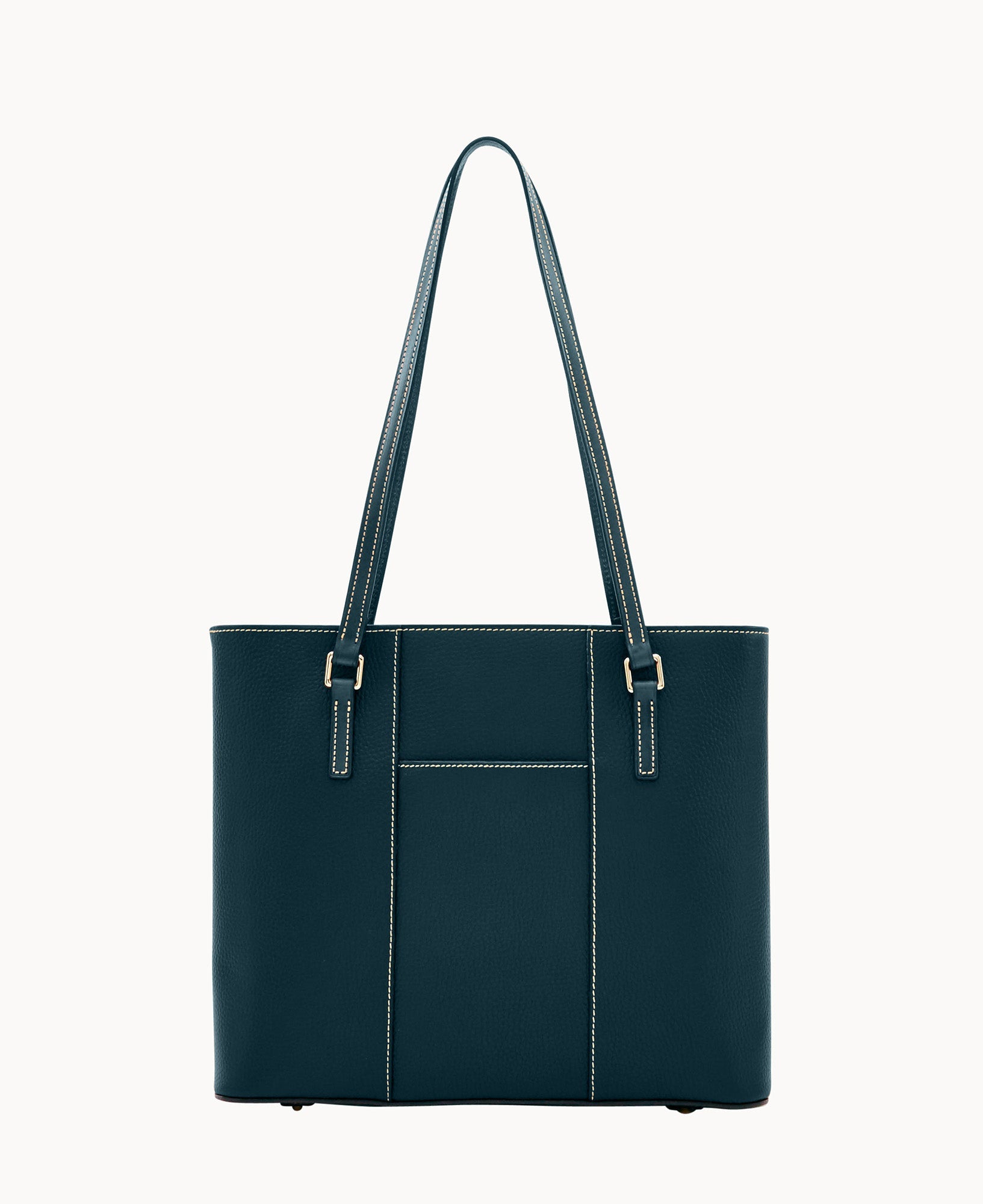 Outside front and back pockets. One inside zip pocket. Two inside pockets. Cell phone pocket. Inside key hook. Handle drop length 12". Strap drop length 12". Lined. Feet. Zipper closure.