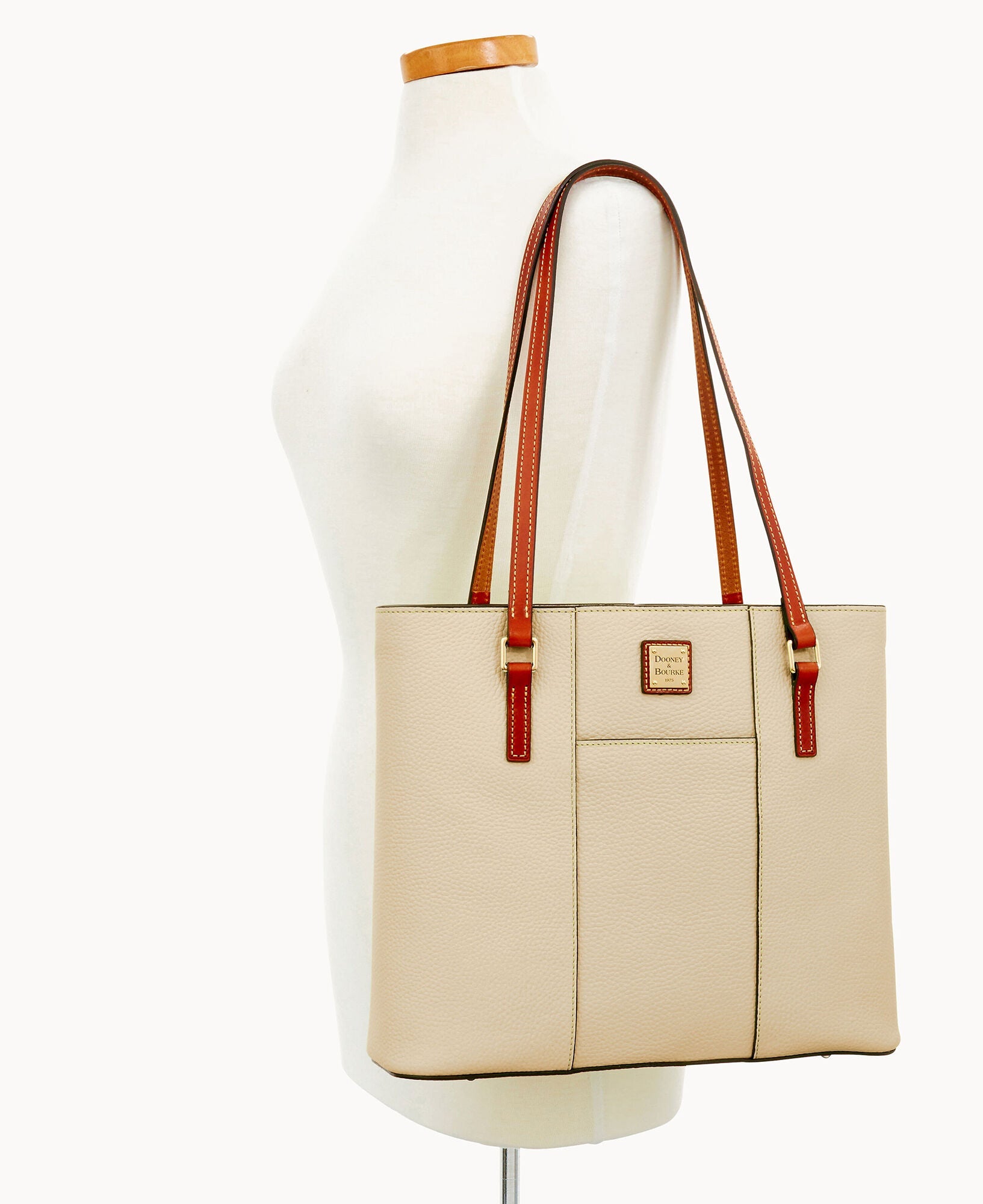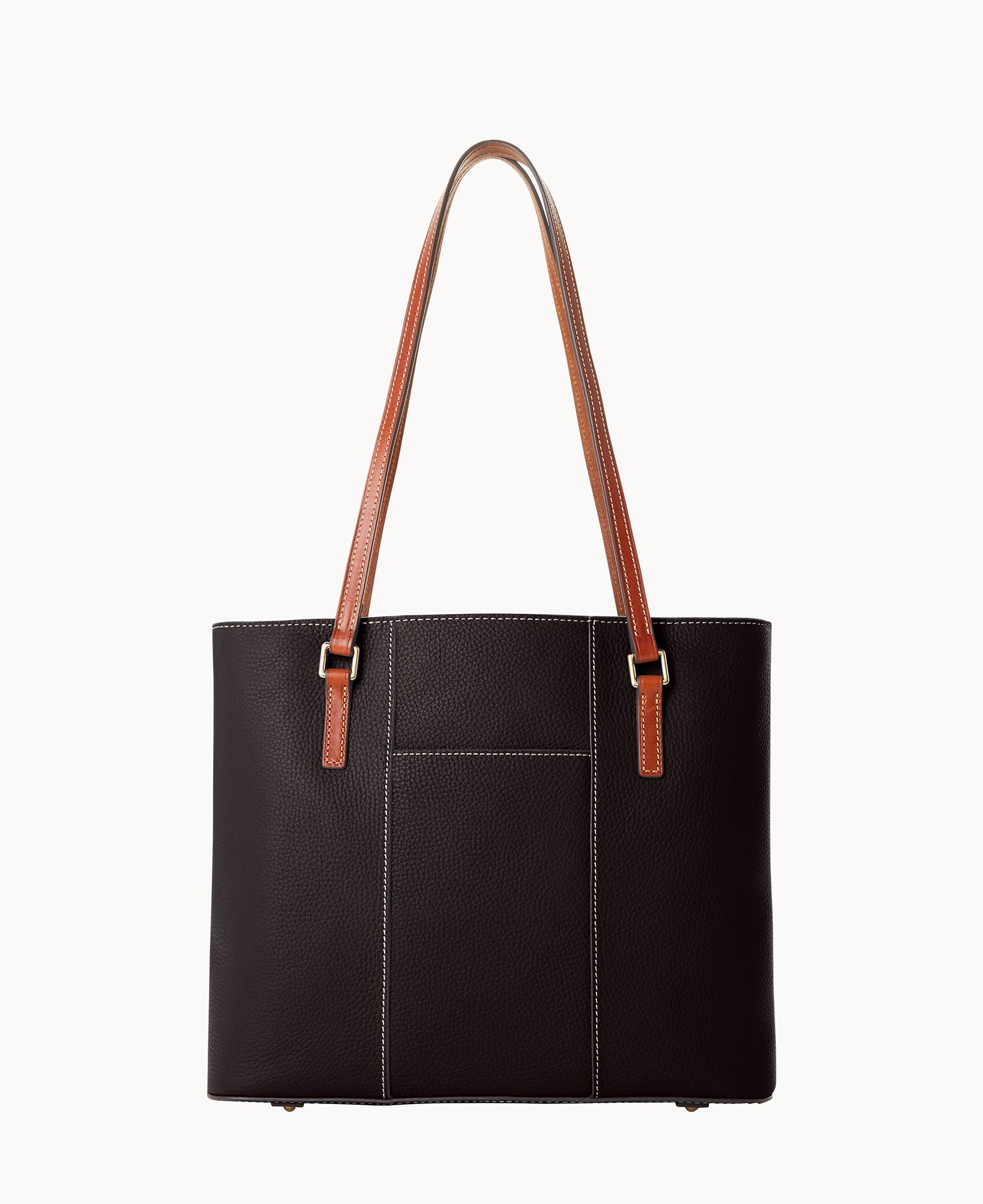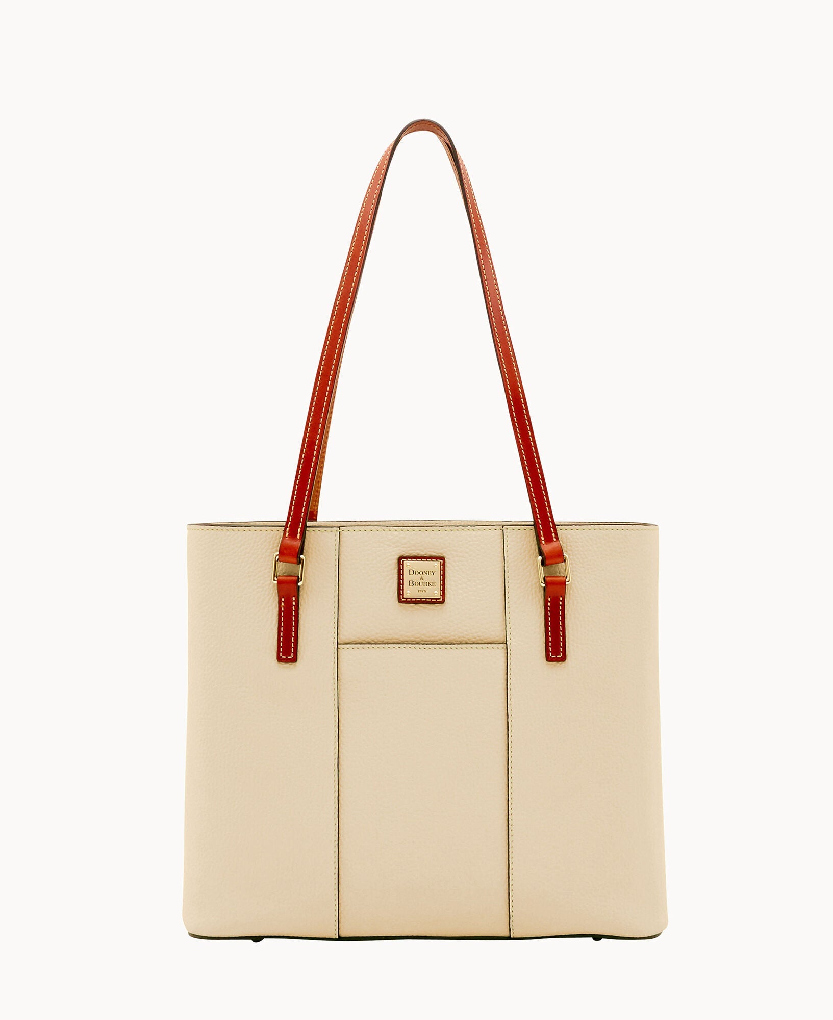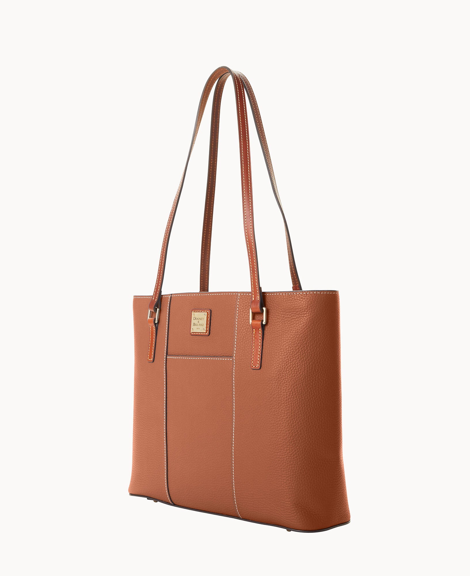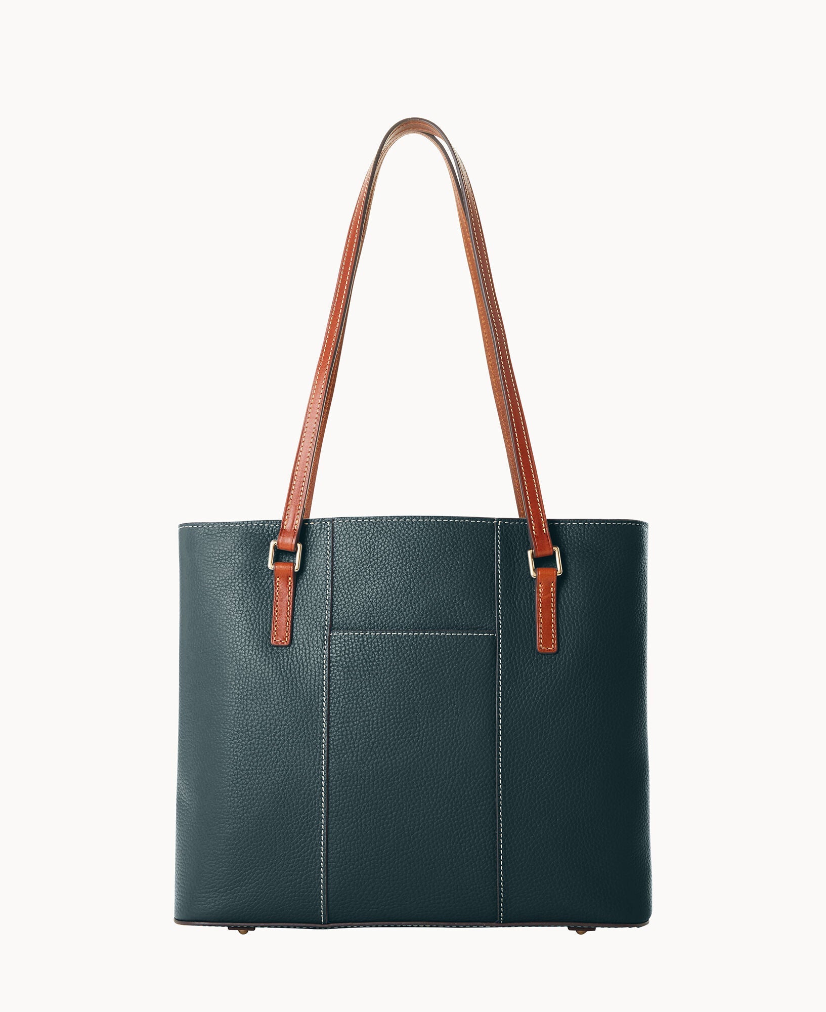 Outside front and back pockets. One inside zip pocket. Two inside pockets. Cell phone pocket. Inside key hook. Handle drop length 12". Strap drop length 12". Lined. Feet. Zipper closure.