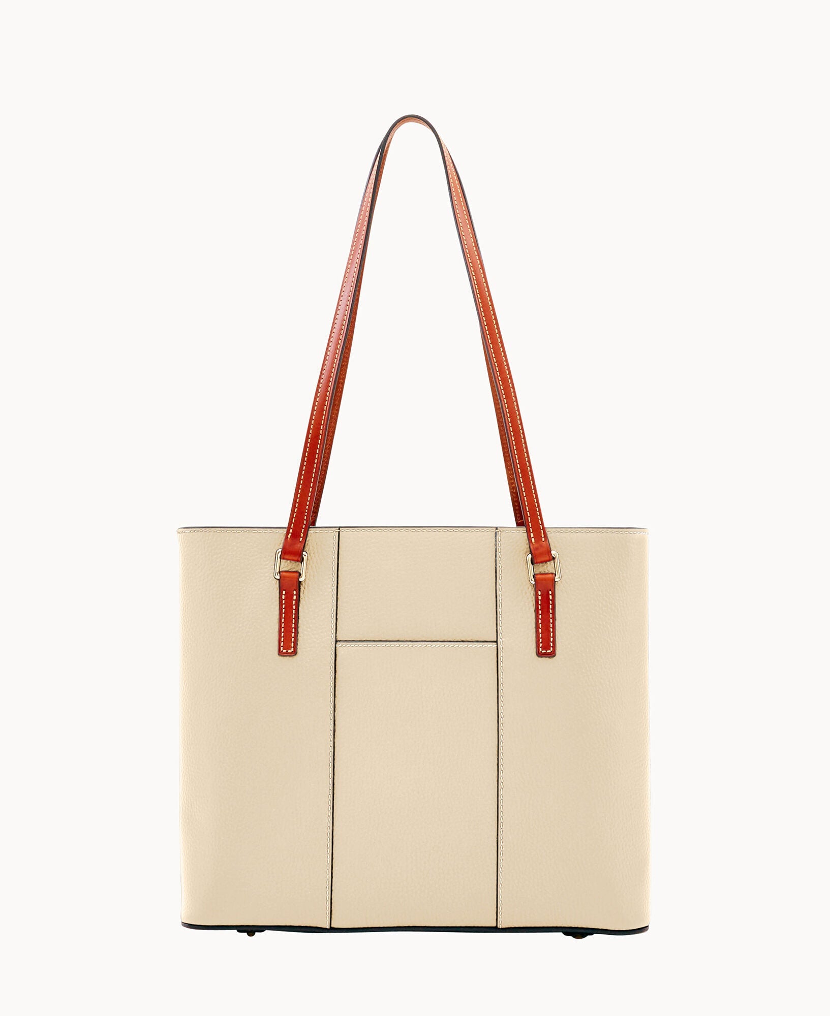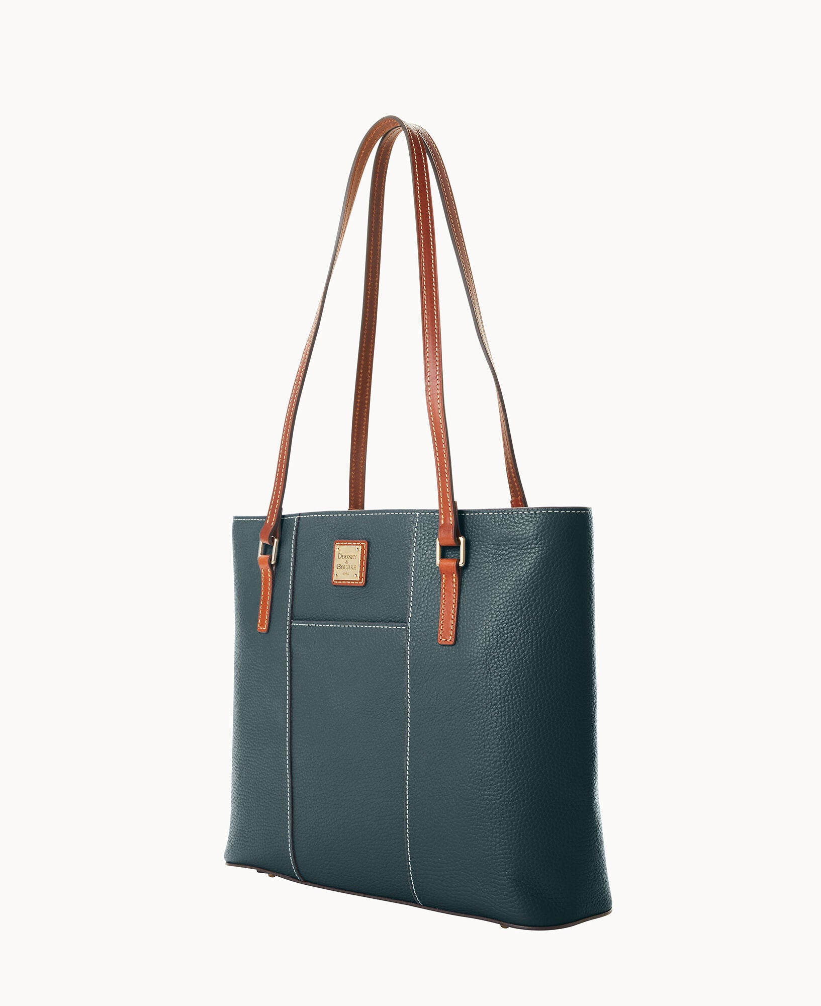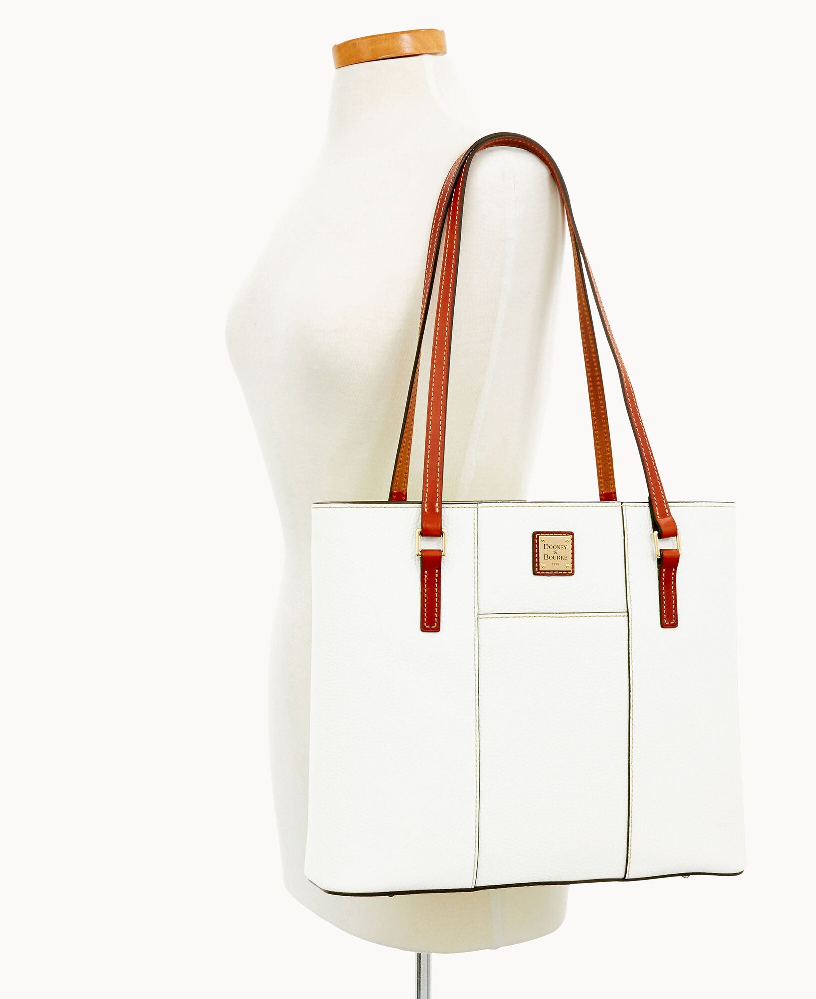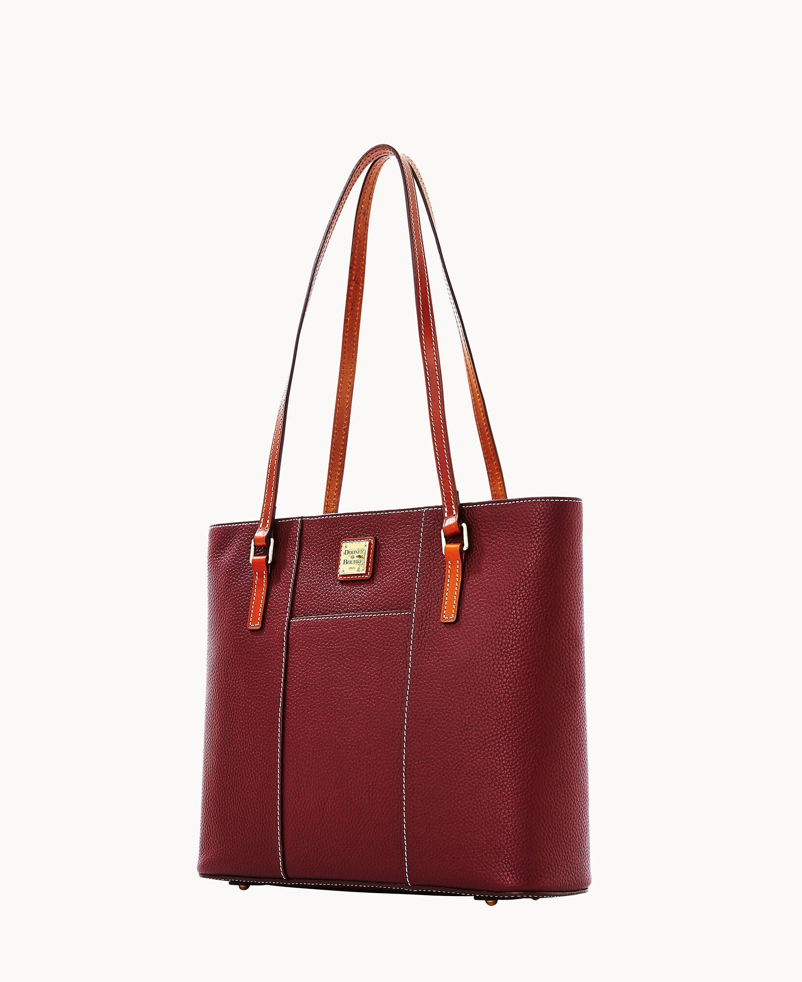 Outside front and back pockets. One inside zip pocket. Two inside pockets. Cell phone pocket. Inside key hook. Handle drop length 12". Strap drop length 12". Lined. Feet. Zipper closure.