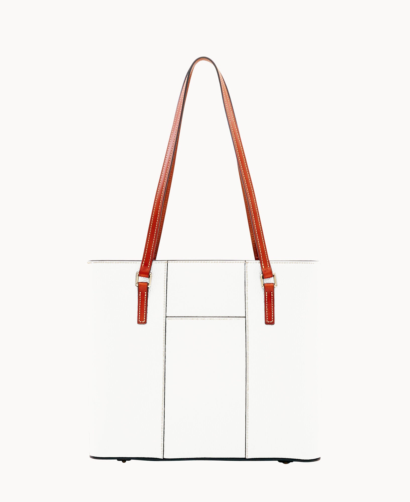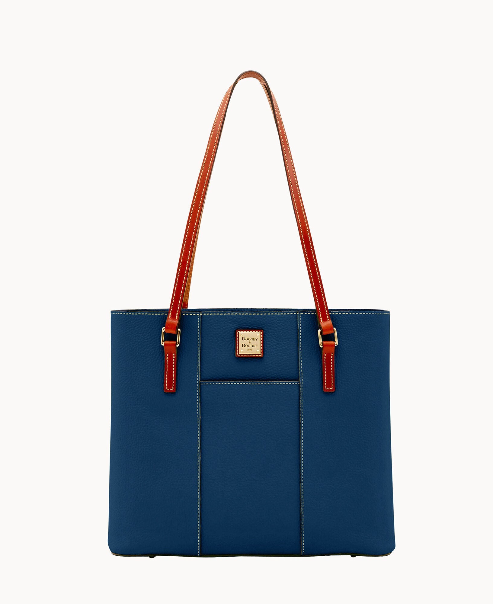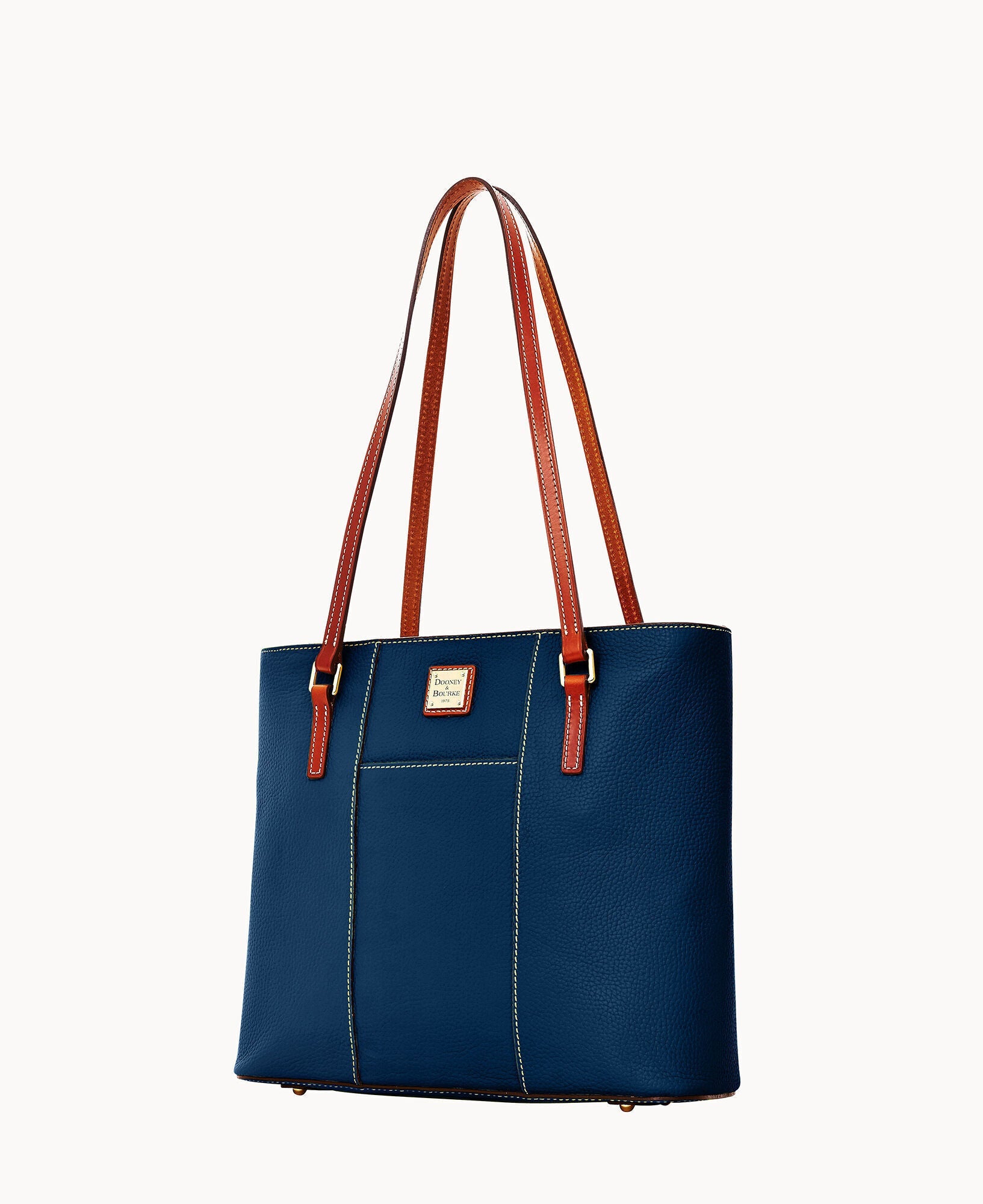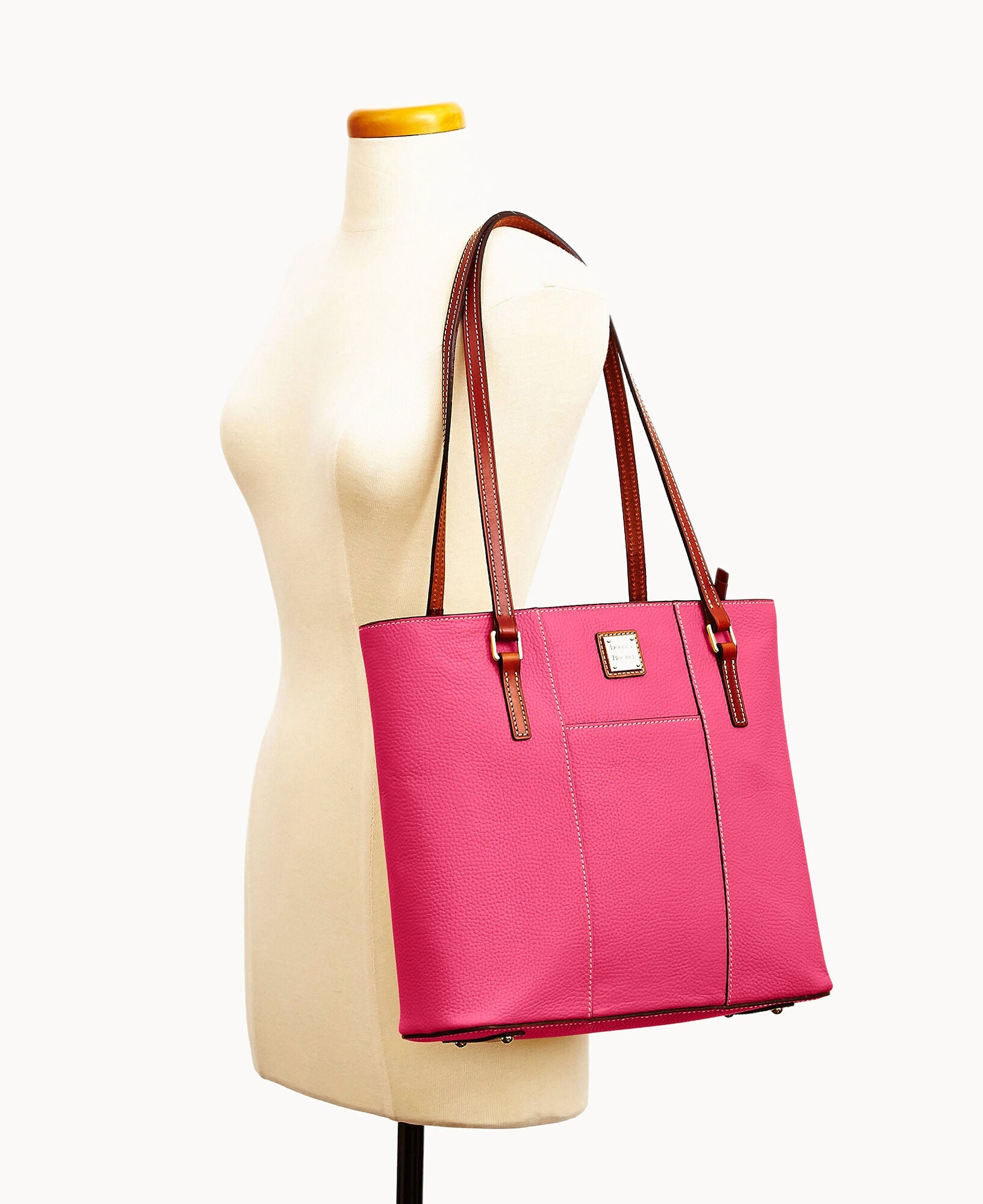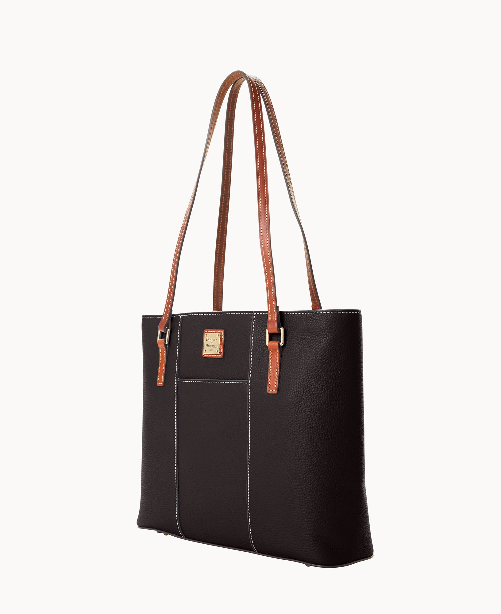 Outside front and back pockets. One inside zip pocket. Two inside pockets. Cell phone pocket. Inside key hook. Handle drop length 12". Strap drop length 12". Lined. Feet. Zipper closure.