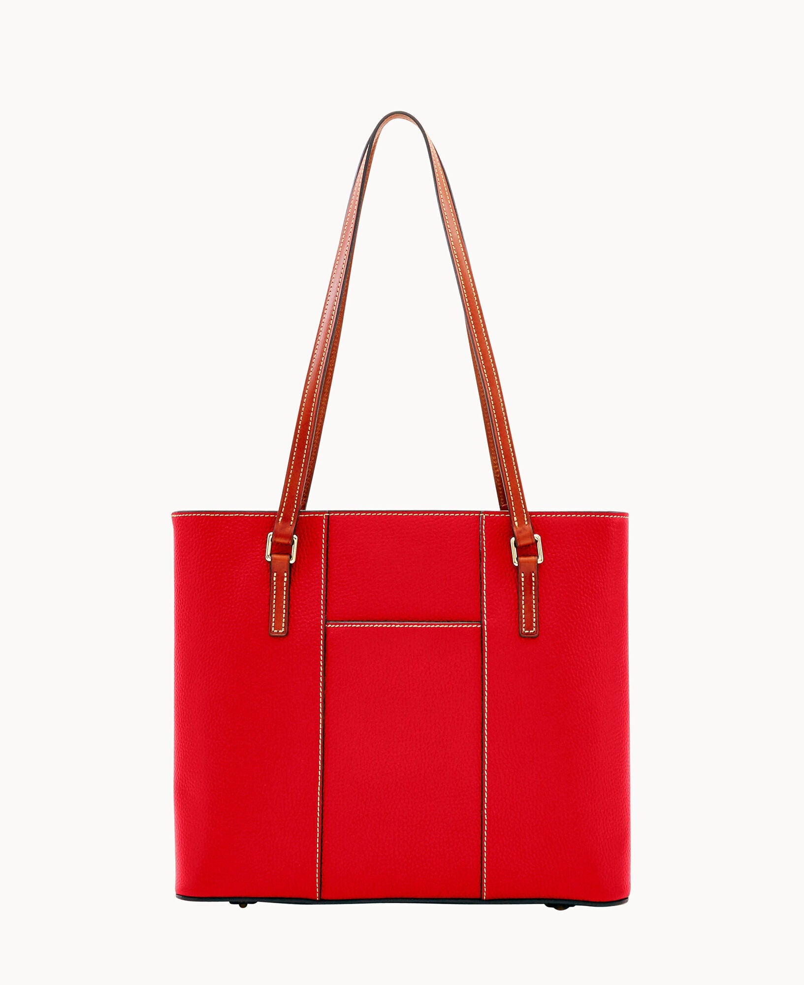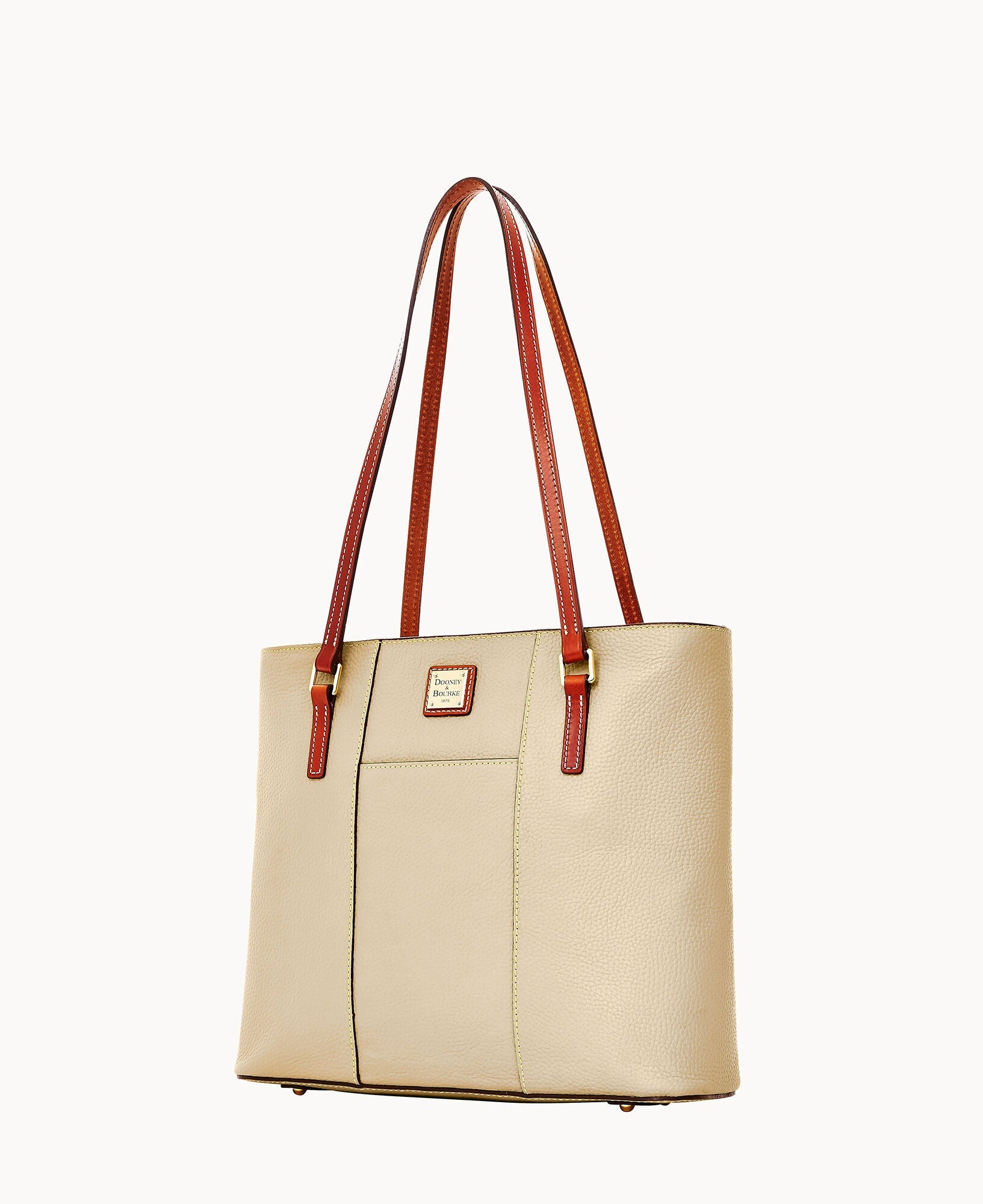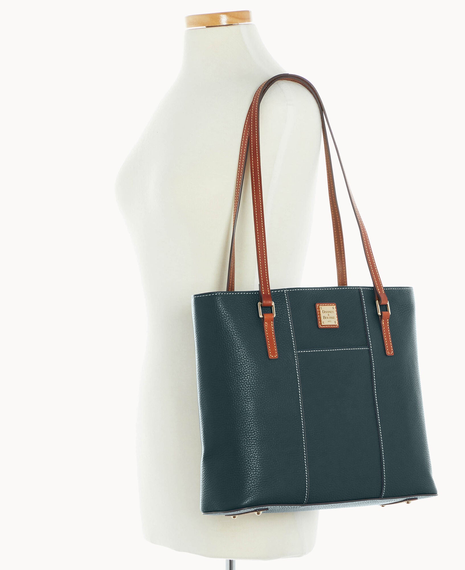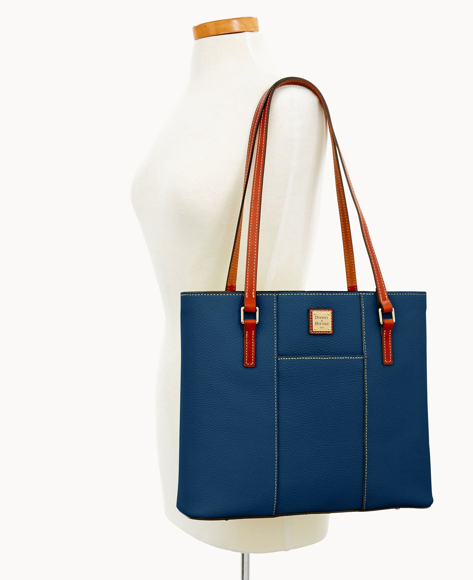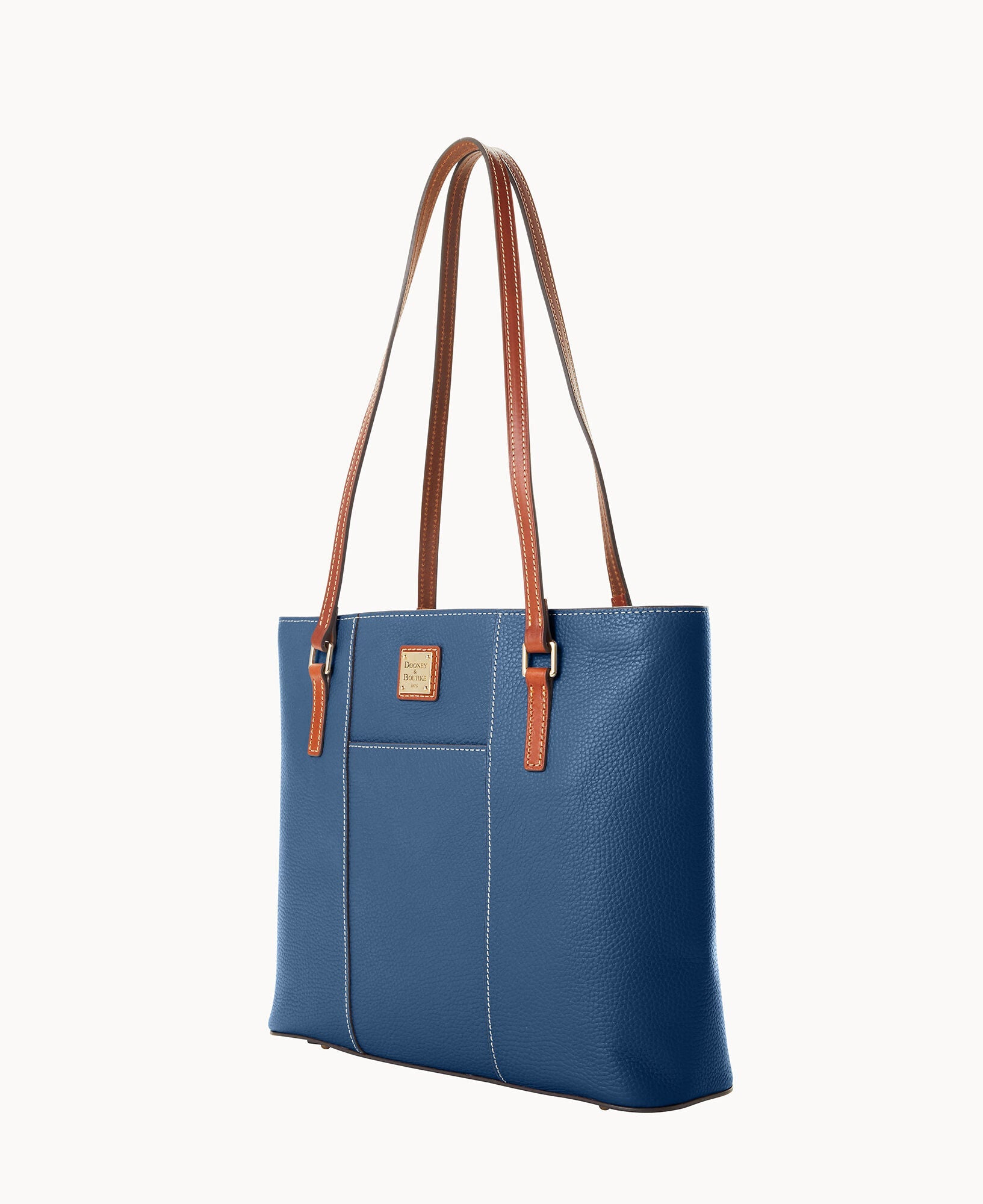 Outside front and back pockets. One inside zip pocket. Two inside pockets. Cell phone pocket. Inside key hook. Handle drop length 12". Strap drop length 12". Lined. Feet. Zipper closure.