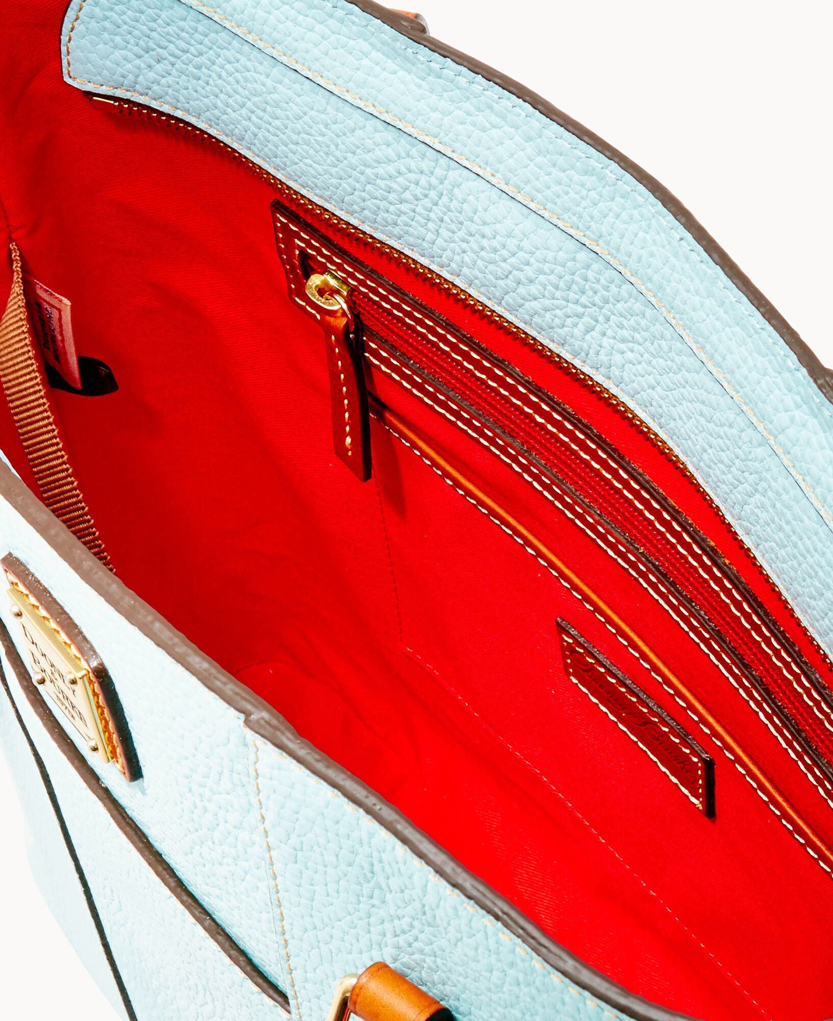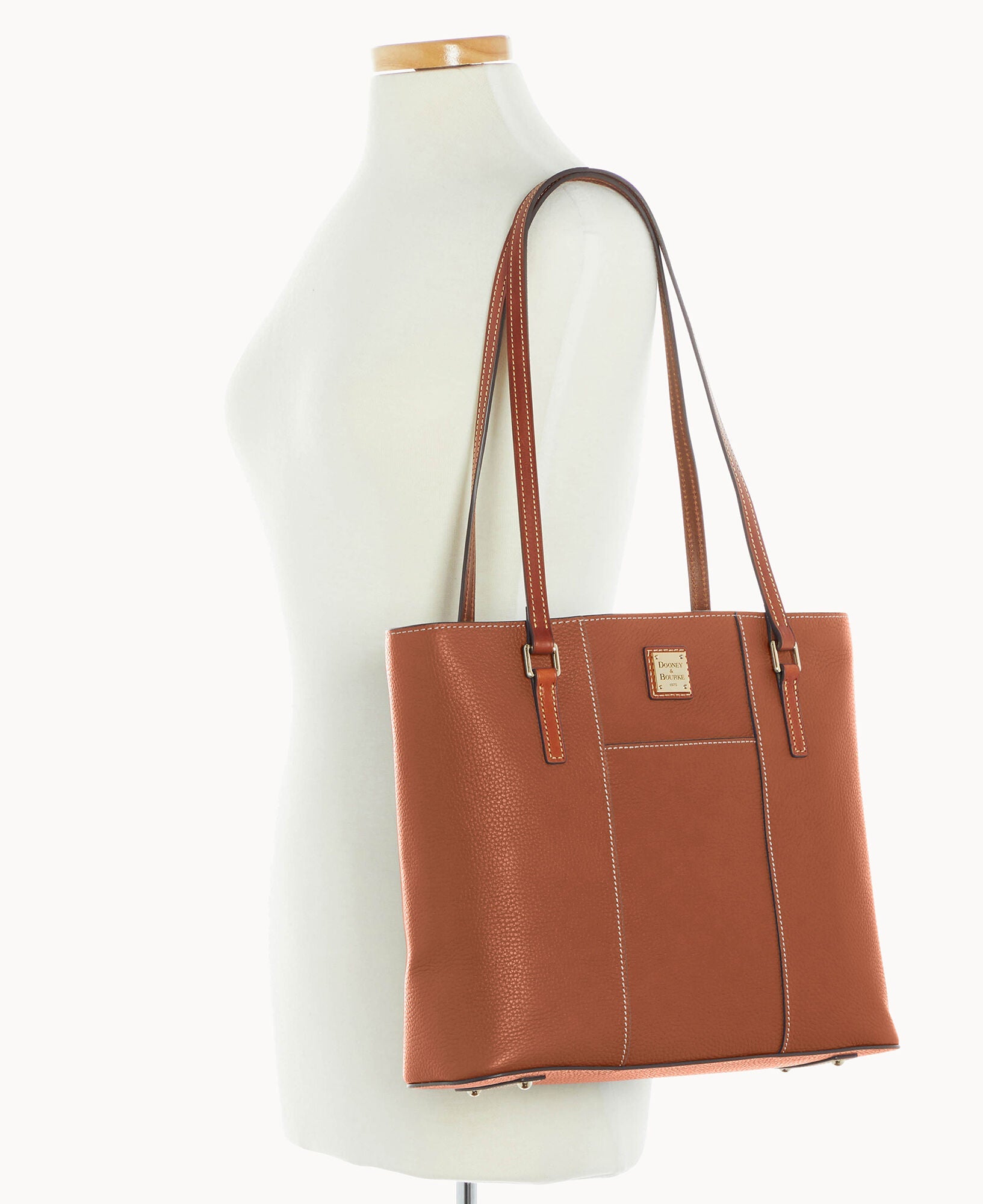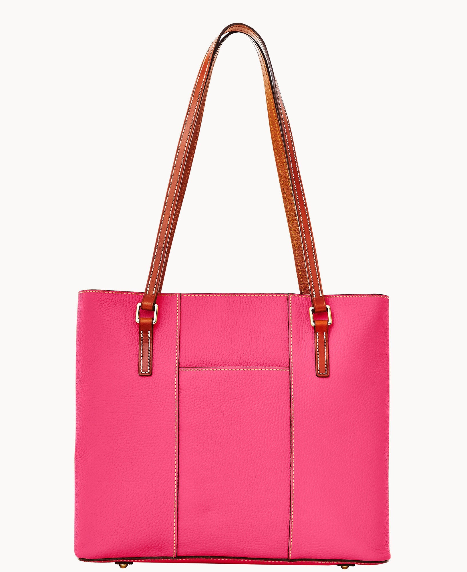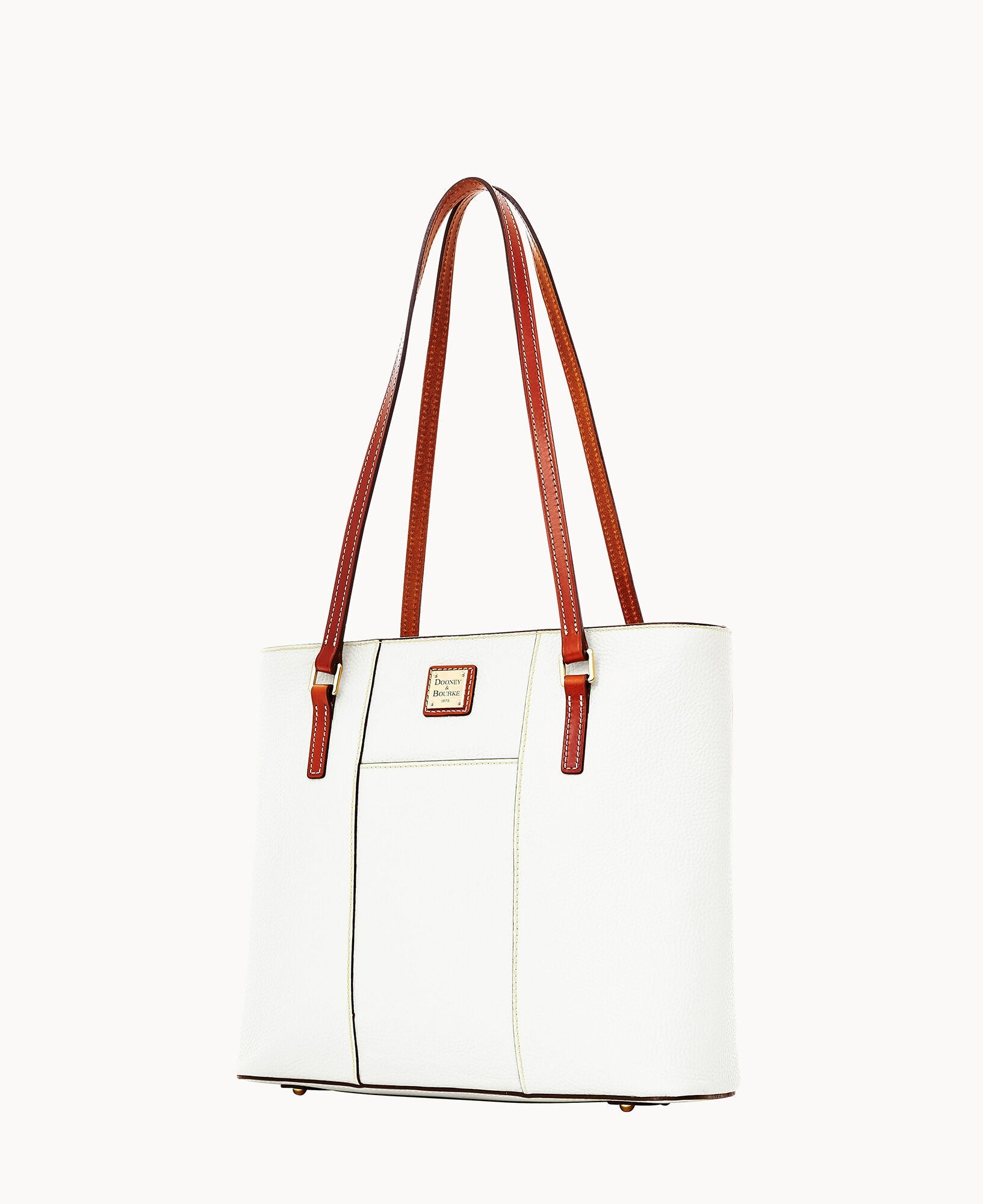 Outside front and back pockets. One inside zip pocket. Two inside pockets. Cell phone pocket. Inside key hook. Handle drop length 12". Strap drop length 12". Lined. Feet. Zipper closure.
