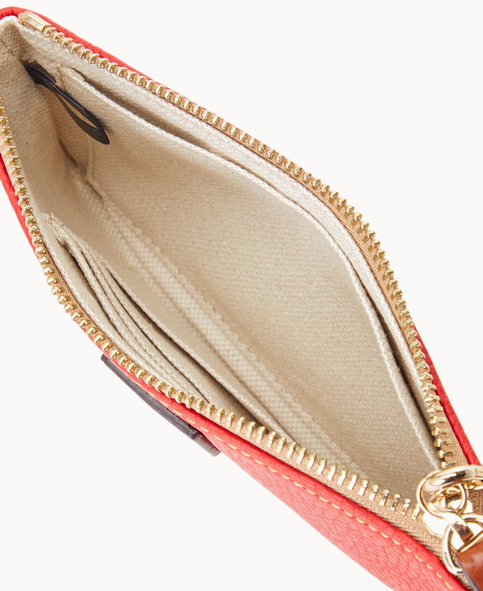 Two inside compartments. Four credit card slots. Detachable wrist strap. Lined. Zipper closure.