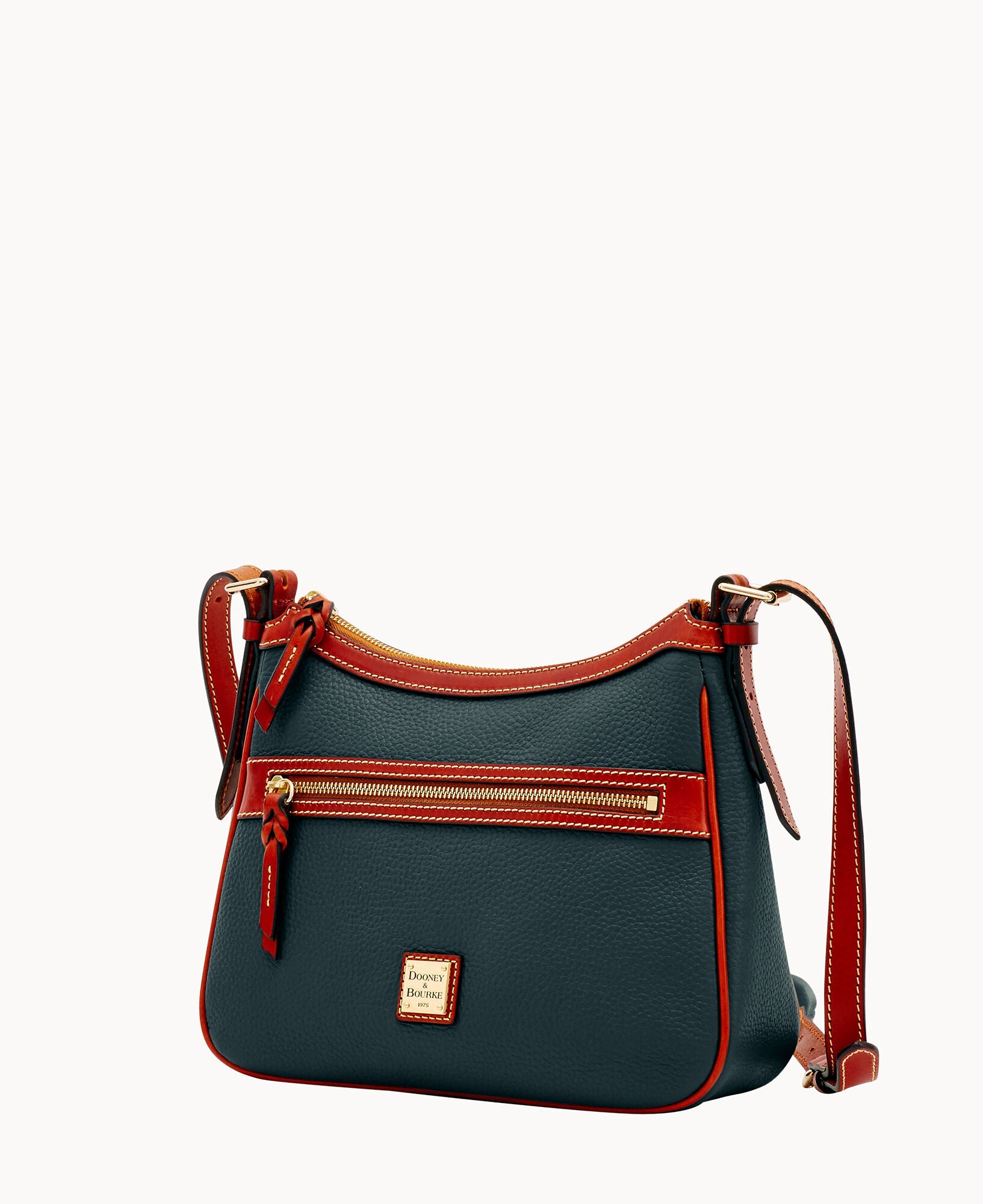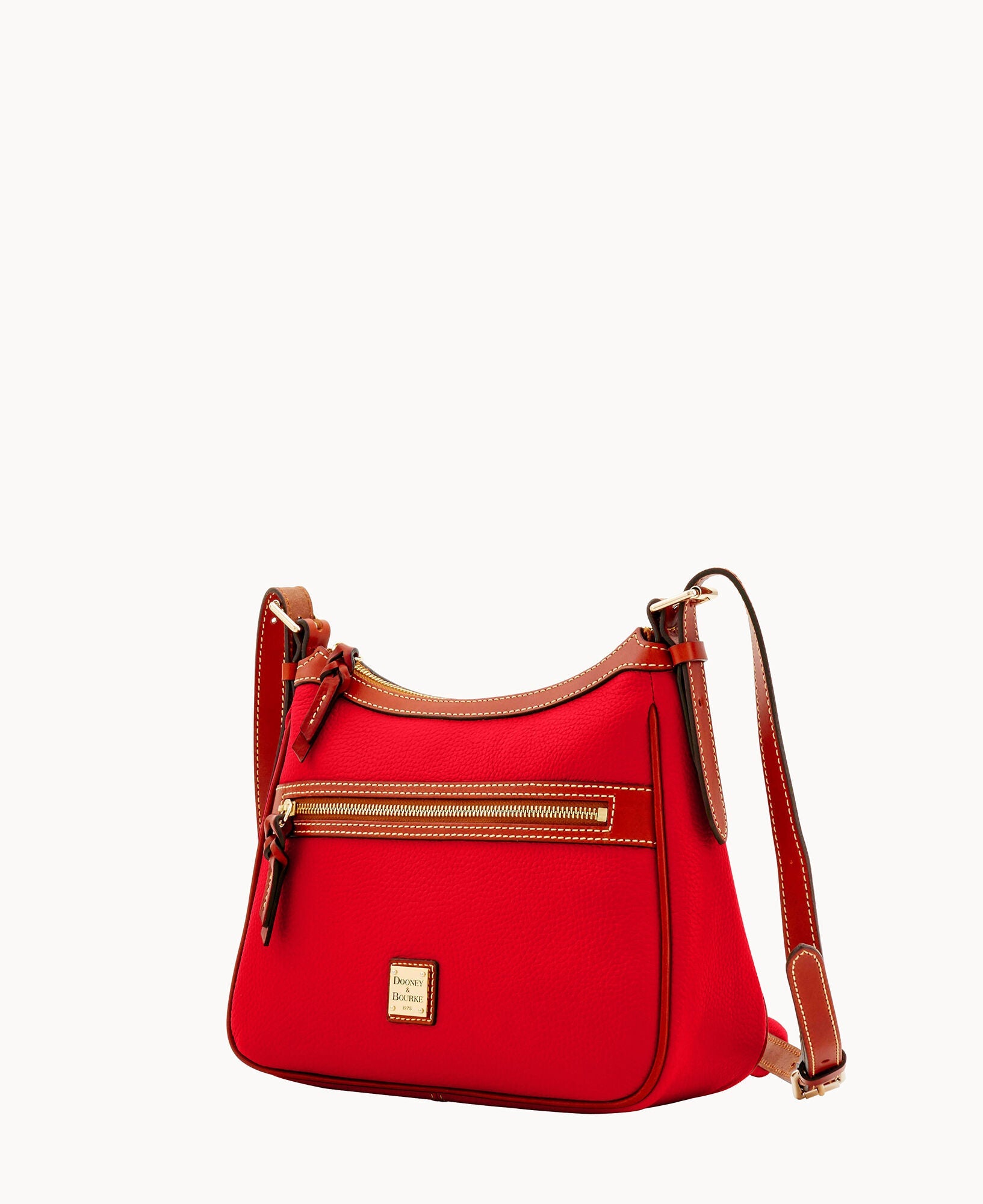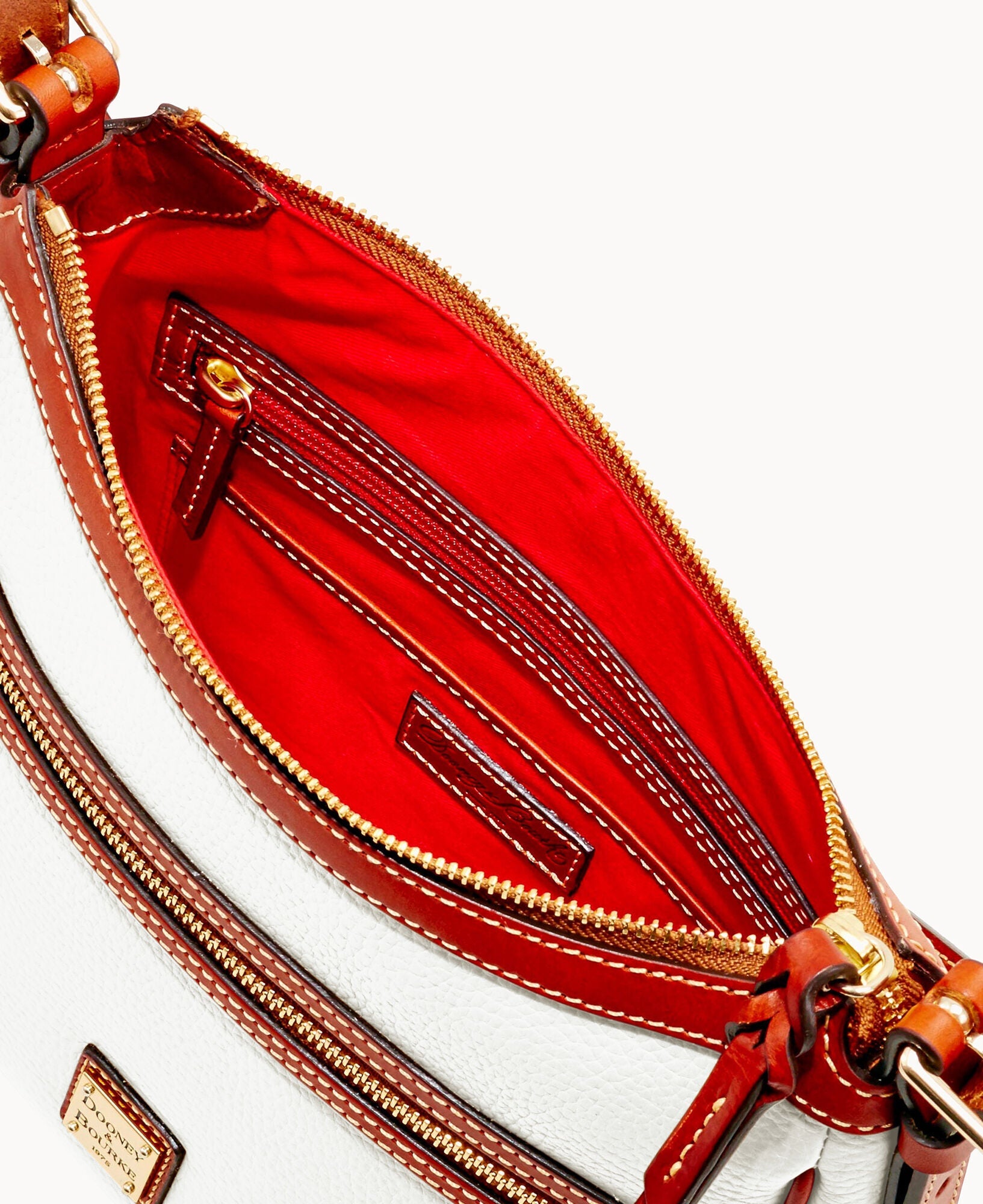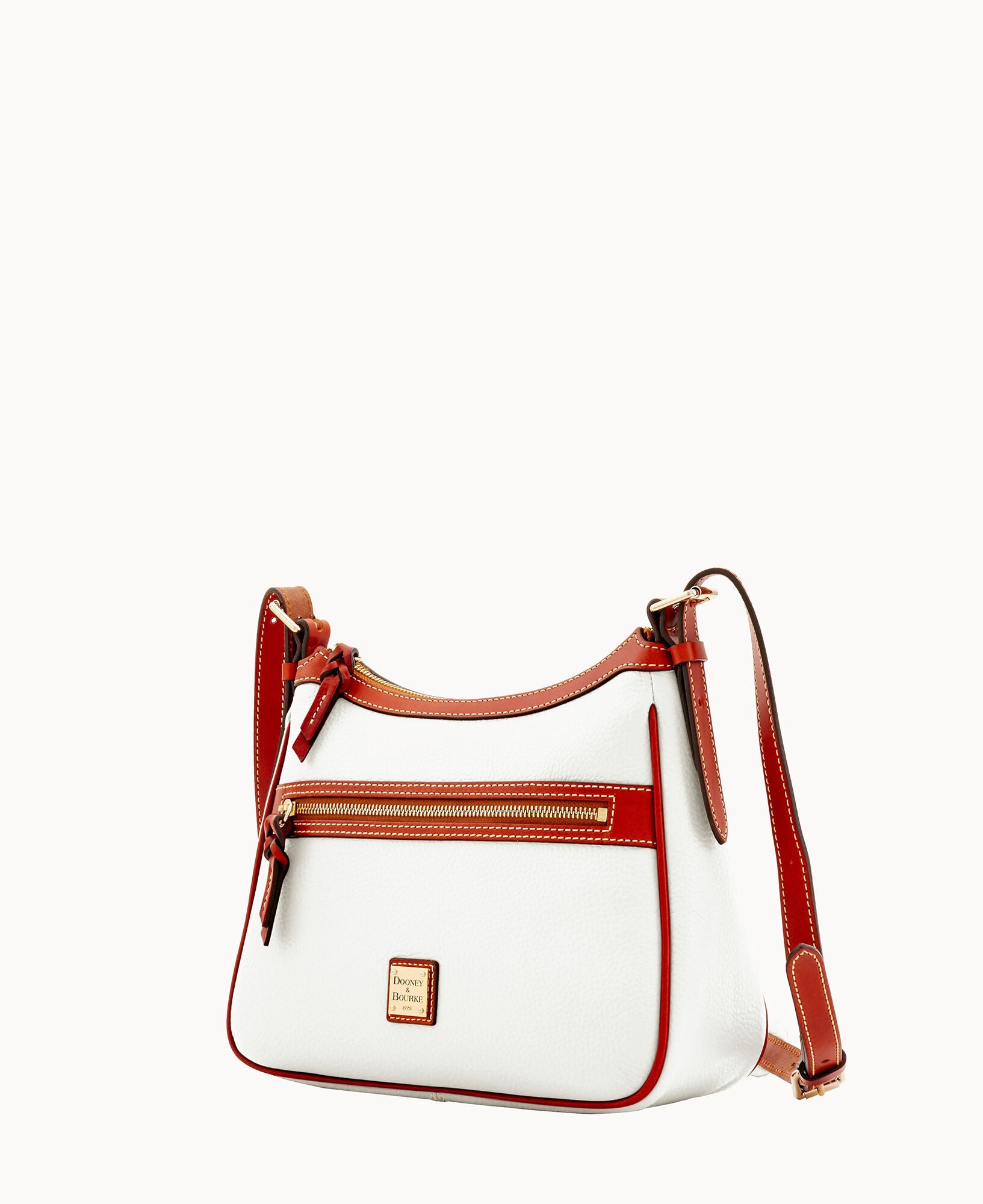 One outside zip pocket. One inside zip pocket. Two inside pockets. Inside key hook. Adjustable shoulder strap. Lined. Zipper closure.